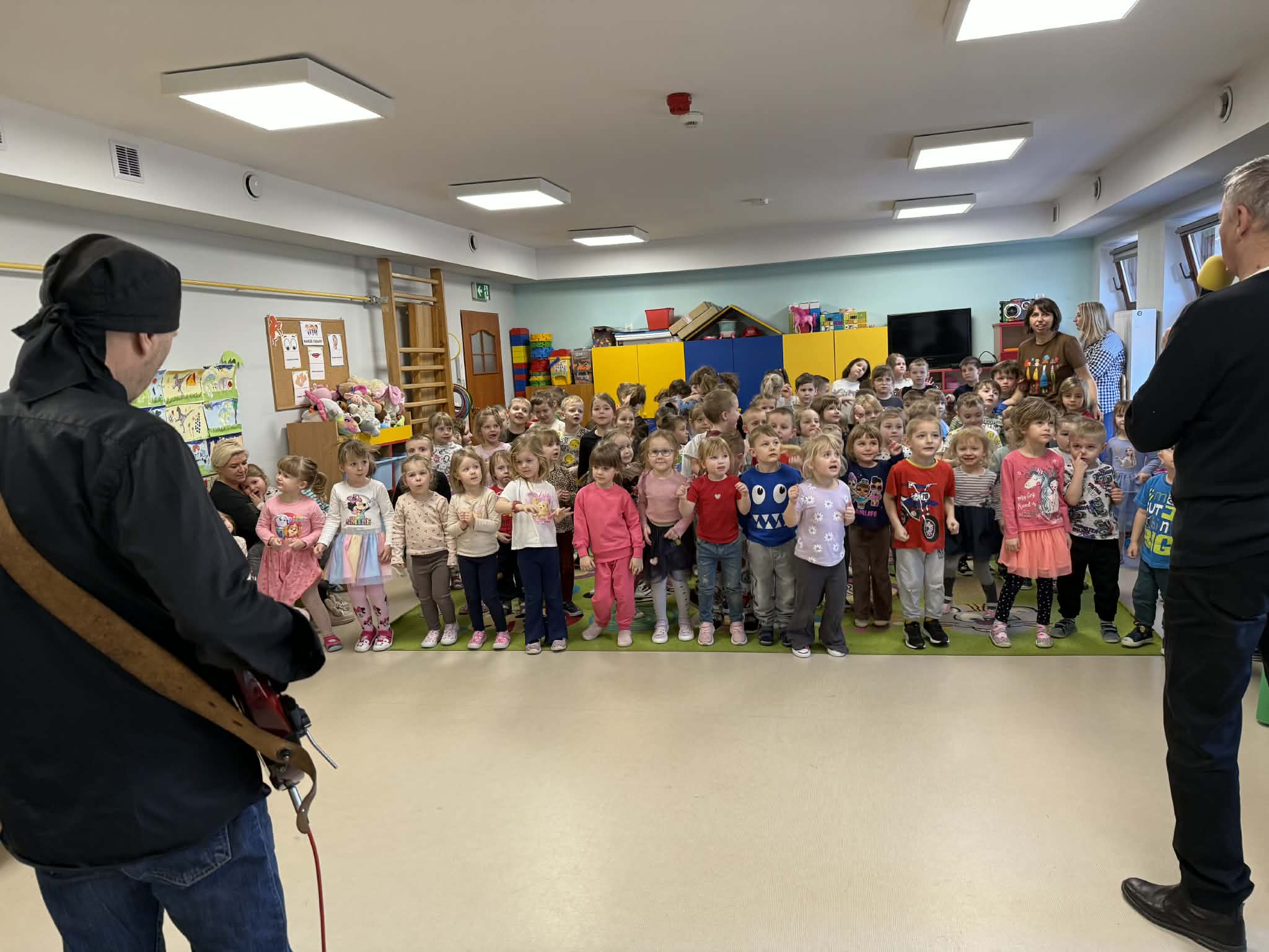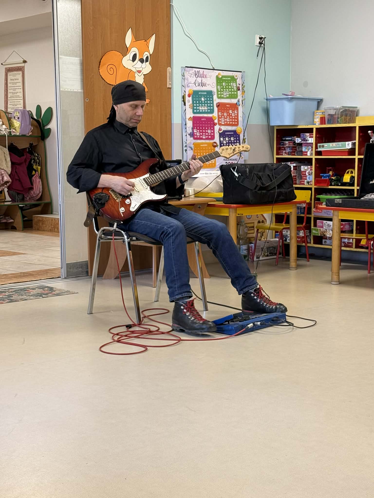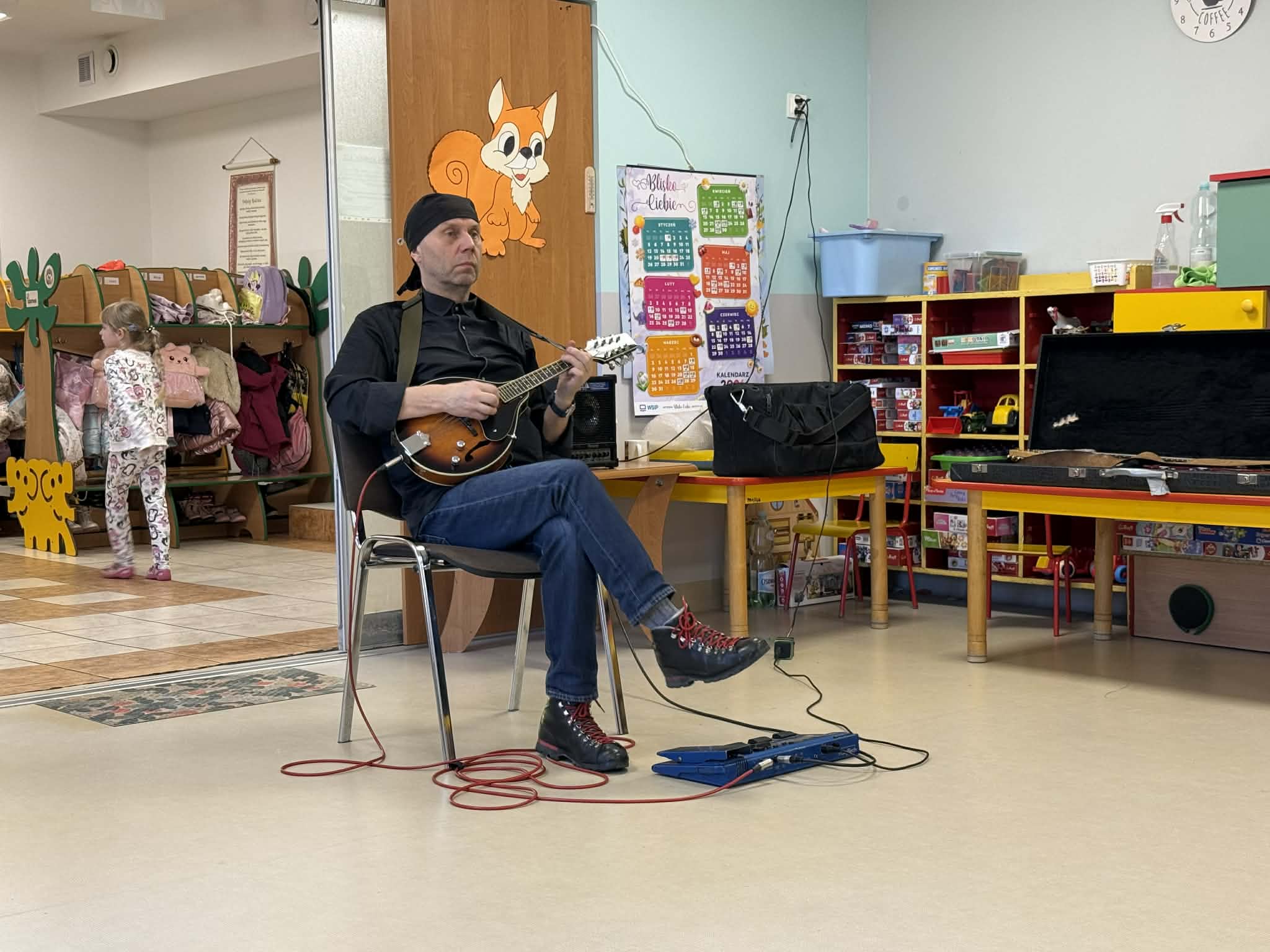 W ramach comiesięcznych spotkań muzycznych dzieci wzięły udział w kolejnej audycji, tym razem miały okazję poznać bliżej dwa instrumenty- mandolinę oraz gitarę elektryczną. Dowiedziały się, jak brzmi mandolina i na czym polega technika tremolo, która nadaje muzyce charakterystyczne, drżące brzmienie. Duże zainteresowanie wzbudziła również gitara elektryczna, której dźwięk i zrobiły na dzieciach ogromne wrażenie. Podczas spotkania nie zabrakło także zagadek muzycznych. Dzieci z zaangażowaniem rozpoznawały odgłosy zwierząt, pojazdów oraz dźwięki towarzyszące codziennym czynnościom. Była to świetna okazja do rozwijania słuchu muzycznego i wyobraźni. Na zakończenie Pan Witek zaprezentował wiersz, który symbolicznie żegnał zimę. Podczas recytacji zdejmował zimowe elementy garderoby- czapkę, szalik i rękawiczki, wprowadzając wszystkich w radosny, wiosenny nastrój. Spotkanie upłynęło w miłej atmosferze i dostarczyło dzieciom wielu muzycznych wrażeń.