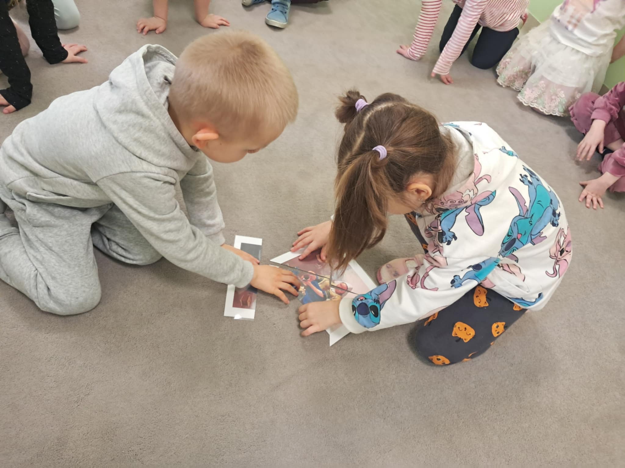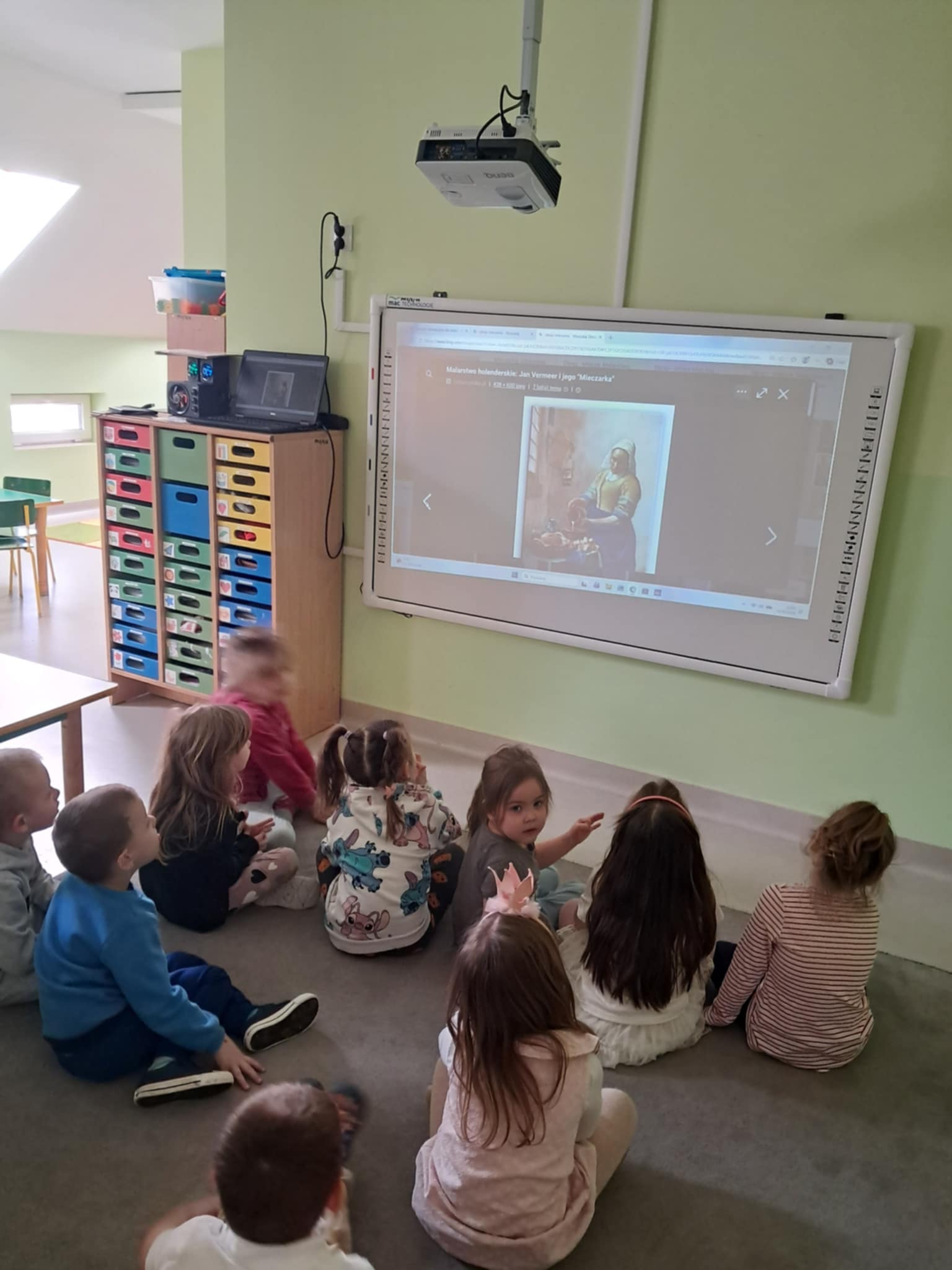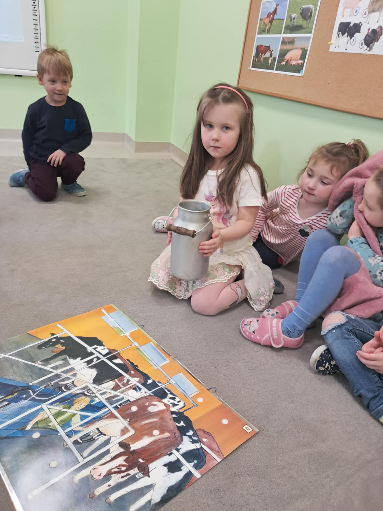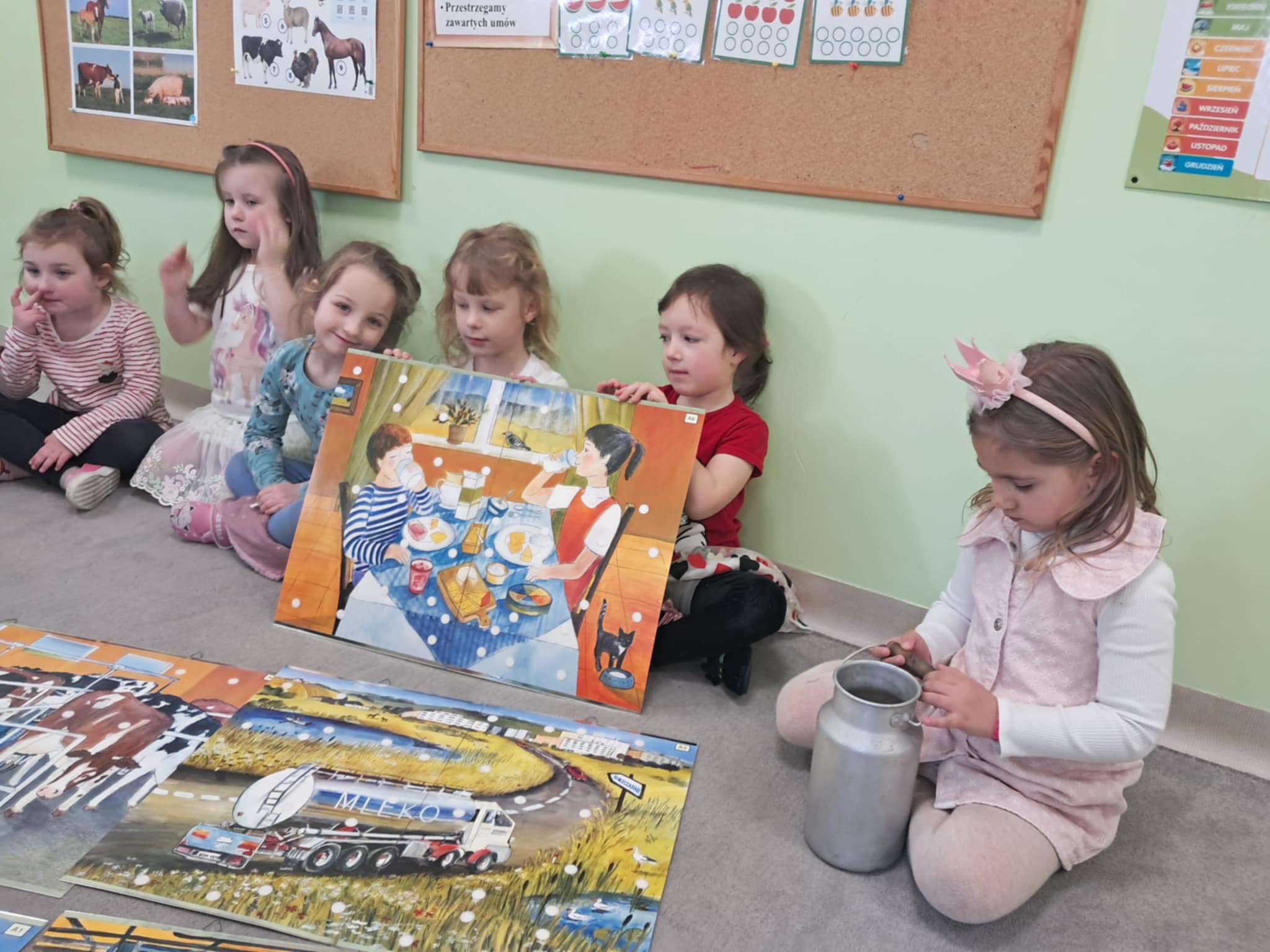Podczas zajęć dzieci zapoznały się z dawnym zawodem mleczarki. Na początku obejrzały reprodukcję obrazu „Mleczarka” Jana Vermeera i wspólnie opisywały, co znajduje się na obrazie oraz czym zajmuje się przedstawiona na nim kobieta. Następnie dzieci dowiedziały się, na czym polegała praca mleczarki w dawnych czasach oraz jakie były jej obowiązki.