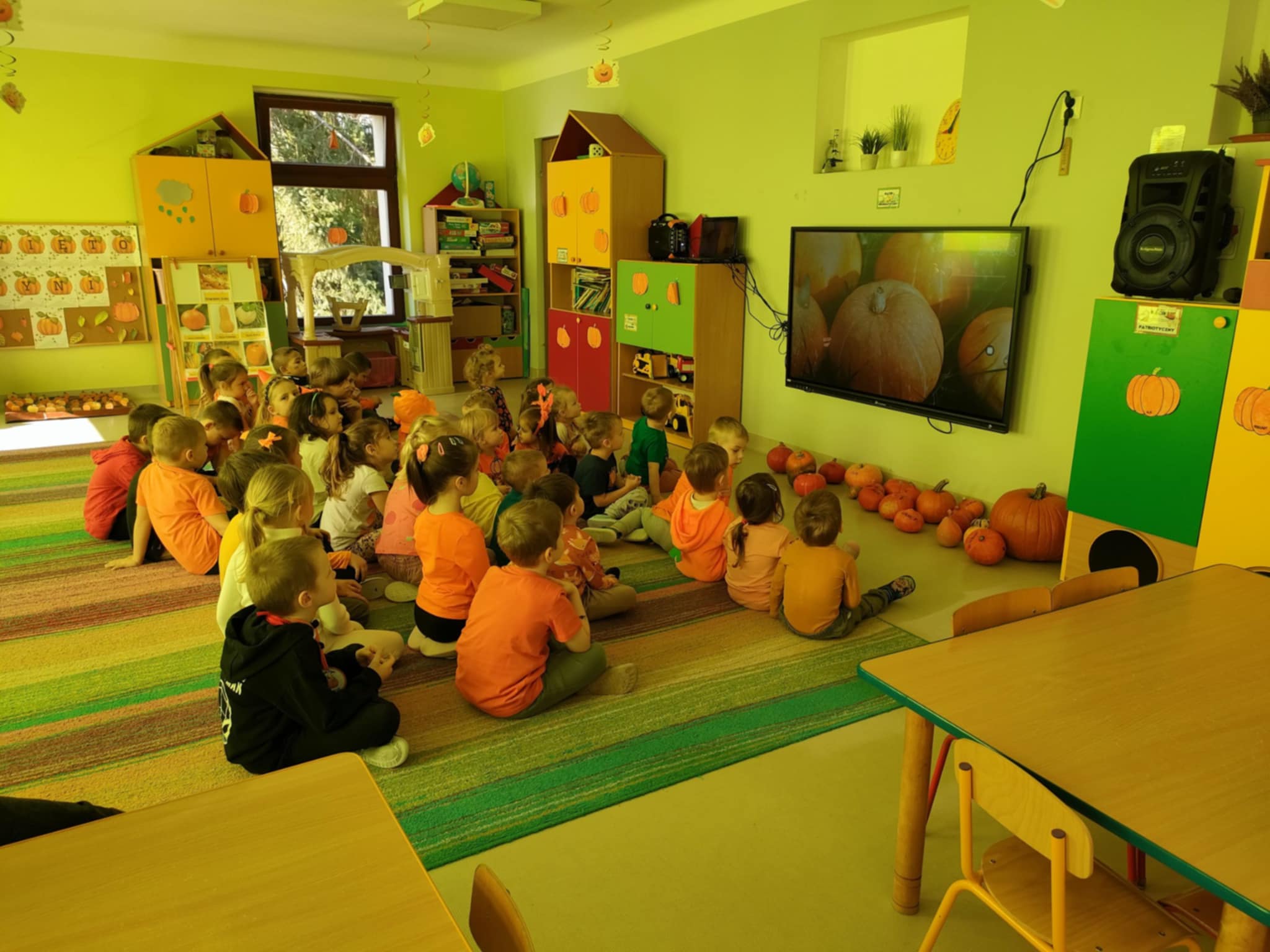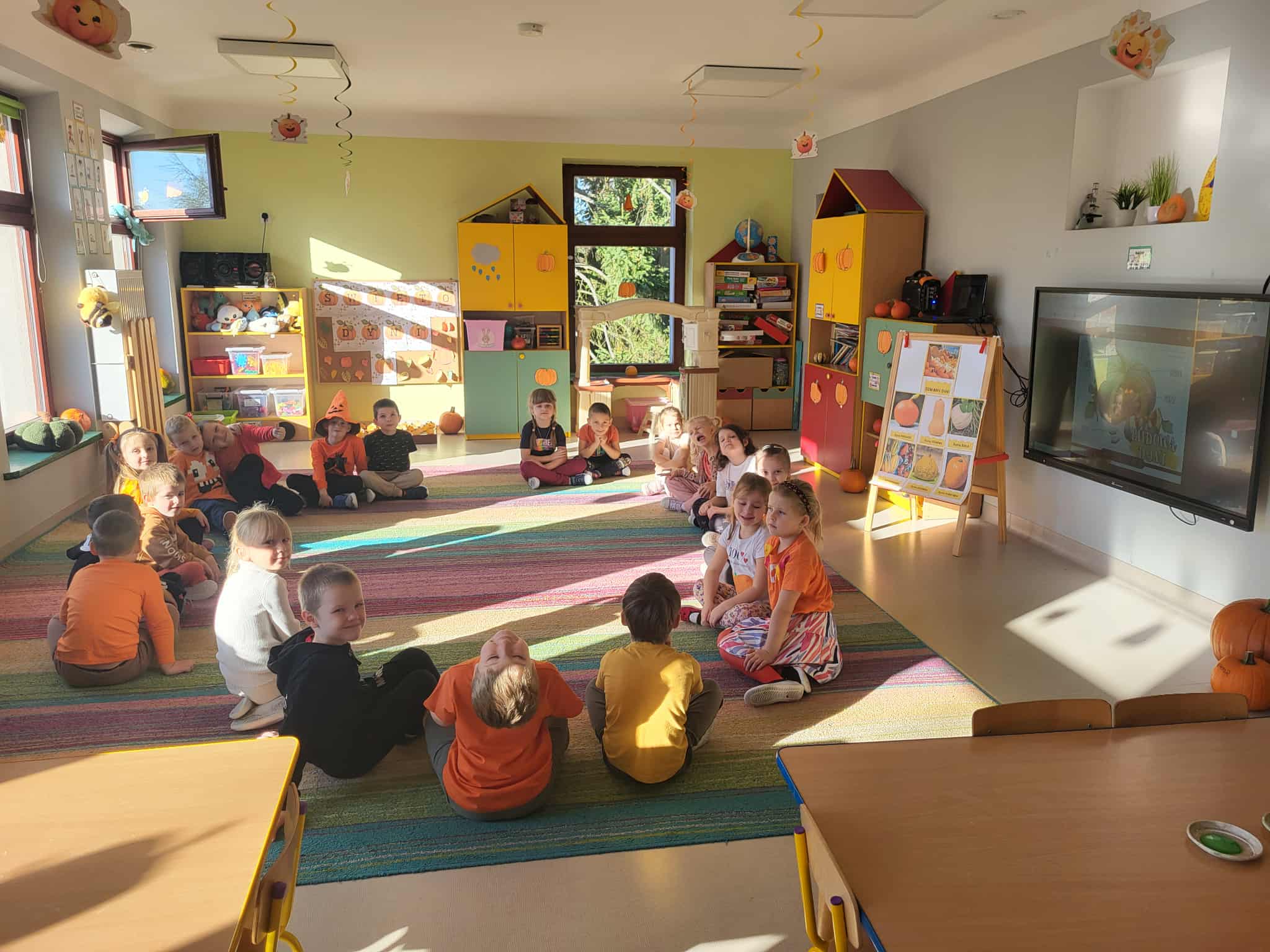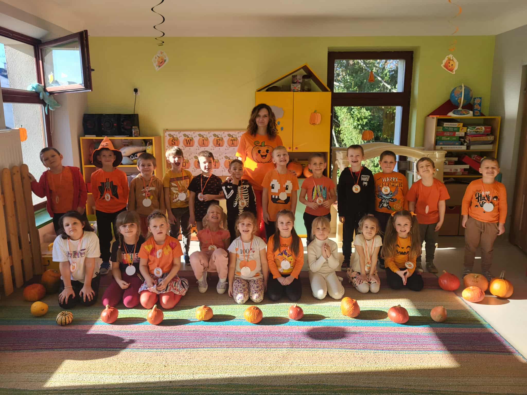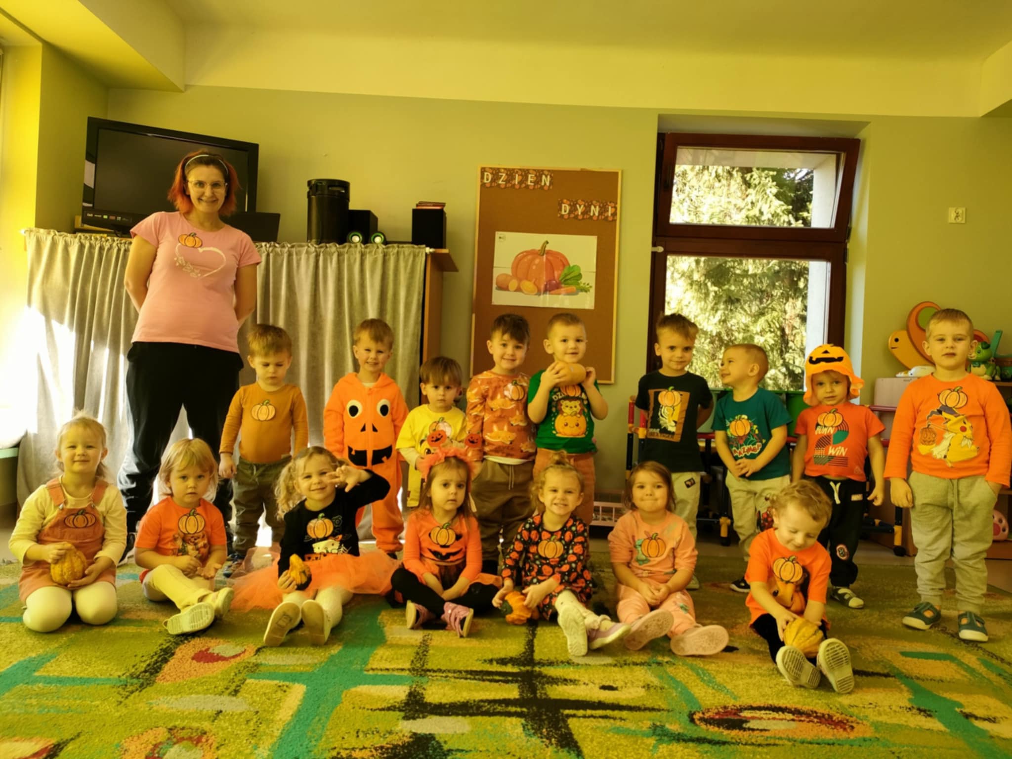 Tego dnia, dzieci były ubrane w pomarańczowe akcenty, a nasze sale zamieniły się w dyniowe krainy. Podczas zajęć braliśmy udział w ciekawych zabawach muzyczno-ruchowych, plastycznych oraz sensorycznych, w których główną bohaterką była królowa jesieni, zwana kiedyś "banią". Dowiedzieliśmy się również, co możemy zrobić z dyni: zupę, placki, ciasto a nawet dyniolinę, czyli jadalną masę plastyczną, którą przygotowały "Wiewiórki". Przedszkolaki miały okazję także poznać od środka, dotknąć oraz sprawdzić, jak ciężkie są najpopularniejsze rodzaje tego, wyjątkowego warzywa. Dzisiejsze zabawy sprawiły przedszkolakom mnóstwo radości i wprowadziły je w dyniowy świat w bardzo atrakcyjnej formie. By utrwalić zdobytą wiedzę, "Jeżyki" i "Pszczółki" spotkały się i wspólnie oglądały film edukacyjny na ekranie multimedialnym. Dziękujemy Rodzicom za pomarańczowe przygotowanie dzieci na ten, szczególny dzień.
