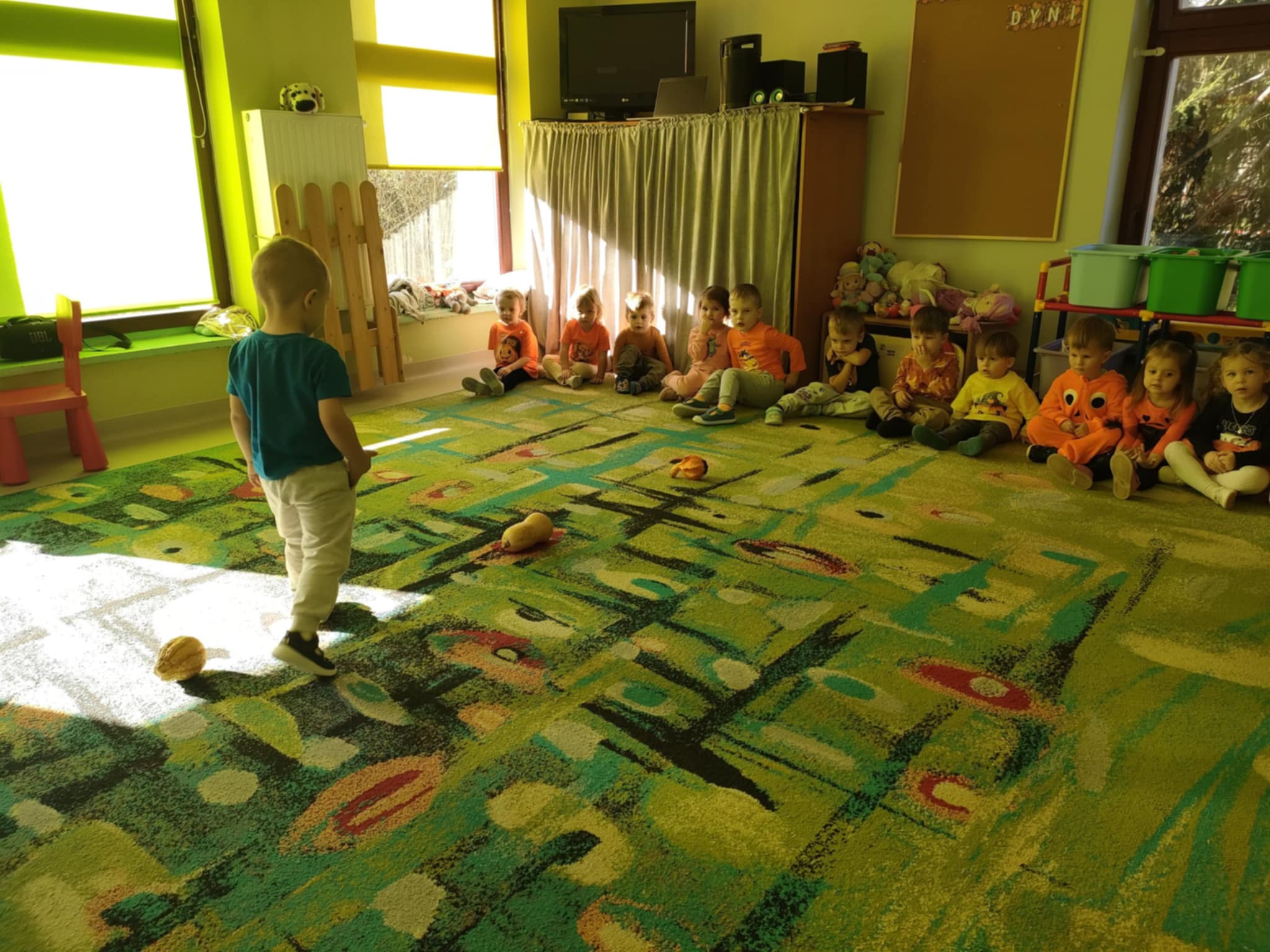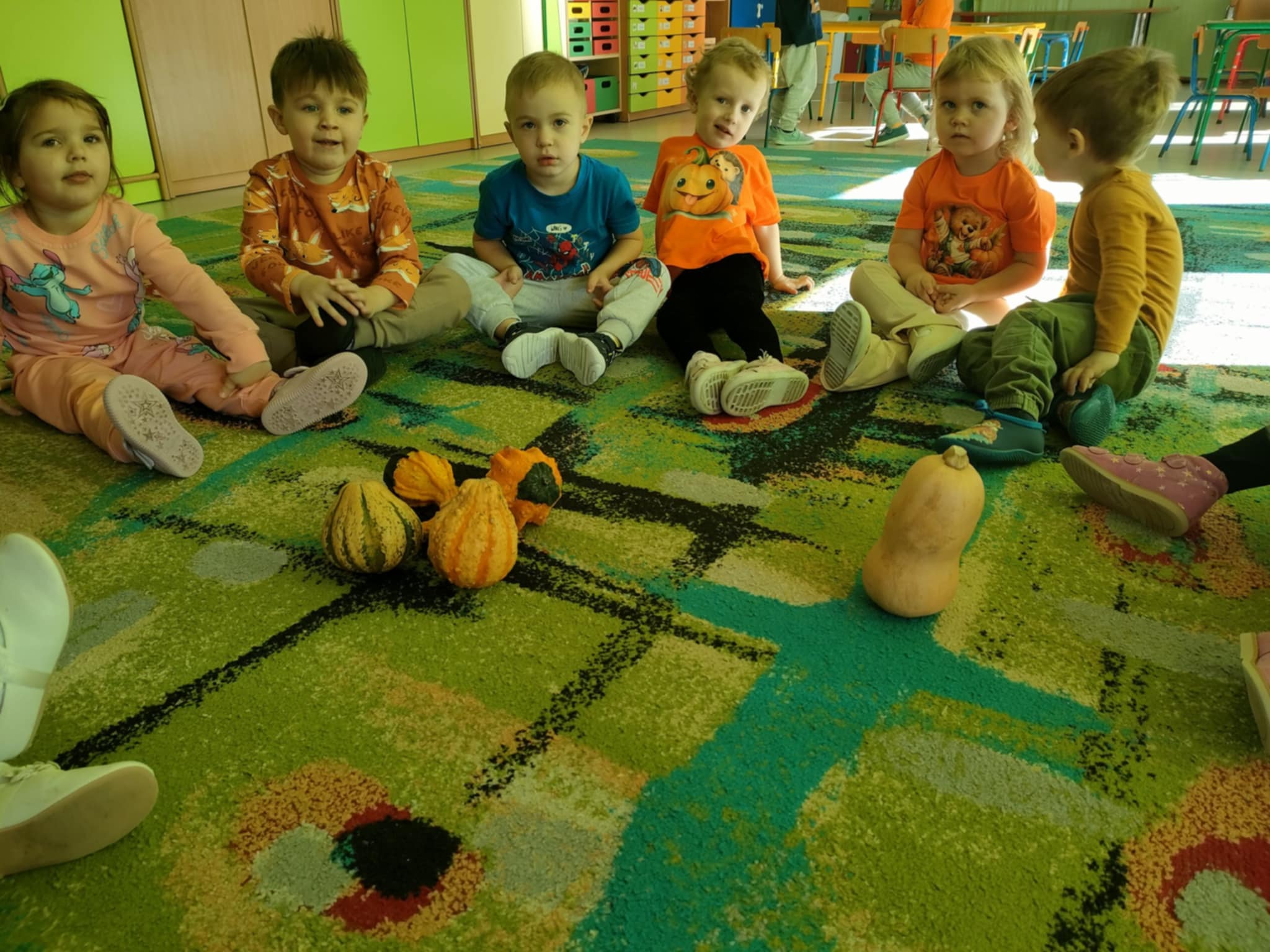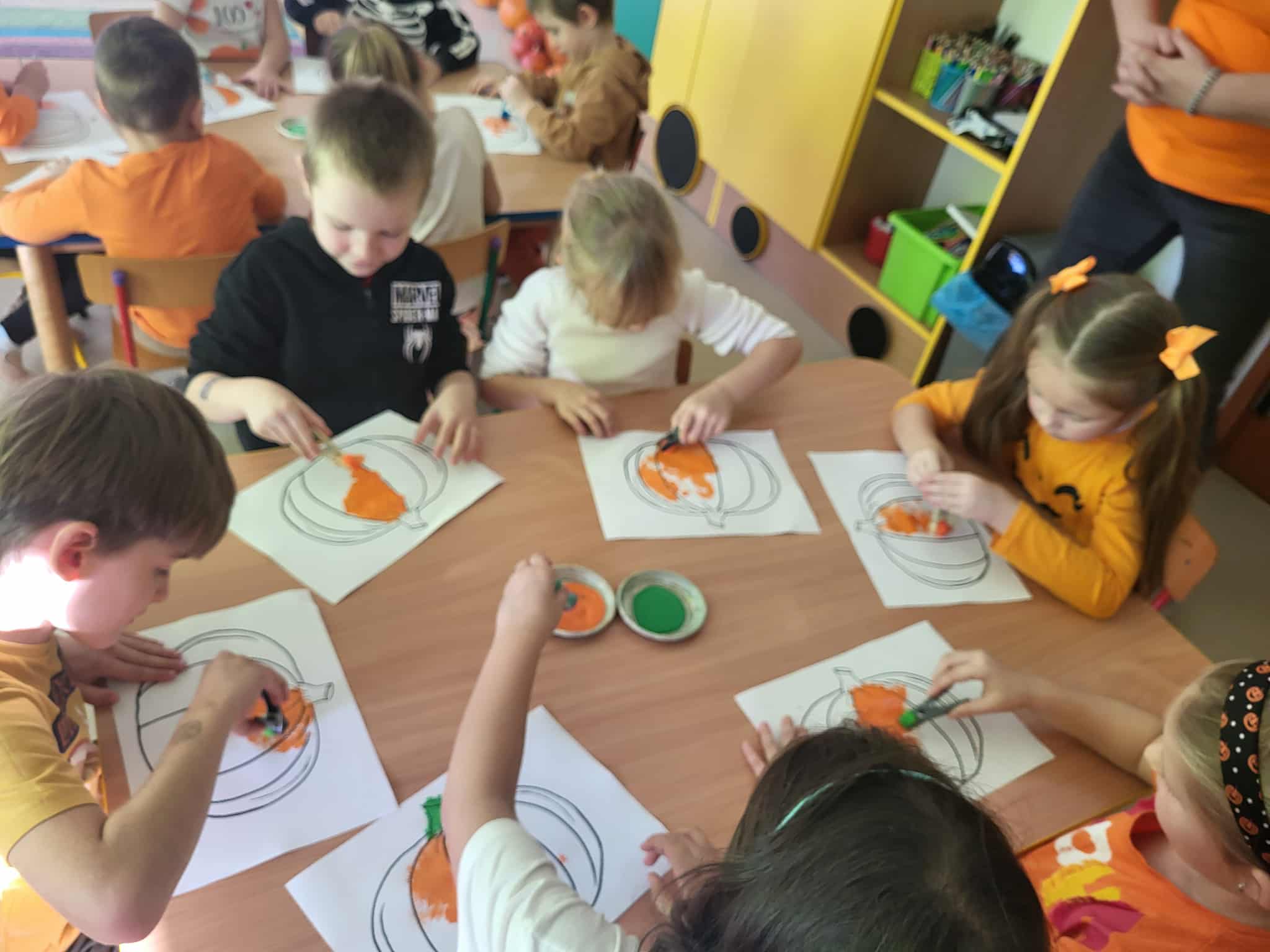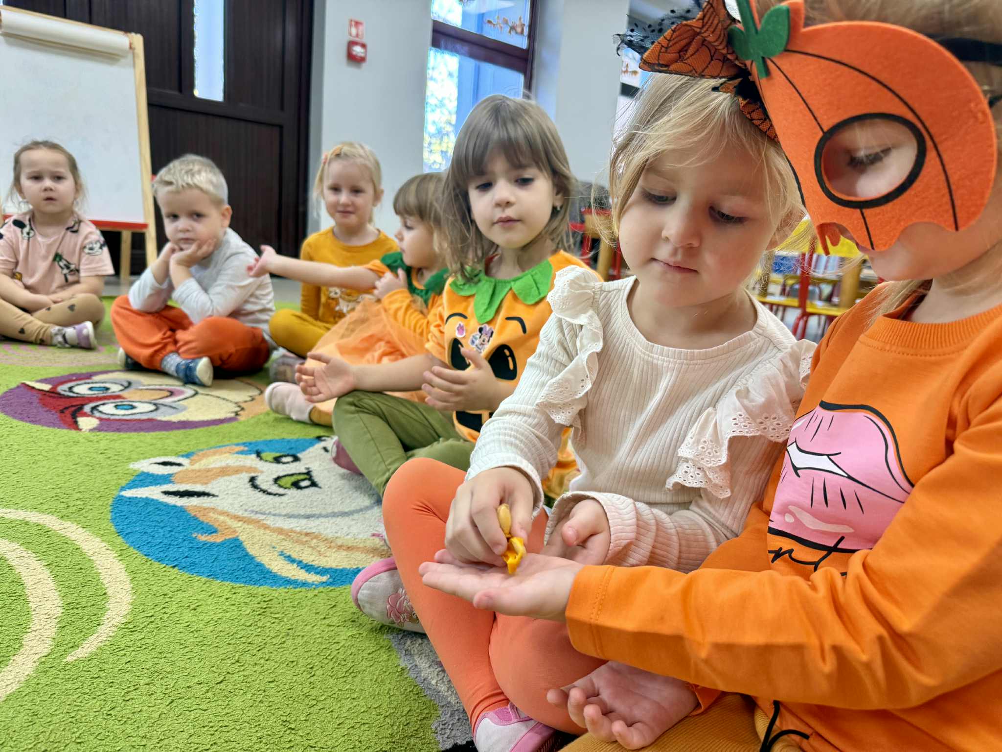 Tego dnia, dzieci były ubrane w pomarańczowe akcenty, a nasze sale zamieniły się w dyniowe krainy. Podczas zajęć braliśmy udział w ciekawych zabawach muzyczno-ruchowych, plastycznych oraz sensorycznych, w których główną bohaterką była królowa jesieni, zwana kiedyś "banią". Dowiedzieliśmy się również, co możemy zrobić z dyni: zupę, placki, ciasto a nawet dyniolinę, czyli jadalną masę plastyczną, którą przygotowały "Wiewiórki". Przedszkolaki miały okazję także poznać od środka, dotknąć oraz sprawdzić, jak ciężkie są najpopularniejsze rodzaje tego, wyjątkowego warzywa. Dzisiejsze zabawy sprawiły przedszkolakom mnóstwo radości i wprowadziły je w dyniowy świat w bardzo atrakcyjnej formie. By utrwalić zdobytą wiedzę, "Jeżyki" i "Pszczółki" spotkały się i wspólnie oglądały film edukacyjny na ekranie multimedialnym. Dziękujemy Rodzicom za pomarańczowe przygotowanie dzieci na ten, szczególny dzień.