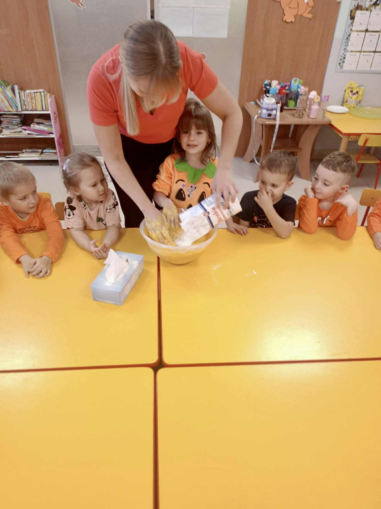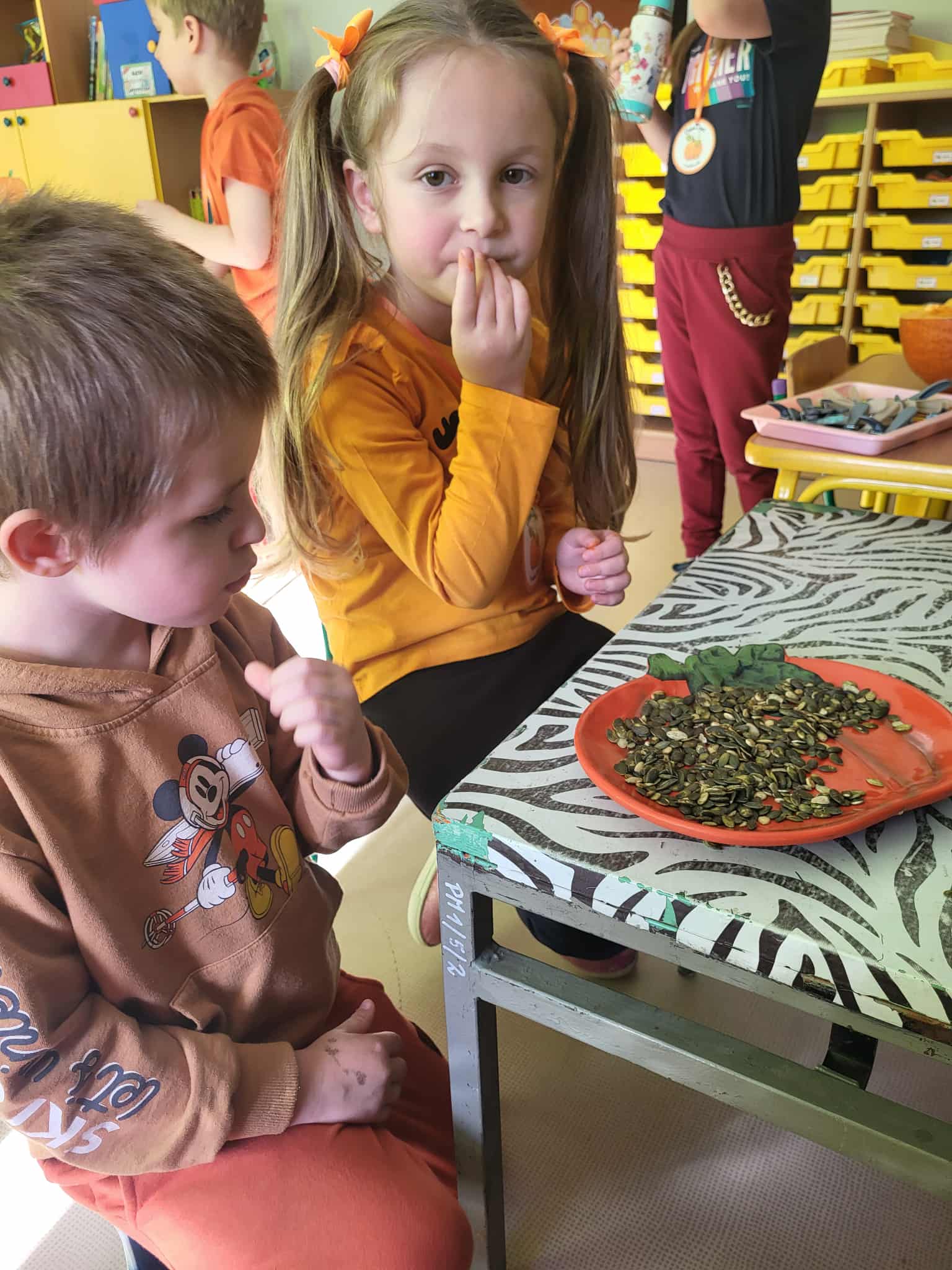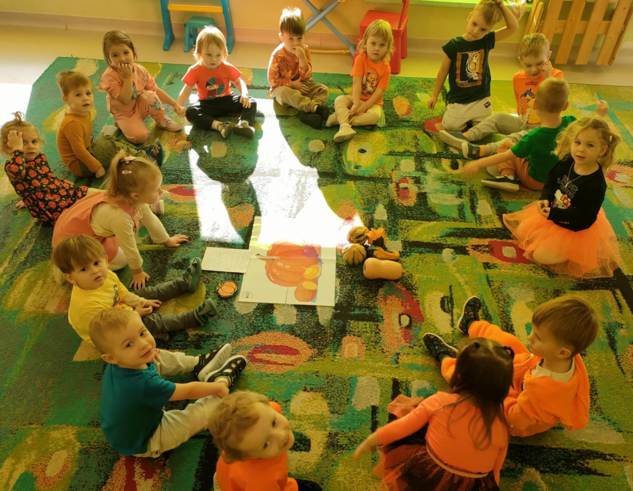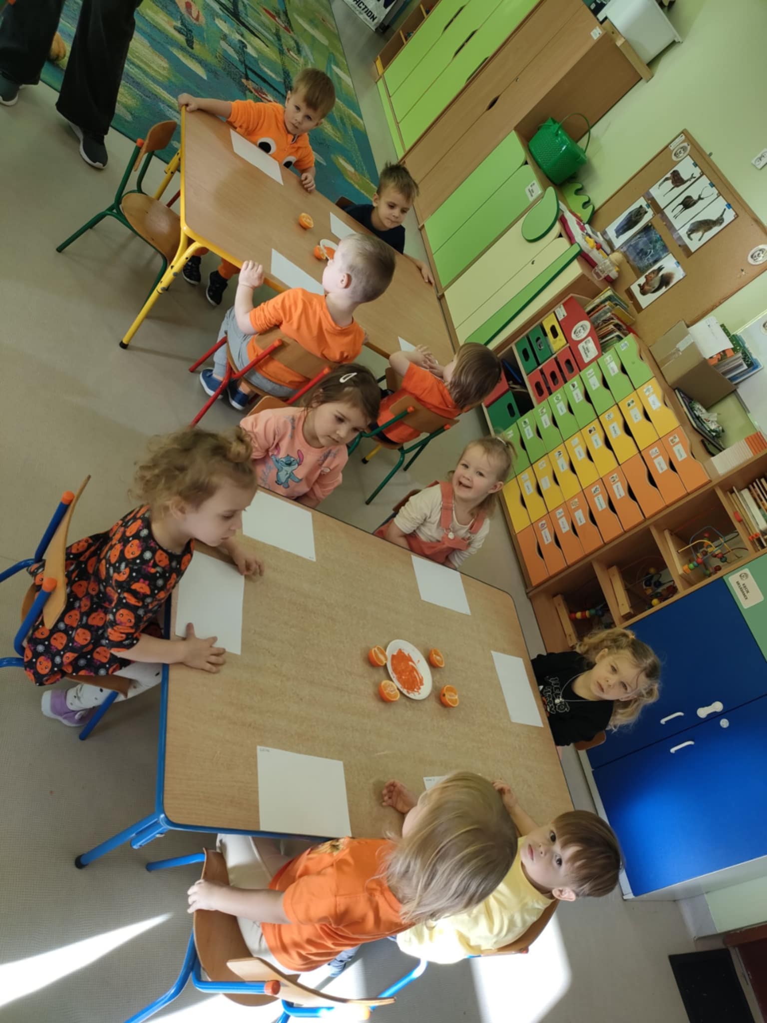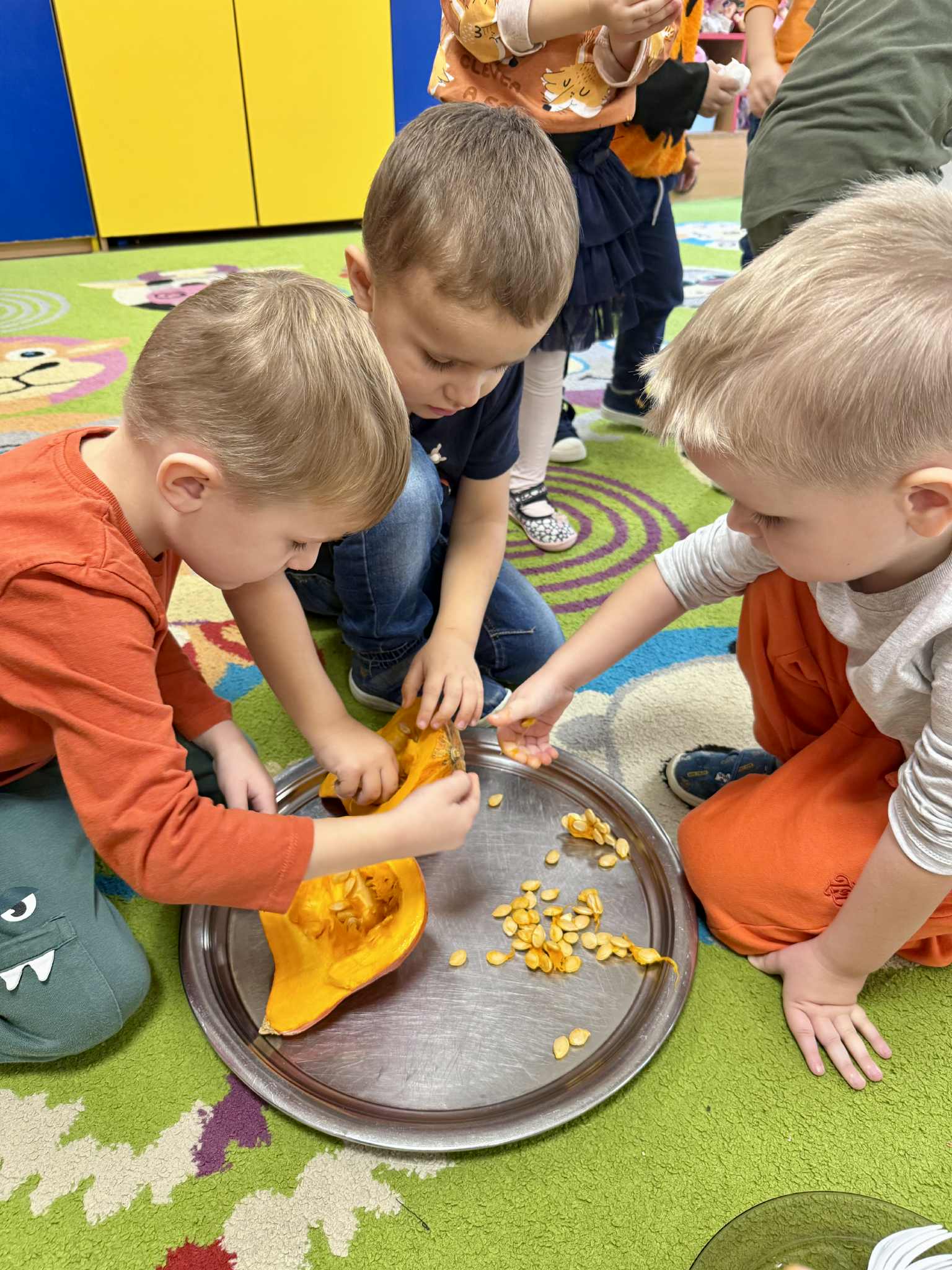 Tego dnia, dzieci były ubrane w pomarańczowe akcenty, a nasze sale zamieniły się w dyniowe krainy. Podczas zajęć braliśmy udział w ciekawych zabawach muzyczno-ruchowych, plastycznych oraz sensorycznych, w których główną bohaterką była królowa jesieni, zwana kiedyś "banią". Dowiedzieliśmy się również, co możemy zrobić z dyni: zupę, placki, ciasto a nawet dyniolinę, czyli jadalną masę plastyczną, którą przygotowały "Wiewiórki". Przedszkolaki miały okazję także poznać od środka, dotknąć oraz sprawdzić, jak ciężkie są najpopularniejsze rodzaje tego, wyjątkowego warzywa. Dzisiejsze zabawy sprawiły przedszkolakom mnóstwo radości i wprowadziły je w dyniowy świat w bardzo atrakcyjnej formie. By utrwalić zdobytą wiedzę, "Jeżyki" i "Pszczółki" spotkały się i wspólnie oglądały film edukacyjny na ekranie multimedialnym. Dziękujemy Rodzicom za pomarańczowe przygotowanie dzieci na ten, szczególny dzień.