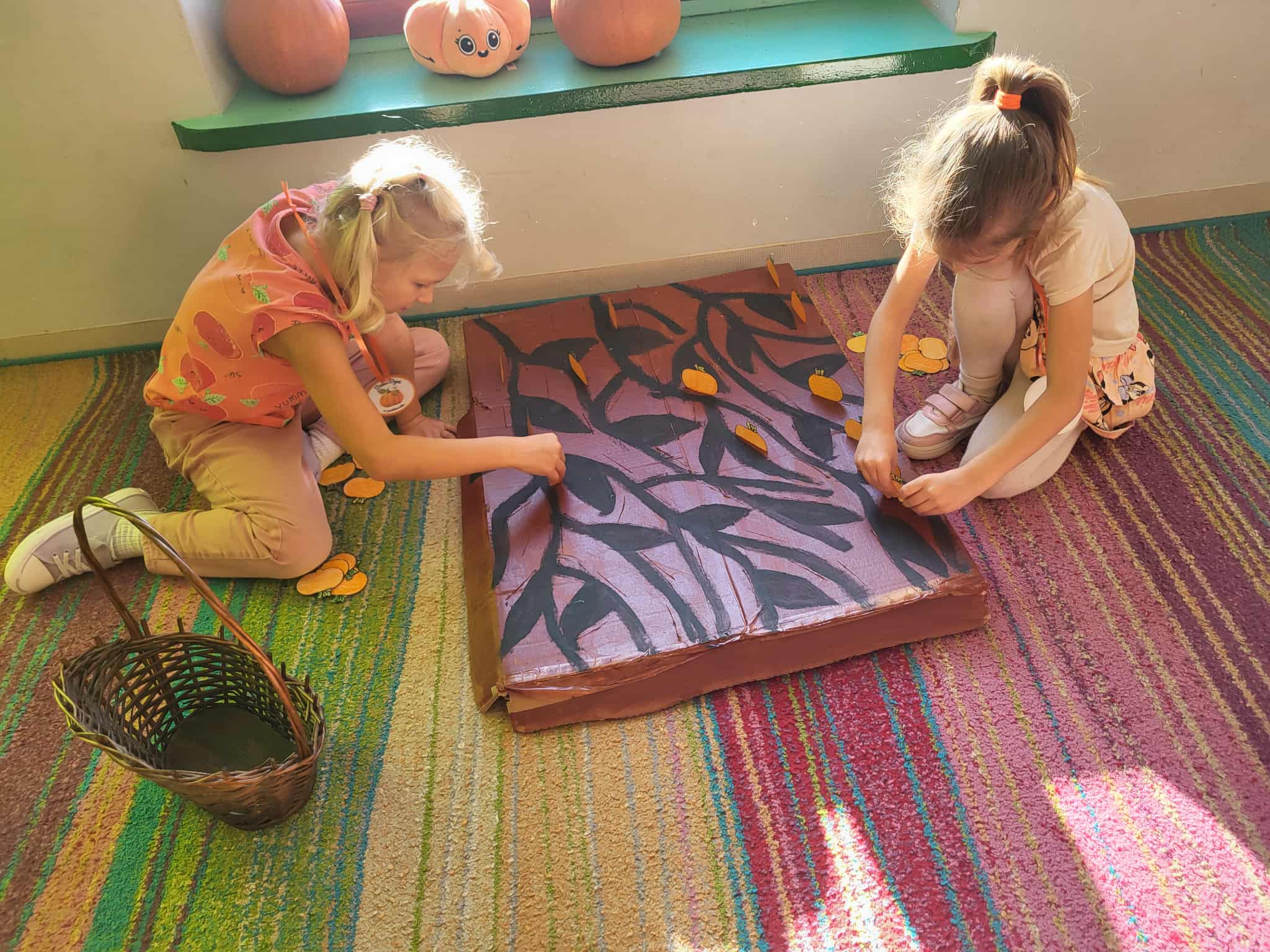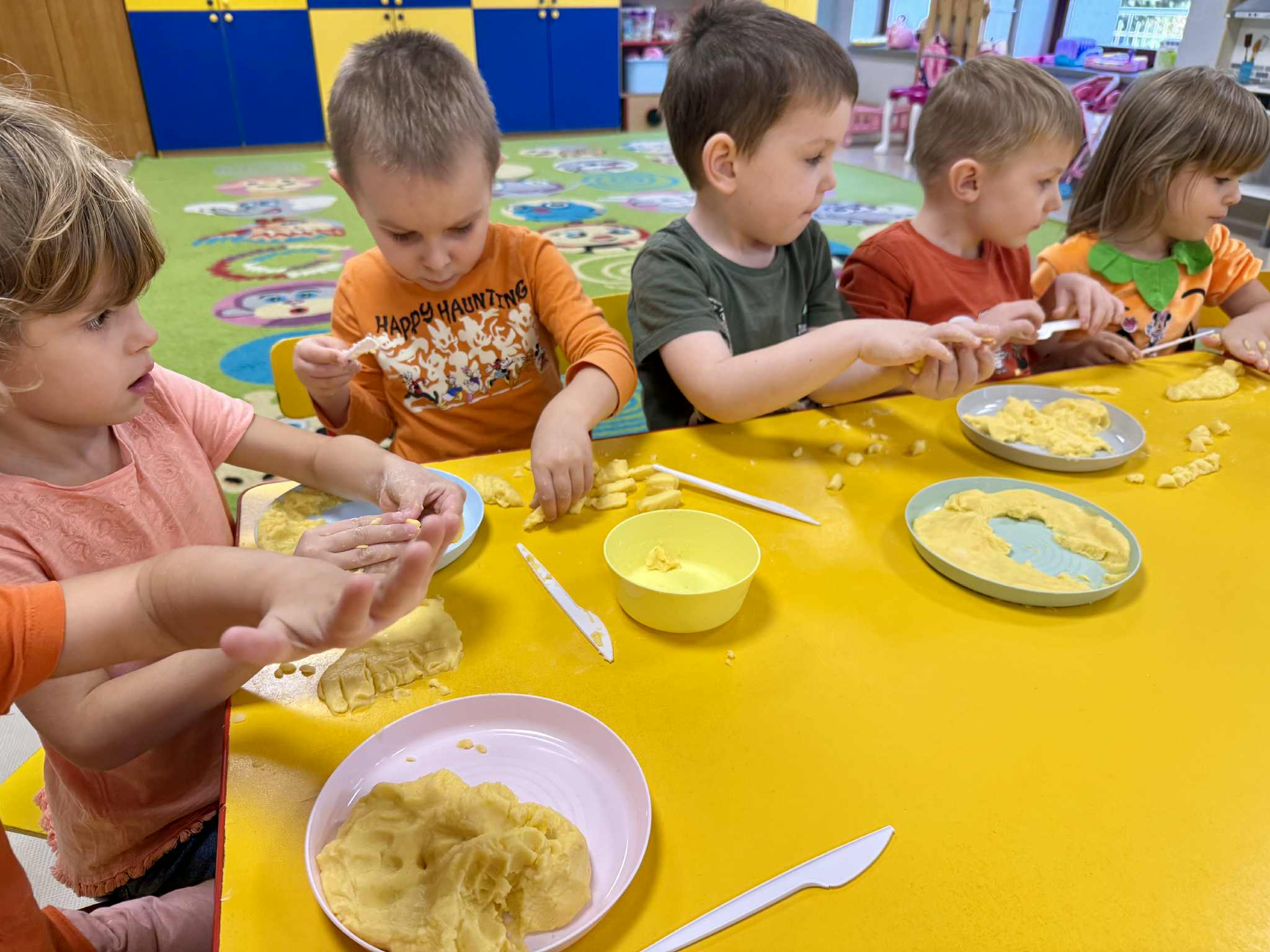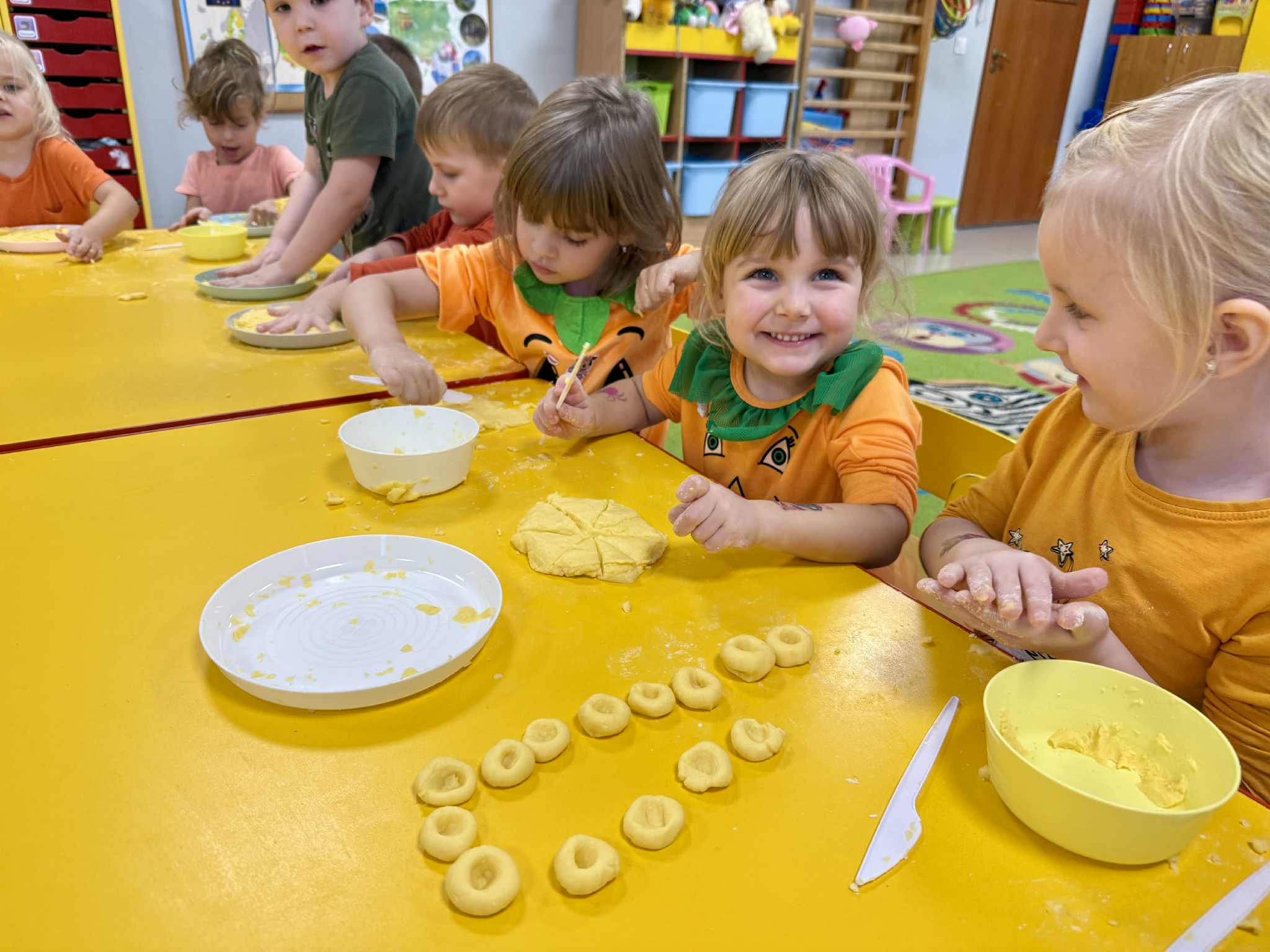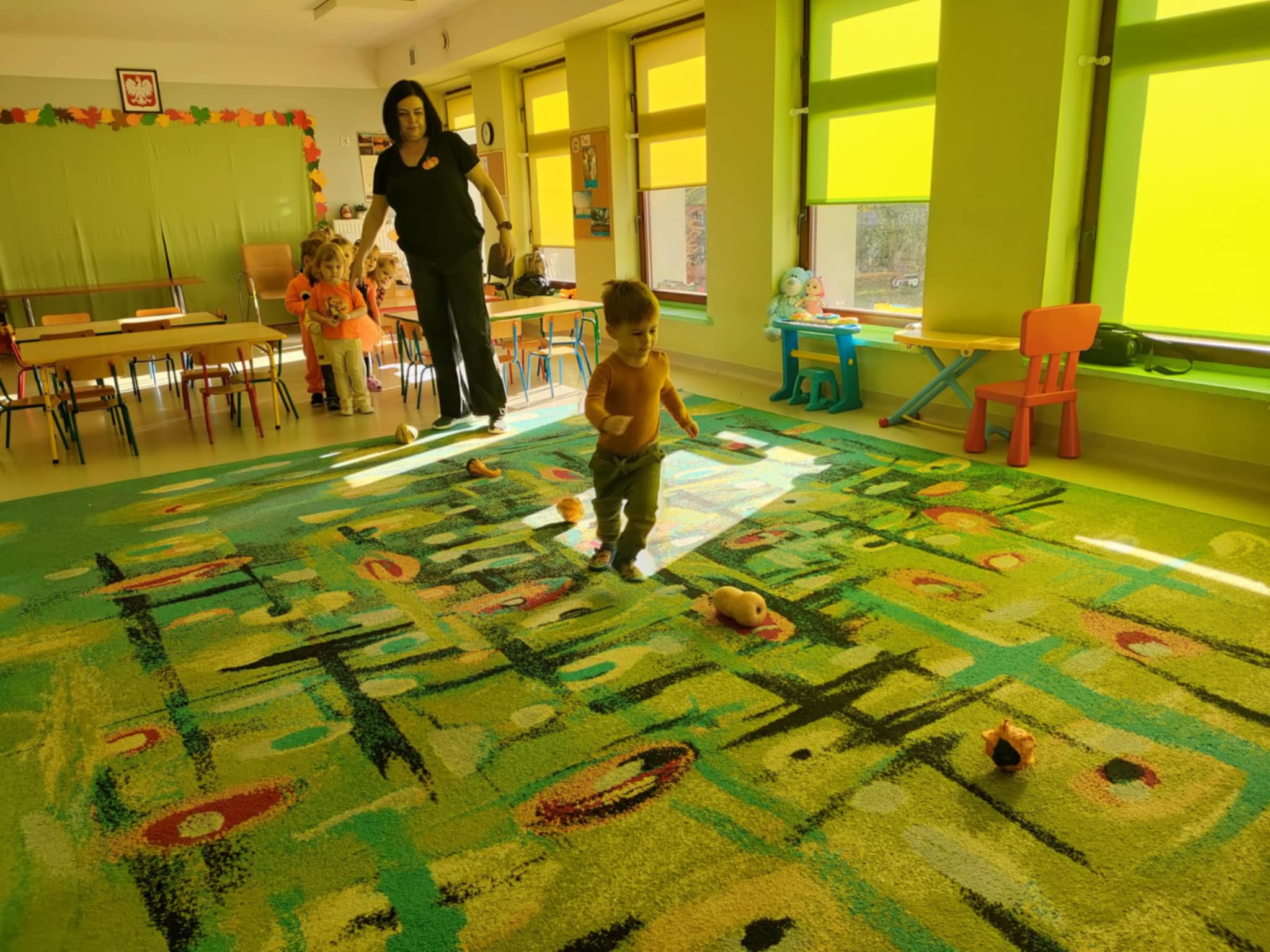 Tego dnia, dzieci były ubrane w pomarańczowe akcenty, a nasze sale zamieniły się w dyniowe krainy. Podczas zajęć braliśmy udział w ciekawych zabawach muzyczno-ruchowych, plastycznych oraz sensorycznych, w których główną bohaterką była królowa jesieni, zwana kiedyś "banią". Dowiedzieliśmy się również, co możemy zrobić z dyni: zupę, placki, ciasto a nawet dyniolinę, czyli jadalną masę plastyczną, którą przygotowały "Wiewiórki". Przedszkolaki miały okazję także poznać od środka, dotknąć oraz sprawdzić, jak ciężkie są najpopularniejsze rodzaje tego, wyjątkowego warzywa. Dzisiejsze zabawy sprawiły przedszkolakom mnóstwo radości i wprowadziły je w dyniowy świat w bardzo atrakcyjnej formie. By utrwalić zdobytą wiedzę, "Jeżyki" i "Pszczółki" spotkały się i wspólnie oglądały film edukacyjny na ekranie multimedialnym. Dziękujemy Rodzicom za pomarańczowe przygotowanie dzieci na ten, szczególny dzień.