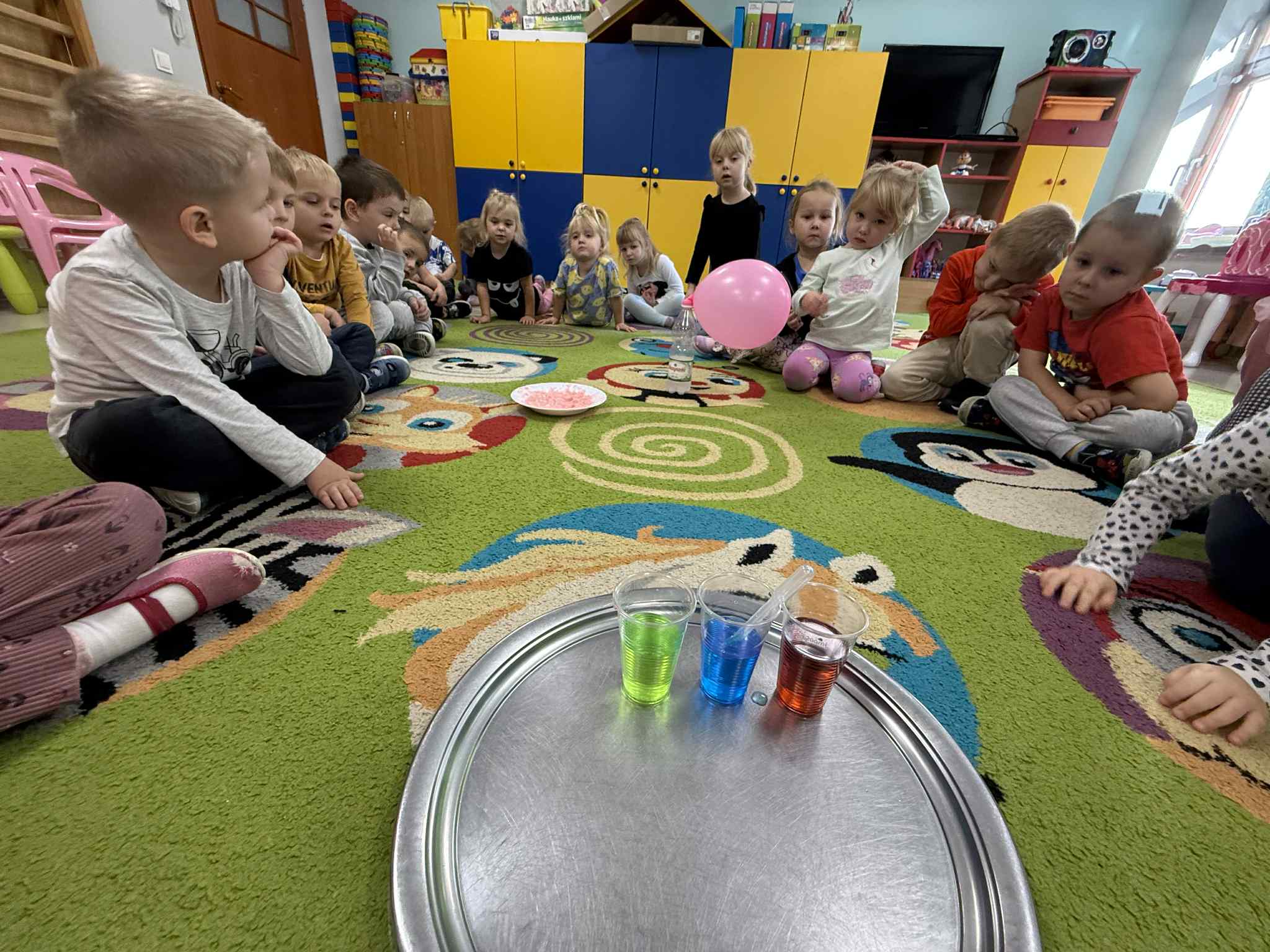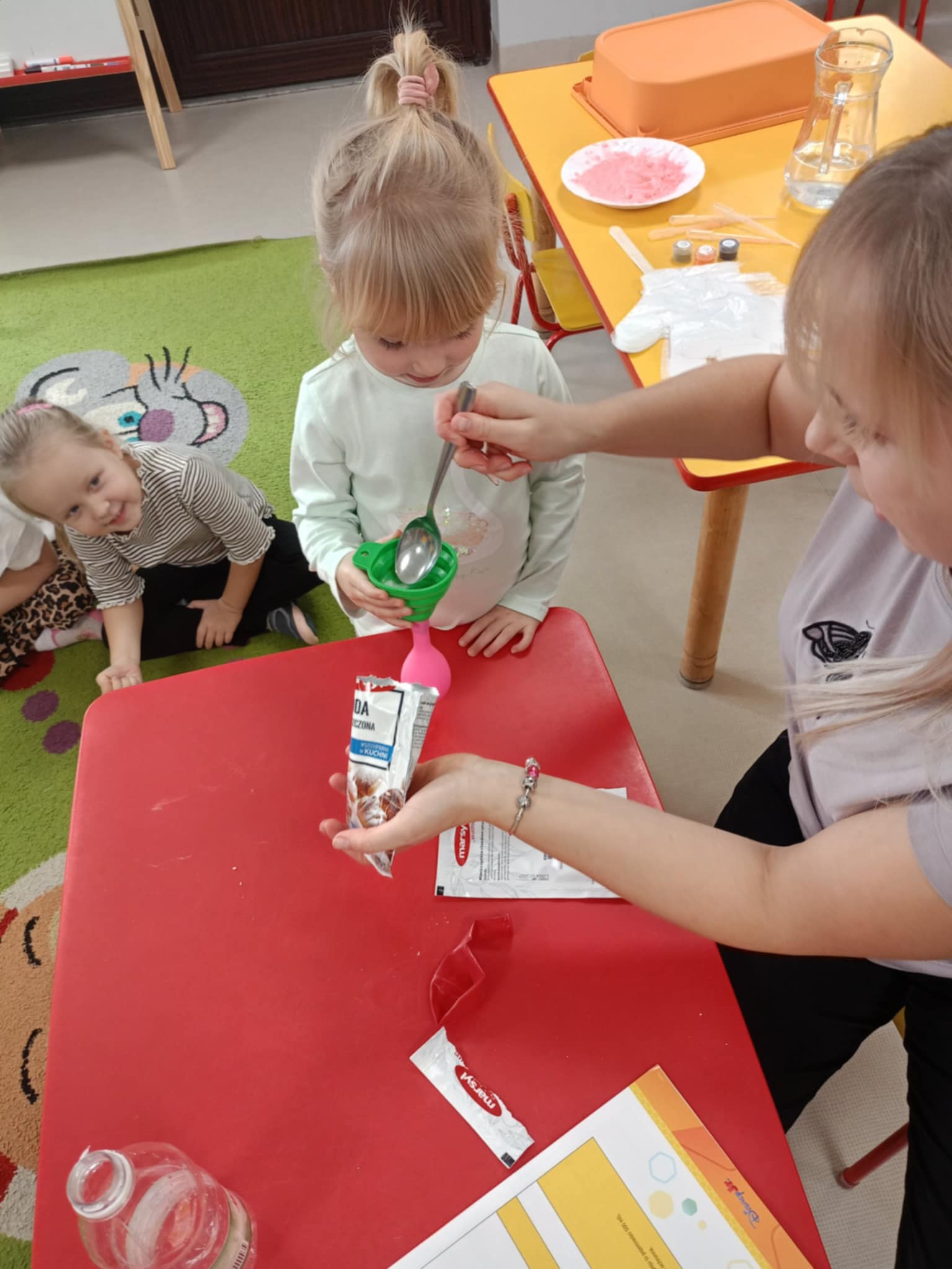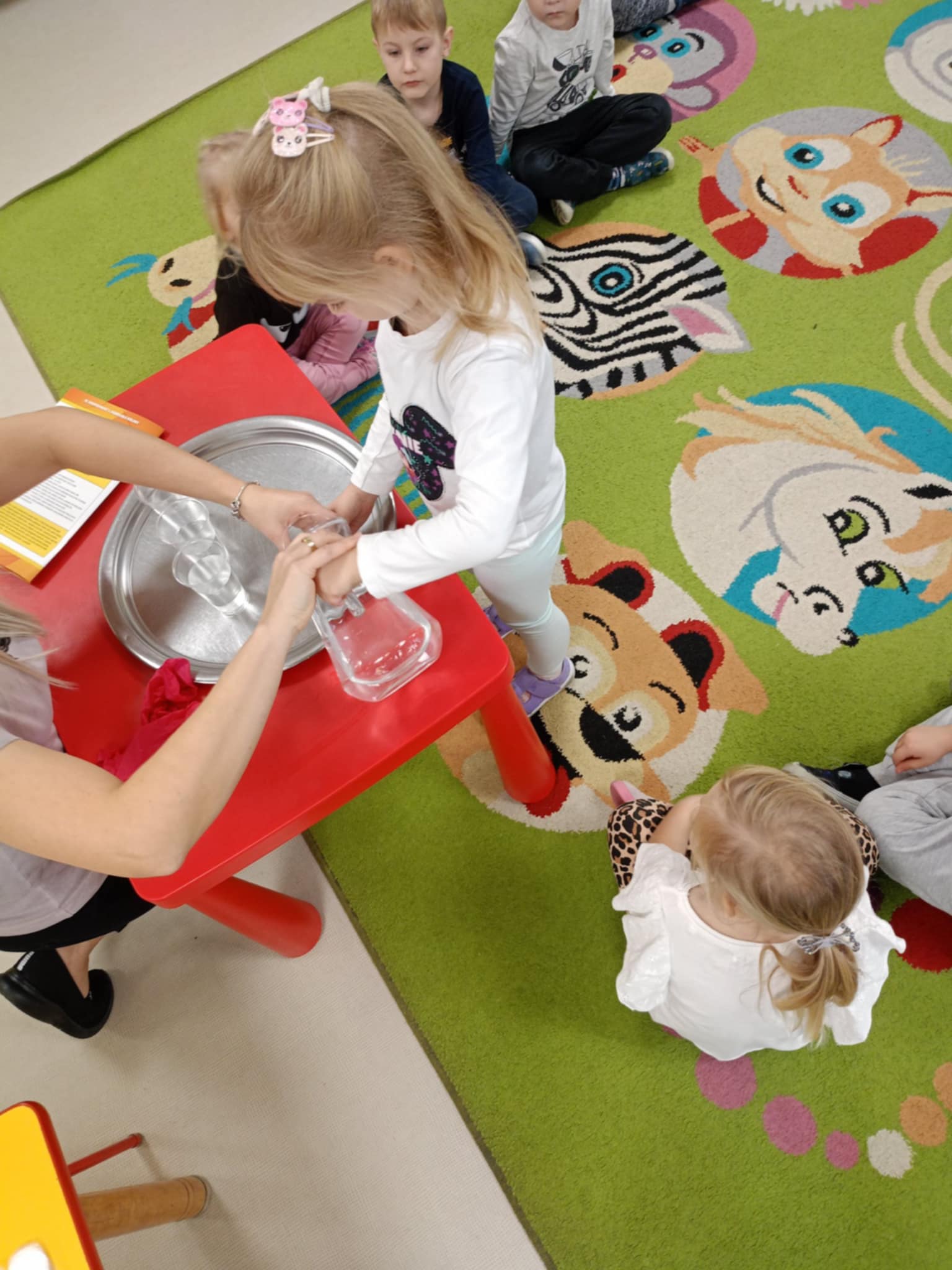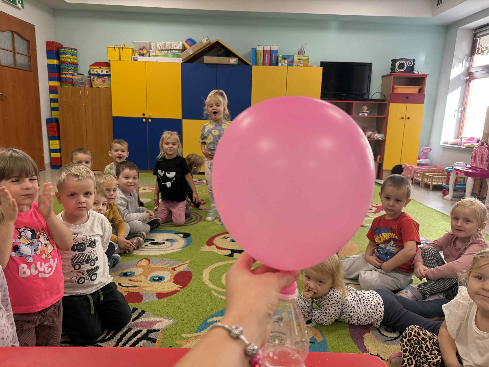 We wtorek „Wiewiórki” wzięły udział w zajęciach w ramach akcji „ Iron Man i super ekipa. Laboratorium odkrywców”. Na początku nauczyciel przedstawił dzieciom ideę akcji oraz postacie z drużyny Iron Mana. Dzieci dowiedziały się, że tego dnia same wcielą się w rolę odkrywców i przeprowadzą prawdziwe eksperymenty naukowe. Omówiono również zasady bezpieczeństwa obowiązujące podczas doświadczeń. Następnie, korzystając z materiałów z Pakietu powitalnego (kubeczki, barwniki, balony, soda oczyszczona, kwasek cytrynowy), dzieci wykonały doświadczenie „Magiczny balon”. Obserwowały, jak podczas reakcji kwasku cytrynowego z sodą powstaje gaz, który nadmuchuje balon. Wykonały także eksperyment „Wędrujące kolory” oraz obserwowały powstanie cieczy twardej jak skała. Eksperymenty wzbudziły duże zainteresowanie- dzieci z entuzjazmem obserwowały efekty i dzieliły się swoimi spostrzeżeniami. Dzięki tym doświadczeniom nie tylko nauczyły się czegoś nowego, ale również przekonały się, że warto zadawać pytania, szukać odpowiedzi i cieszyć się samym odkrywaniem. Każde dziecko otrzymało dyplom z kolorowanką, naklejki oraz list dla rodziców, zachęcający do kontynuowania idei eksperymentowania w domu.