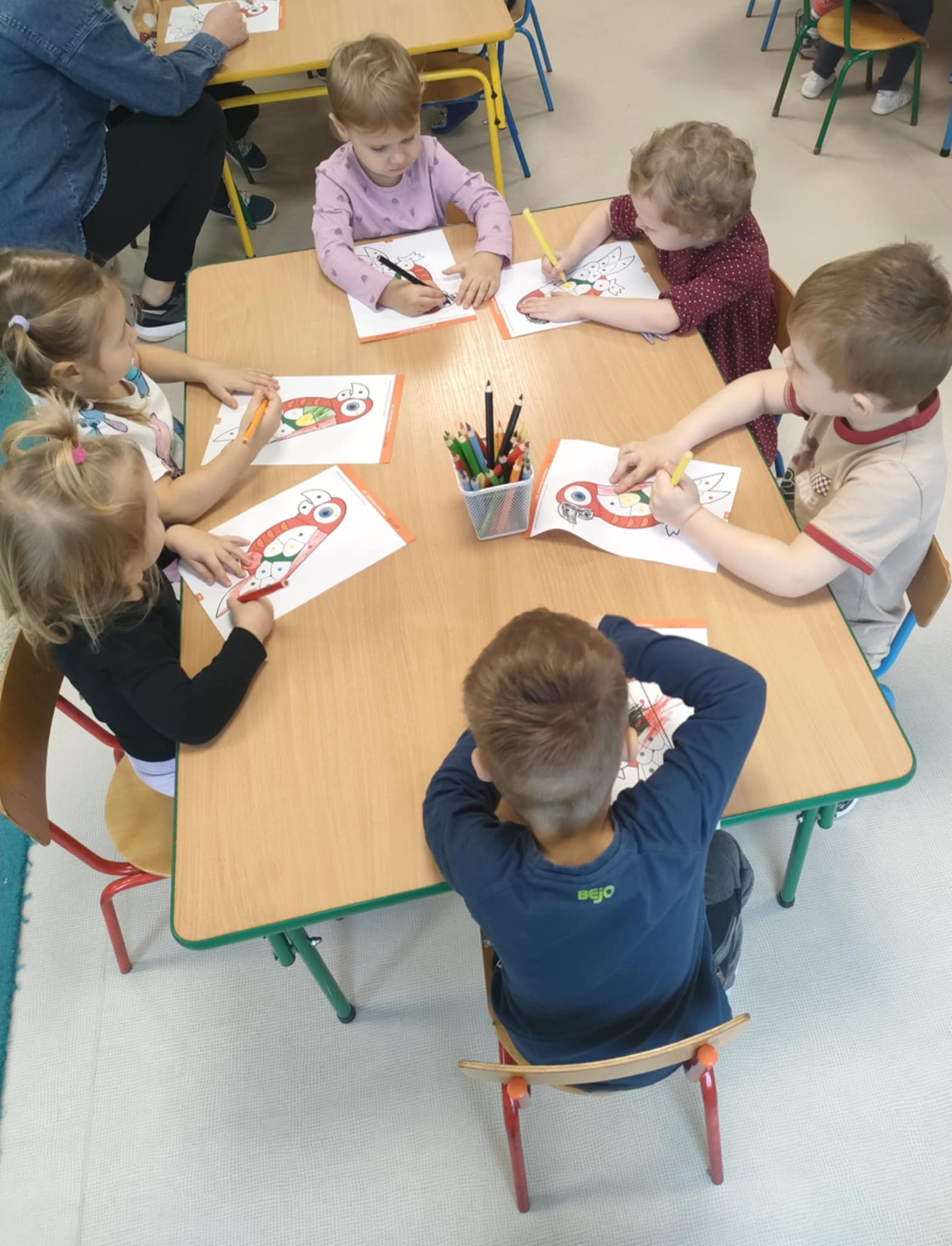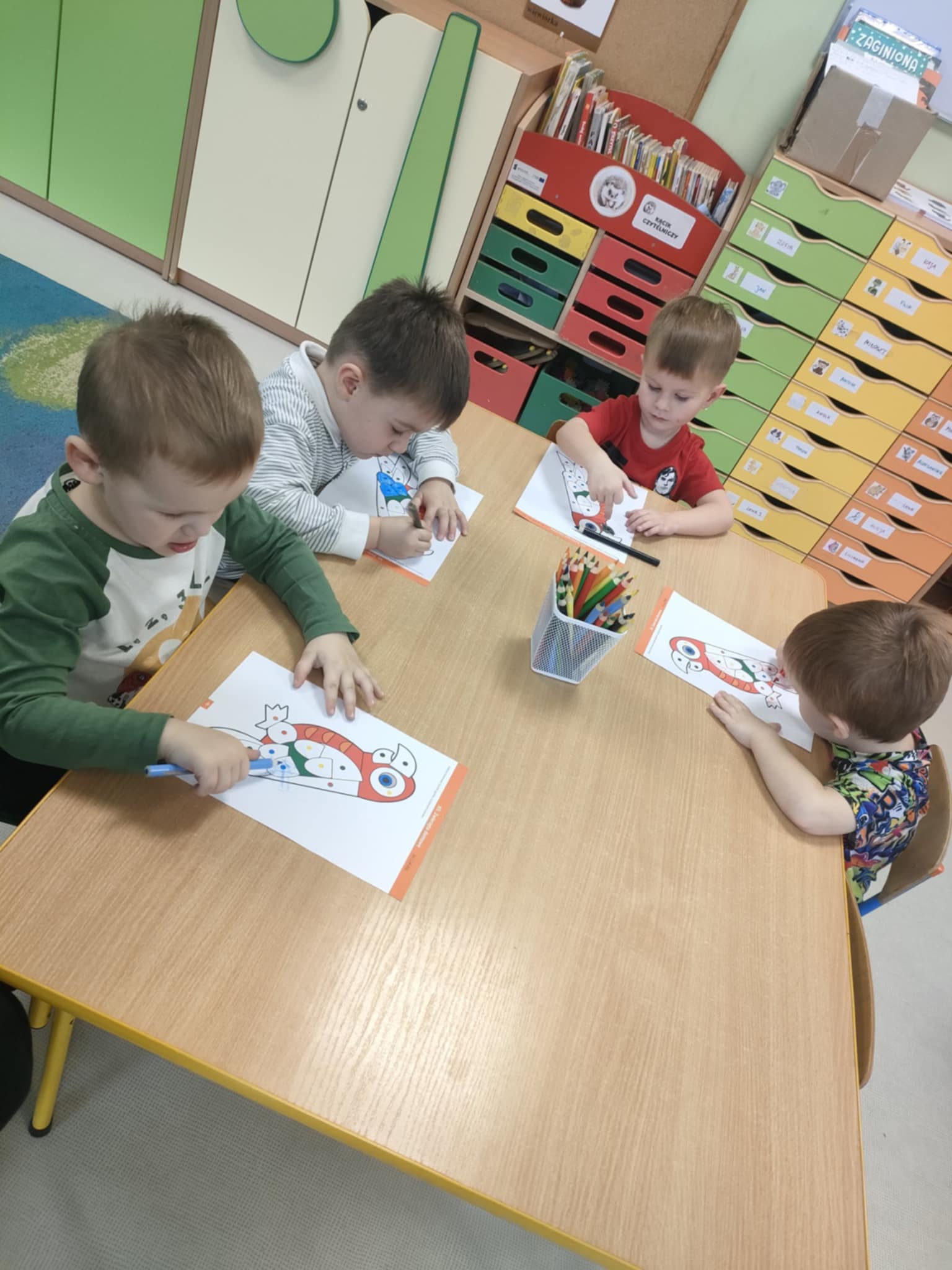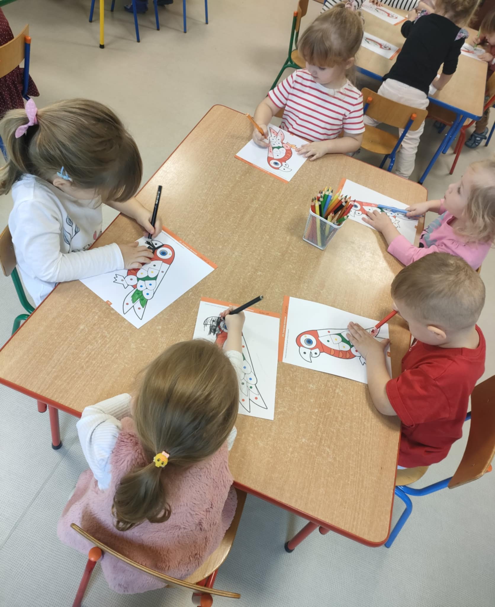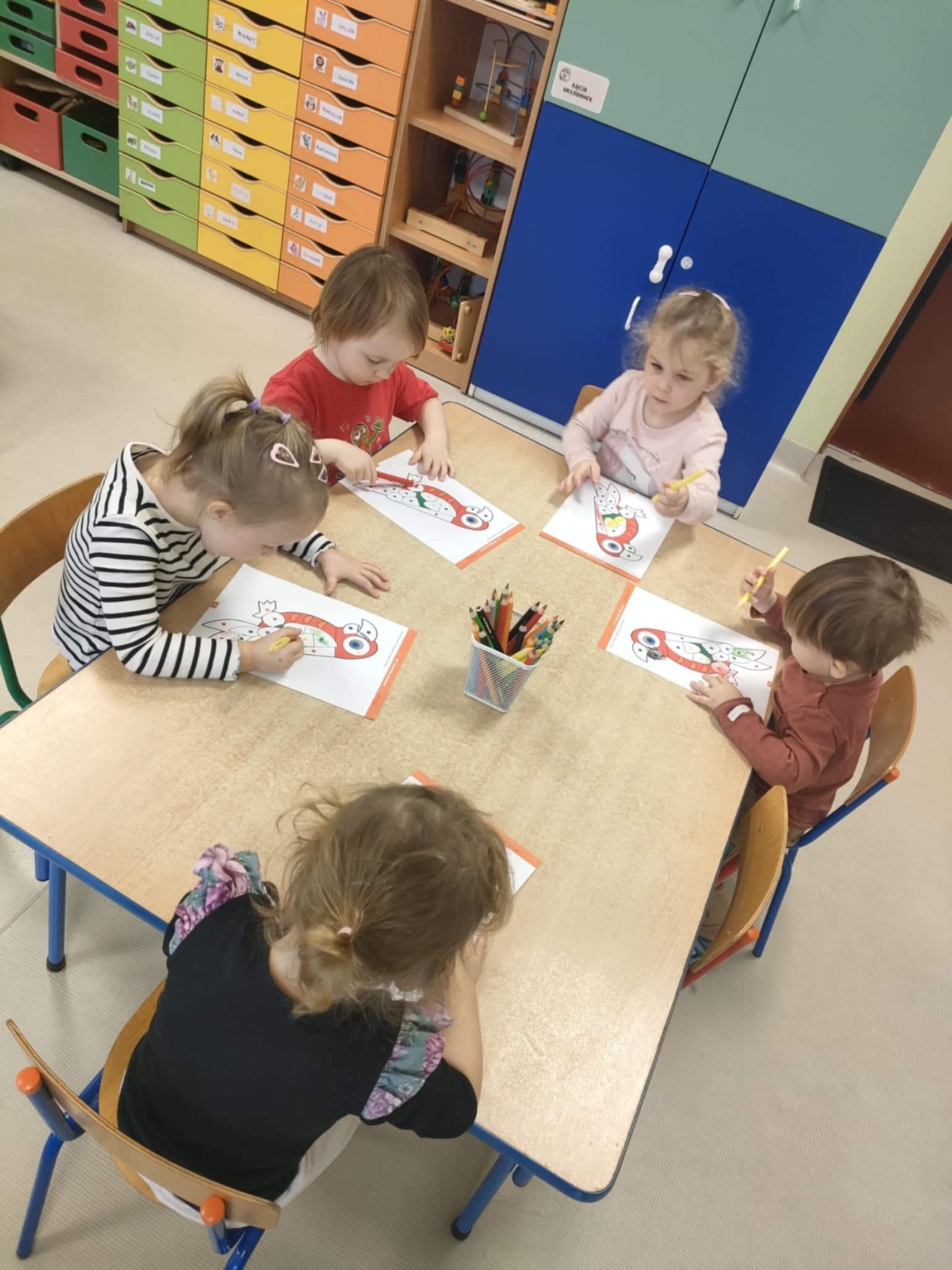 Kolorowanie to aktywność, która ma na celu poprawę koordynacji, koncentracji czy zdolności manualnych z relaksującym działaniem. Jest to metoda stosowana zarówno u dzieci, jak i dorosłych, pozwalająca na uspokojenie emocji, redukcję stresu, ćwiczenie cierpliwości i kreatywności, a także na wspieranie rozwoju intelektualnego i manualnego. Sprzyja kształtowaniu sprawności manualnej i koordynacji wzrokowo-ruchowej, ponieważ doskonali małą motorykę, precyzję ruchów oraz koordynację oko-ręka, co jest kluczowe w przyszłej nauce pisania i innych codziennych czynnościach. Dodatkowo pomaga w nauce rozpoznawania kolorów, kształtów i wzorów, a także rozwija zdolności koncentracji i cierpliwości, utrwalając umiejętność skupienia uwagi na jednym zadaniu. Zachęcajmy maluszki do kolorowania również w środowisku domowym, lecz pamiętajmy, by przygotowane wcześniej szablony nie były zbyt duże i męczące dla nich. Dla dzieci uzdolnionych plastycznie i tych, które chętnie podejmują zabawy manualne, warto zaproponować nieszablonowe rysowanki(puste, białe kartki) na dany temat tak, aby dodatkowo rozwijać ich twórczość i kreatywność.
