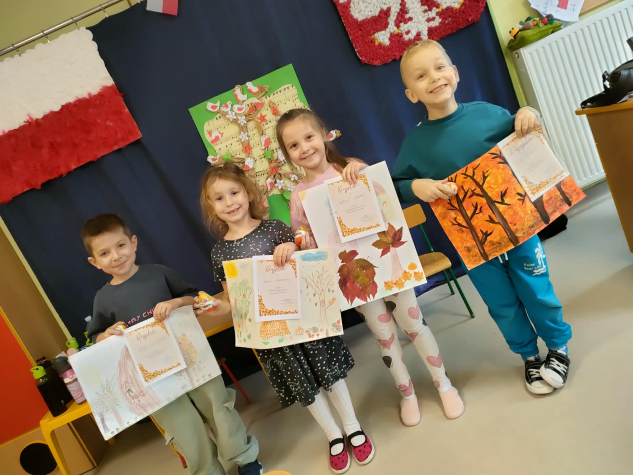 Tematem konkursu była jesień widziana oczami dziecka - jej barwy, zjawiska atmosferyczne, przyroda, tradycje i symbole związane z tą porą roku. Prace miały przedstawiać jesień lub jej personifikację w sposób twórczy i oryginalny. Głównym celem było m.in.: rozwijanie i promowanie twórczości dzieci, a także utrwalanie obserwacji zjawisk przyrodniczych, charakterystycznych dla jesieni. Wśród odpuszczalnych technik znalazło się: malarstwo, rysunek, kolaż lub techniki mieszane. Format pracy to A3 i należało ją dostarczyć w formie papierowej do 10.10.2025r. do Miejskiego Ośrodka Kultury w Ozorkowie. Z naszego przedszkola udział wzięło kilkoro chętnych dzieci z grupy "Pszczółek": Adam Skonieczny, Filip Ochota, Kornelia Michalska, Marika Kozanecka, Szymon Sowiński, Karolina Jaszczak oraz Hanna Buczel. Ogromnie miło nam ogłosić, iż w dniu 21.10.2025r.(wtorek) w MOK-u w Ozorkowie odbyło się rozstrzygnięcie, ogłoszenie wyników oraz otwarcie wystawy pokonkursowej, a wśród laureatów znaleźli się: