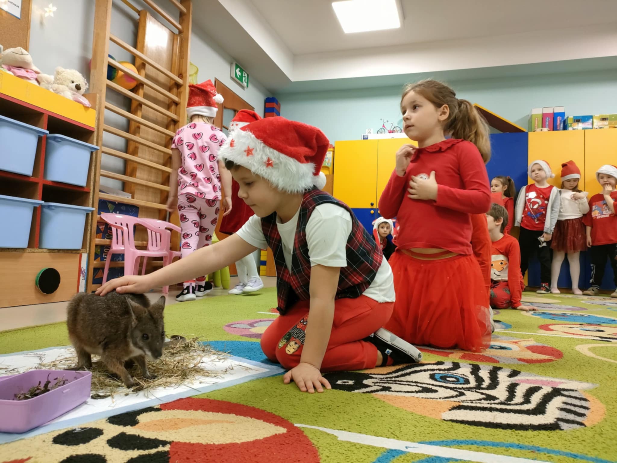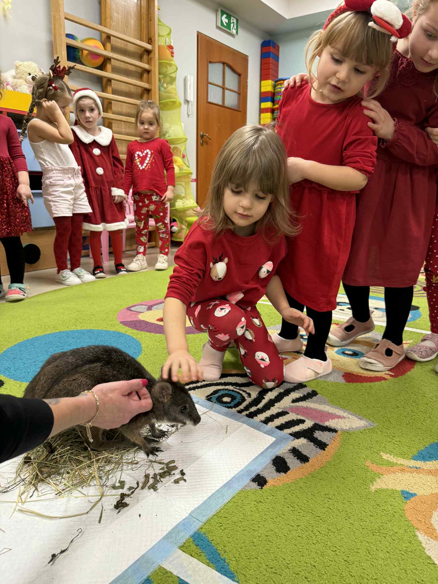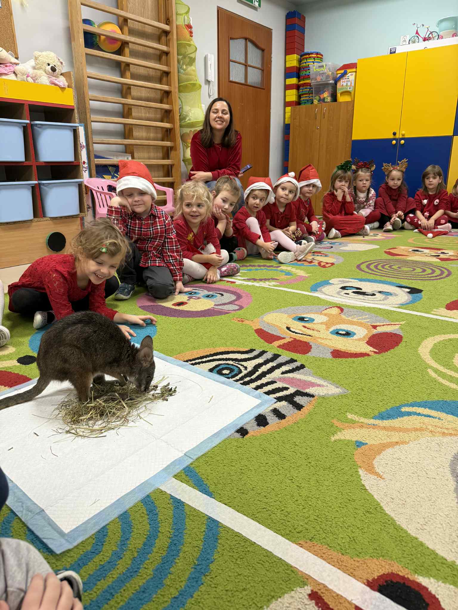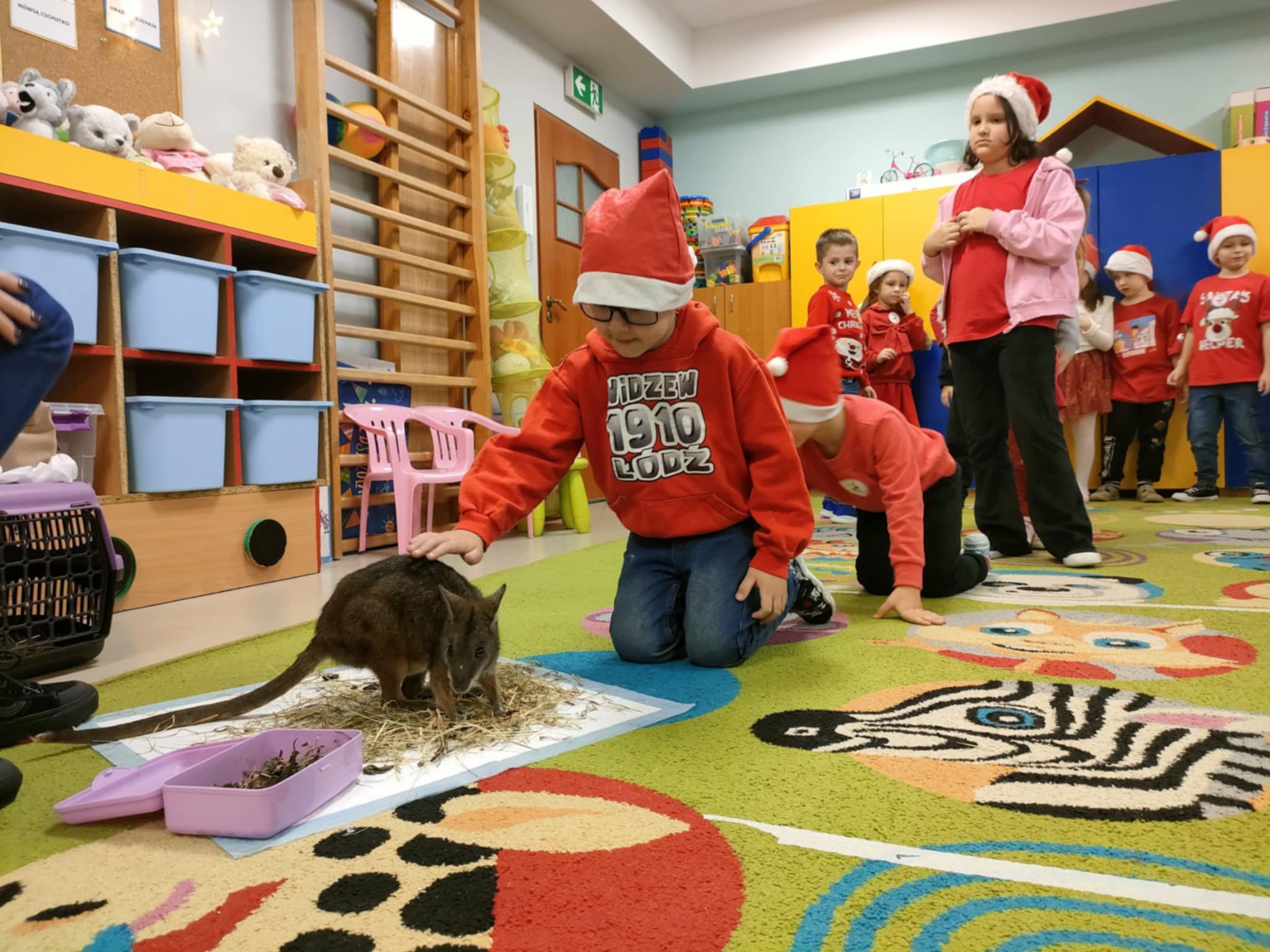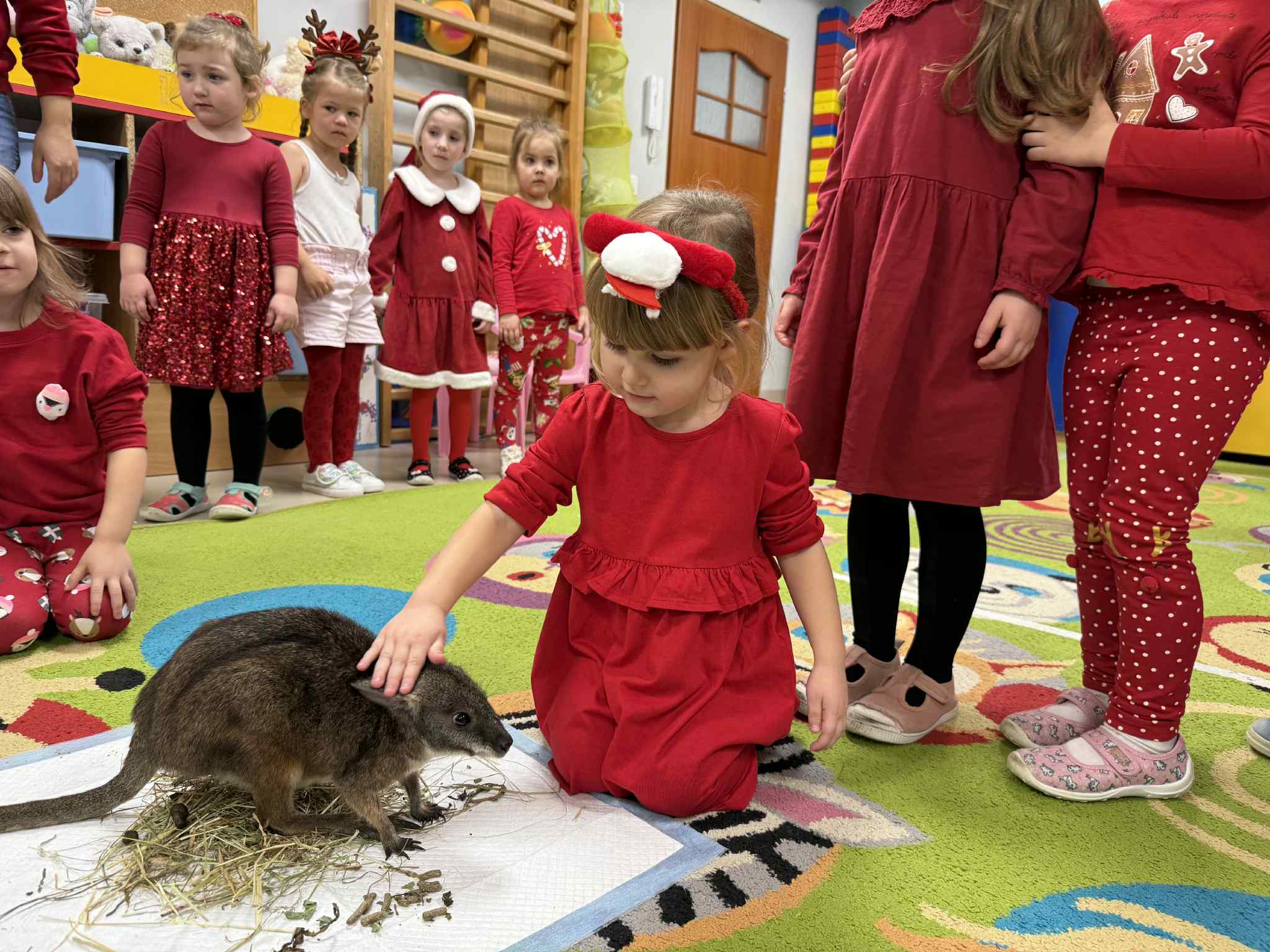 Dziś nasze przedszkole zamieniło się w prawdziwą, mikołajkową krainę. Przedszkolaki ubrane były na czerwono, a sale zostały specjalnie na tę okazję udekorowane. Dla dzieci przygotowano wyjątkowe spotkanie z żywym zwierzątkiem - kangurem o imieniu Łoli, a dokładniej pademelonem tasmańskim. Zajęcia prowadziła p. Ola z firmy "Odlotowe pokazy", która przekazała dzieciom ogromną garść wiedzy na temat kangurów, a po zajęciach umożliwiła dzieciom pogłaskanie go. Dzieci podczas spotkania z żywym zwierzątkiem, uważnie wysłuchały ciekawostek i wykazały się właściwym zachowaniem podczas bezpośredniego kontaktu ze zwierzakiem. Doskonale wiedziały, że w trakcie takich zajęć należy zachować ciszę i wykazać się empatią. Jednak to nie koniec niespodzianek! W międzyczasie, wszystkie grupy odwiedziła p. Dyrektor wraz z p. Intendent, które wręczyły dzieciom świąteczne kolorowanki i kalendarze adwentowe, a każdej grupie podarowały klocki magnetyczne. Dodatkowo przedszkolaki w tym dniu miały zaplanowane ciekawe zabawy mikołajkowe, w których bardzo chętnie brały udział. Ten dzień był pełen niezapomnianych wrażeń i przybliżył nam magię nadchodzących świąt. Dziękujemy Rodzicom za odpowiednie przygotowanie dzieci, a p. Oli dziękujemy za wartościowe spotkanie!