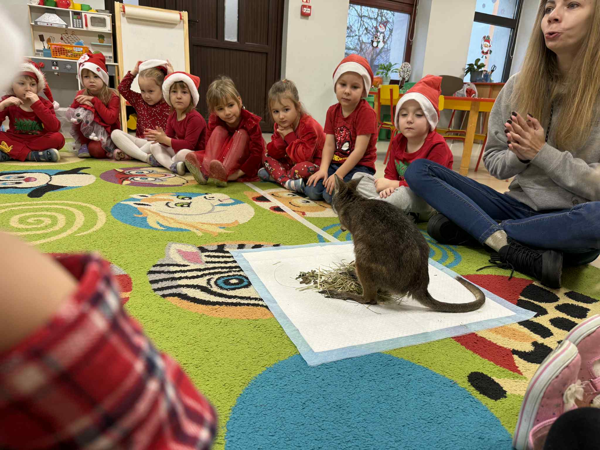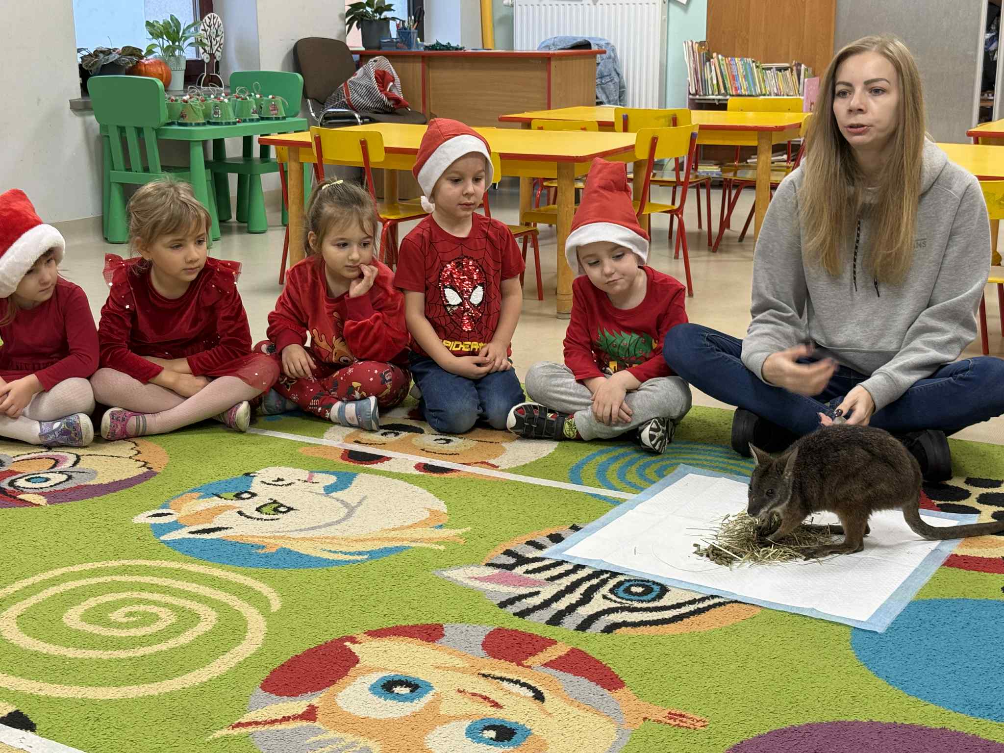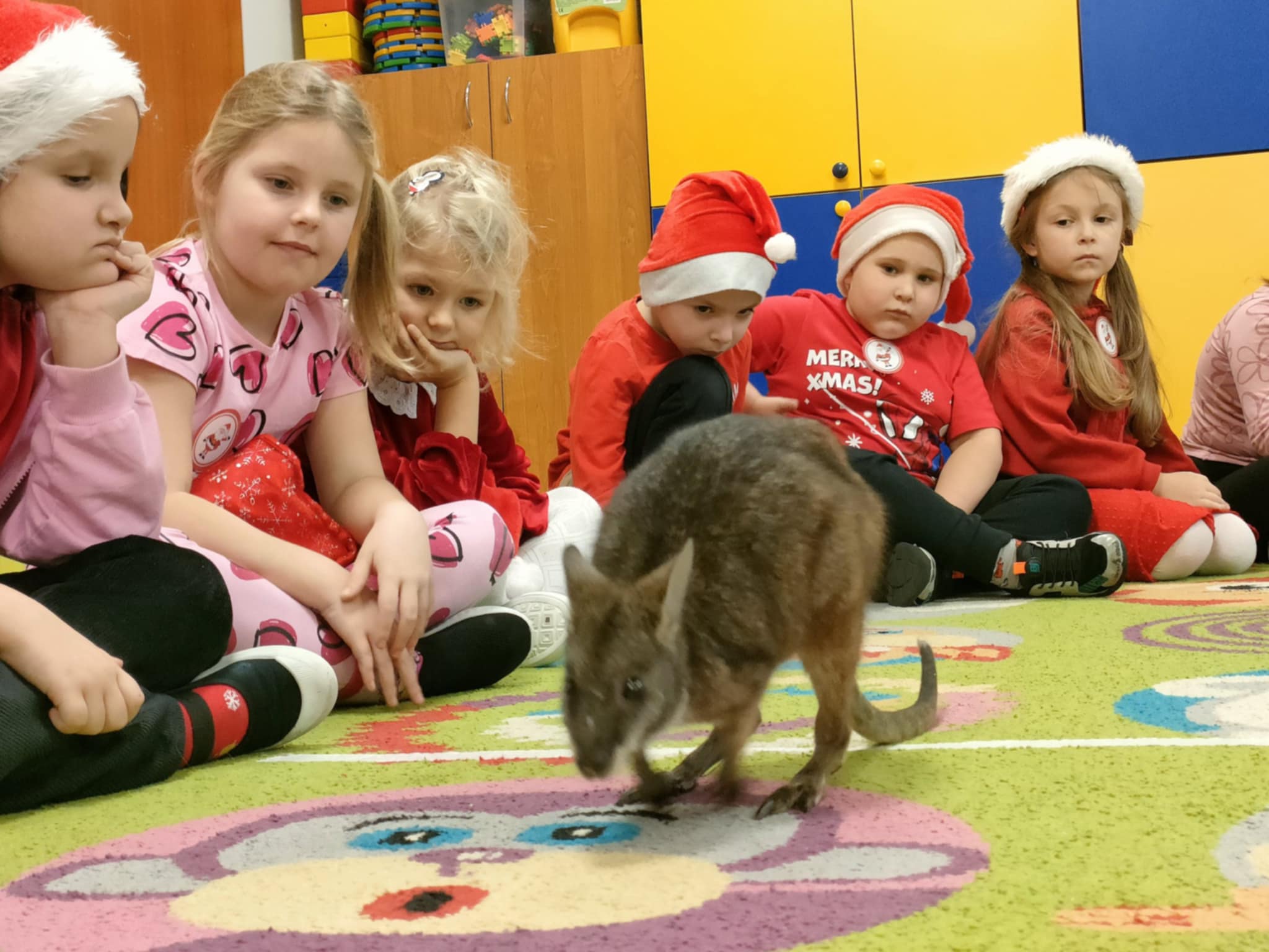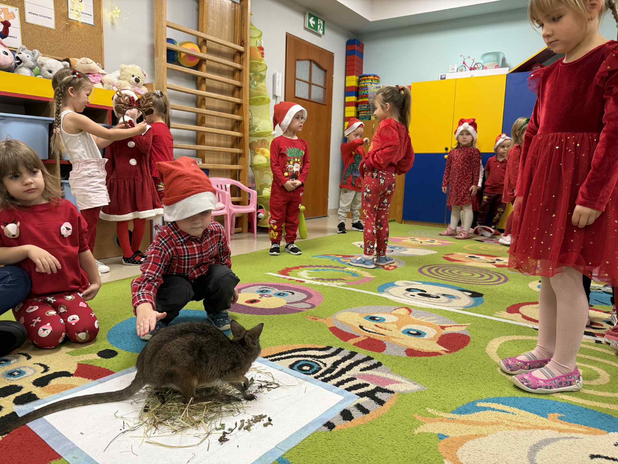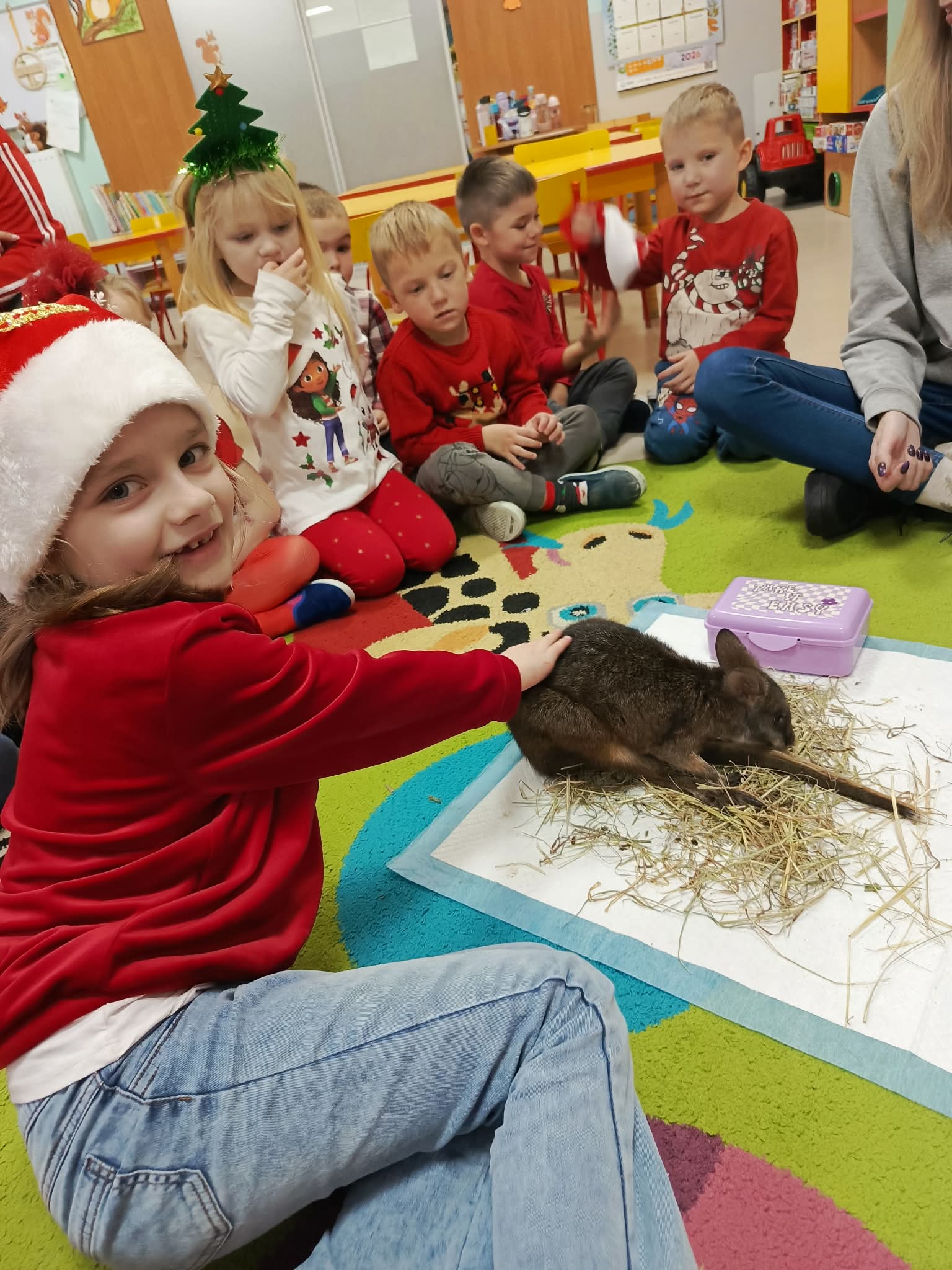 Dziś nasze przedszkole zamieniło się w prawdziwą, mikołajkową krainę. Przedszkolaki ubrane były na czerwono, a sale zostały specjalnie na tę okazję udekorowane. Dla dzieci przygotowano wyjątkowe spotkanie z żywym zwierzątkiem - kangurem o imieniu Łoli, a dokładniej pademelonem tasmańskim. Zajęcia prowadziła p. Ola z firmy "Odlotowe pokazy", która przekazała dzieciom ogromną garść wiedzy na temat kangurów, a po zajęciach umożliwiła dzieciom pogłaskanie go. Dzieci podczas spotkania z żywym zwierzątkiem, uważnie wysłuchały ciekawostek i wykazały się właściwym zachowaniem podczas bezpośredniego kontaktu ze zwierzakiem. Doskonale wiedziały, że w trakcie takich zajęć należy zachować ciszę i wykazać się empatią. Jednak to nie koniec niespodzianek! W międzyczasie, wszystkie grupy odwiedziła p. Dyrektor wraz z p. Intendent, które wręczyły dzieciom świąteczne kolorowanki i kalendarze adwentowe, a każdej grupie podarowały klocki magnetyczne. Dodatkowo przedszkolaki w tym dniu miały zaplanowane ciekawe zabawy mikołajkowe, w których bardzo chętnie brały udział. Ten dzień był pełen niezapomnianych wrażeń i przybliżył nam magię nadchodzących świąt. Dziękujemy Rodzicom za odpowiednie przygotowanie dzieci, a p. Oli dziękujemy za wartościowe spotkanie!
