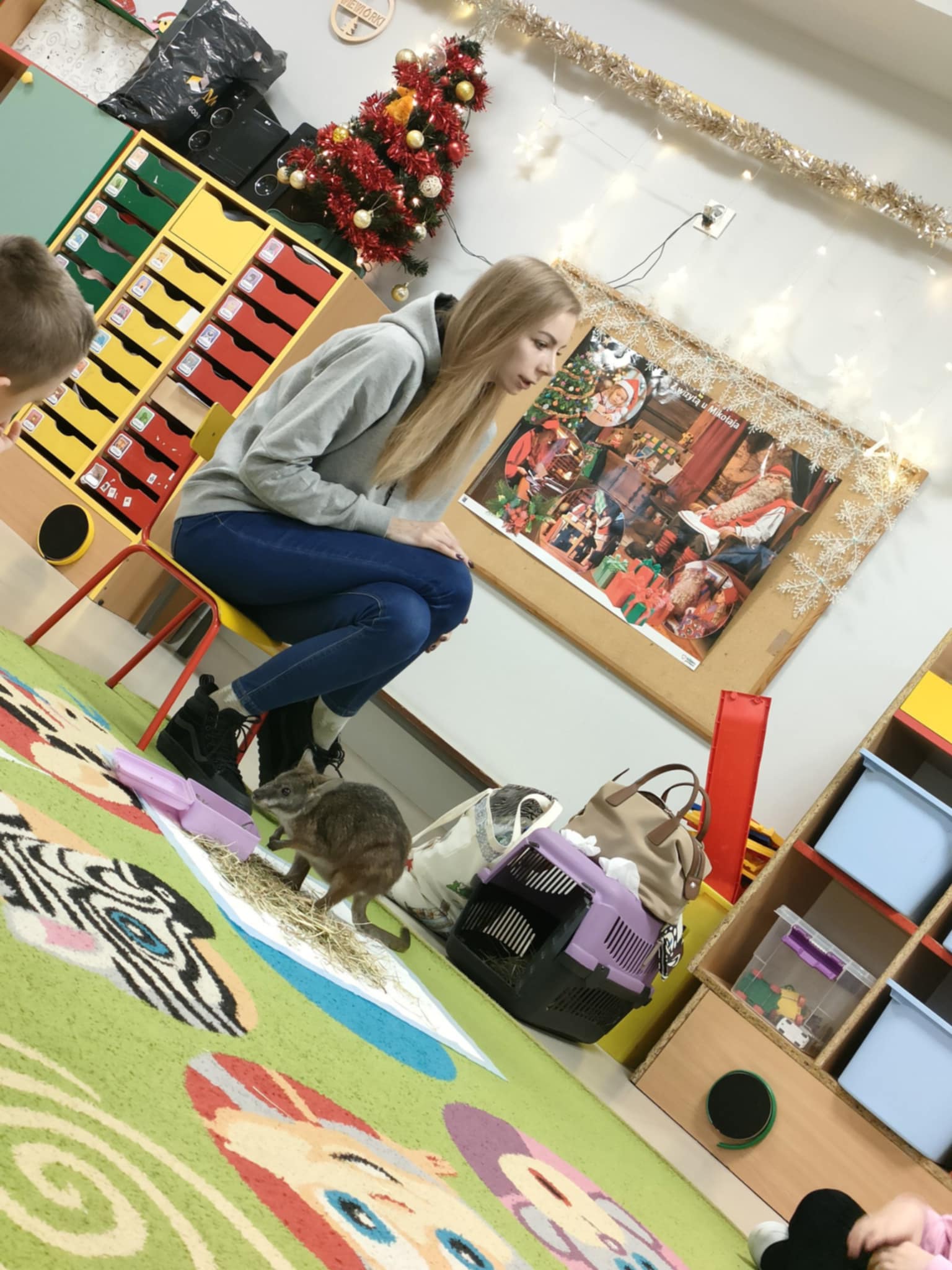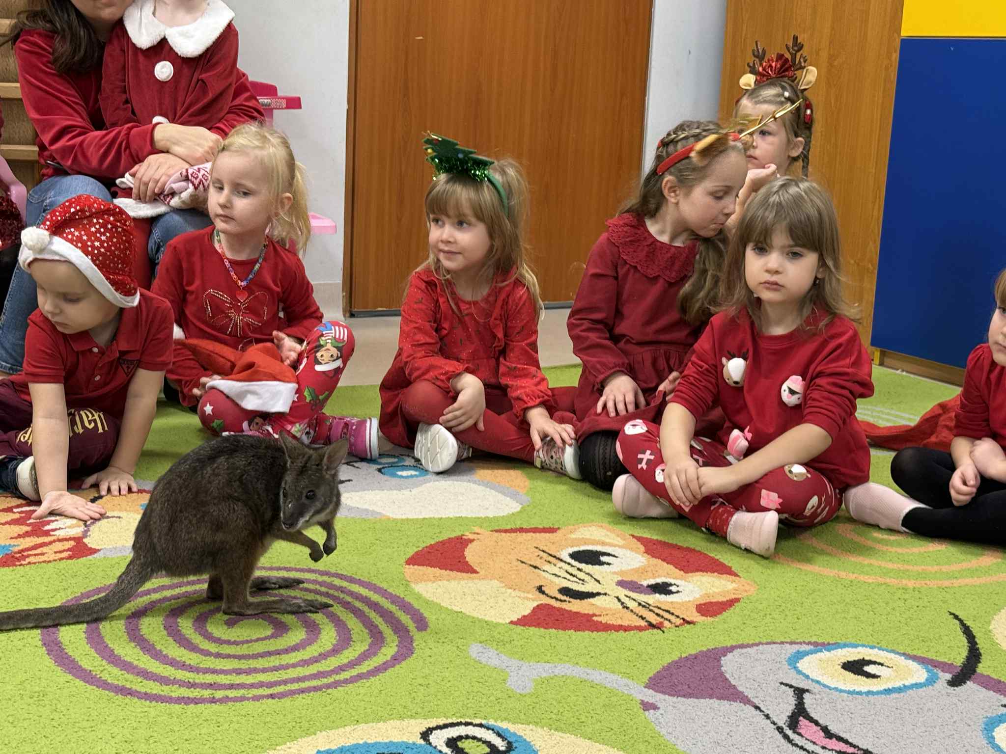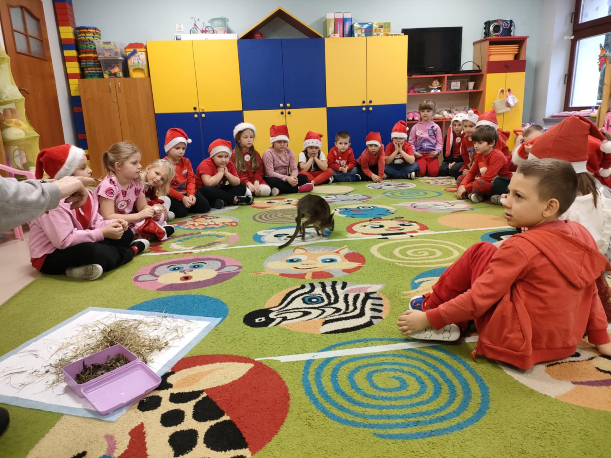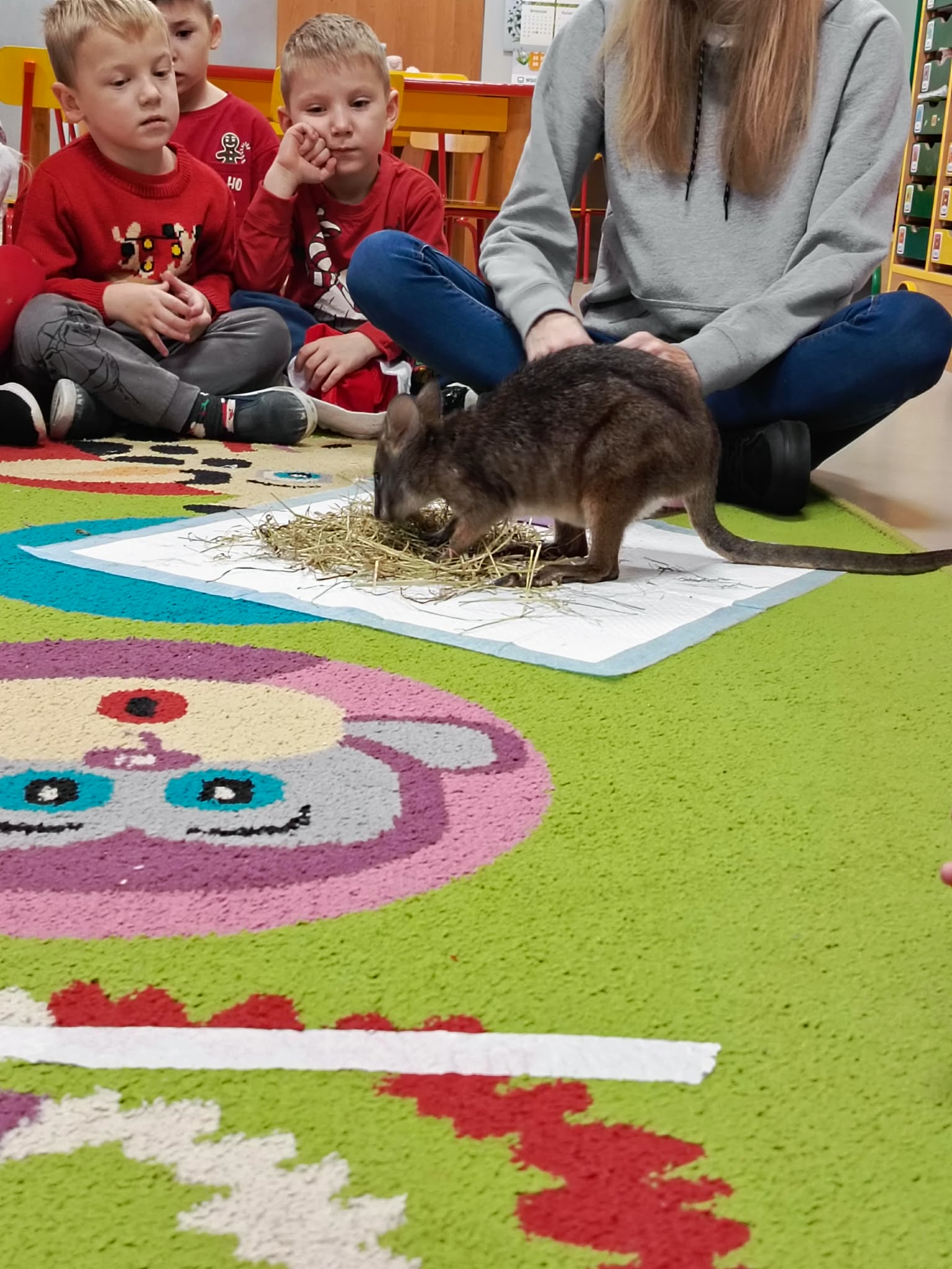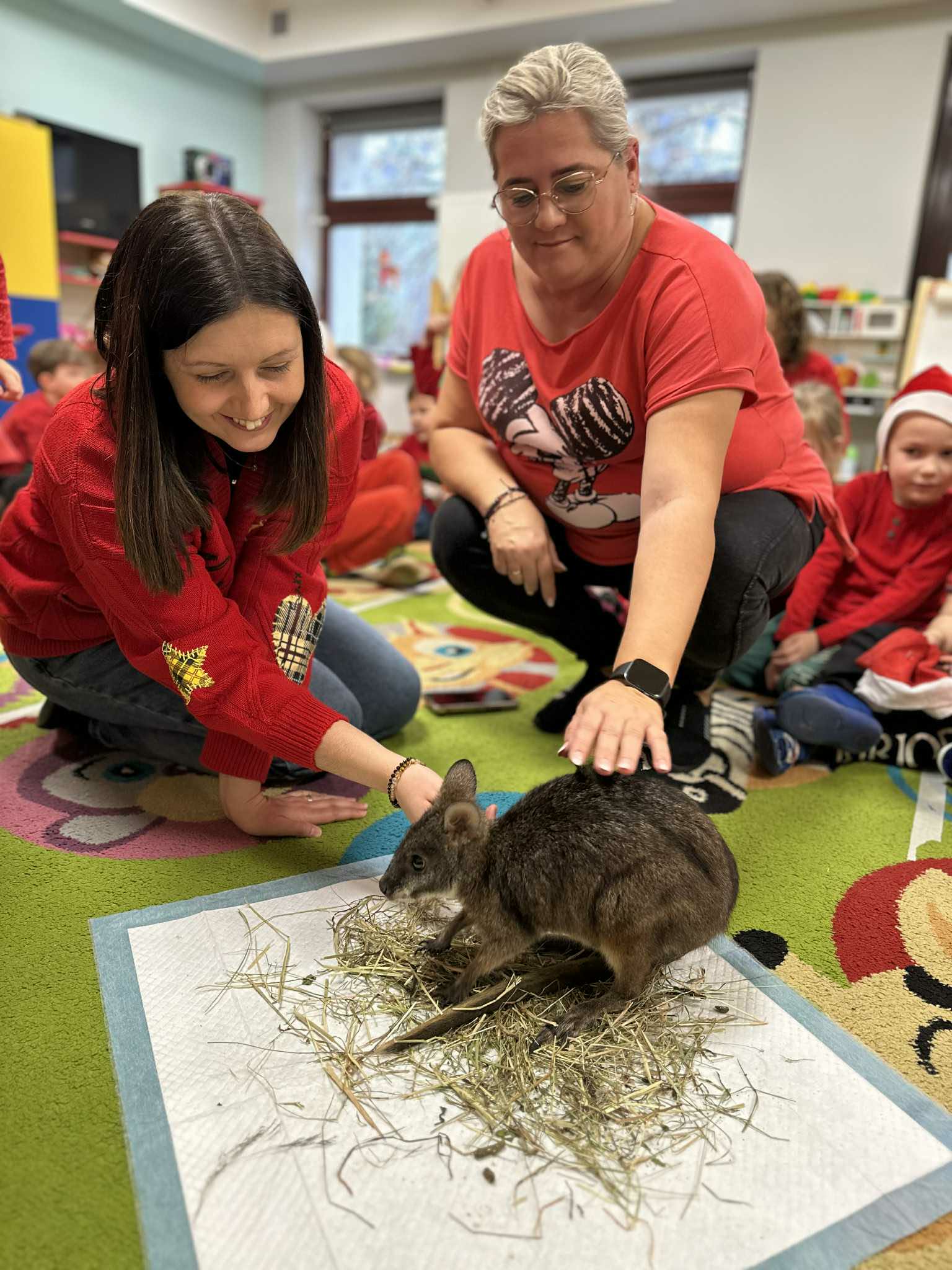 Dziś nasze przedszkole zamieniło się w prawdziwą, mikołajkową krainę. Przedszkolaki ubrane były na czerwono, a sale zostały specjalnie na tę okazję udekorowane. Dla dzieci przygotowano wyjątkowe spotkanie z żywym zwierzątkiem - kangurem o imieniu Łoli, a dokładniej pademelonem tasmańskim. Zajęcia prowadziła p. Ola z firmy "Odlotowe pokazy", która przekazała dzieciom ogromną garść wiedzy na temat kangurów, a po zajęciach umożliwiła dzieciom pogłaskanie go. Dzieci podczas spotkania z żywym zwierzątkiem, uważnie wysłuchały ciekawostek i wykazały się właściwym zachowaniem podczas bezpośredniego kontaktu ze zwierzakiem. Doskonale wiedziały, że w trakcie takich zajęć należy zachować ciszę i wykazać się empatią. Jednak to nie koniec niespodzianek! W międzyczasie, wszystkie grupy odwiedziła p. Dyrektor wraz z p. Intendent, które wręczyły dzieciom świąteczne kolorowanki i kalendarze adwentowe, a każdej grupie podarowały klocki magnetyczne. Dodatkowo przedszkolaki w tym dniu miały zaplanowane ciekawe zabawy mikołajkowe, w których bardzo chętnie brały udział. Ten dzień był pełen niezapomnianych wrażeń i przybliżył nam magię nadchodzących świąt. Dziękujemy Rodzicom za odpowiednie przygotowanie dzieci, a p. Oli dziękujemy za wartościowe spotkanie!