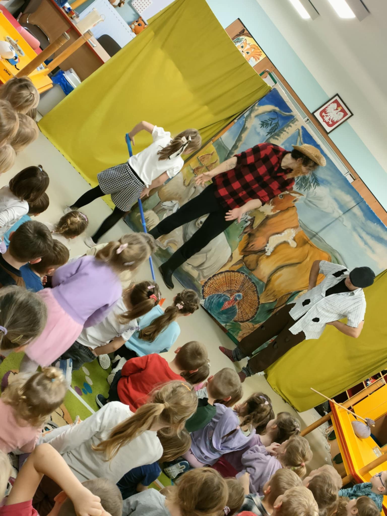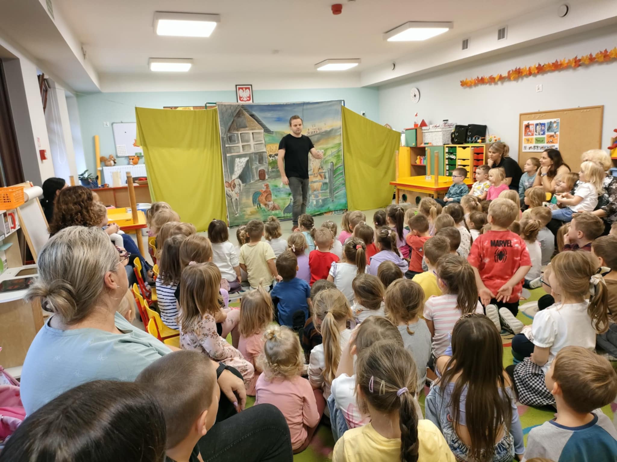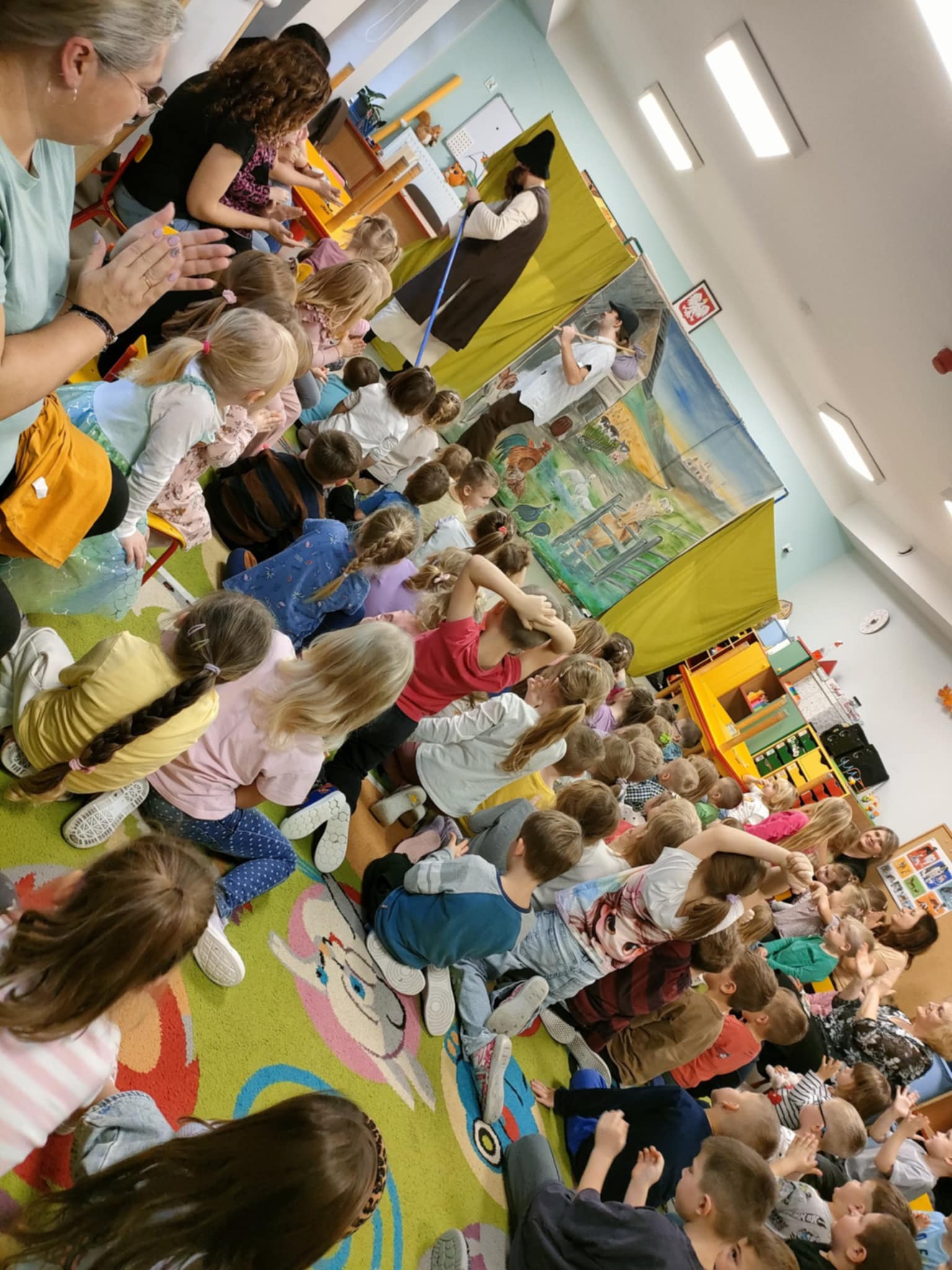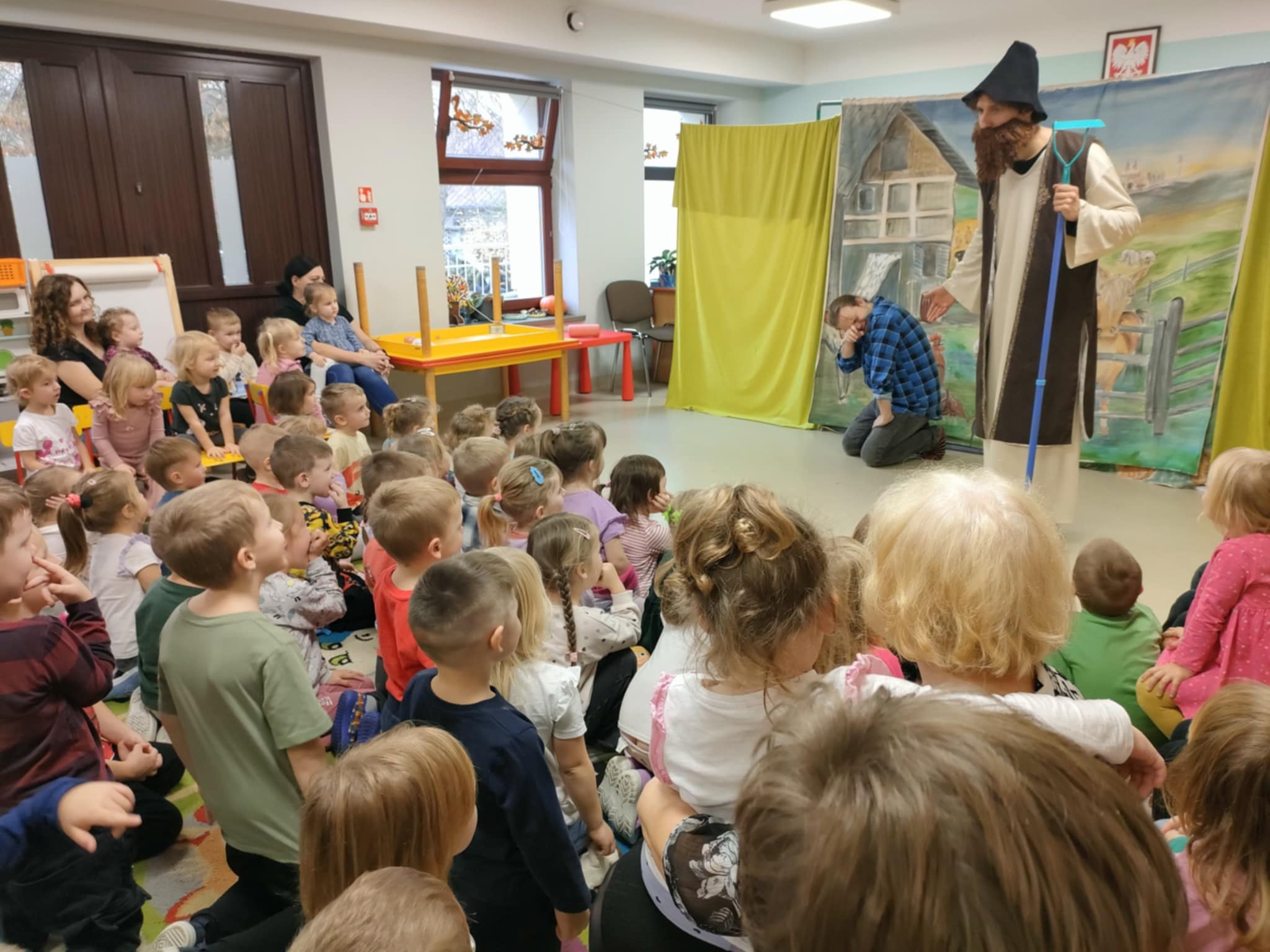 To była pełna emocji opowieść o Tomaszu, który pewnego dnia postanowił porzucić swoje, dotychczasowe życie i wyruszyć w pełną przygód, ale i niebezpieczną podróż do miasta, by odkryć prawdziwy skarb, a tym prawdziwym skarbem, jak się na koniec okazało było to, co nasz bohater Tomasz miał na farmie, czyli jego rodzina. Jednak główny bohater musiał opuścić rodzinny dom, by dowiedzieć się, co jest w życiu najważniejsze. To przedstawienie nauczyło nas posłuszeństwa wobec rodziców, i w atrakcyjny sposób wyjasniło, że nie szata zdobi człowieka, a dzieci zrozumiały, kim jest prawdziwy przyjaciel. Historia ta z pewnością na długo pozostanie w naszej pamięci. Przed dziećmi występowali: ojciec, synowie Tomasz i Szymon, kupiec, farmer Robert, a przepięknym dodatkiem była sceneria ze zwierzętami z gospodarstwa. Nie zabrakło aktywnego udziału przedszkolaków, wspólnych zabaw ruchowych oraz dużej ilości śmiechu, co przyczyniło się do tego, że z zapartym tchem oglądaliśmy to niezwykłe widowisko.