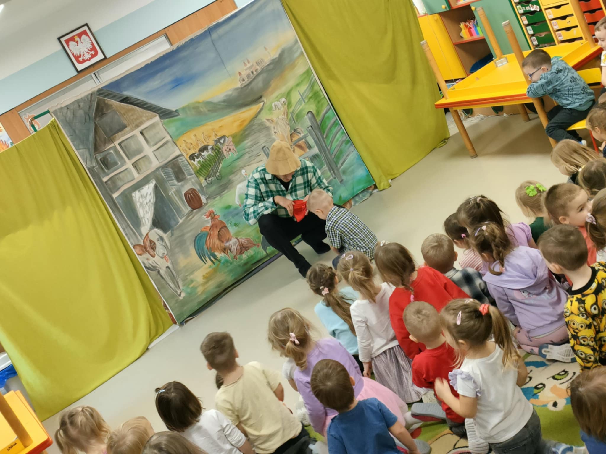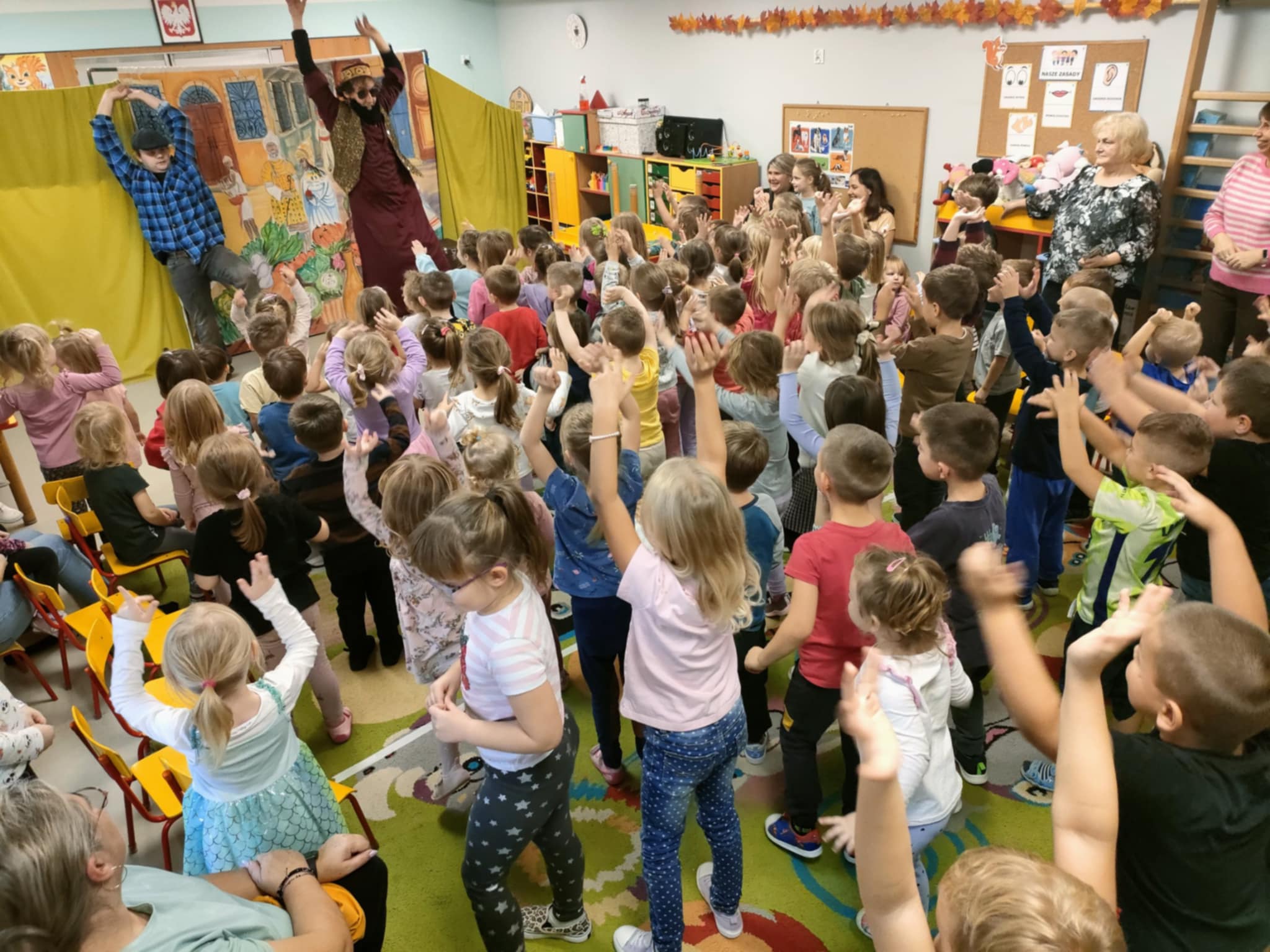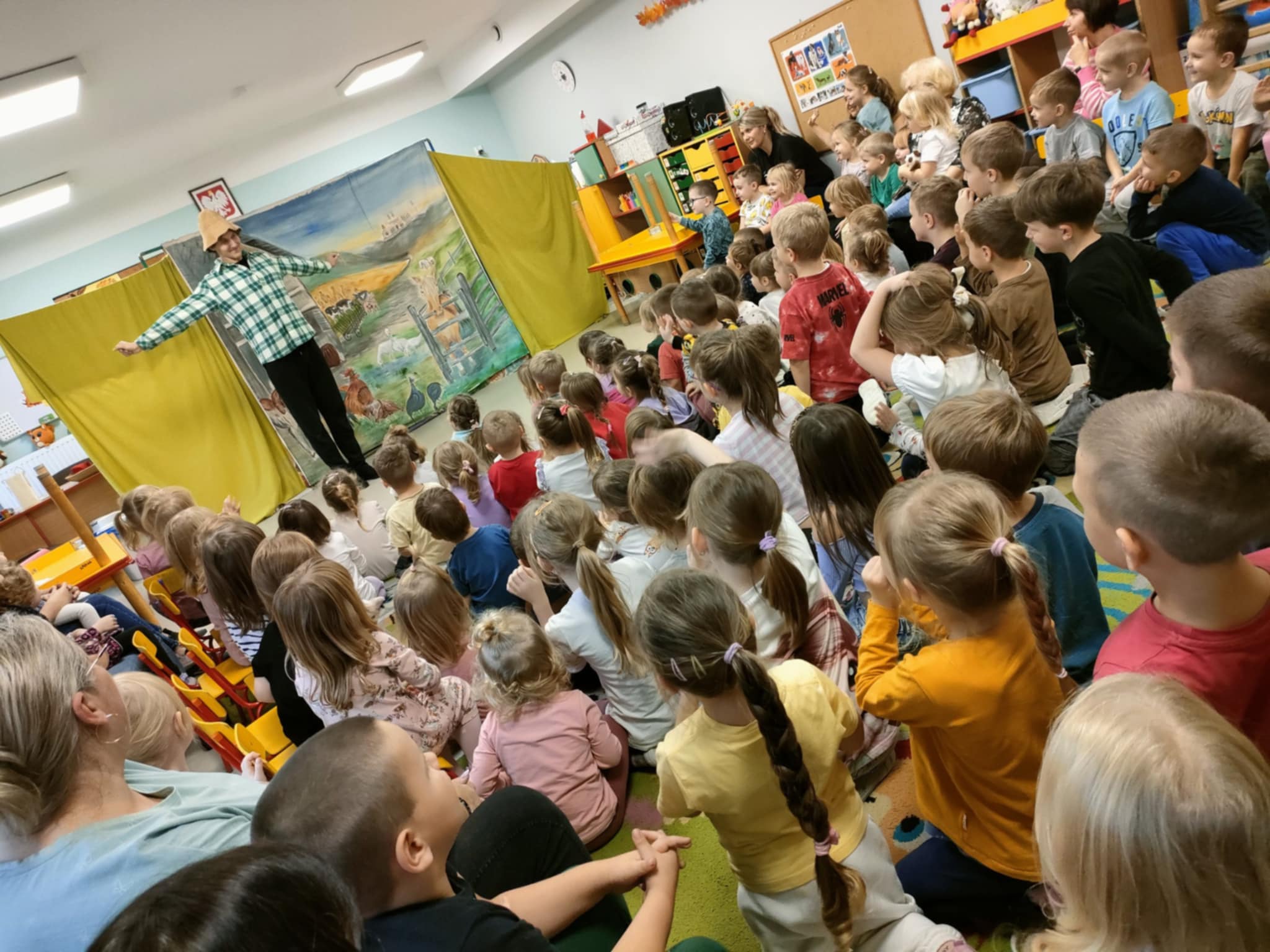 To była pełna emocji opowieść o Tomaszu, który pewnego dnia postanowił porzucić swoje, dotychczasowe życie i wyruszyć w pełną przygód, ale i niebezpieczną podróż do miasta, by odkryć prawdziwy skarb, a tym prawdziwym skarbem, jak się na koniec okazało było to, co nasz bohater Tomasz miał na farmie, czyli jego rodzina. Jednak główny bohater musiał opuścić rodzinny dom, by dowiedzieć się, co jest w życiu najważniejsze. To przedstawienie nauczyło nas posłuszeństwa wobec rodziców, i w atrakcyjny sposób wyjasniło, że nie szata zdobi człowieka, a dzieci zrozumiały, kim jest prawdziwy przyjaciel. Historia ta z pewnością na długo pozostanie w naszej pamięci. Przed dziećmi występowali: ojciec, synowie Tomasz i Szymon, kupiec, farmer Robert, a przepięknym dodatkiem była sceneria ze zwierzętami z gospodarstwa. Nie zabrakło aktywnego udziału przedszkolaków, wspólnych zabaw ruchowych oraz dużej ilości śmiechu, co przyczyniło się do tego, że z zapartym tchem oglądaliśmy to niezwykłe widowisko.