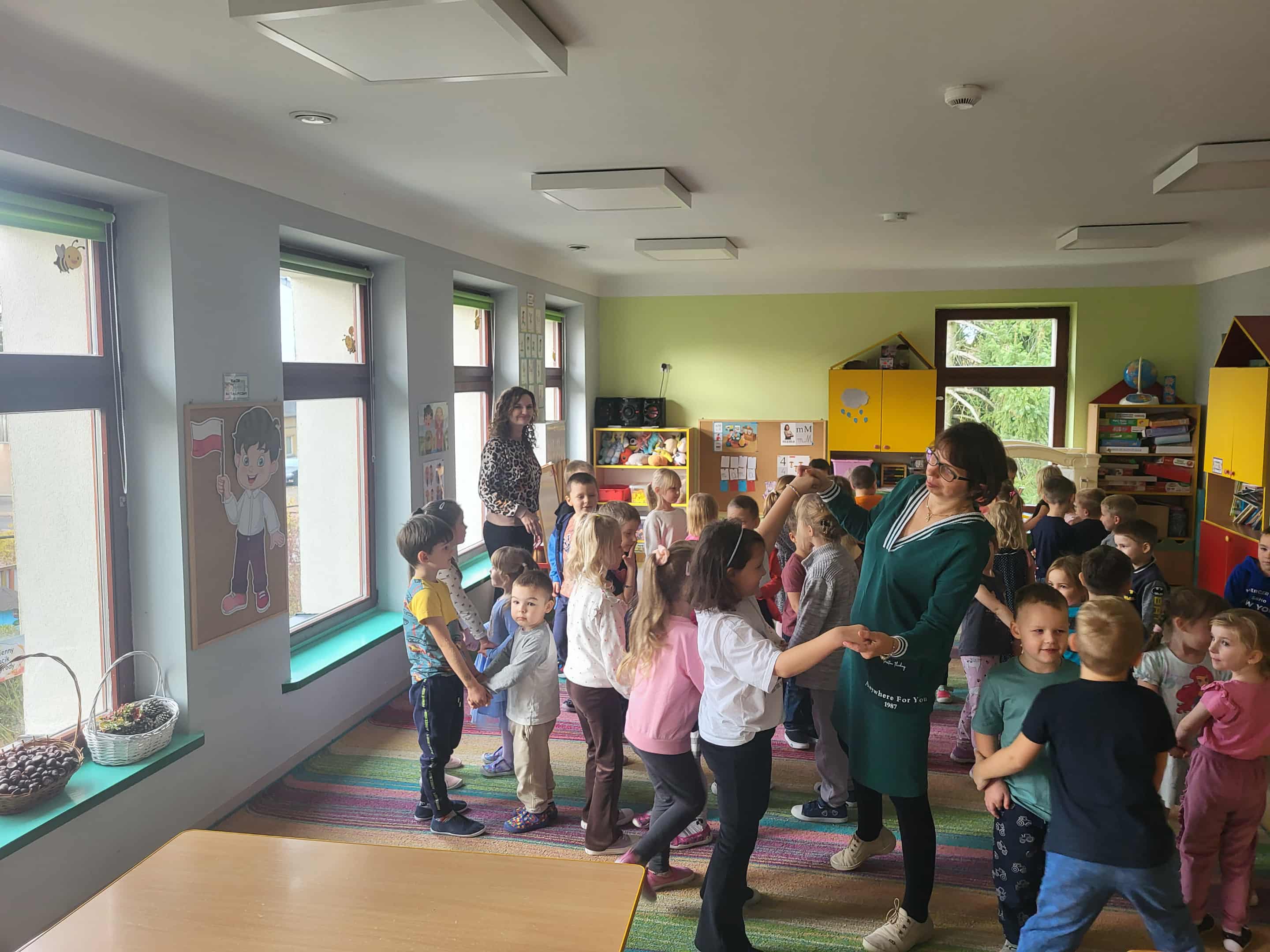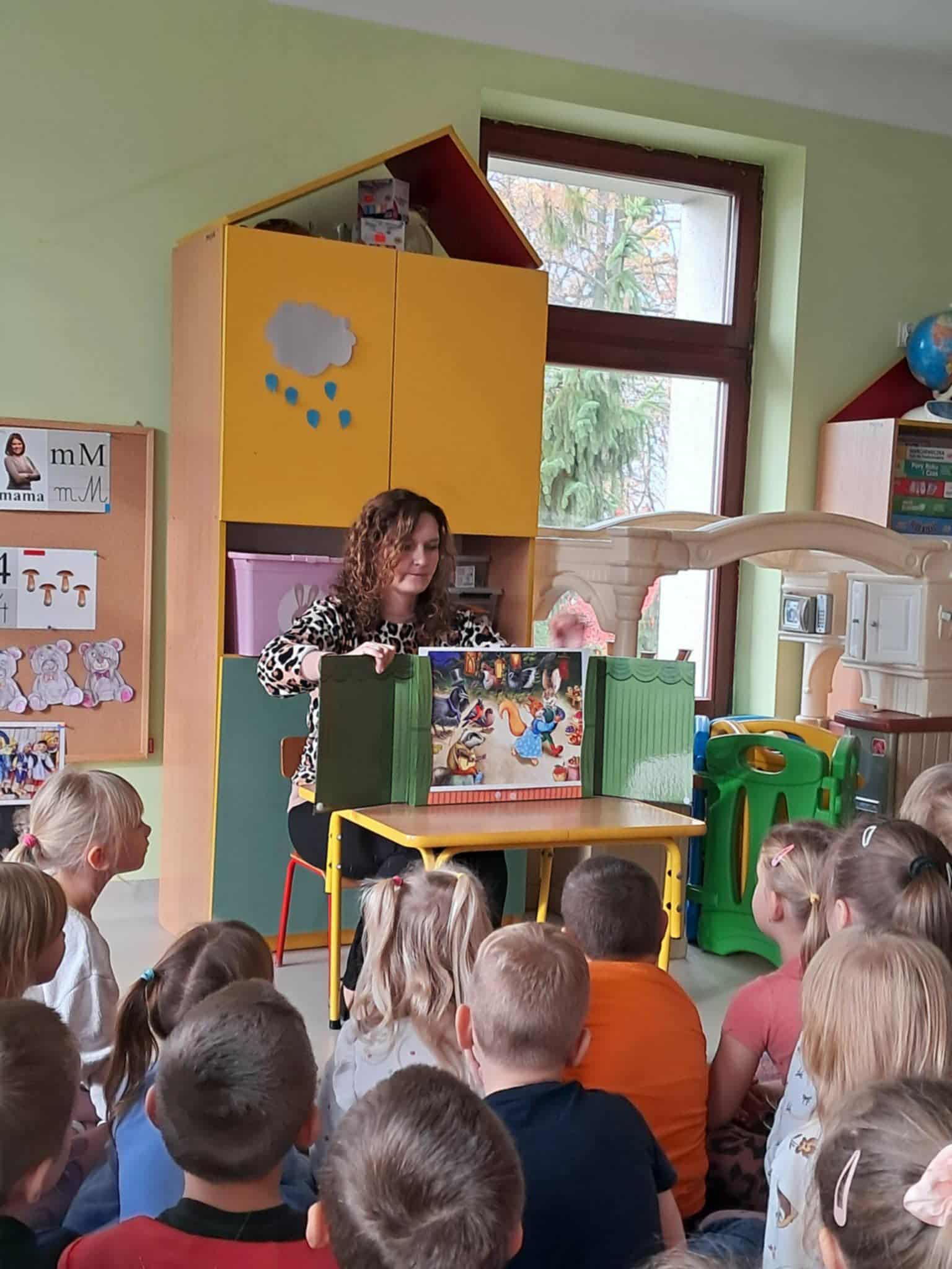 Na początku przedszkolaki w parach zatańczyły do piosenki ,,Dwóm tańczyć się zachciało”, co pozwoliło na wprowadzenie ich w radosny nastrój. Następnie dzieciom zostały przypomniane zasady zachowania się w teatrze. To spotkanie dało przedszkolakom nie tylko możliwość poznania treści bajki, ale także obcowanie z literaturą w niekonwencjonalny sposób. Dzieci z zaciekawieniem wysłuchały bajki, w której kolorowe ilustracje z jesiennymi barwami wprowadziły przedszkolaki w klimat obecnej pory roku. Dzięki bajkowej narracji dzieci lepiej zapamiętały, co dzieje się w przyrodzie w trakcie jesieni.