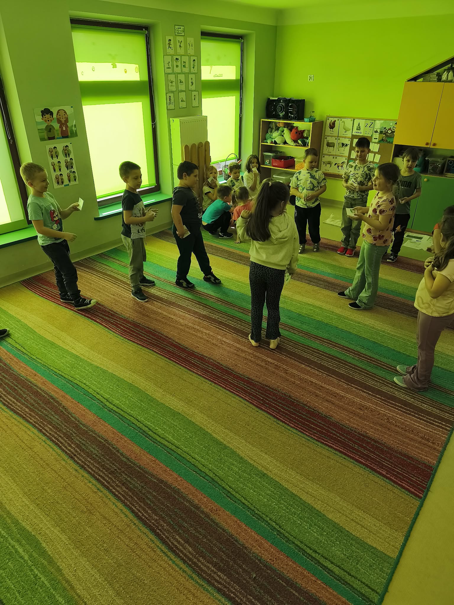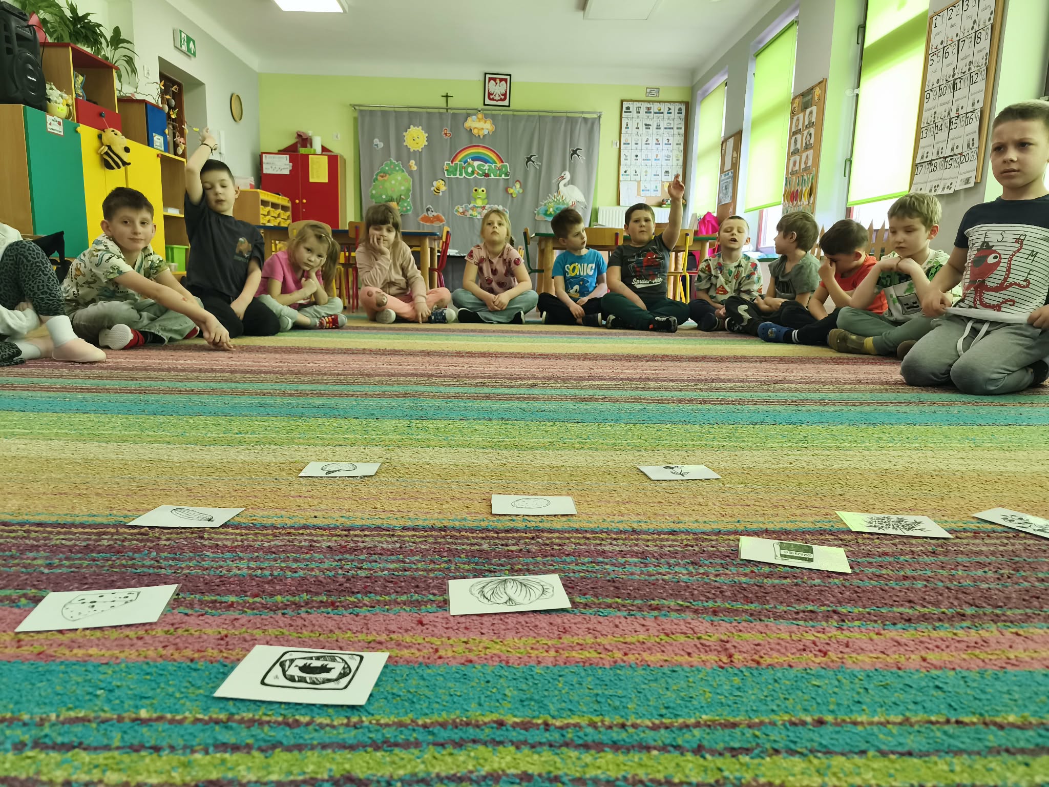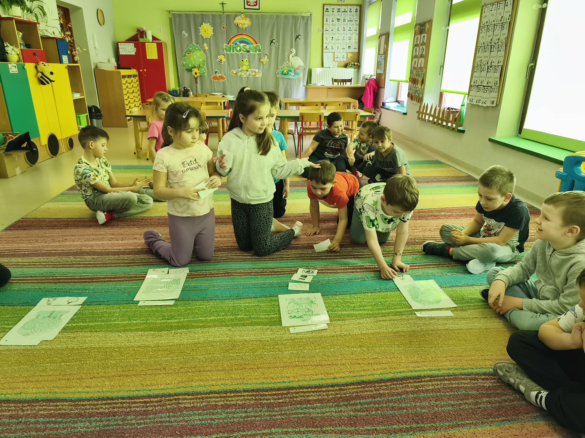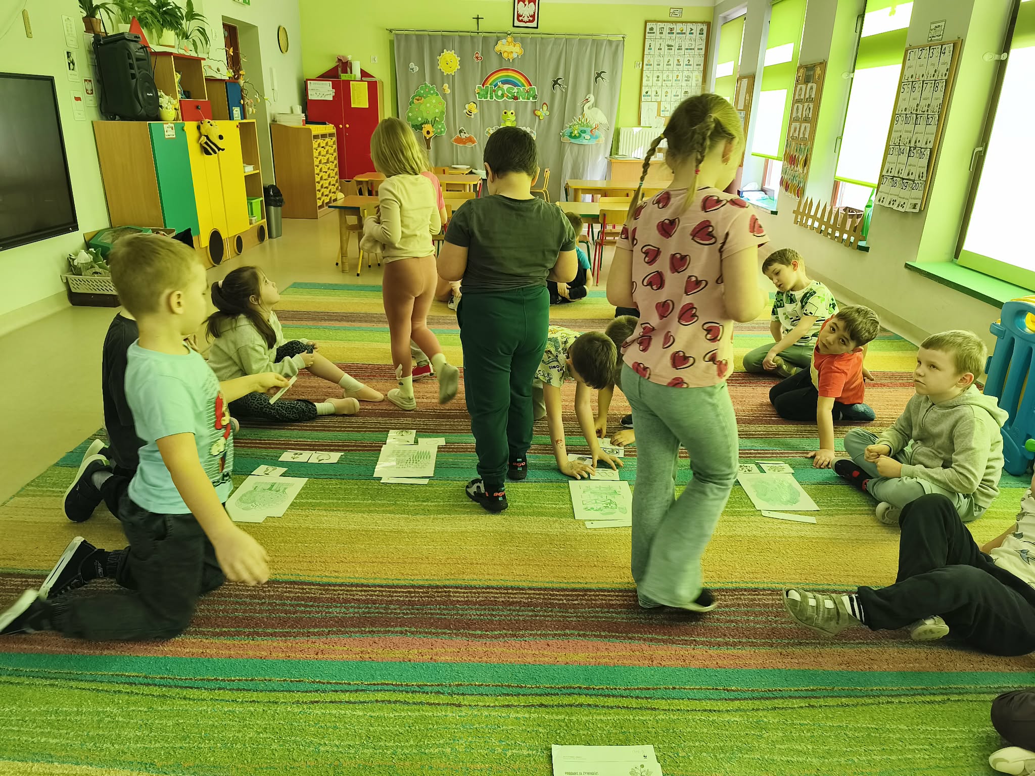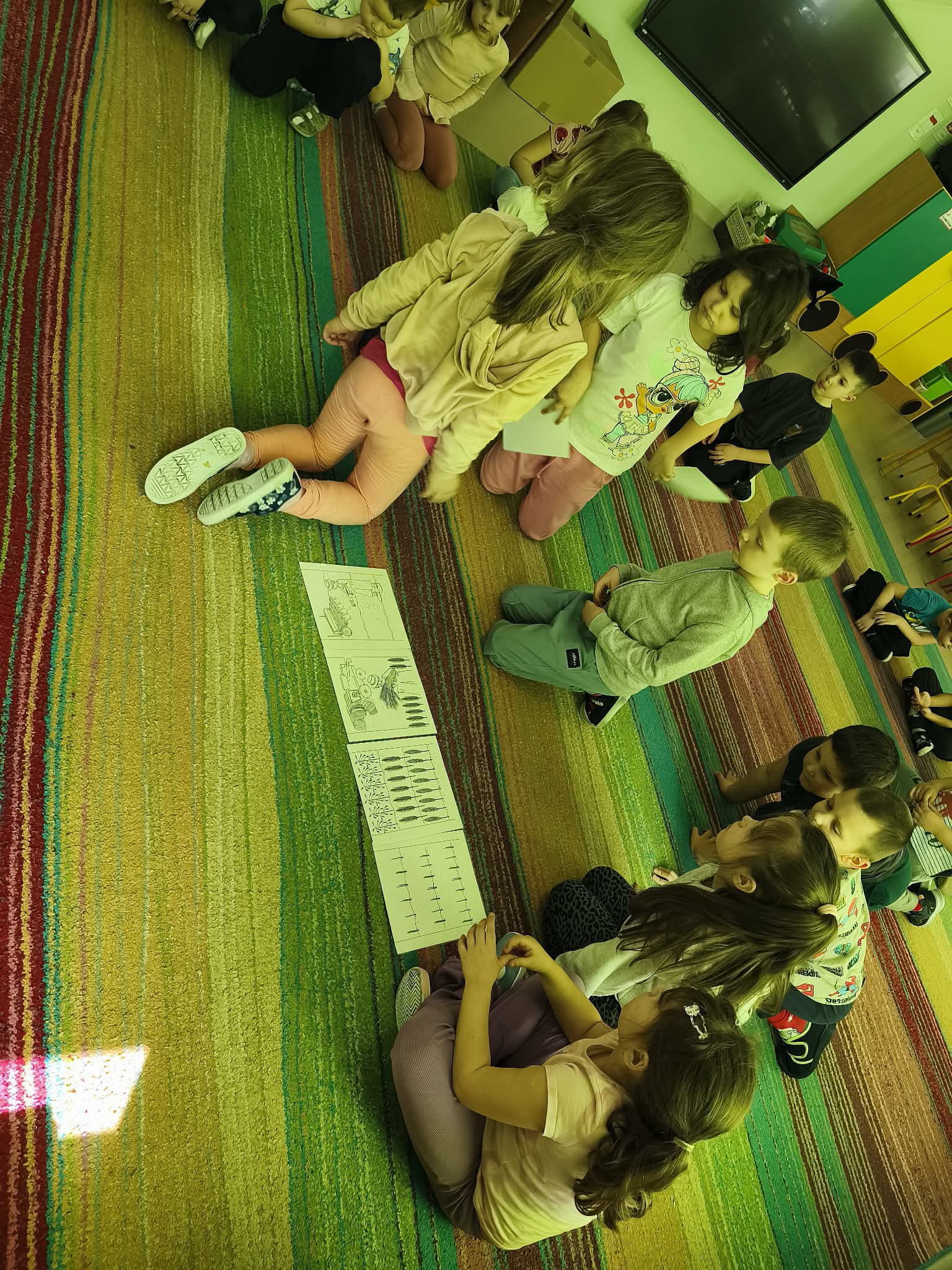 Dziś uczestniczyliśmy w pierwszych zajęciach pt. "Produkcja żywności", na początku których odpowiadaliśmy na pytanie, skąd się bierze jedzenie. Dzieci miały okazję pochwalić się swoją wiedzą w tym zakresie, a tym samym kształciły umiejętność budowania zdań. W następnym etapie nazywaliśmy źródła jedzenia w oparciu o ilustracje, a dzieci starsze dobierały właściwe podpisy. Chwilkę później losowaliśmy małe obrazki różnych produktów i przyporządkowaliśmy je do w/w źródeł, po czym chętne dzieci starsze dopasowały właściwe podpisy. Nie mogło zabraknąć zabawy ruchowej, podczas której sadziliśmy wskazane przez nauczycielkę warzywo/owoc na odpowiedniej grządce, korzystając najpierw z ilustracji, a następnie z napisów. Przy okazji, wspólnymi siłami przypomnielismy sobie, jak powstaje chleb, poprzez ułożenie historyjki obrazkowej we właściwej kolejności i wskazanie pasujących podpisów. Na zakończenie uczestniczyliśmy w zabawie relaksacyjnej przy dźwiękach natury, gdzie dzieci zamieniły się w ziarenko grochu i odgrywały ruchem to, co usłyszały.