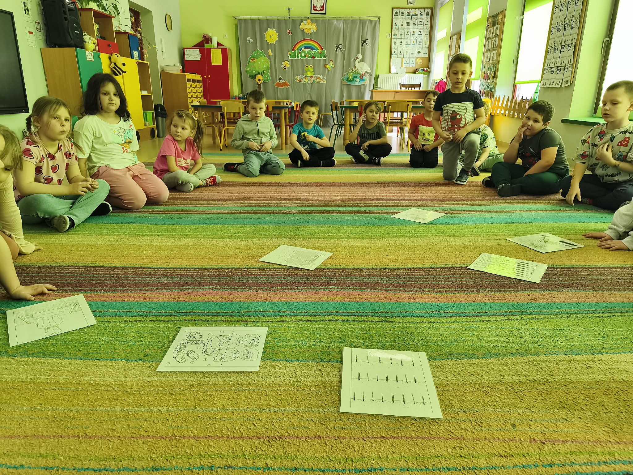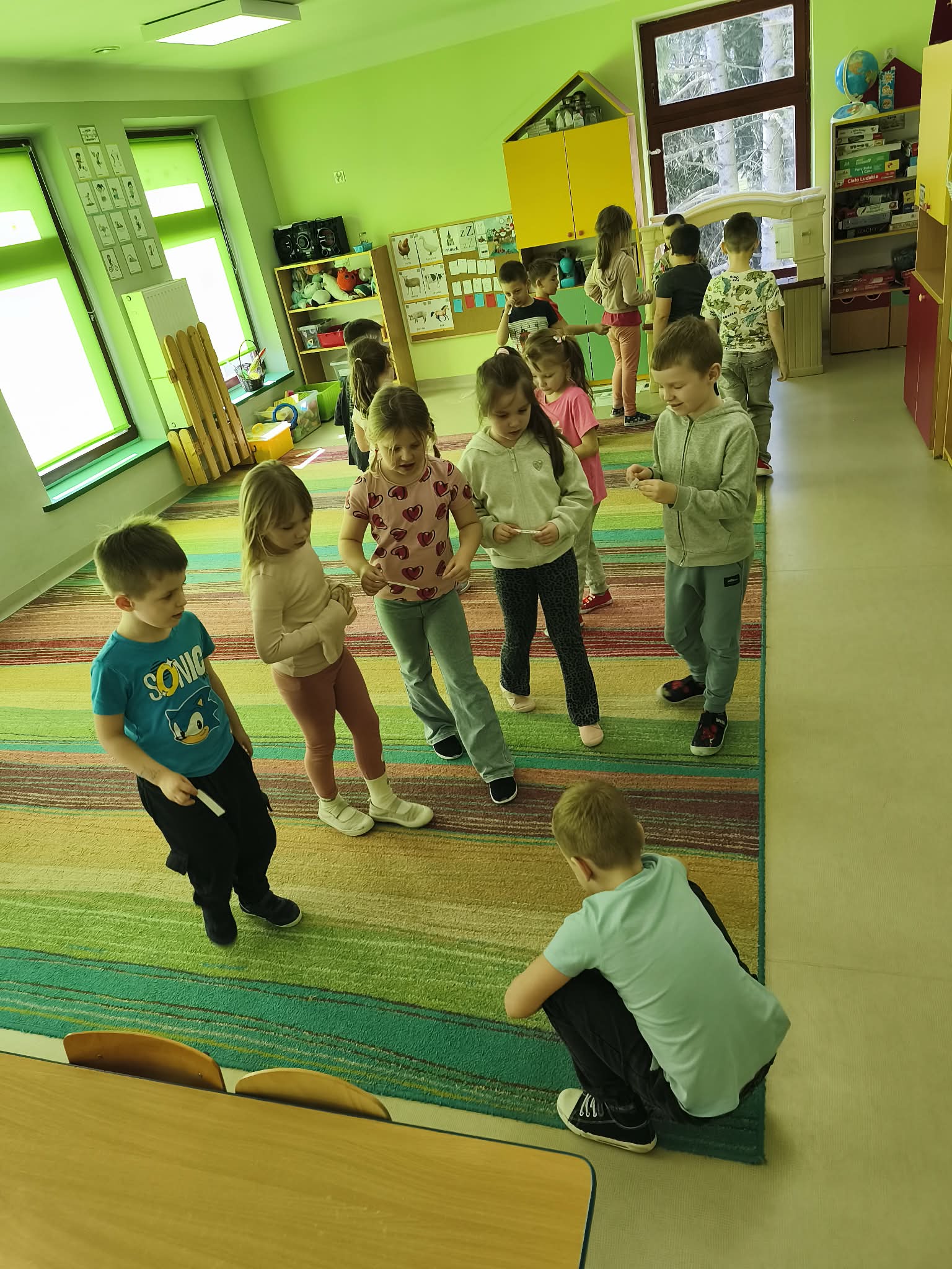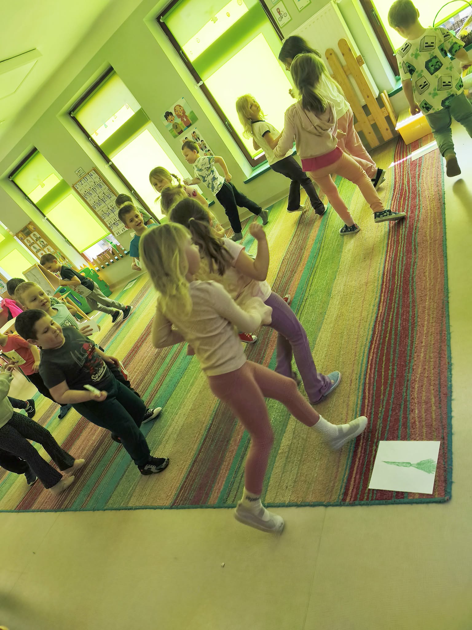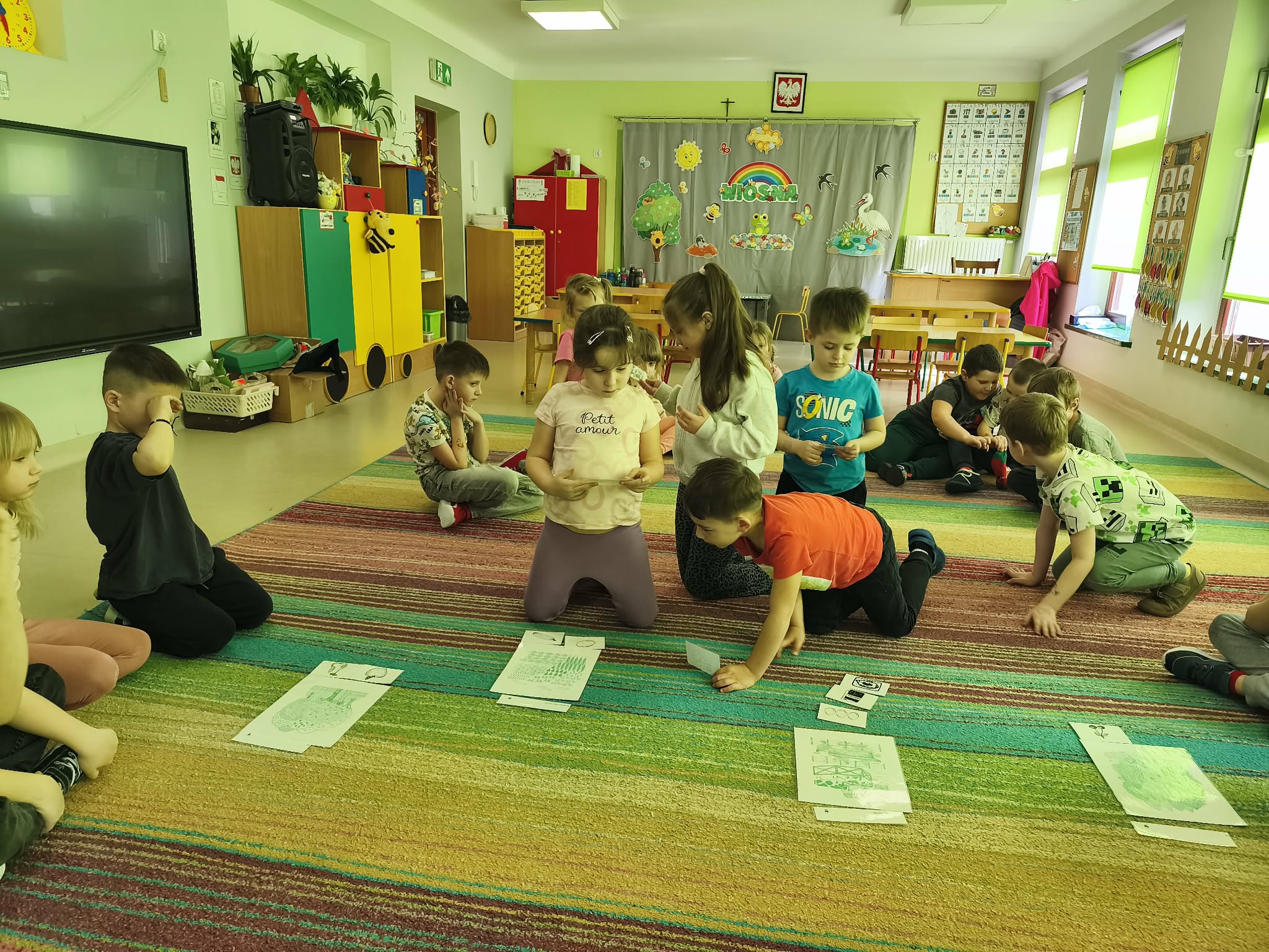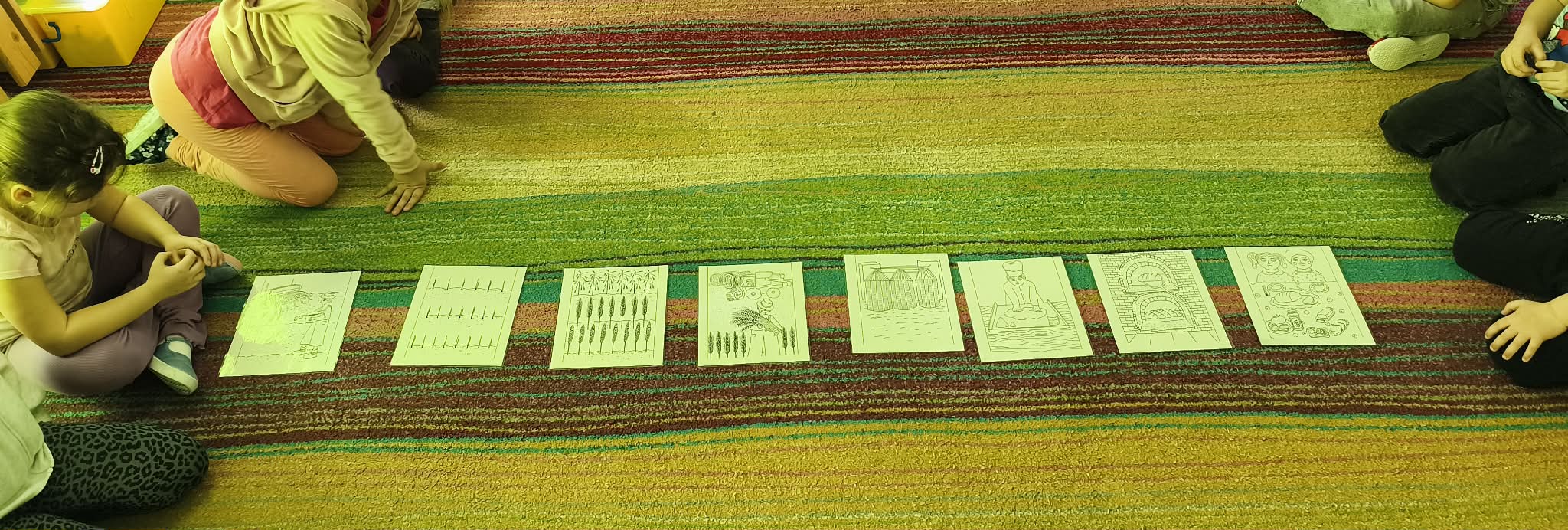 Dziś uczestniczyliśmy w pierwszych zajęciach pt. "Produkcja żywności", na początku których odpowiadaliśmy na pytanie, skąd się bierze jedzenie. Dzieci miały okazję pochwalić się swoją wiedzą w tym zakresie, a tym samym kształciły umiejętność budowania zdań. W następnym etapie nazywaliśmy źródła jedzenia w oparciu o ilustracje, a dzieci starsze dobierały właściwe podpisy. Chwilkę później losowaliśmy małe obrazki różnych produktów i przyporządkowaliśmy je do w/w źródeł, po czym chętne dzieci starsze dopasowały właściwe podpisy. Nie mogło zabraknąć zabawy ruchowej, podczas której sadziliśmy wskazane przez nauczycielkę warzywo/owoc na odpowiedniej grządce, korzystając najpierw z ilustracji, a następnie z napisów. Przy okazji, wspólnymi siłami przypomnielismy sobie, jak powstaje chleb, poprzez ułożenie historyjki obrazkowej we właściwej kolejności i wskazanie pasujących podpisów. Na zakończenie uczestniczyliśmy w zabawie relaksacyjnej przy dźwiękach natury, gdzie dzieci zamieniły się w ziarenko grochu i odgrywały ruchem to, co usłyszały.