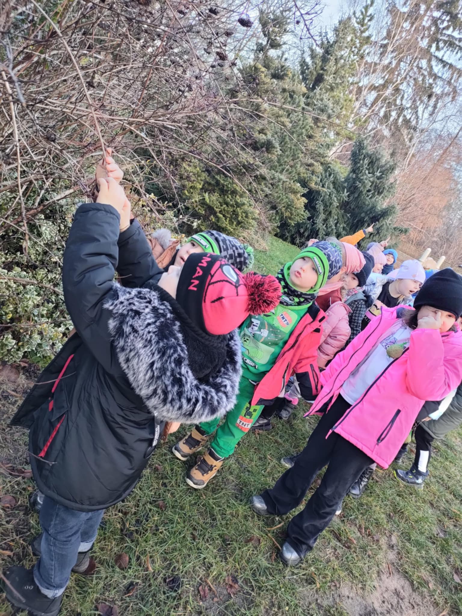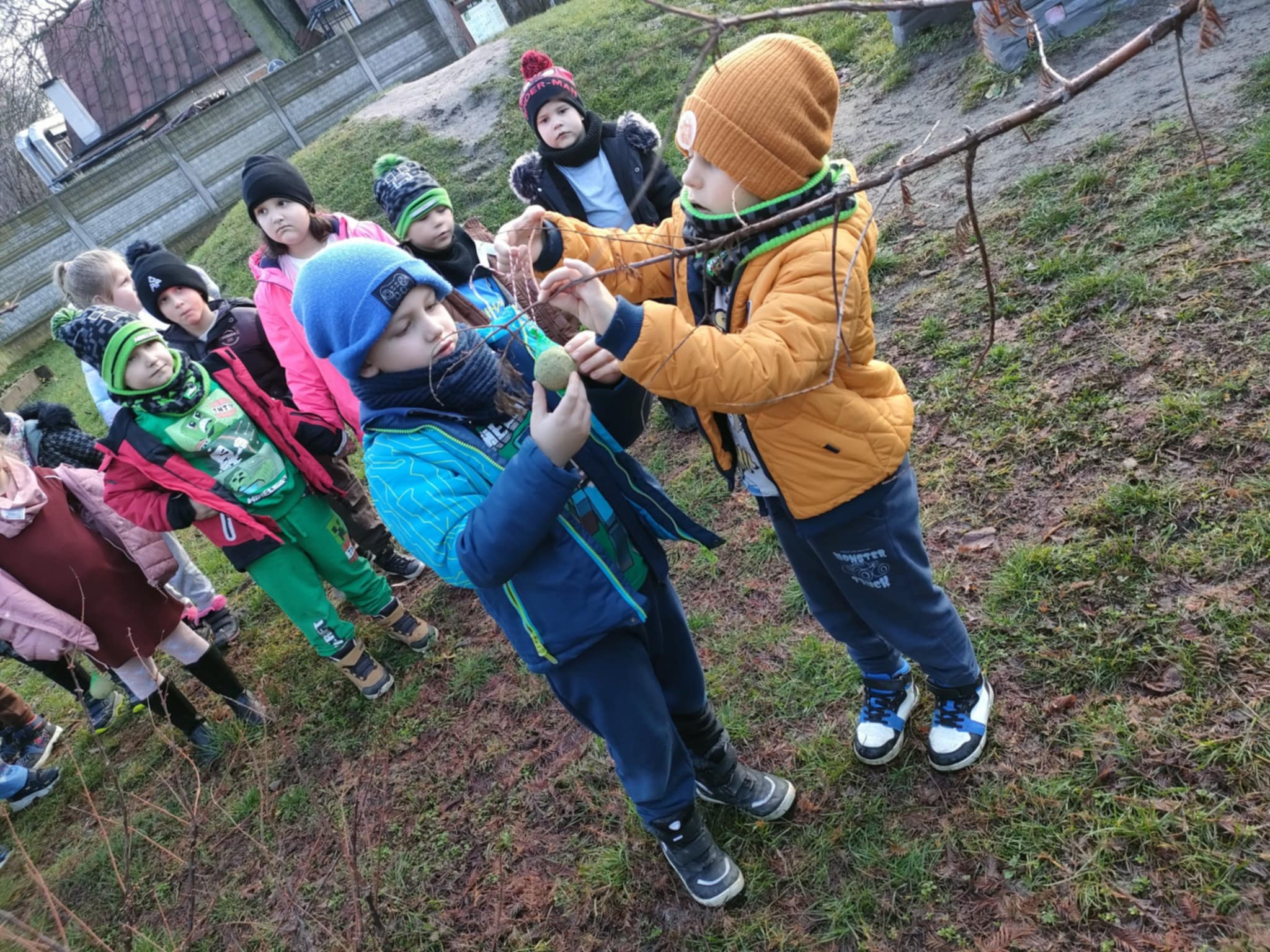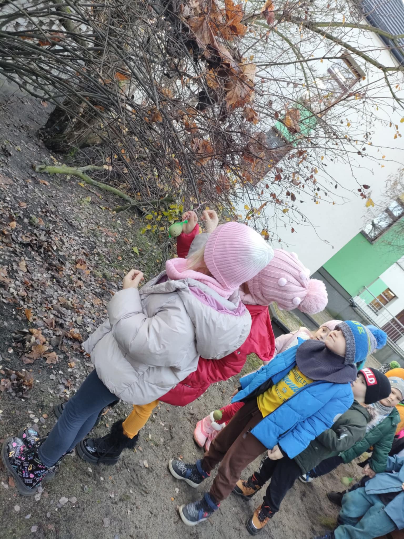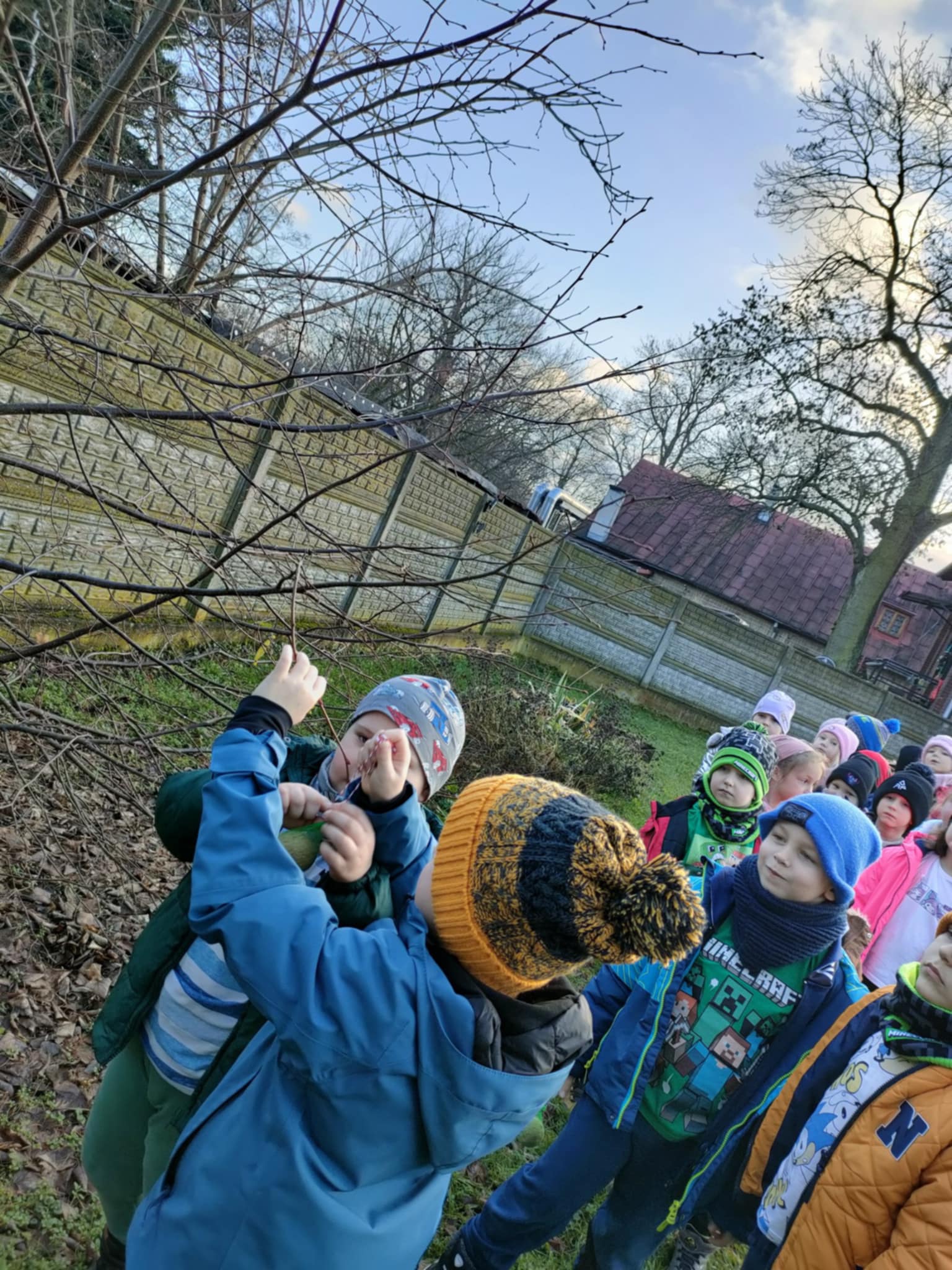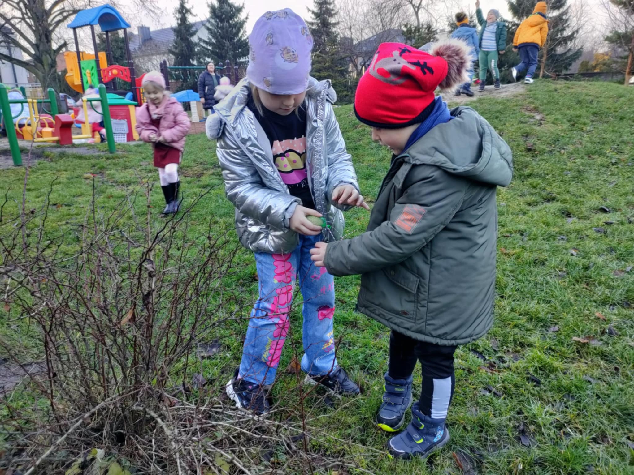W tym tygodniu rozmawialiśmy na temat tego, jak zwierzęta spędzają zimę. Dziś po obiedzie, aby utrwalić zdobytą wiedzę, oglądaliśmy film edukacyjny na ten temat na ekranie multimedialnym, po czym udaliśmy się na ogród przedszkolny w ważnym celu. Dzieci zrozumiały, że zwierzęta podczas zimy potrzebują naszego wsparcia i otrzymały zadanie specjalne, któym było urządzenie "ptasiej stołówki" na ogrodzie. Każda para otrzymała woreczek ze specjalną kulą(pokarmem dla ptaków) i współpracując ze sobą, miała przyczepić woreczek na wybranej przez siebie gałązce danego drzewa. W ten sposób dzieci uczą się pomagać zwierzętom w sposób praktyczny, a przy okazji miło spędziliśmy czas na świeżym powietrzu. Po ustawieniu "ptasiej stołówki" dzieci miały jeszcze czas, aby pobawić się na przedszkolnym placu zabaw.