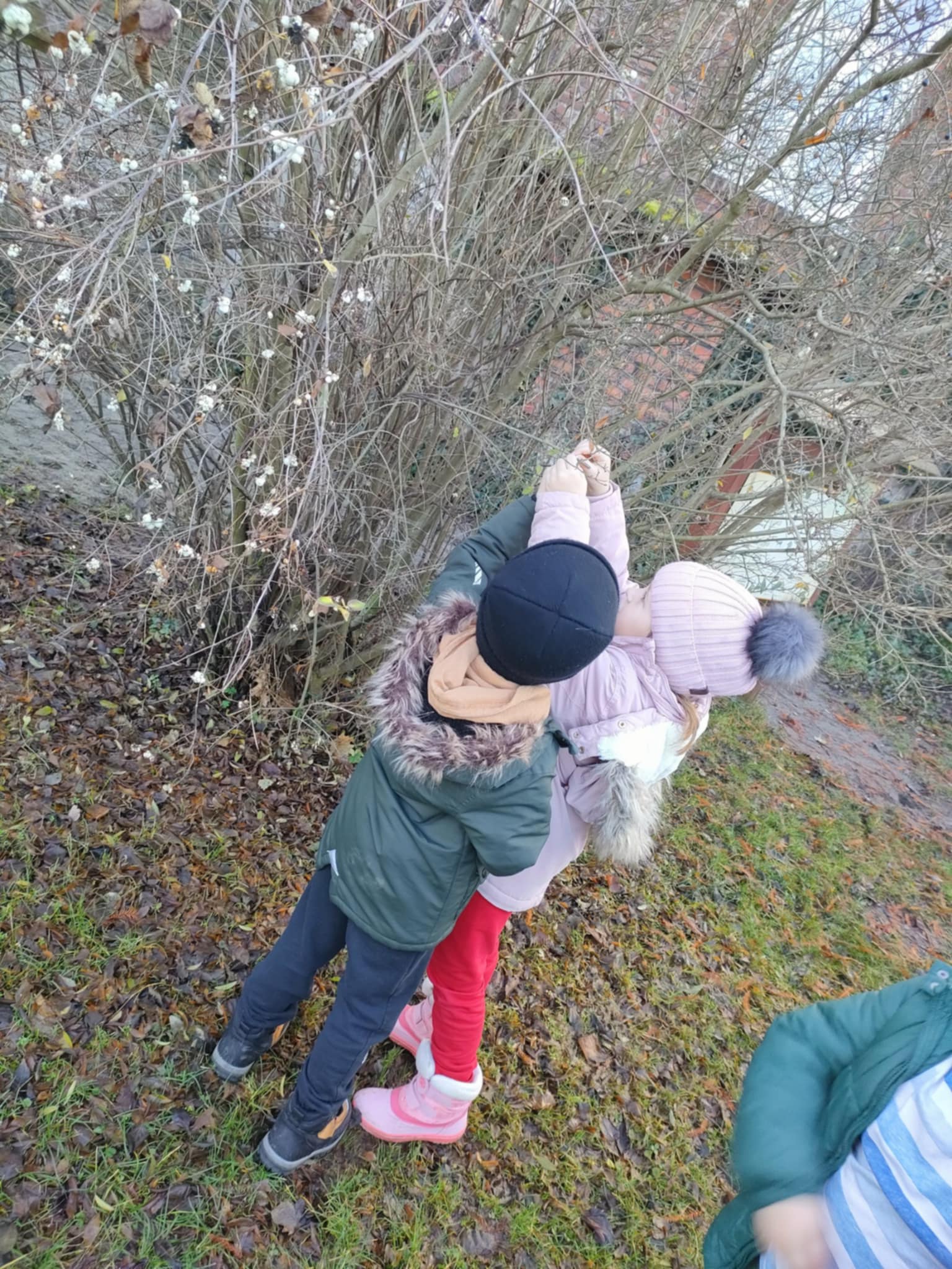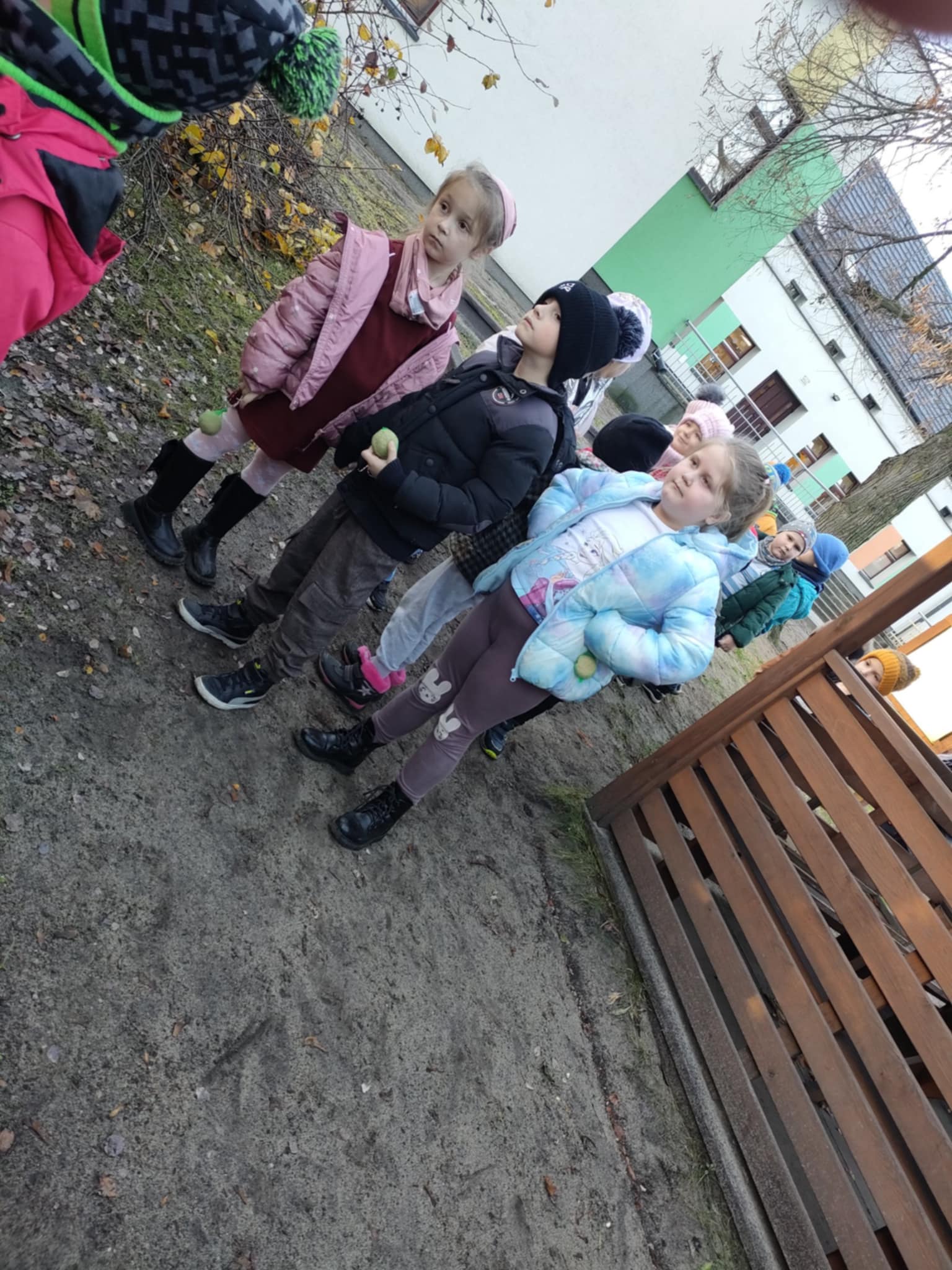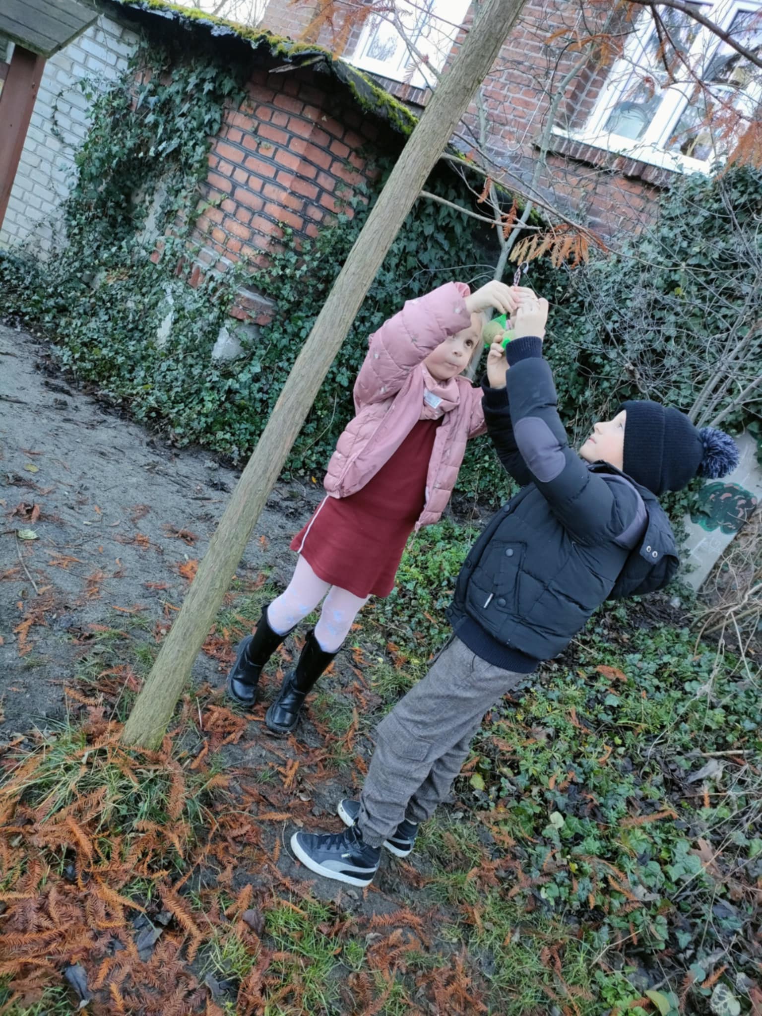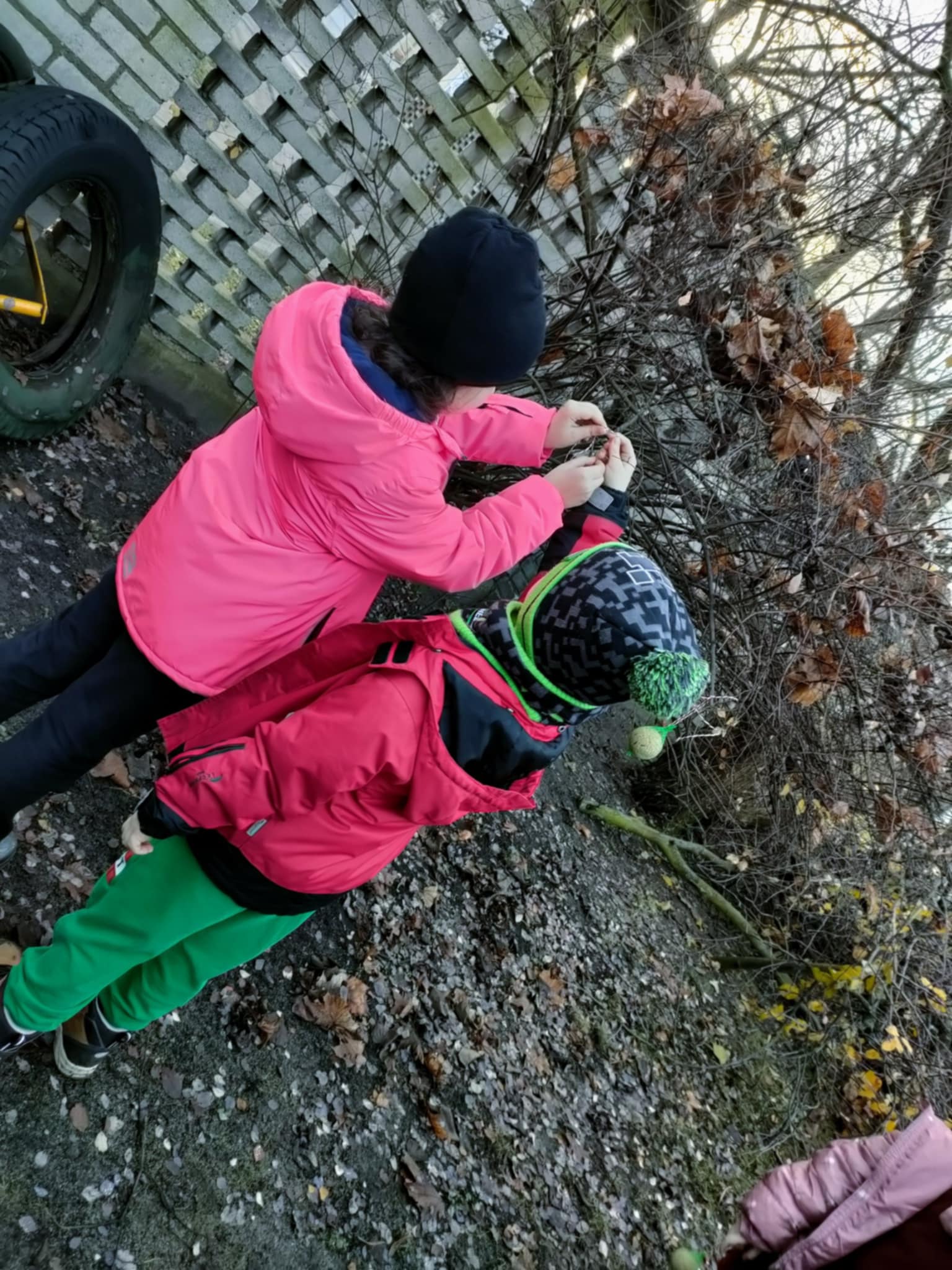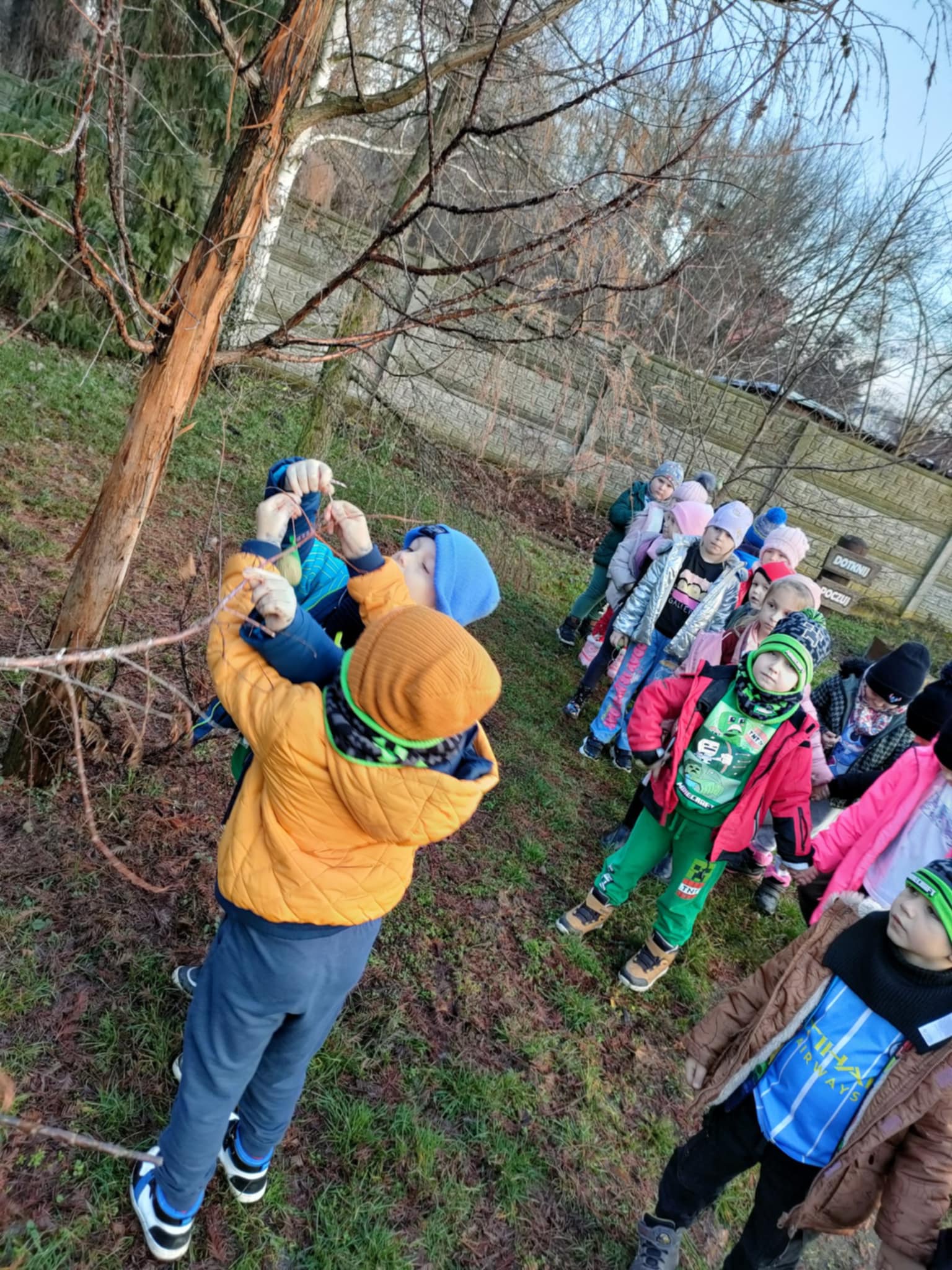 W tym tygodniu rozmawialiśmy na temat tego, jak zwierzęta spędzają zimę. Dziś po obiedzie, aby utrwalić zdobytą wiedzę, oglądaliśmy film edukacyjny na ten temat na ekranie multimedialnym, po czym udaliśmy się na ogród przedszkolny w ważnym celu. Dzieci zrozumiały, że zwierzęta podczas zimy potrzebują naszego wsparcia i otrzymały zadanie specjalne, któym było urządzenie "ptasiej stołówki" na ogrodzie. Każda para otrzymała woreczek ze specjalną kulą(pokarmem dla ptaków) i współpracując ze sobą, miała przyczepić woreczek na wybranej przez siebie gałązce danego drzewa. W ten sposób dzieci uczą się pomagać zwierzętom w sposób praktyczny, a przy okazji miło spędziliśmy czas na świeżym powietrzu. Po ustawieniu "ptasiej stołówki" dzieci miały jeszcze czas, aby pobawić się na przedszkolnym placu zabaw.