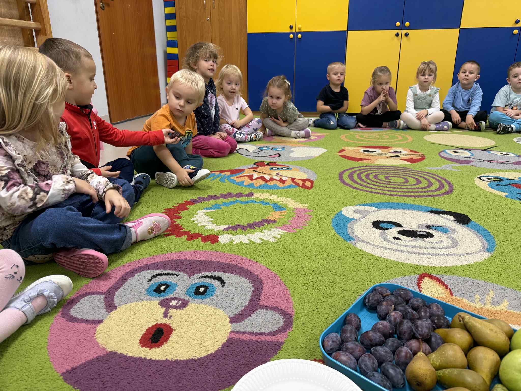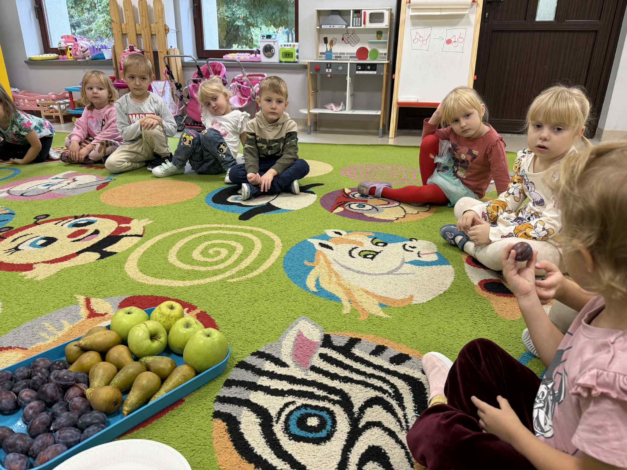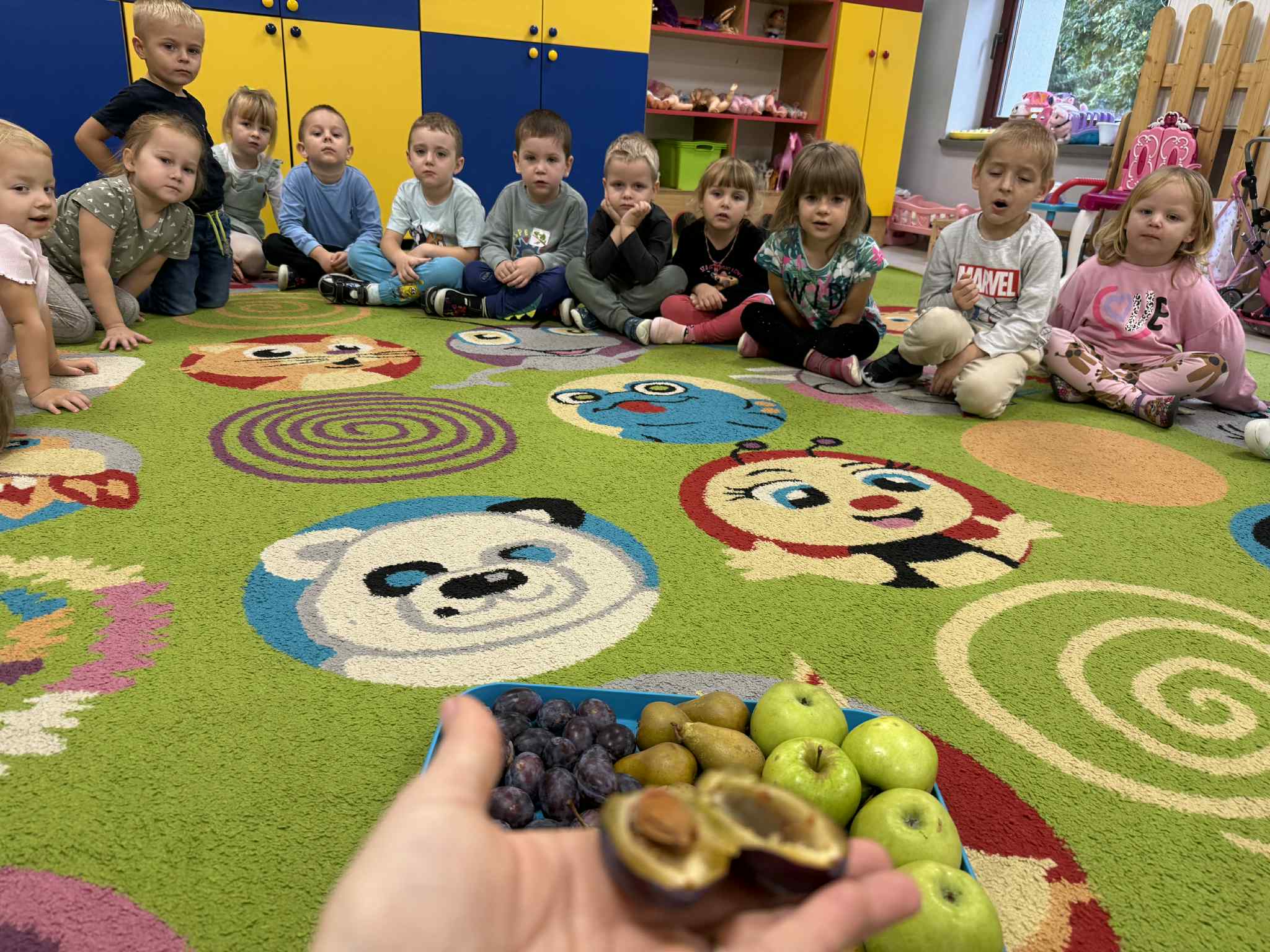 Podczas zajęć dzieci bawiły się owocami, poznając je wszystkimi zmysłami. Rozpoznawały owoce za pomocą dotyku, sprawdzając ich fakturę, wielkość i ciężar. Brały udział w zabawach zapachowych- z zasłoniętymi oczami odgadywały owoce po zapachu, a także w zabawach smakowych, próbując różnych owoców i określając ich smak. Wspólnie sprawdzaliśmy też, co owoce kryją w środku, odkrywając pestki, gniazda nasienne i różne struktury miąższu.