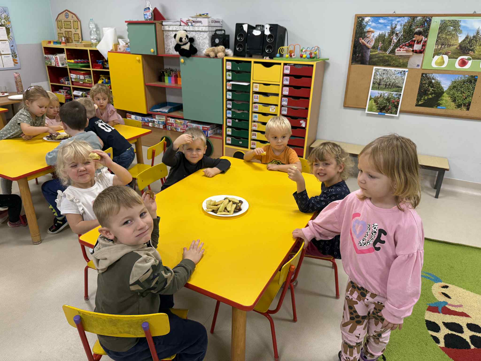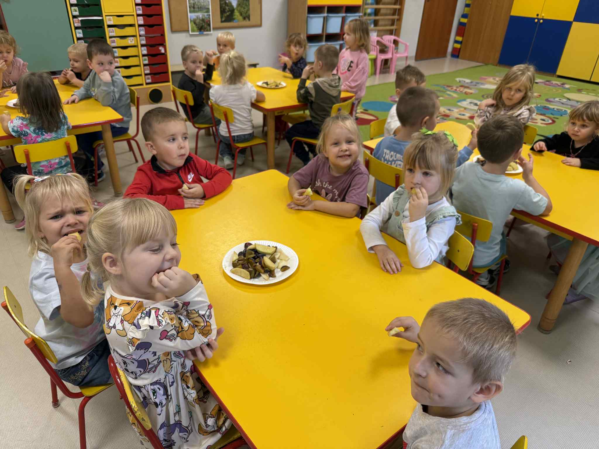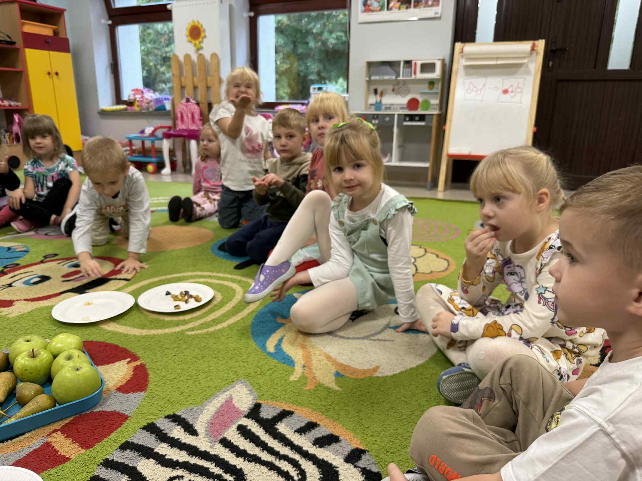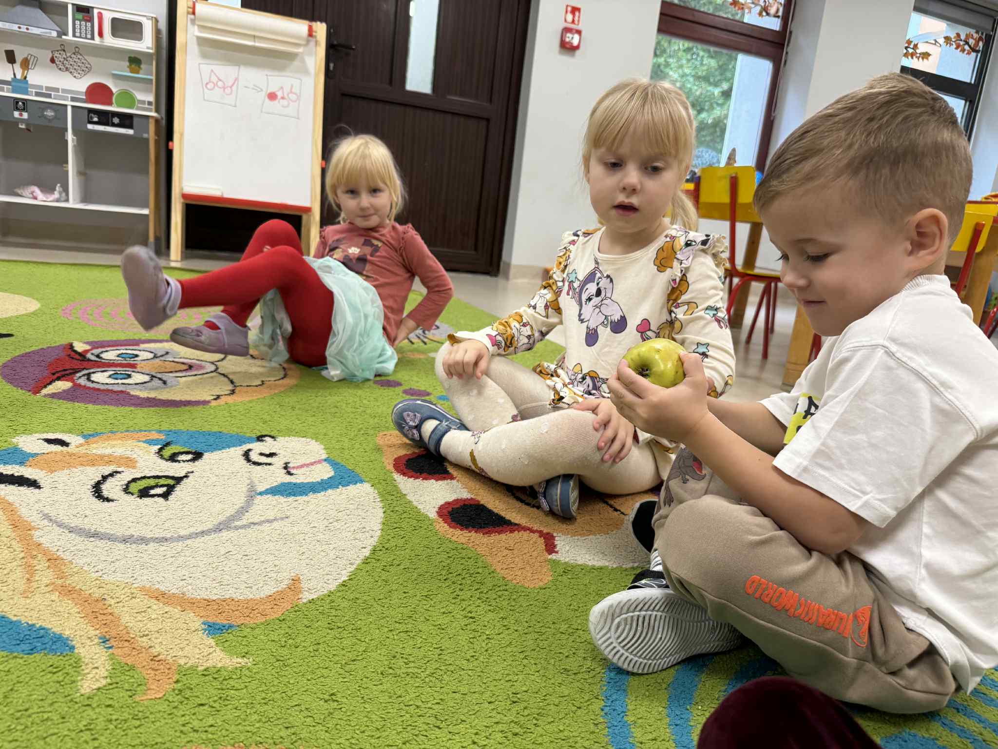 Podczas zajęć dzieci bawiły się owocami, poznając je wszystkimi zmysłami. Rozpoznawały owoce za pomocą dotyku, sprawdzając ich fakturę, wielkość i ciężar. Brały udział w zabawach zapachowych- z zasłoniętymi oczami odgadywały owoce po zapachu, a także w zabawach smakowych, próbując różnych owoców i określając ich smak. Wspólnie sprawdzaliśmy też, co owoce kryją w środku, odkrywając pestki, gniazda nasienne i różne struktury miąższu.