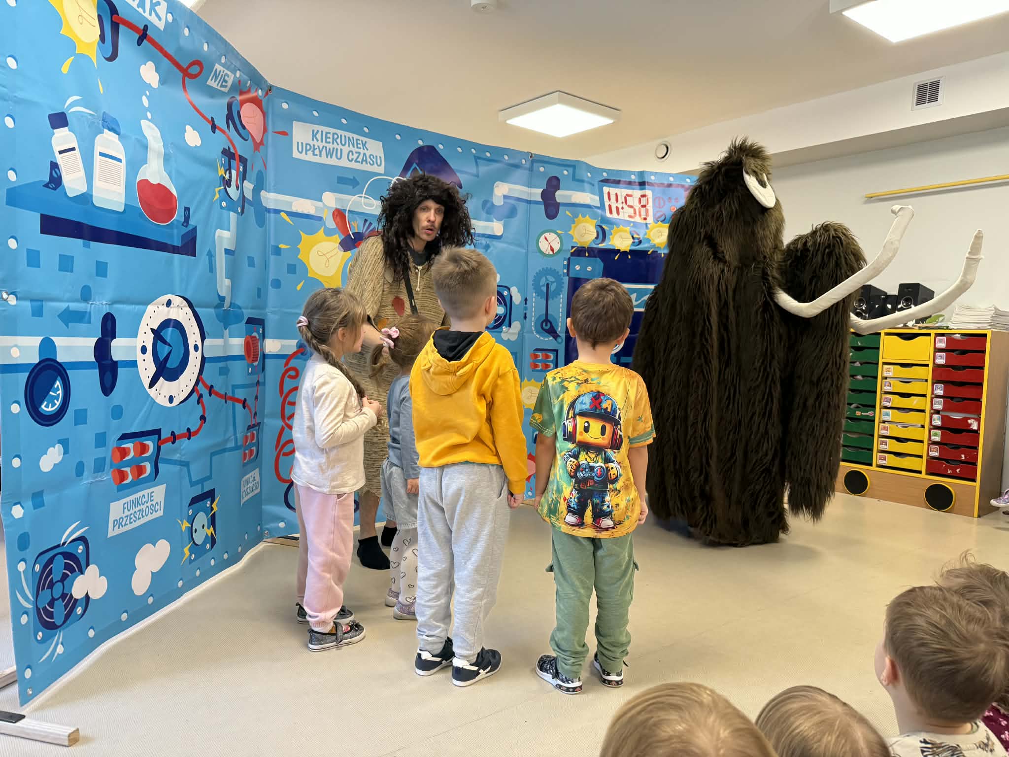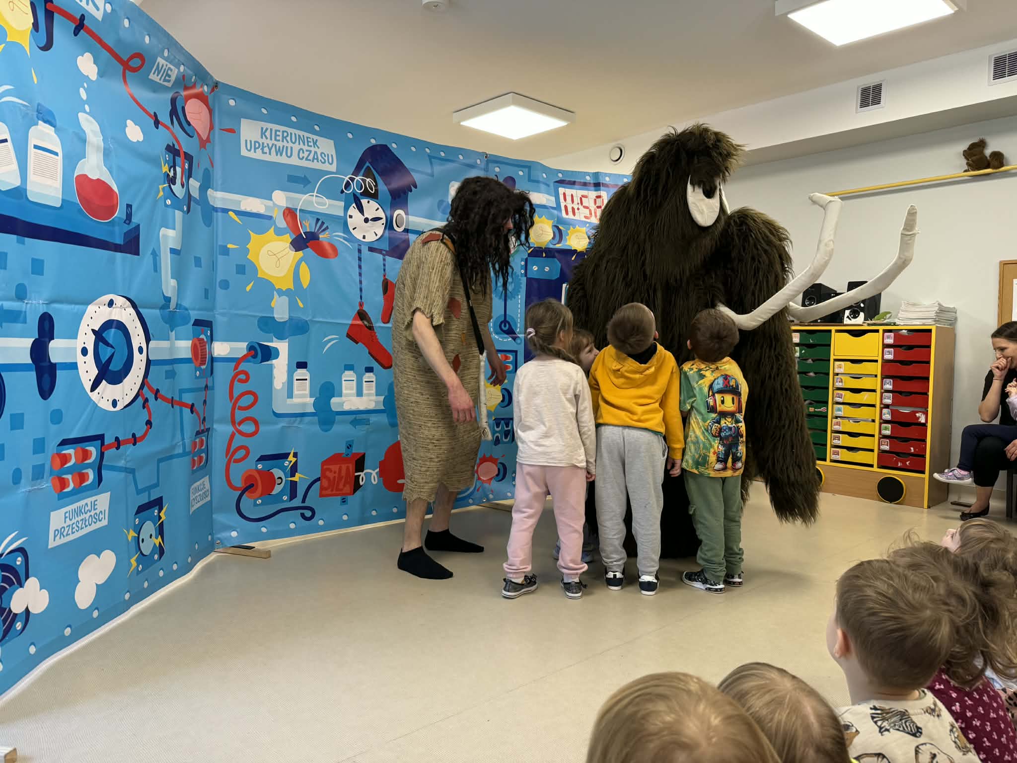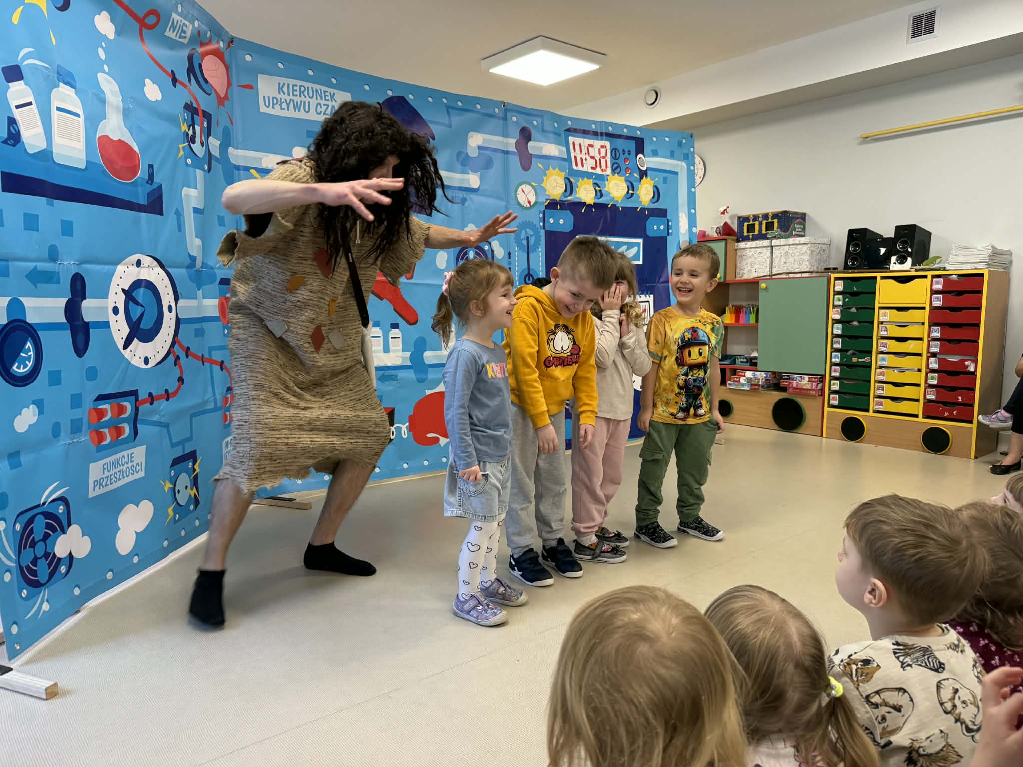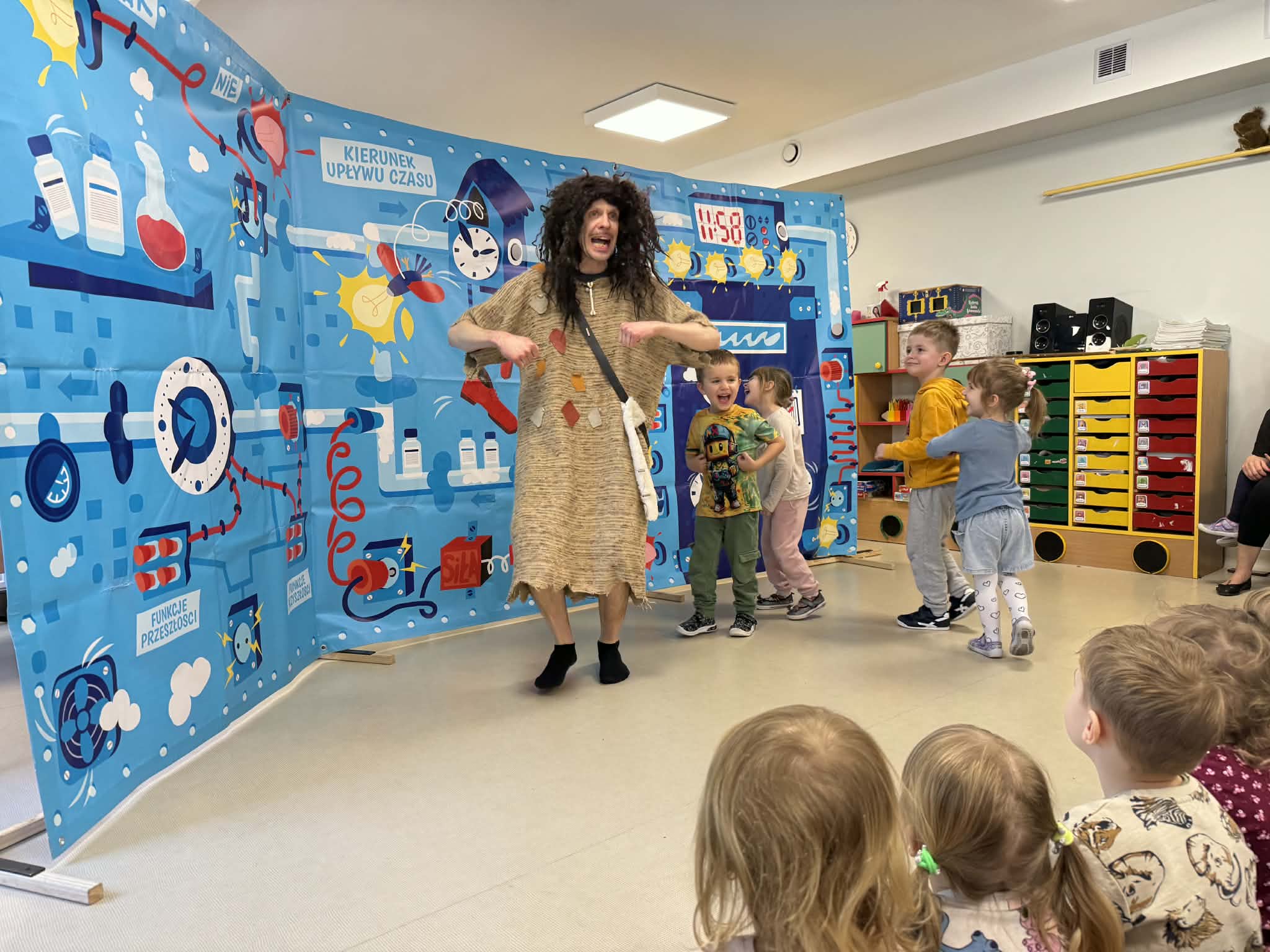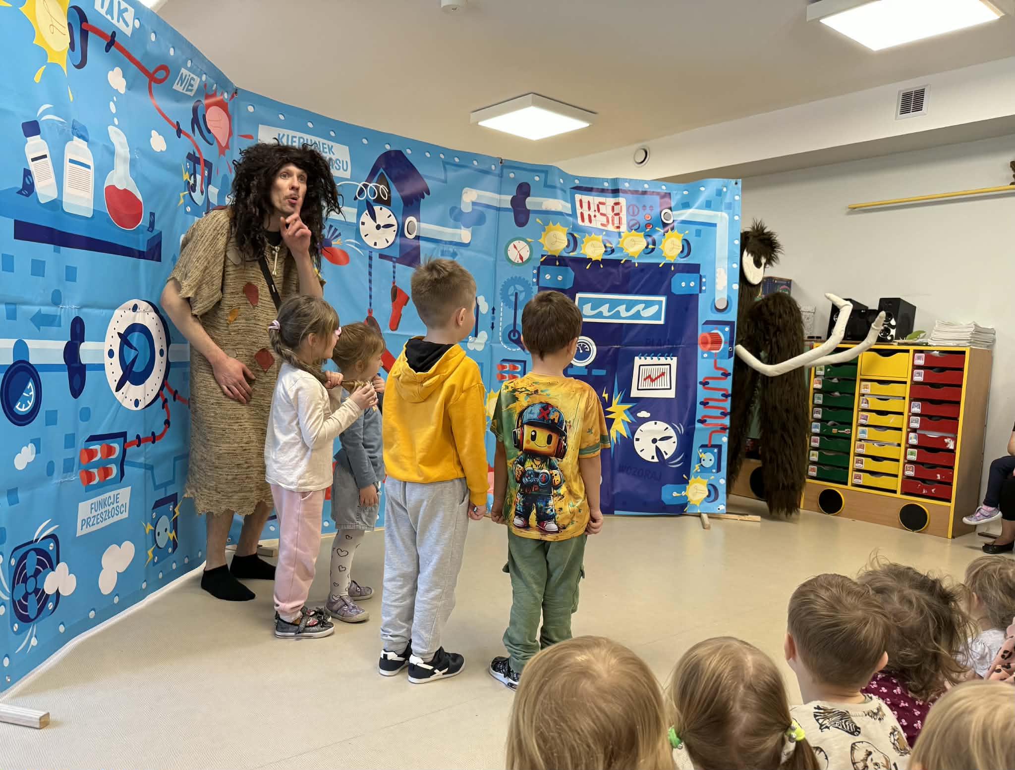 W naszym przedszkolu gościliśmy teatr objazdowy z Torunia- Pomarańczowy Cylinder, który zaprezentował spektakl „Profesorek Wodorek i Wehikuł Czasu”. Była to dowcipna i pełna przygód opowieść o niezwykłej podróży w czasie. Znany naukowiec, Profesorek Wodorek, przez przypadek uruchamia Maszynę Czasu i przenosi się do różnych epok. Odwiedził średniowiecze, gdzie spotkał rycerzy, oraz epokę kamienia łupanego, w której poznał jaskiniowca i mamuta. Spektakl w przystępny i humorystyczny sposób poruszały bardzo ważny temat- szacunek. Dzieci dowiedziały się, jak ważne jest okazywanie szacunku osobom starszym i korzystanie z ich doświadczenia, właściwe odnoszenie się do rówieśników oraz zabawa zgodnie z zasadami fair play. Artyści zwrócili także uwagę na szacunek wobec zwierząt oraz potrzebę rozumienia ich emocji. Przedstawienie zostało zrealizowane w nowatorski sposób, dialogi powstały metodą improwizacji, dzięki czemu spektakl był bardzo naturalny, pełen pogodnych skeczów i zabawnych sytuacji. Dużą atrakcją był bezpośredni kontakt z publicznością, dzieci chętnie włączały się do zabawy i aktywnie uczestniczyły w przedstawieniu. Było miło, zabawnie i bardzo pouczająco!