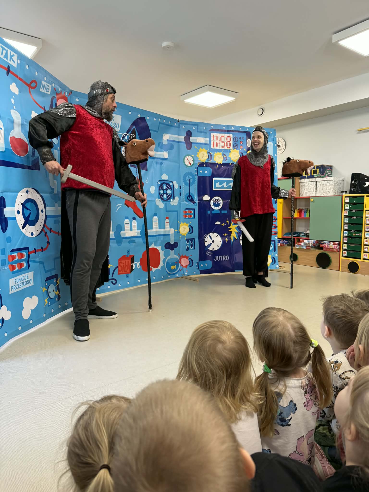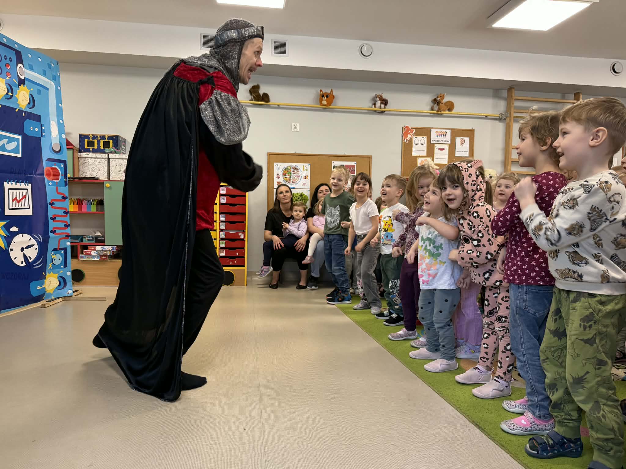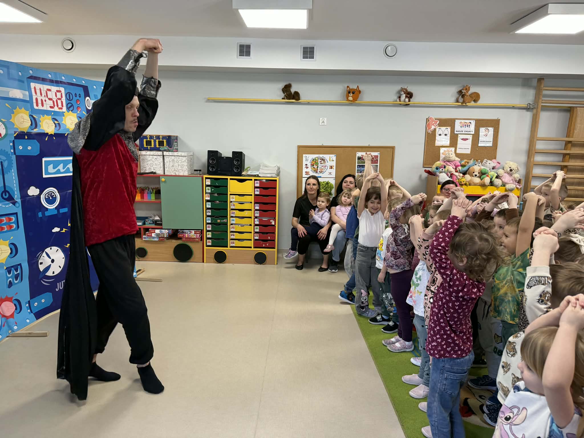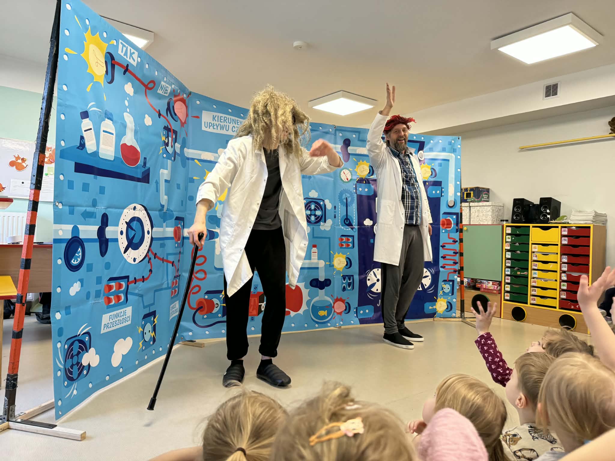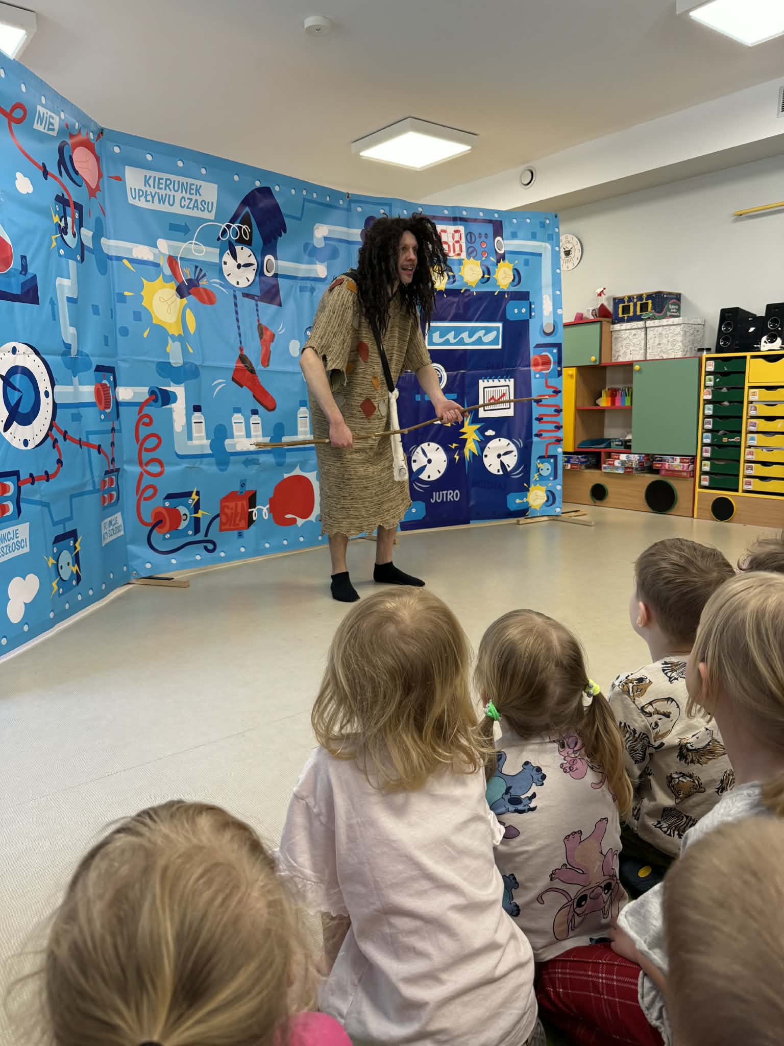 W naszym przedszkolu gościliśmy teatr objazdowy z Torunia- Pomarańczowy Cylinder, który zaprezentował spektakl „Profesorek Wodorek i Wehikuł Czasu”. Była to dowcipna i pełna przygód opowieść o niezwykłej podróży w czasie. Znany naukowiec, Profesorek Wodorek, przez przypadek uruchamia Maszynę Czasu i przenosi się do różnych epok. Odwiedził średniowiecze, gdzie spotkał rycerzy, oraz epokę kamienia łupanego, w której poznał jaskiniowca i mamuta. Spektakl w przystępny i humorystyczny sposób poruszały bardzo ważny temat- szacunek. Dzieci dowiedziały się, jak ważne jest okazywanie szacunku osobom starszym i korzystanie z ich doświadczenia, właściwe odnoszenie się do rówieśników oraz zabawa zgodnie z zasadami fair play. Artyści zwrócili także uwagę na szacunek wobec zwierząt oraz potrzebę rozumienia ich emocji. Przedstawienie zostało zrealizowane w nowatorski sposób, dialogi powstały metodą improwizacji, dzięki czemu spektakl był bardzo naturalny, pełen pogodnych skeczów i zabawnych sytuacji. Dużą atrakcją był bezpośredni kontakt z publicznością, dzieci chętnie włączały się do zabawy i aktywnie uczestniczyły w przedstawieniu. Było miło, zabawnie i bardzo pouczająco!