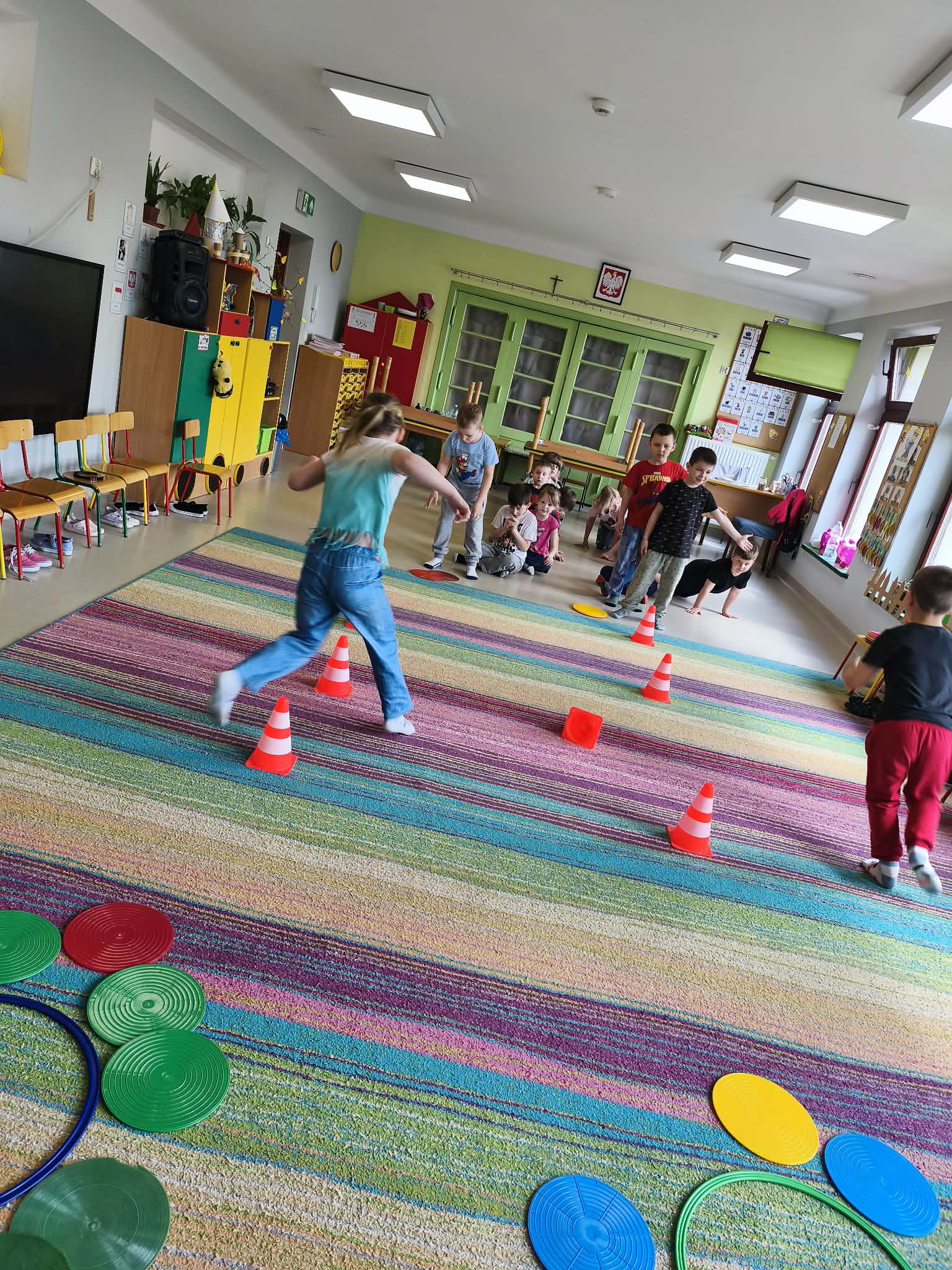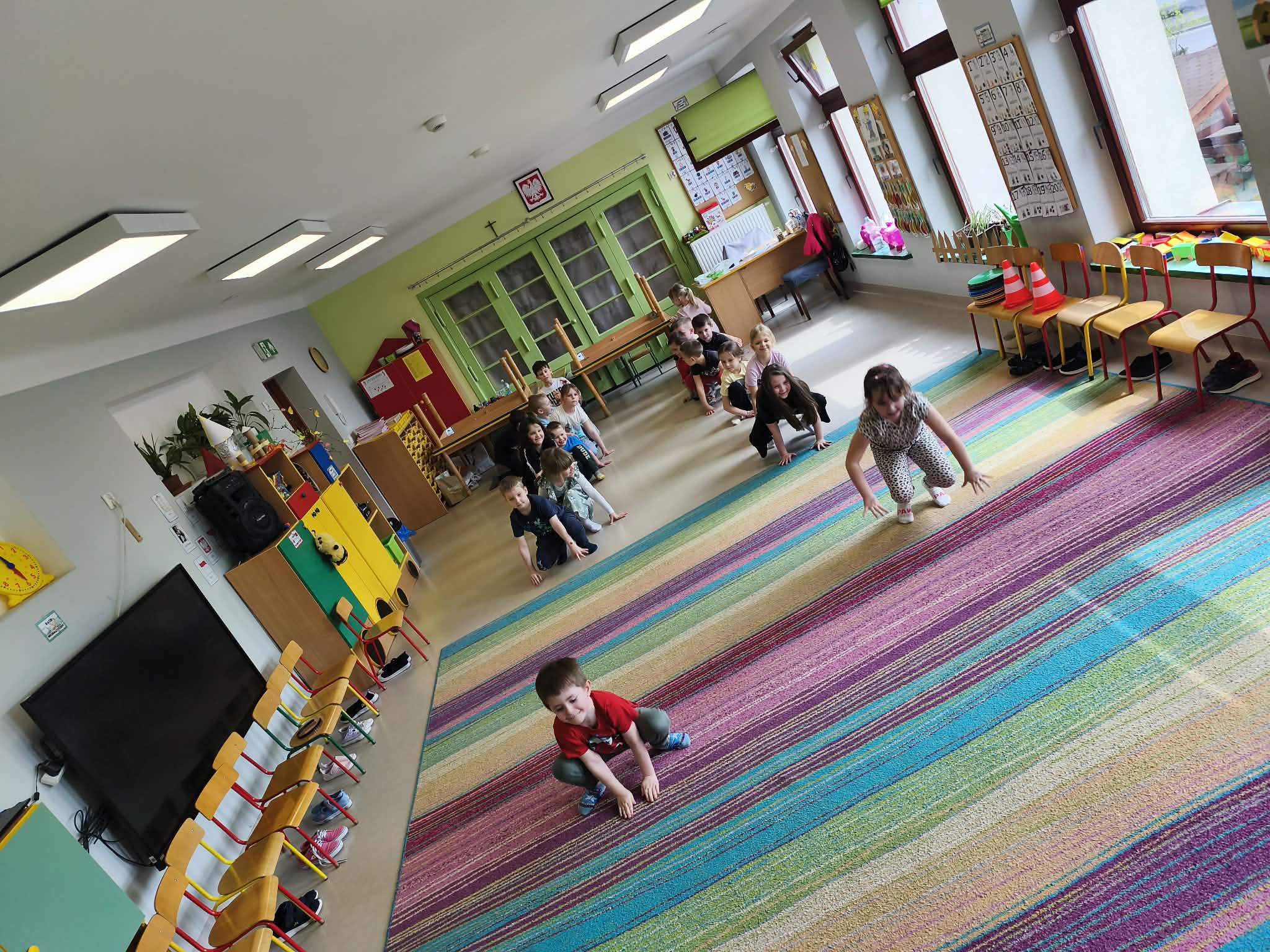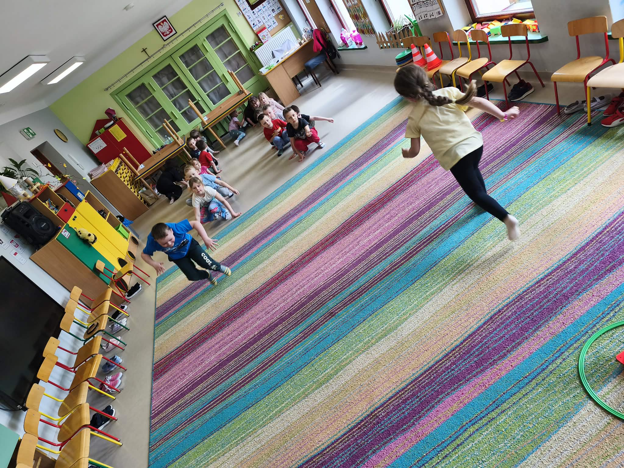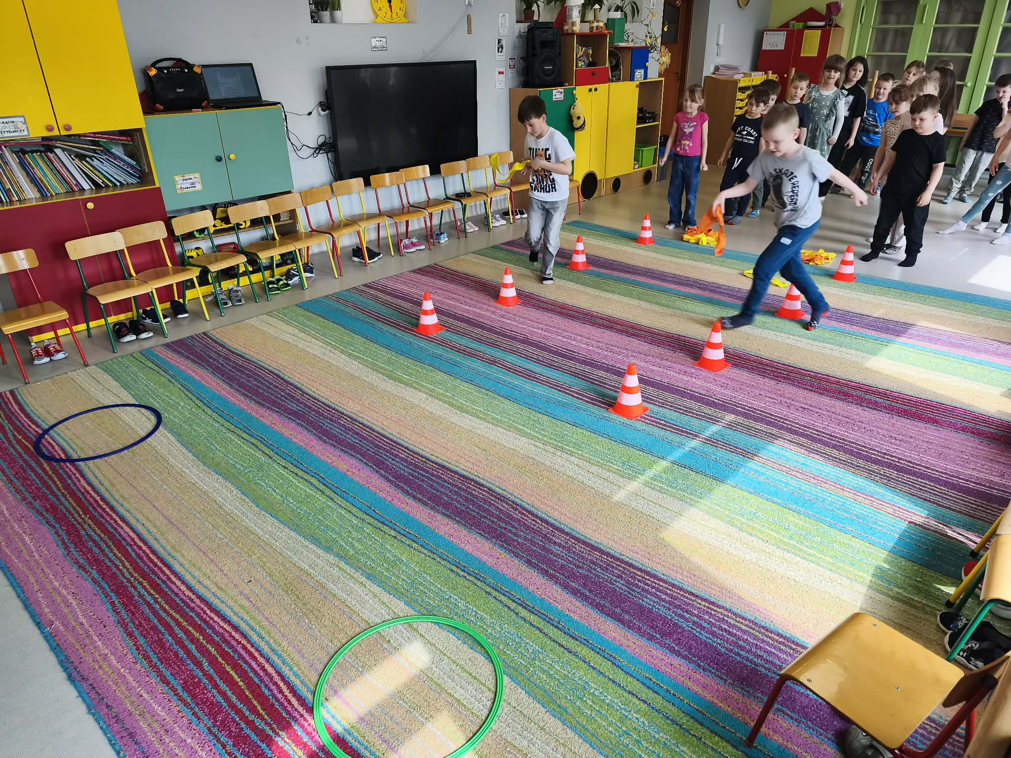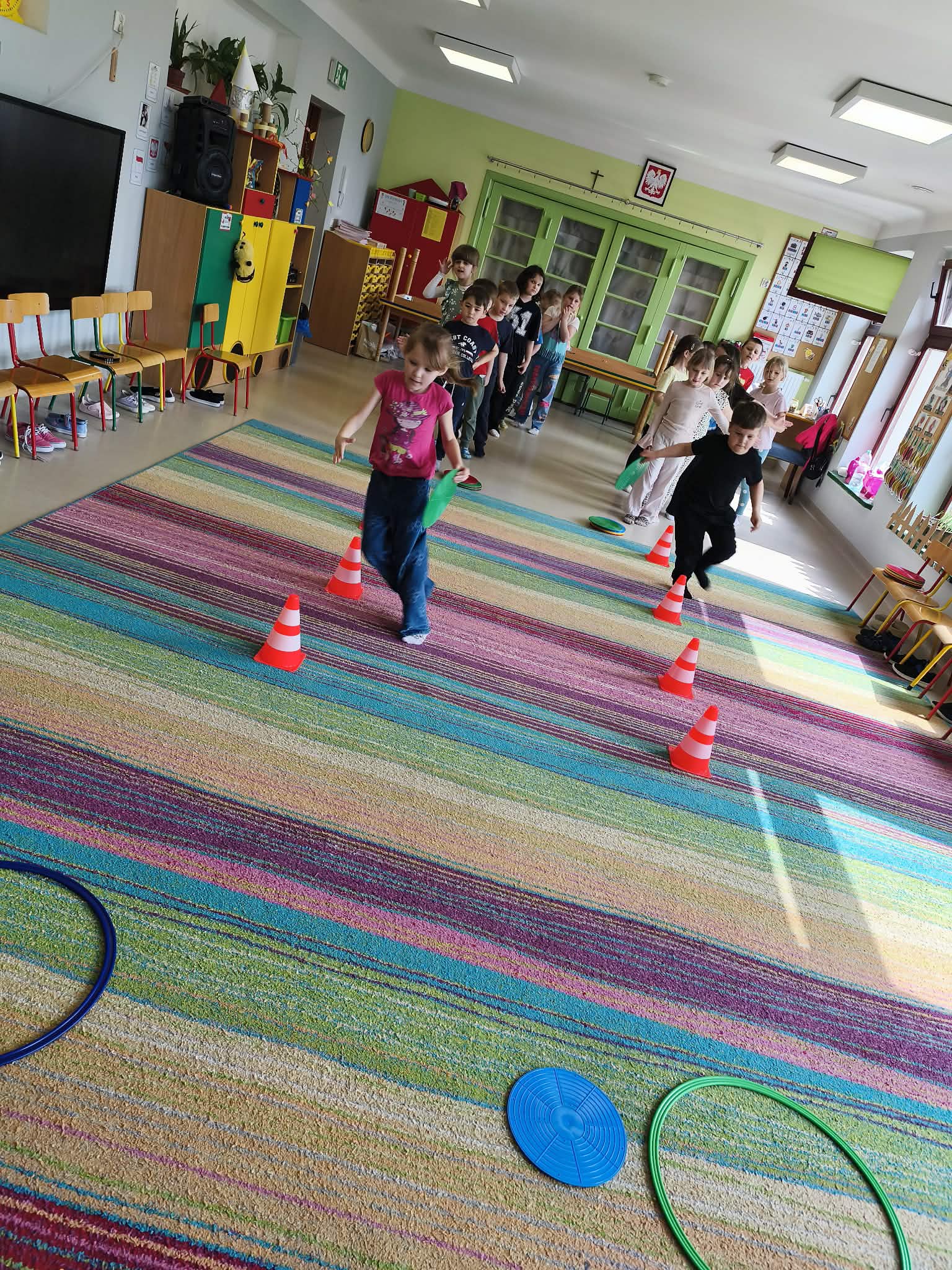 Tego dnia, po rozgrzewce w formie zumby, dzieci podzielone na dwa zespoły przystąpiły do wiosennych zawodów sportowych. Zaproponowane konkurencje powiązane były tematycznie z aktualną porą roku, a ich głównym celem było zachęcenie do aktywności ruchowej, kształtowanie umiejętności współpracy w zespole, rozwijanie umiejętności słuchania poleceń oraz ćwiczenie uwagi i koncentracji. Dzieci wykazały się szybkością, sprawnością, skocznością a także umiejętnością rywalizacji w duchu fair-play. Obydwie drużyny zremisowały, ćwiczenia wykonały rzetelnie, zwracając uwagę na dokładność i precyzję. Realizując zajęcia w takiej formie, zwracamy uwagę nie na wynik, lecz przede wszystkim na dobrą zabawę i rywalizujemy ze sobą w atmoferze pełnej radości i śmiechu, przy okazji stawiamy na utrwalenie nawyku sięgania po wodę. Korzystaliśmy z różnych przyborów gimnastycznych, tj. szarfy, hula-hop, pachołki, dyski gimnastyczne czy koce. Po zajęciach przyszedł czas na wyciszenie, podczas którego słuchaliśmy muzyki relaksacyjnej w dowolnej pozycji na dywanie, a chwilkę później wybraliśmy się na przedszkolny plac zabaw, by tam pobawić się swobodnie na świeżym powietrzu. Warto podkreślić, iż "Pszczółki" samodzielnie przygotowały salę do wiosennych zawodów, a następnie po ich zakończeniu posprzątały ją.