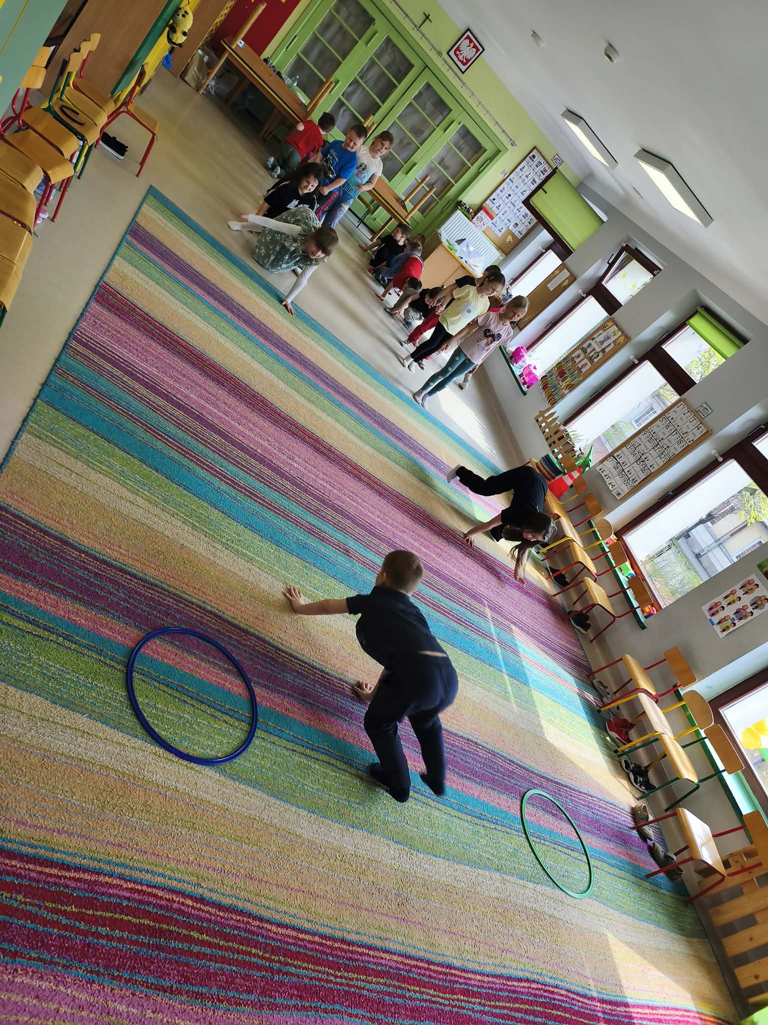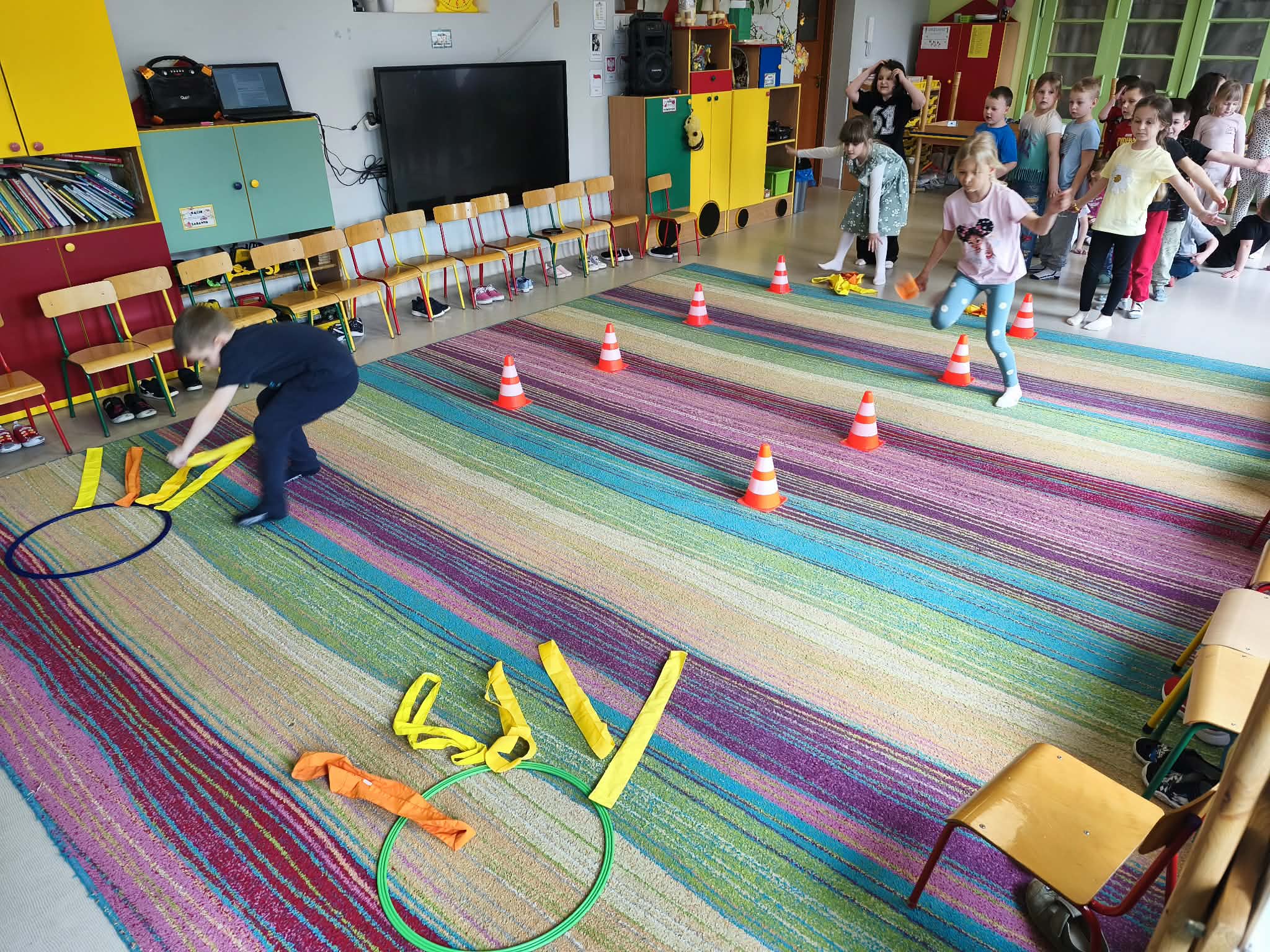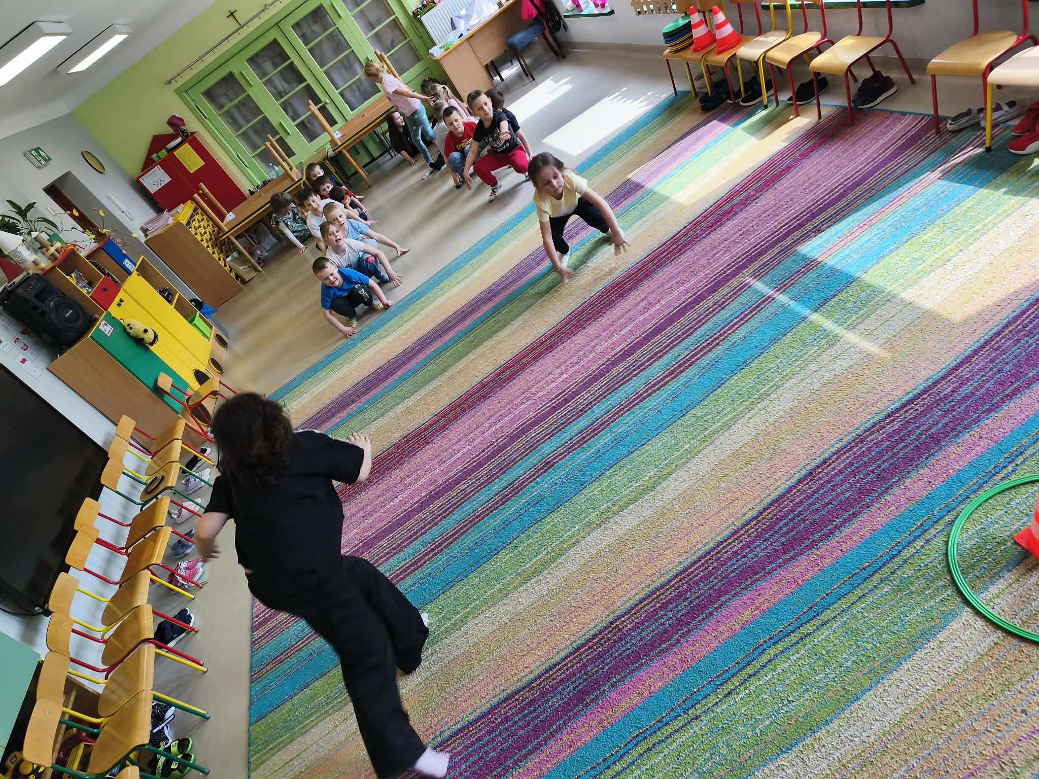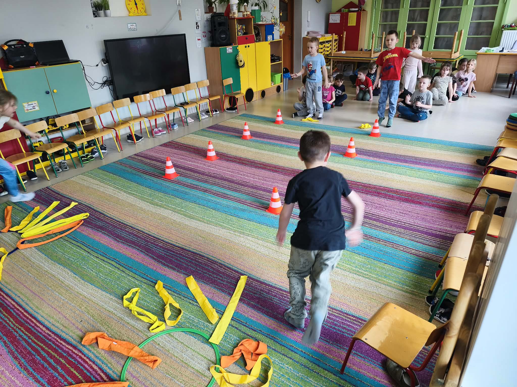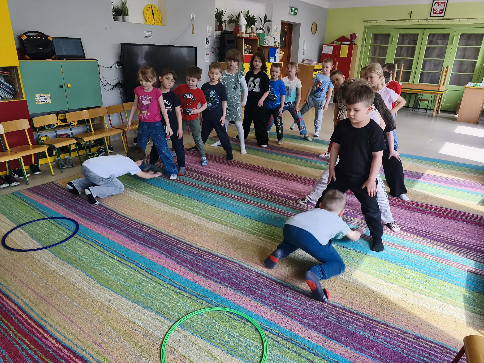 Tego dnia, po rozgrzewce w formie zumby, dzieci podzielone na dwa zespoły przystąpiły do wiosennych zawodów sportowych. Zaproponowane konkurencje powiązane były tematycznie z aktualną porą roku, a ich głównym celem było zachęcenie do aktywności ruchowej, kształtowanie umiejętności współpracy w zespole, rozwijanie umiejętności słuchania poleceń oraz ćwiczenie uwagi i koncentracji. Dzieci wykazały się szybkością, sprawnością, skocznością a także umiejętnością rywalizacji w duchu fair-play. Obydwie drużyny zremisowały, ćwiczenia wykonały rzetelnie, zwracając uwagę na dokładność i precyzję. Realizując zajęcia w takiej formie, zwracamy uwagę nie na wynik, lecz przede wszystkim na dobrą zabawę i rywalizujemy ze sobą w atmoferze pełnej radości i śmiechu, przy okazji stawiamy na utrwalenie nawyku sięgania po wodę. Korzystaliśmy z różnych przyborów gimnastycznych, tj. szarfy, hula-hop, pachołki, dyski gimnastyczne czy koce. Po zajęciach przyszedł czas na wyciszenie, podczas którego słuchaliśmy muzyki relaksacyjnej w dowolnej pozycji na dywanie, a chwilkę później wybraliśmy się na przedszkolny plac zabaw, by tam pobawić się swobodnie na świeżym powietrzu. Warto podkreślić, iż "Pszczółki" samodzielnie przygotowały salę do wiosennych zawodów, a następnie po ich zakończeniu posprzątały ją.