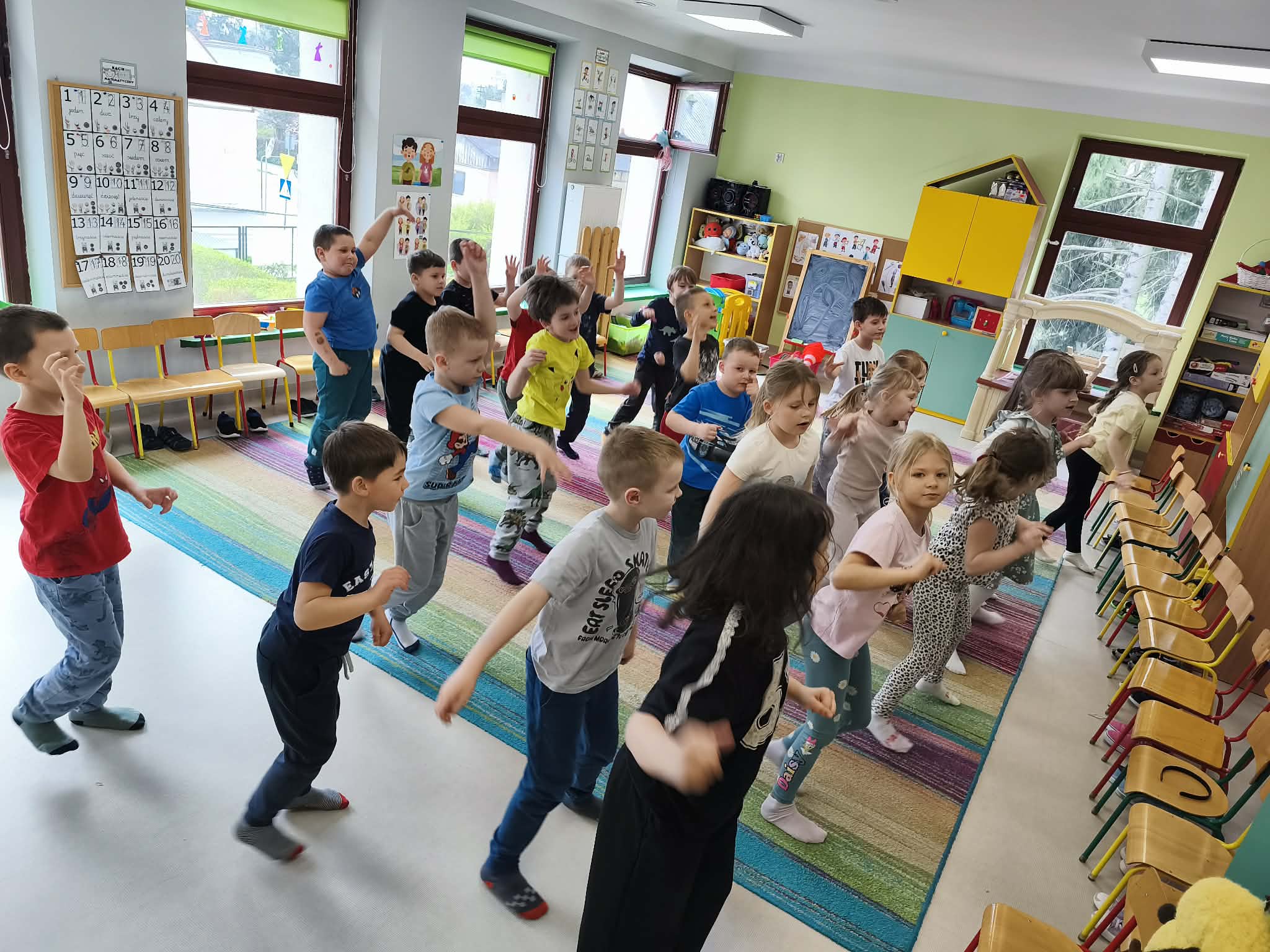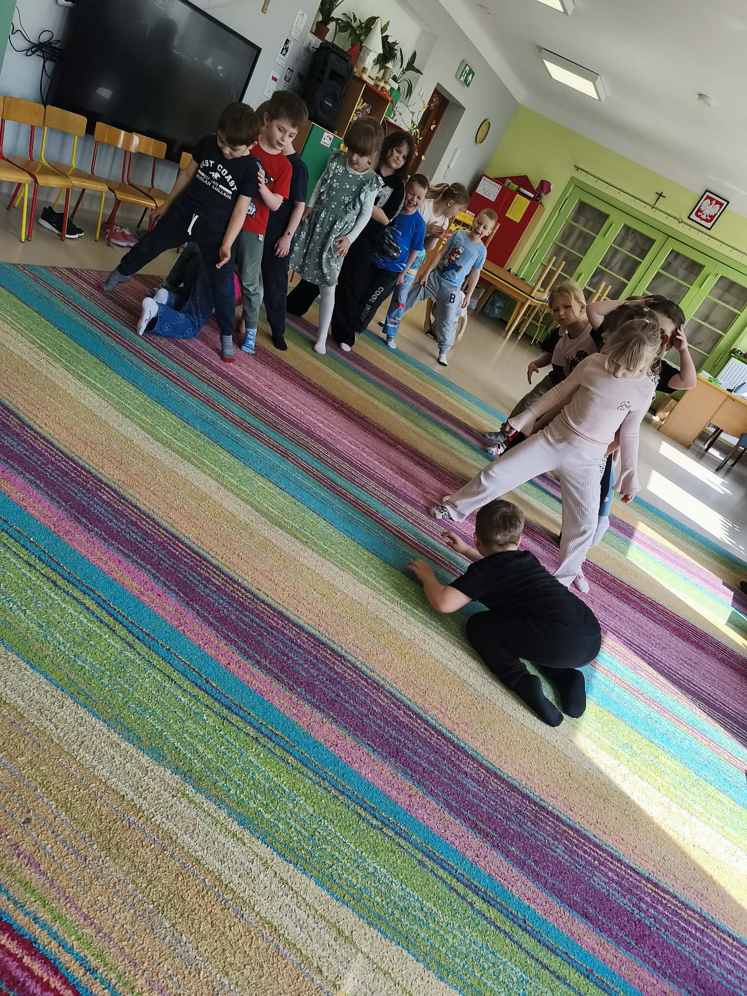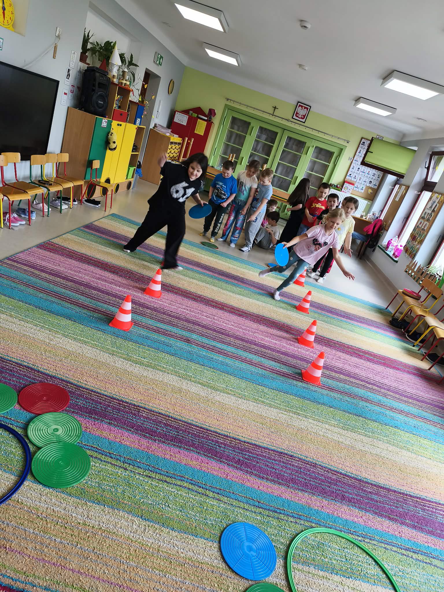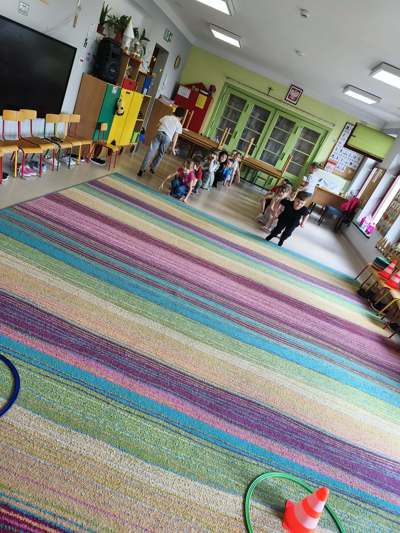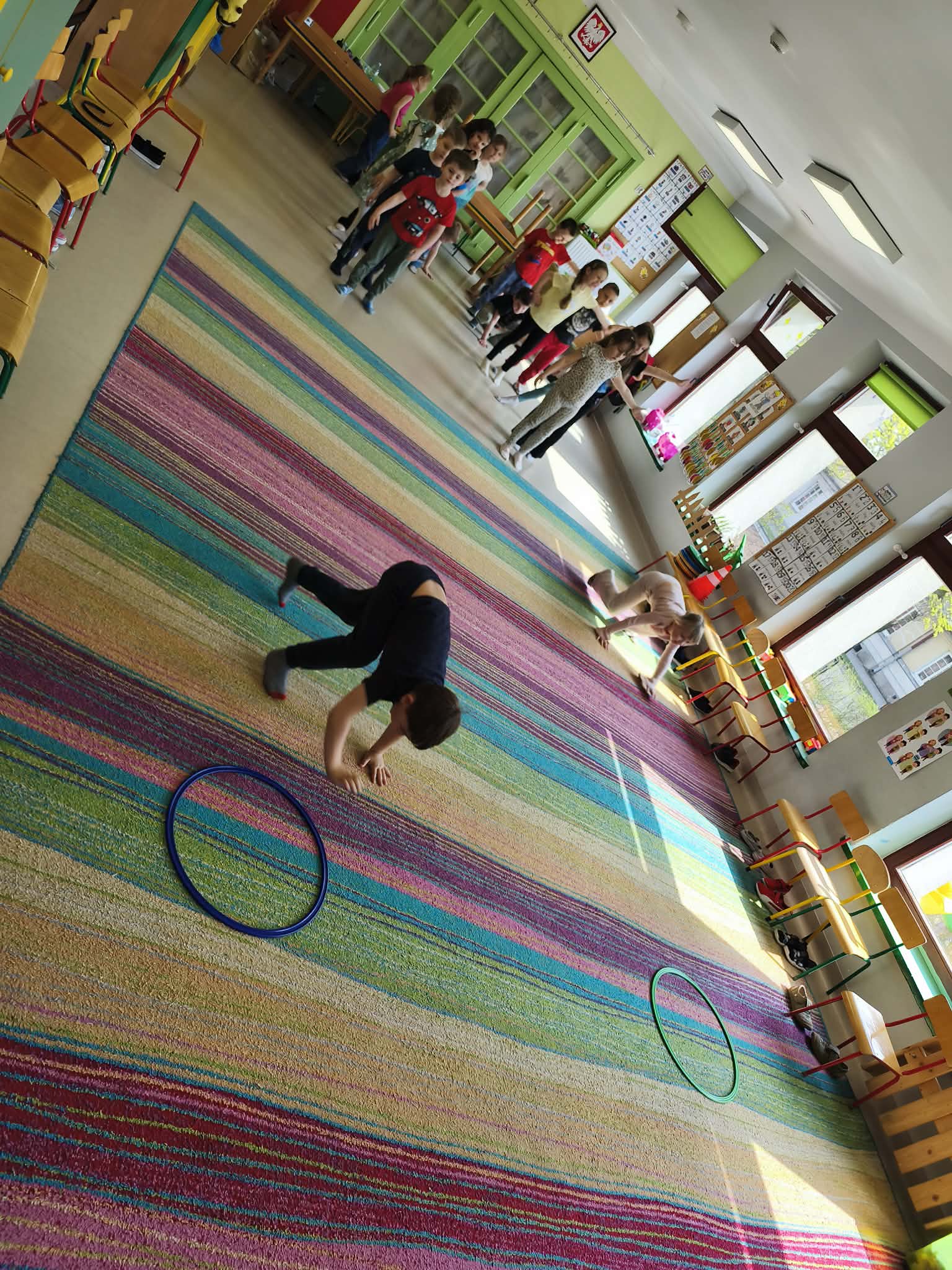 Tego dnia, po rozgrzewce w formie zumby, dzieci podzielone na dwa zespoły przystąpiły do wiosennych zawodów sportowych. Zaproponowane konkurencje powiązane były tematycznie z aktualną porą roku, a ich głównym celem było zachęcenie do aktywności ruchowej, kształtowanie umiejętności współpracy w zespole, rozwijanie umiejętności słuchania poleceń oraz ćwiczenie uwagi i koncentracji. Dzieci wykazały się szybkością, sprawnością, skocznością a także umiejętnością rywalizacji w duchu fair-play. Obydwie drużyny zremisowały, ćwiczenia wykonały rzetelnie, zwracając uwagę na dokładność i precyzję. Realizując zajęcia w takiej formie, zwracamy uwagę nie na wynik, lecz przede wszystkim na dobrą zabawę i rywalizujemy ze sobą w atmoferze pełnej radości i śmiechu, przy okazji stawiamy na utrwalenie nawyku sięgania po wodę. Korzystaliśmy z różnych przyborów gimnastycznych, tj. szarfy, hula-hop, pachołki, dyski gimnastyczne czy koce. Po zajęciach przyszedł czas na wyciszenie, podczas którego słuchaliśmy muzyki relaksacyjnej w dowolnej pozycji na dywanie, a chwilkę później wybraliśmy się na przedszkolny plac zabaw, by tam pobawić się swobodnie na świeżym powietrzu. Warto podkreślić, iż "Pszczółki" samodzielnie przygotowały salę do wiosennych zawodów, a następnie po ich zakończeniu posprzątały ją.