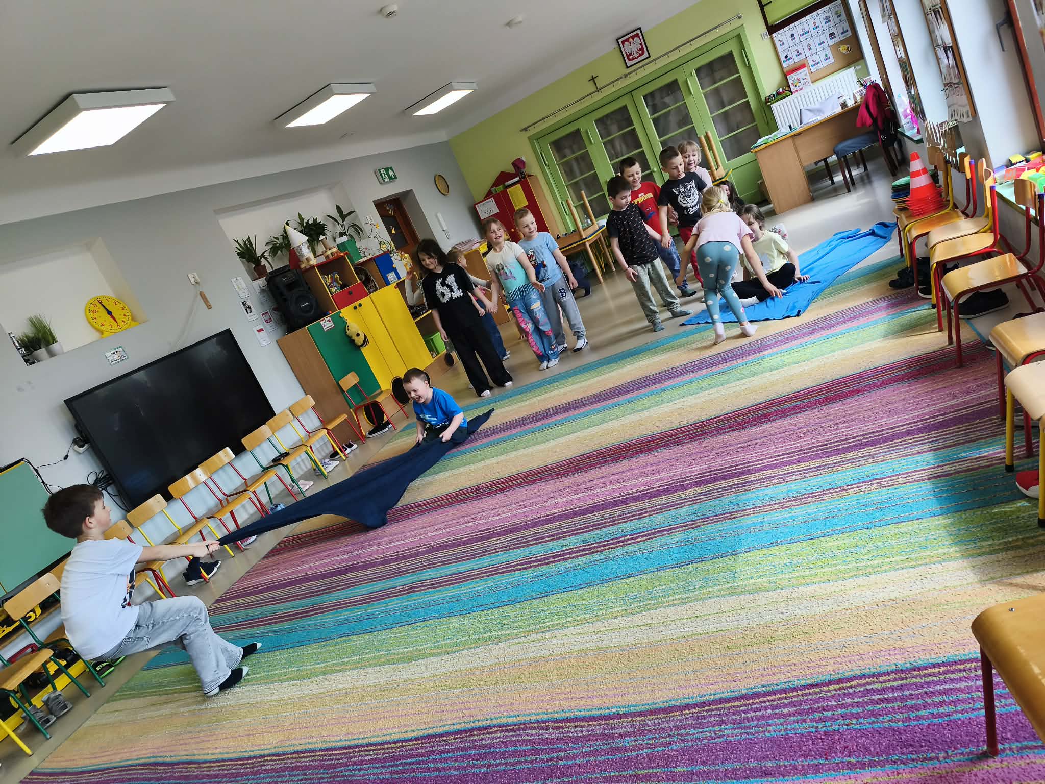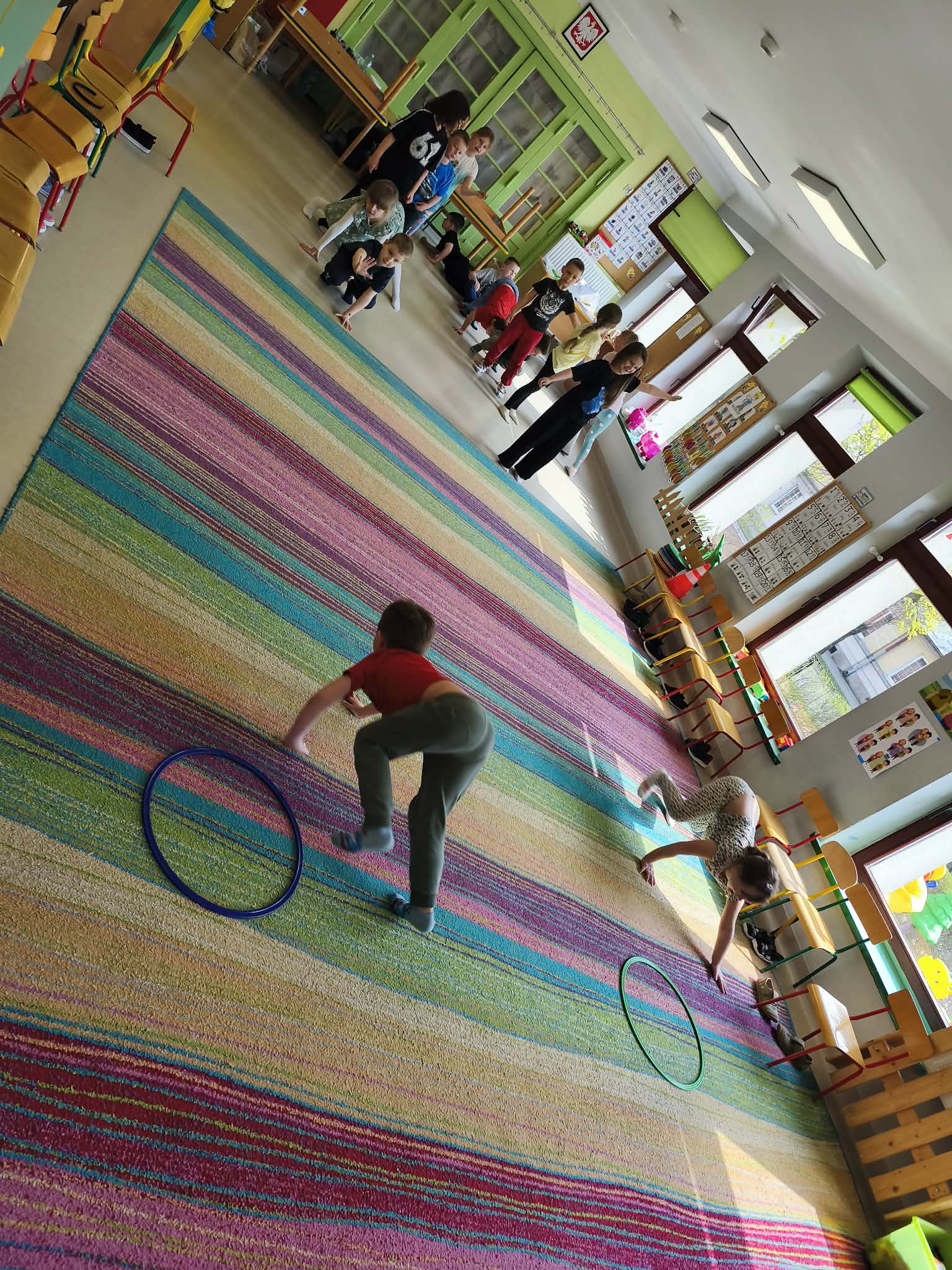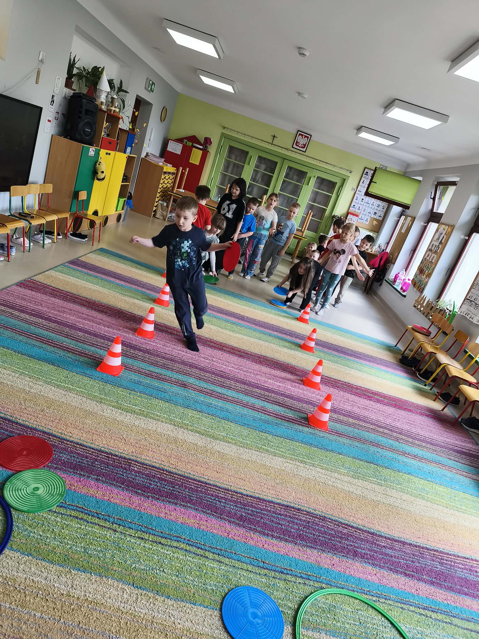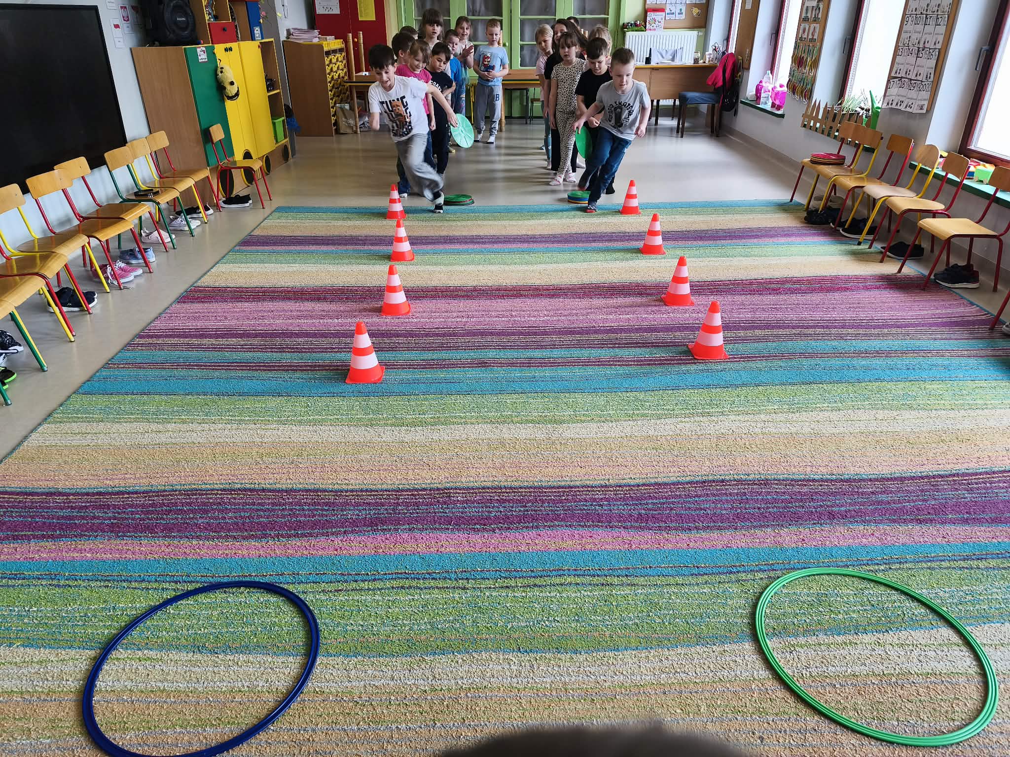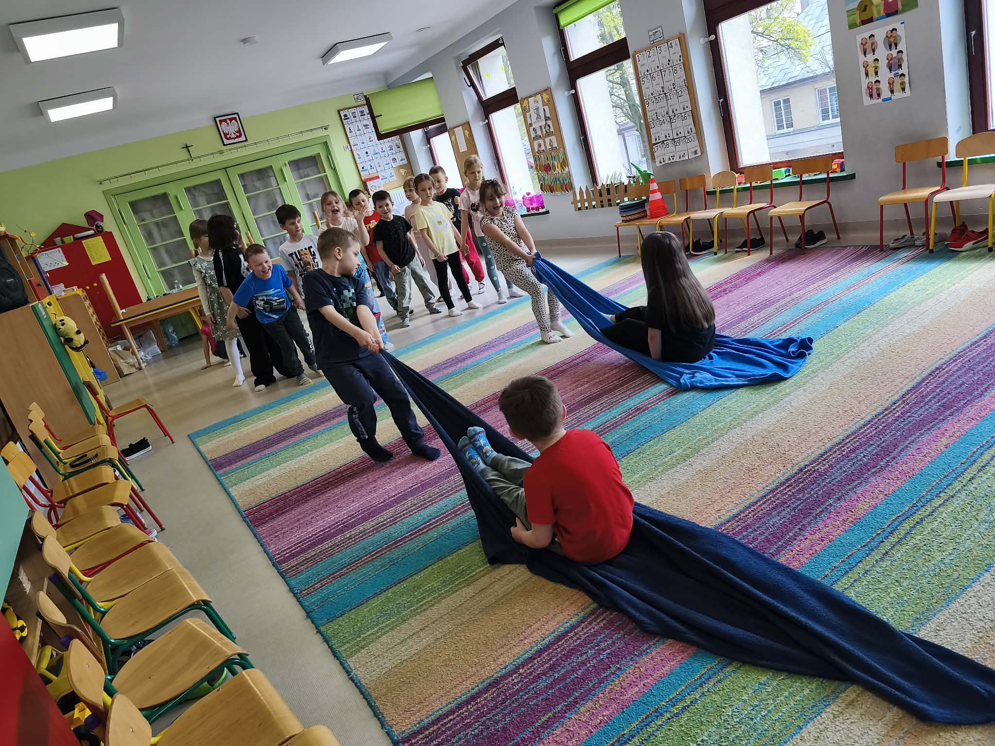 Tego dnia, po rozgrzewce w formie zumby, dzieci podzielone na dwa zespoły przystąpiły do wiosennych zawodów sportowych. Zaproponowane konkurencje powiązane były tematycznie z aktualną porą roku, a ich głównym celem było zachęcenie do aktywności ruchowej, kształtowanie umiejętności współpracy w zespole, rozwijanie umiejętności słuchania poleceń oraz ćwiczenie uwagi i koncentracji. Dzieci wykazały się szybkością, sprawnością, skocznością a także umiejętnością rywalizacji w duchu fair-play. Obydwie drużyny zremisowały, ćwiczenia wykonały rzetelnie, zwracając uwagę na dokładność i precyzję. Realizując zajęcia w takiej formie, zwracamy uwagę nie na wynik, lecz przede wszystkim na dobrą zabawę i rywalizujemy ze sobą w atmoferze pełnej radości i śmiechu, przy okazji stawiamy na utrwalenie nawyku sięgania po wodę. Korzystaliśmy z różnych przyborów gimnastycznych, tj. szarfy, hula-hop, pachołki, dyski gimnastyczne czy koce. Po zajęciach przyszedł czas na wyciszenie, podczas którego słuchaliśmy muzyki relaksacyjnej w dowolnej pozycji na dywanie, a chwilkę później wybraliśmy się na przedszkolny plac zabaw, by tam pobawić się swobodnie na świeżym powietrzu. Warto podkreślić, iż "Pszczółki" samodzielnie przygotowały salę do wiosennych zawodów, a następnie po ich zakończeniu posprzątały ją.