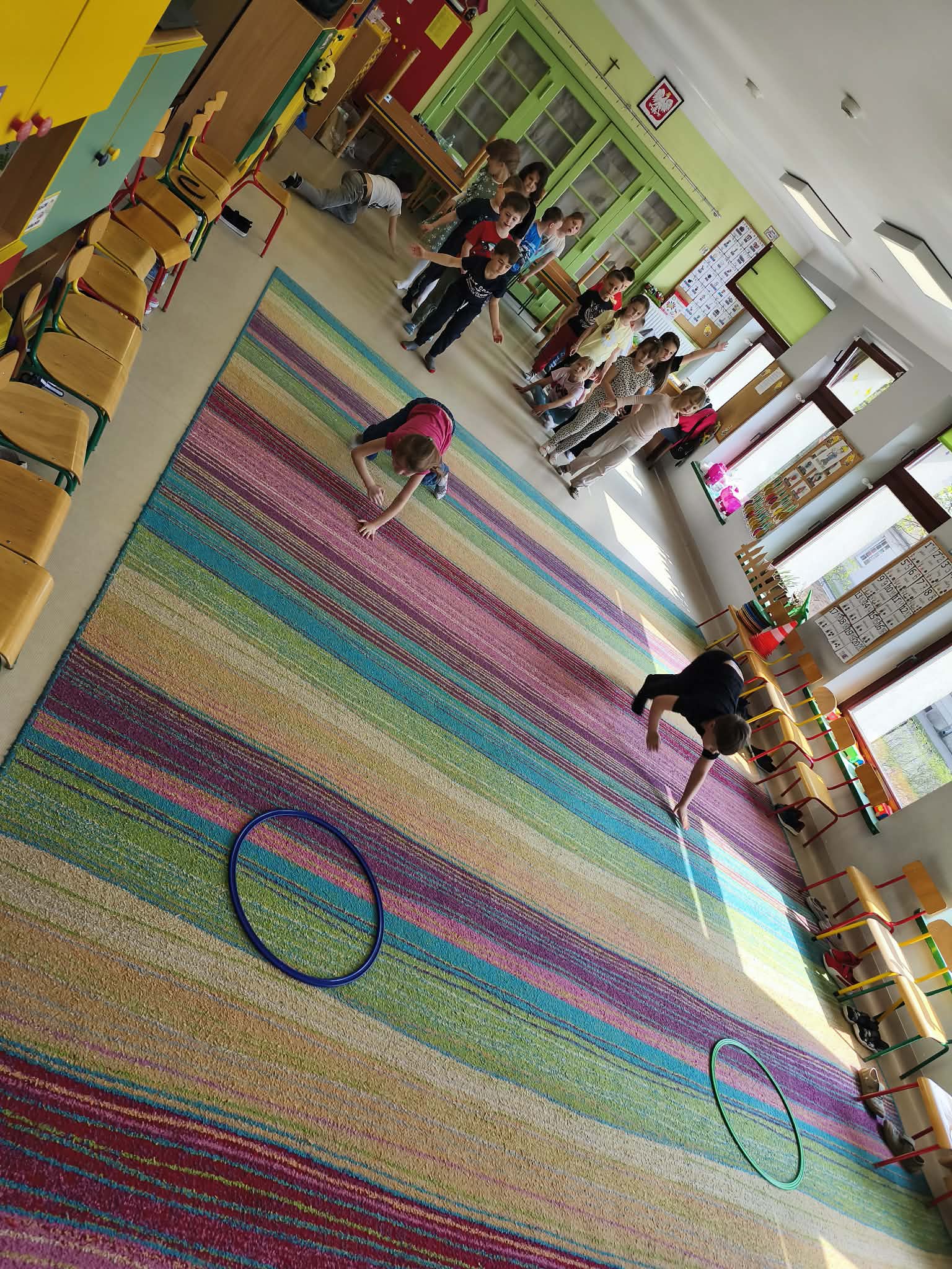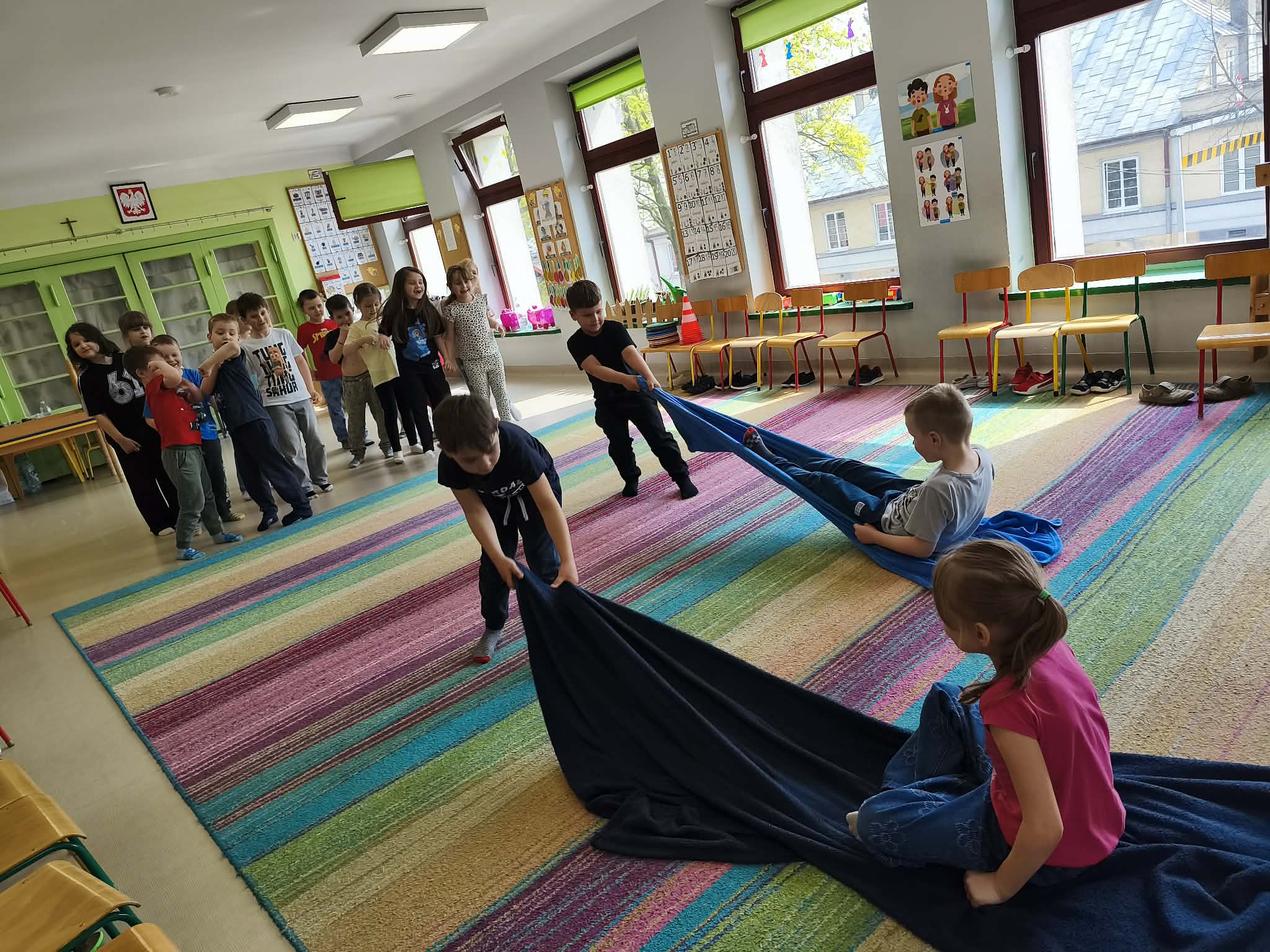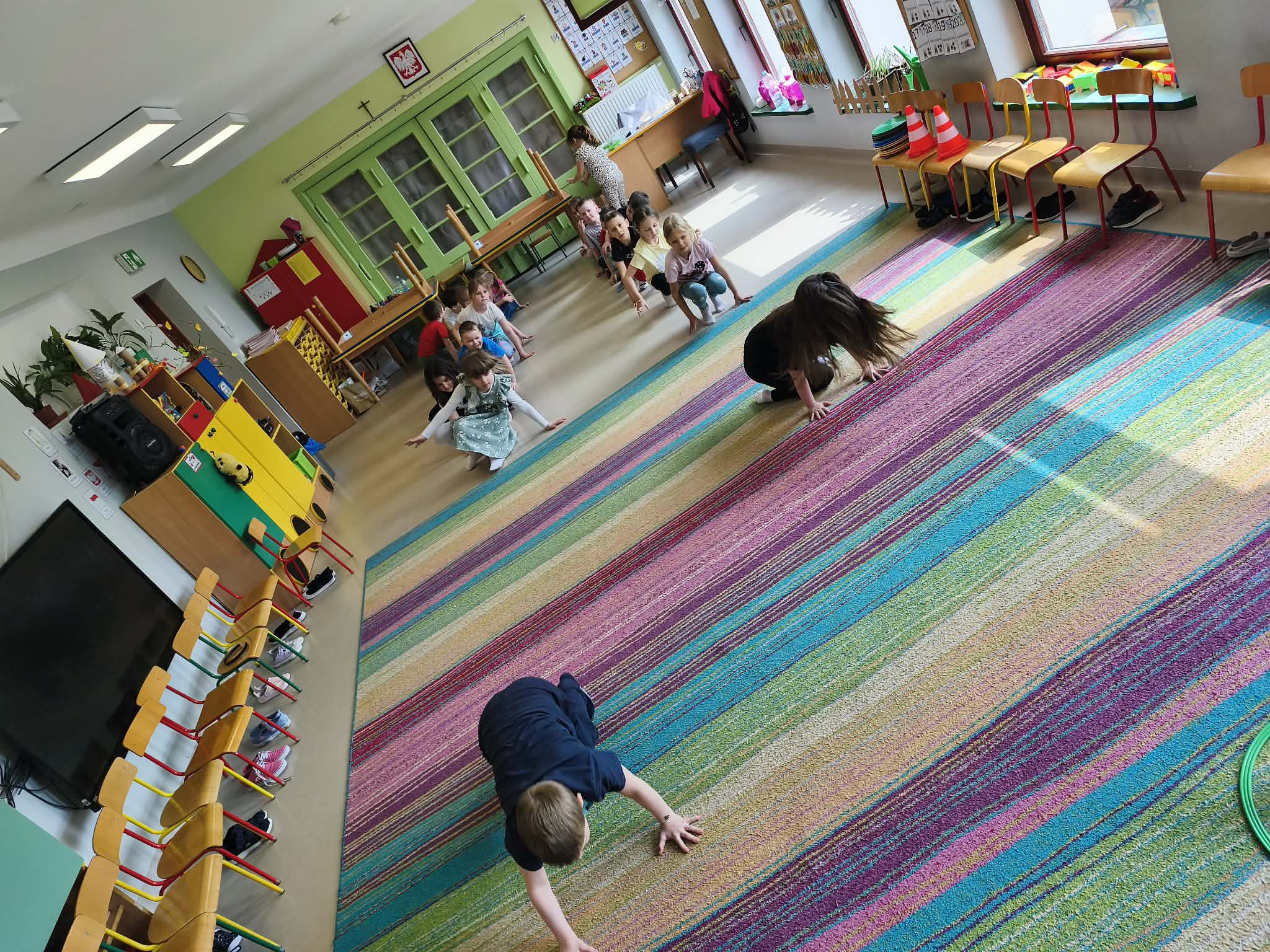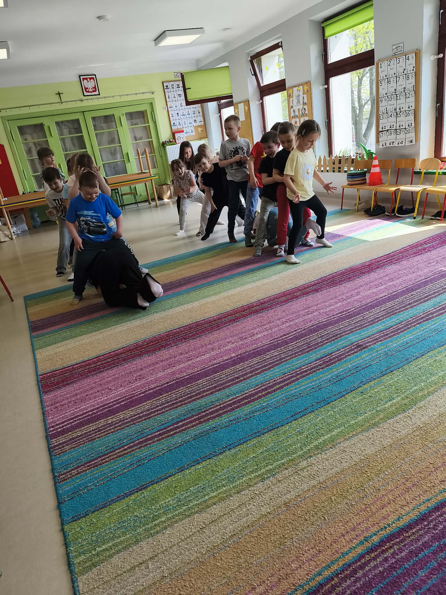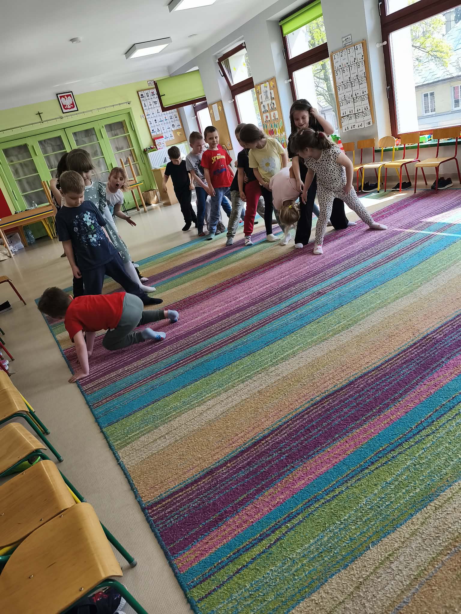 Tego dnia, po rozgrzewce w formie zumby, dzieci podzielone na dwa zespoły przystąpiły do wiosennych zawodów sportowych. Zaproponowane konkurencje powiązane były tematycznie z aktualną porą roku, a ich głównym celem było zachęcenie do aktywności ruchowej, kształtowanie umiejętności współpracy w zespole, rozwijanie umiejętności słuchania poleceń oraz ćwiczenie uwagi i koncentracji. Dzieci wykazały się szybkością, sprawnością, skocznością a także umiejętnością rywalizacji w duchu fair-play. Obydwie drużyny zremisowały, ćwiczenia wykonały rzetelnie, zwracając uwagę na dokładność i precyzję. Realizując zajęcia w takiej formie, zwracamy uwagę nie na wynik, lecz przede wszystkim na dobrą zabawę i rywalizujemy ze sobą w atmoferze pełnej radości i śmiechu, przy okazji stawiamy na utrwalenie nawyku sięgania po wodę. Korzystaliśmy z różnych przyborów gimnastycznych, tj. szarfy, hula-hop, pachołki, dyski gimnastyczne czy koce. Po zajęciach przyszedł czas na wyciszenie, podczas którego słuchaliśmy muzyki relaksacyjnej w dowolnej pozycji na dywanie, a chwilkę później wybraliśmy się na przedszkolny plac zabaw, by tam pobawić się swobodnie na świeżym powietrzu. Warto podkreślić, iż "Pszczółki" samodzielnie przygotowały salę do wiosennych zawodów, a następnie po ich zakończeniu posprzątały ją.