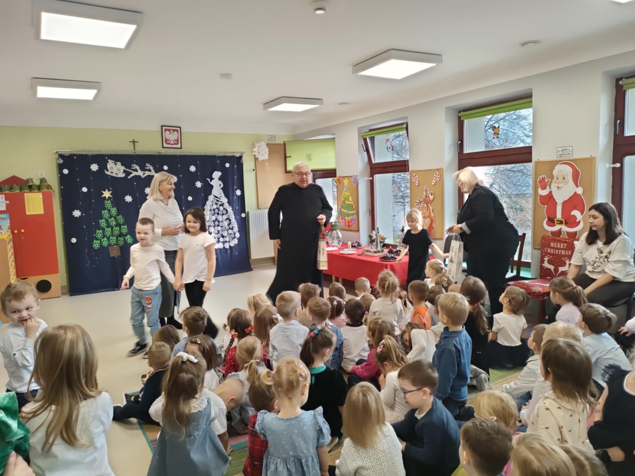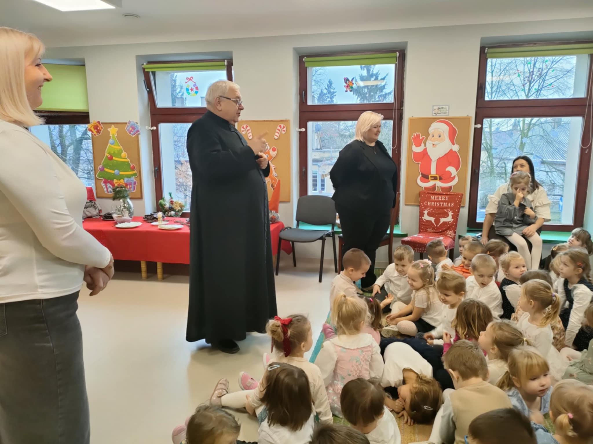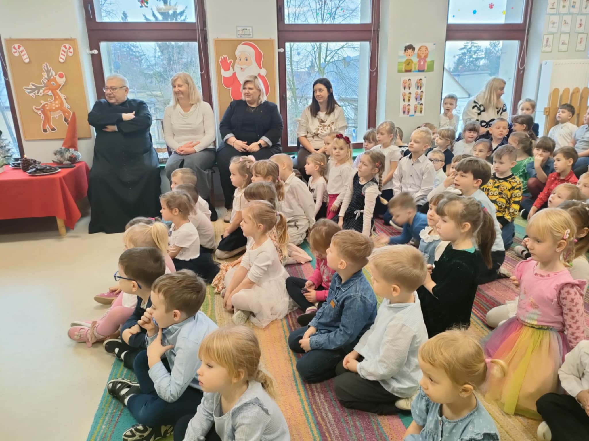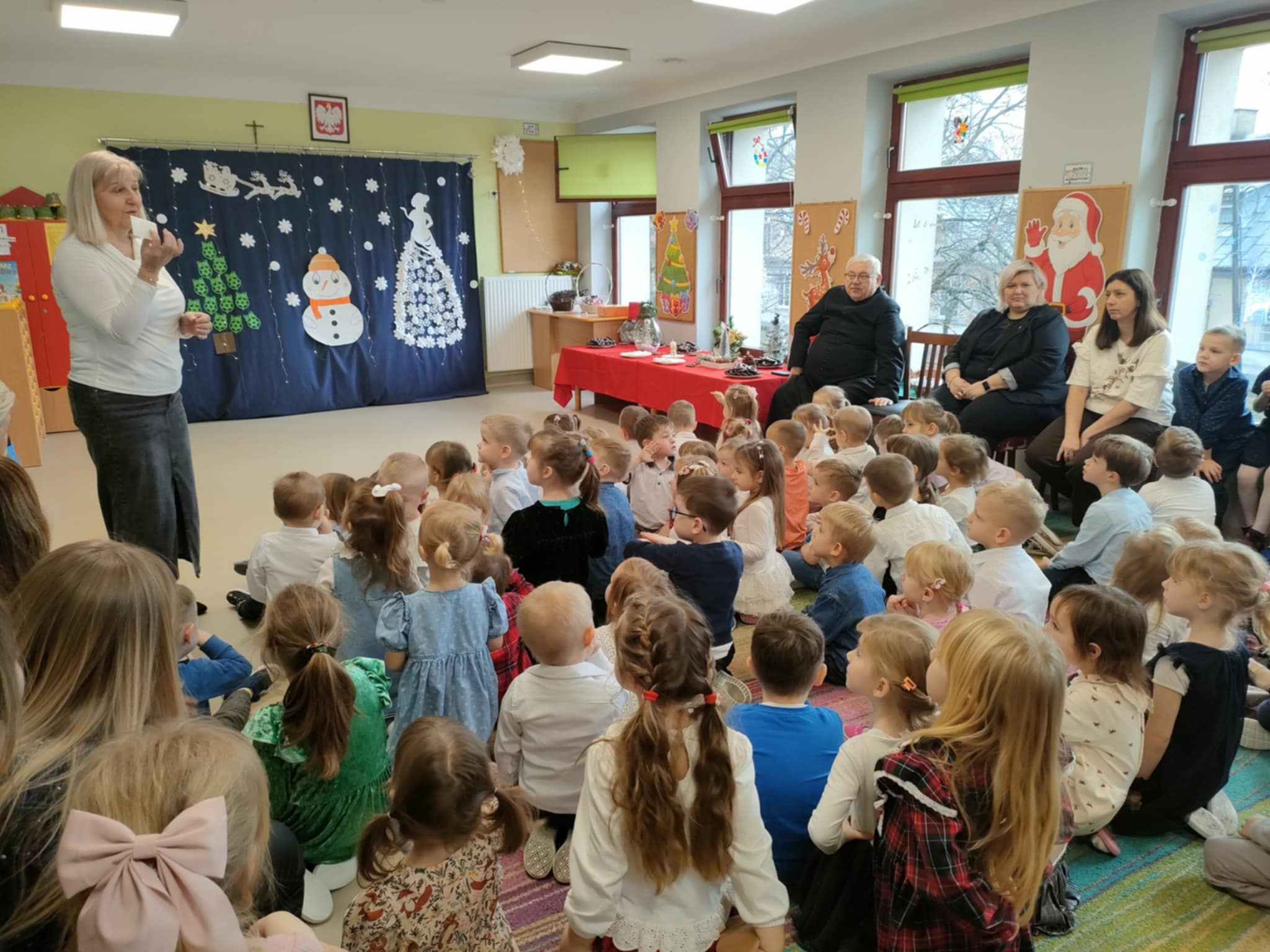Spotkanie wigilijne z Księdzem to tradycja w naszym przedszkolu. Proboszcz przypomniał nam o prawdziwej istocie Świąt Bożego Narodzenia, a dzieci miały okazję wysłuchać Słowa Bożego i poznać najważniejsze tradycje związane z tymi świętami. Wszystkie grupy wiekowe zaprezentowały również przygotowane wcześniej, urocze piosenki o tematyce zimowej/świątecznej. Takie spotkania tworzą atmosferę jedności i są okazją do refleksji przed Bożym Narodzeniem. Na zakończenie wysłuchaliśmy życzeń od Księdza, p. Katechetki oraz p. Dyrektor, a wybrane przedszkolaki wręczyły naszym Gościom podziękowania. Po spotkaniu dzieci powróciły do swoich klas, w których symbolicznie dzieliły się opłatkiem, składając sobie życzenia i otrzymały słodki poczęstunek. Niech ten czas przygotowań świątecznych sprawi, że zatrzymamy się na chwilę i poczujemy prawdziwą magię świąt.