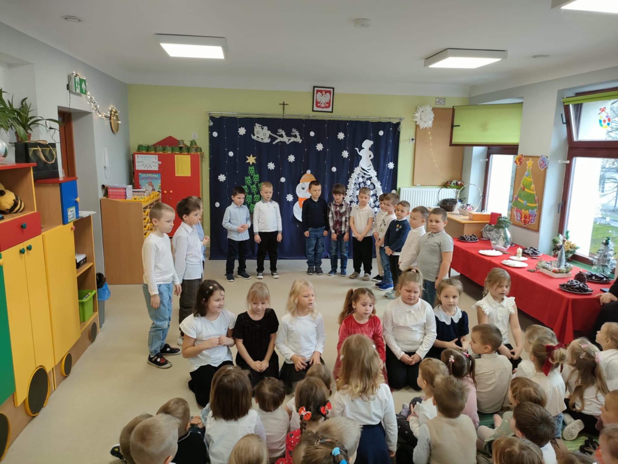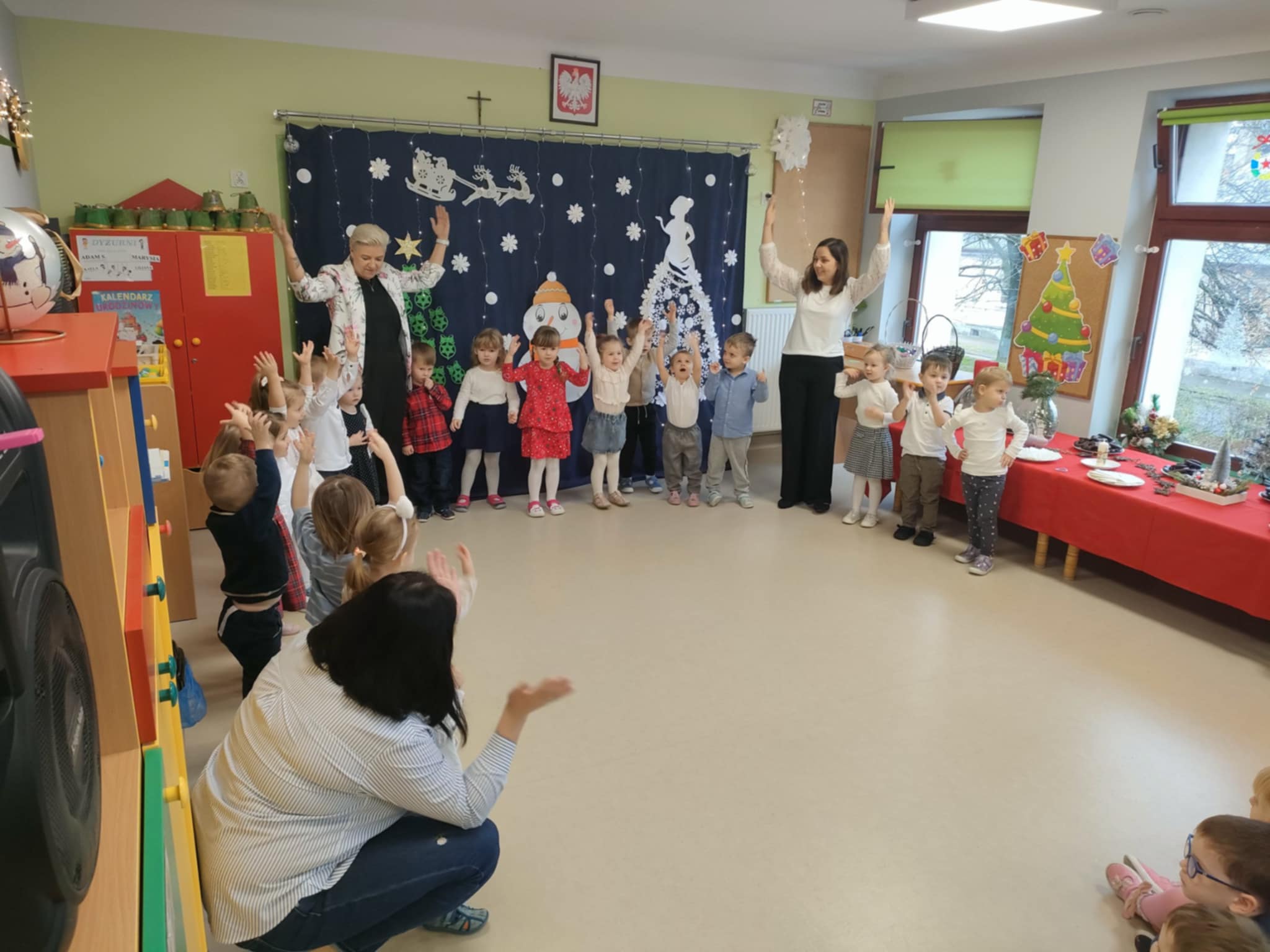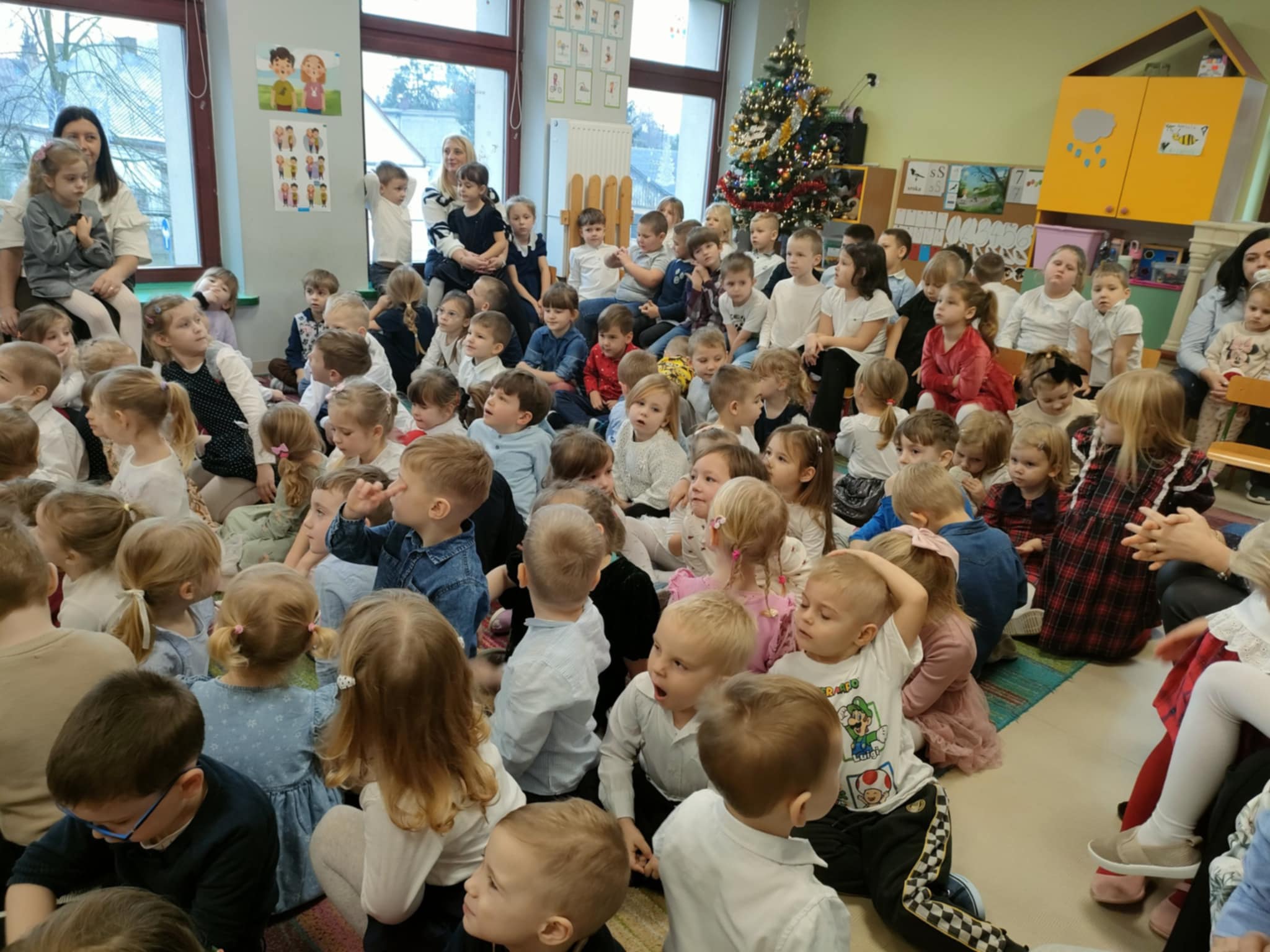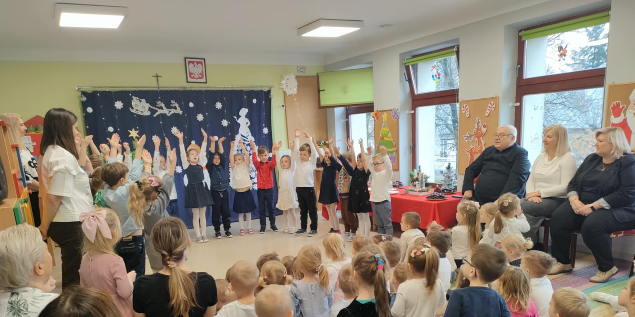 Spotkanie wigilijne z Księdzem to tradycja w naszym przedszkolu. Proboszcz przypomniał nam o prawdziwej istocie Świąt Bożego Narodzenia, a dzieci miały okazję wysłuchać Słowa Bożego i poznać najważniejsze tradycje związane z tymi świętami. Wszystkie grupy wiekowe zaprezentowały również przygotowane wcześniej, urocze piosenki o tematyce zimowej/świątecznej. Takie spotkania tworzą atmosferę jedności i są okazją do refleksji przed Bożym Narodzeniem. Na zakończenie wysłuchaliśmy życzeń od Księdza, p. Katechetki oraz p. Dyrektor, a wybrane przedszkolaki wręczyły naszym Gościom podziękowania. Po spotkaniu dzieci powróciły do swoich klas, w których symbolicznie dzieliły się opłatkiem, składając sobie życzenia i otrzymały słodki poczęstunek. Niech ten czas przygotowań świątecznych sprawi, że zatrzymamy się na chwilę i poczujemy prawdziwą magię świąt.