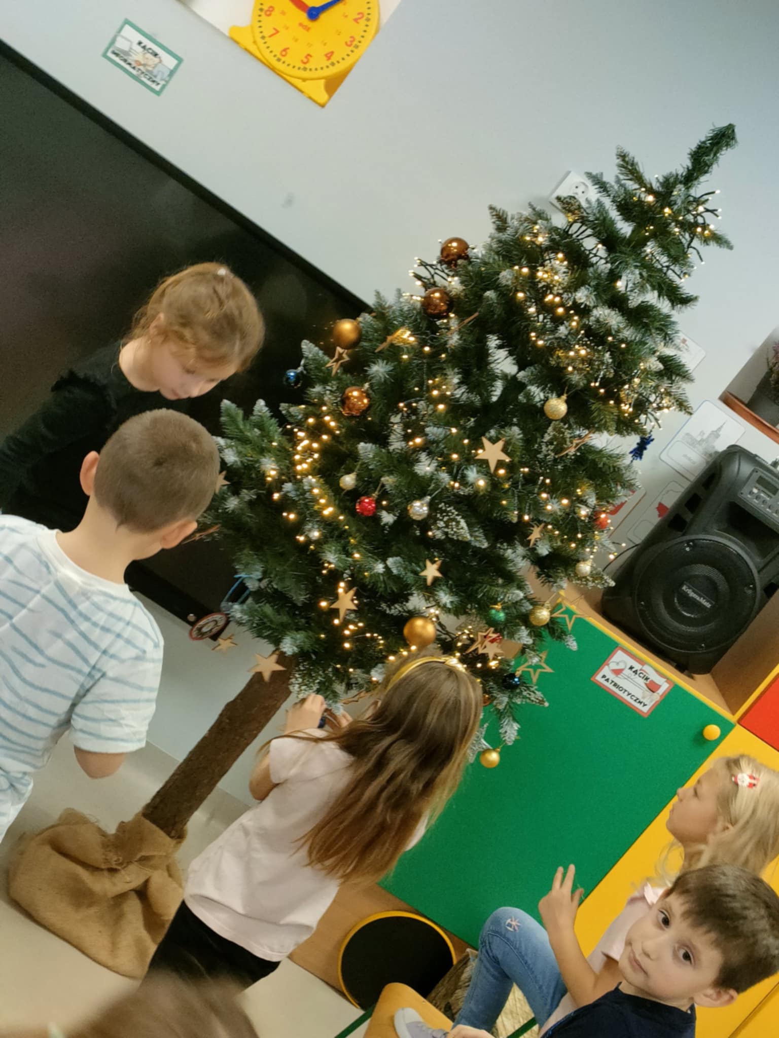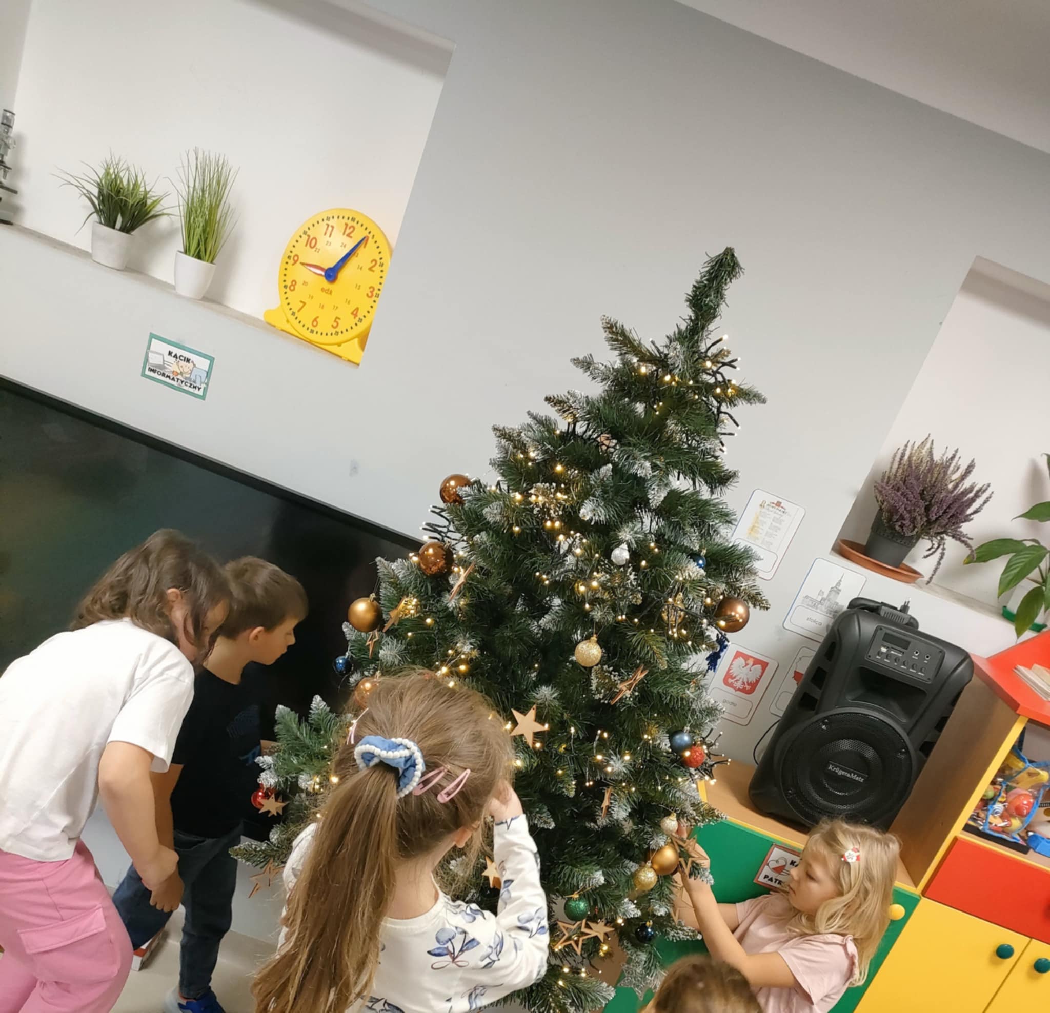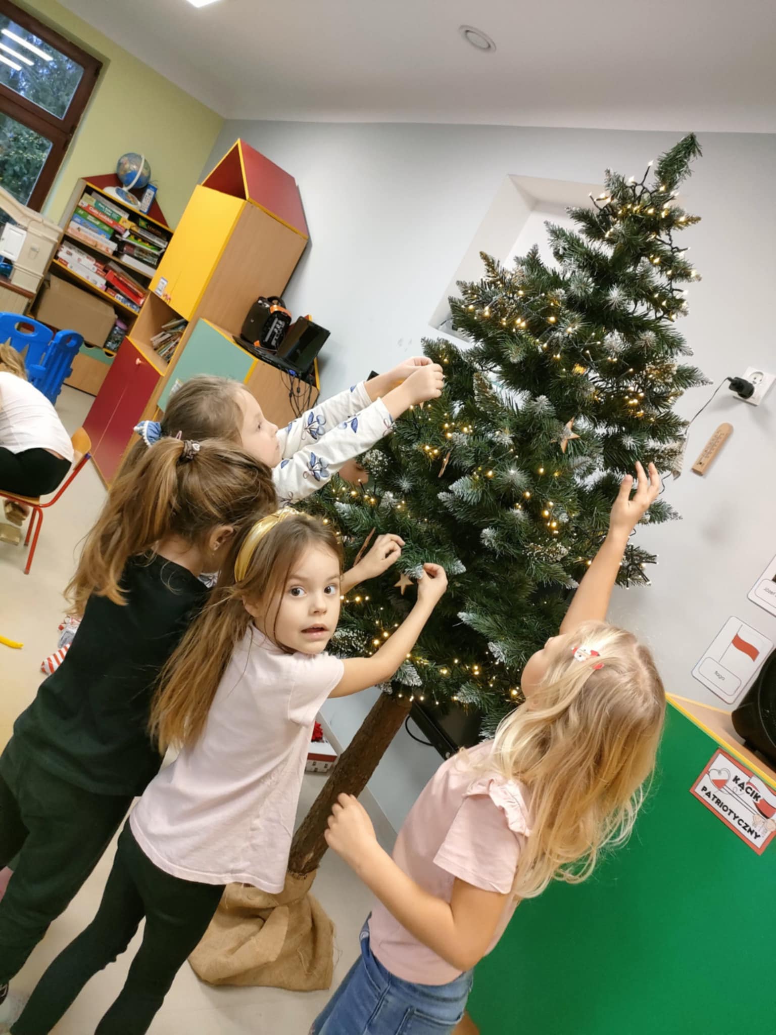 Jedną z ulubionych przez dzieci aktywności przedświątecznych jest ubieranie choinki. Jest to tradycja, w którą przedszkolaki bardzo chętnie się włączają. Tym razem, w naszej klasie zagościła choinka na pniu, którą rozłożyła nauczycielka, a dzieci pięknie i samodzielnie ją przystroiły. Wygląda cudnie, dodała świątecznego uroku naszej sali, a przy okazji umieściliśmy pod nią "prezenciki", które dzieci przygotowały wraz ze swoimi Rodzicami do układu tanecznego, podczas nadchodzącej Uroczystości Choinkowej. Zachęcamy wszystkich Rodziców do tego, by włączali dzieci do świątecznych przygotowań, choć pewnie zajmie to więcej czasu, ale nic nie zastąpi wspólnych chwil i poczucia sprawczości u najmłodszych.
