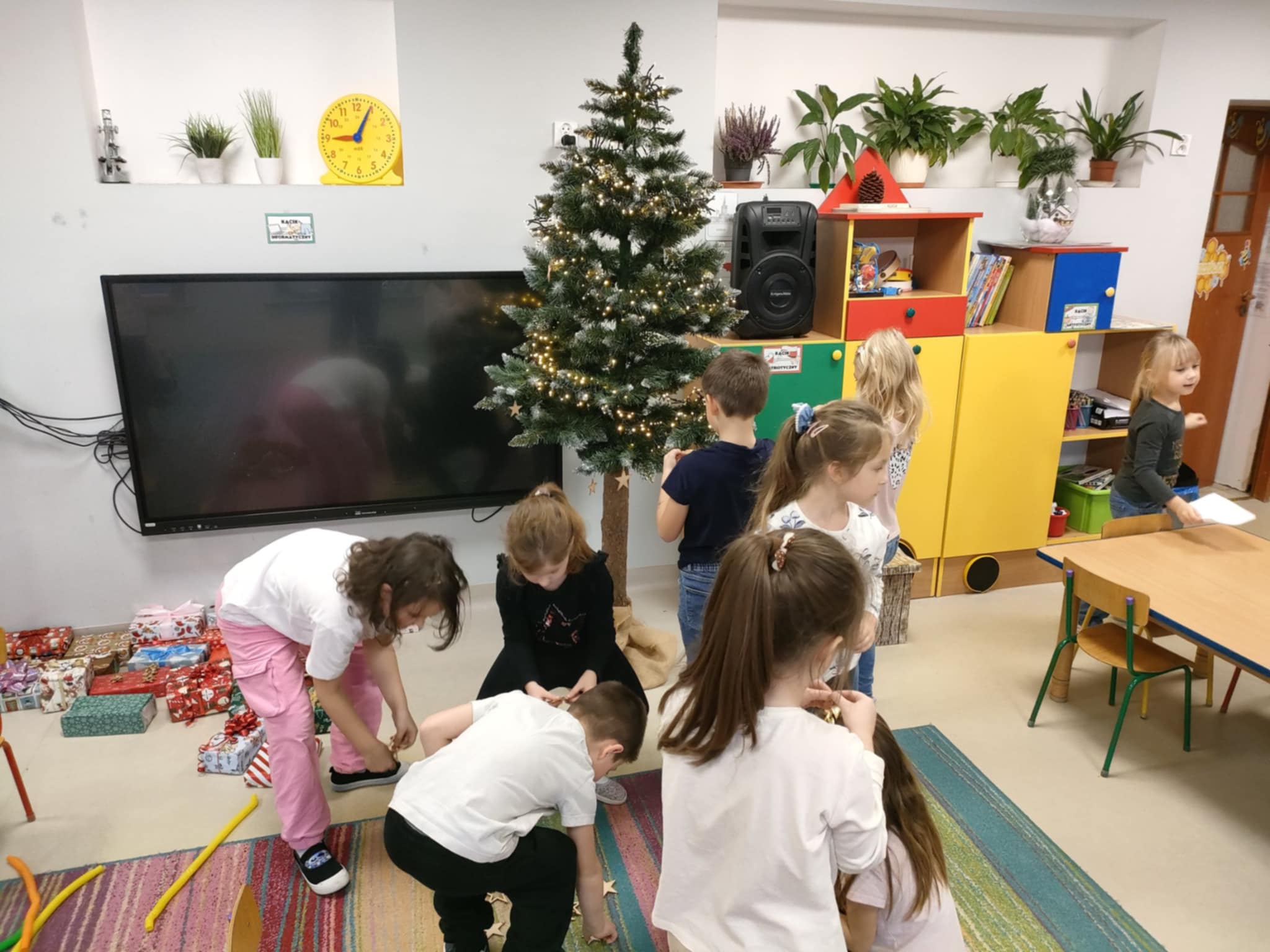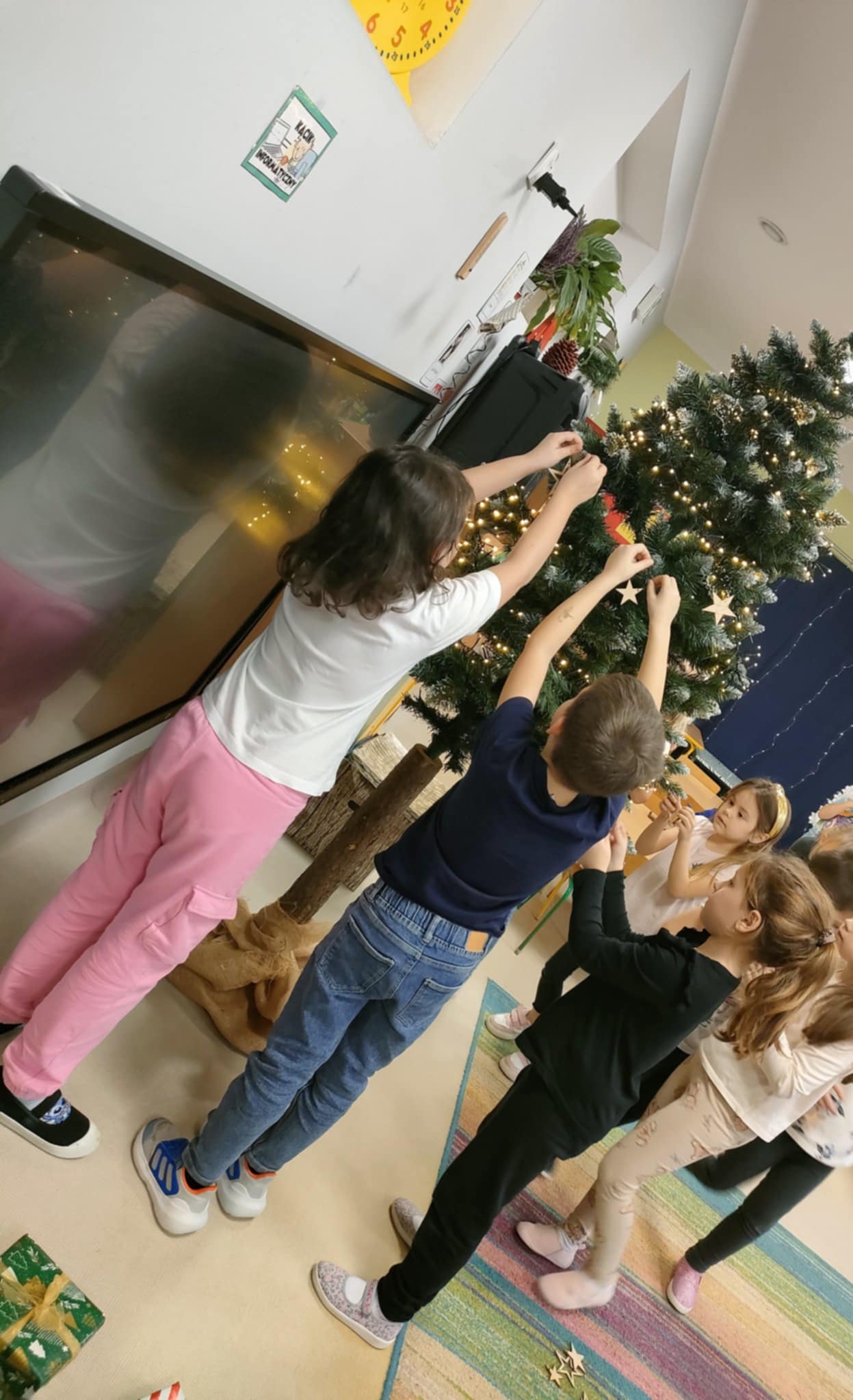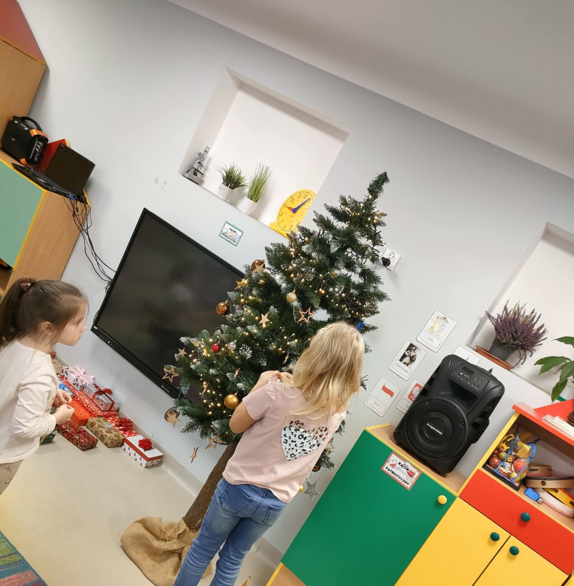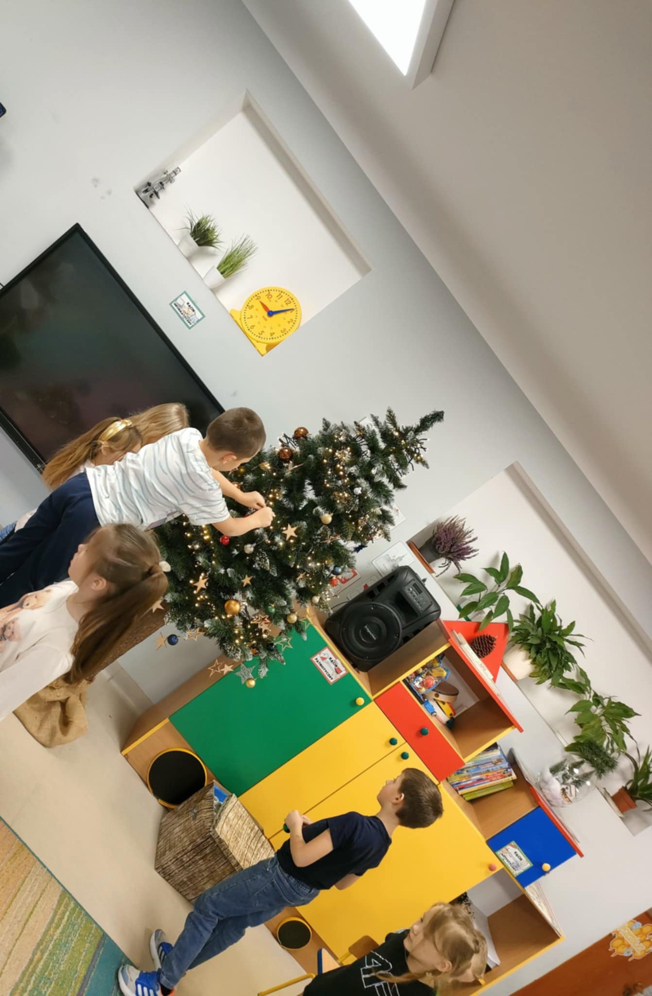 Jedną z ulubionych przez dzieci aktywności przedświątecznych jest ubieranie choinki. Jest to tradycja, w którą przedszkolaki bardzo chętnie się włączają. Tym razem, w naszej klasie zagościła choinka na pniu, którą rozłożyła nauczycielka, a dzieci pięknie i samodzielnie ją przystroiły. Wygląda cudnie, dodała świątecznego uroku naszej sali, a przy okazji umieściliśmy pod nią "prezenciki", które dzieci przygotowały wraz ze swoimi Rodzicami do układu tanecznego, podczas nadchodzącej Uroczystości Choinkowej. Zachęcamy wszystkich Rodziców do tego, by włączali dzieci do świątecznych przygotowań, choć pewnie zajmie to więcej czasu, ale nic nie zastąpi wspólnych chwil i poczucia sprawczości u najmłodszych.