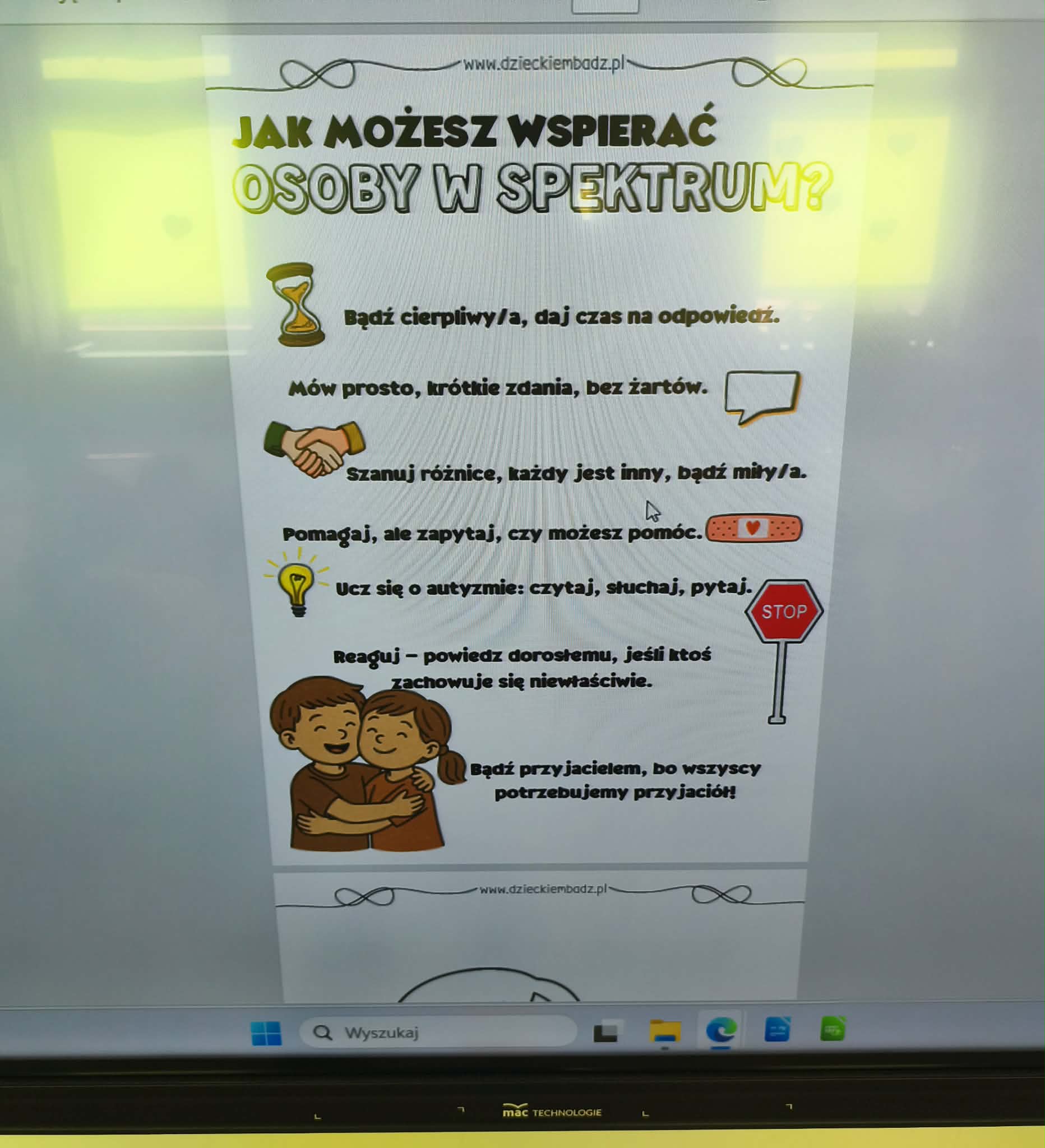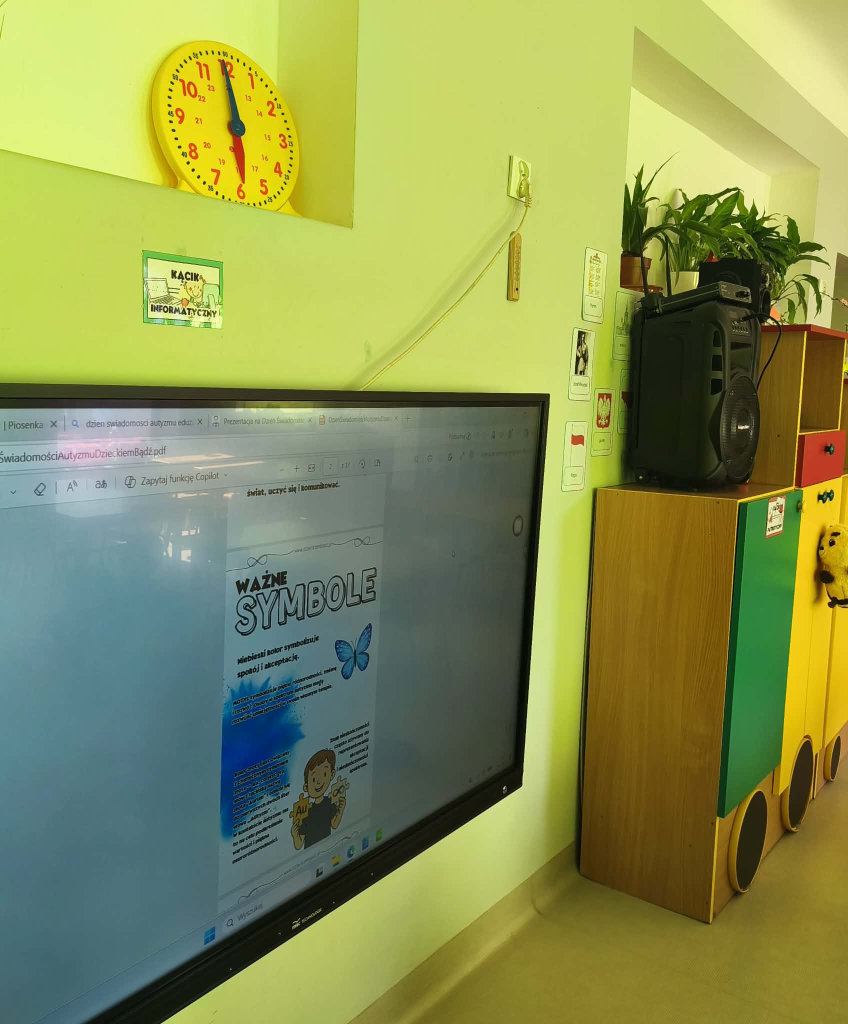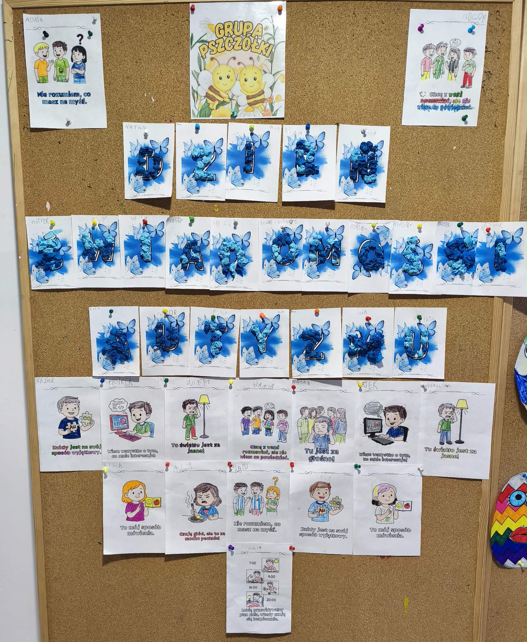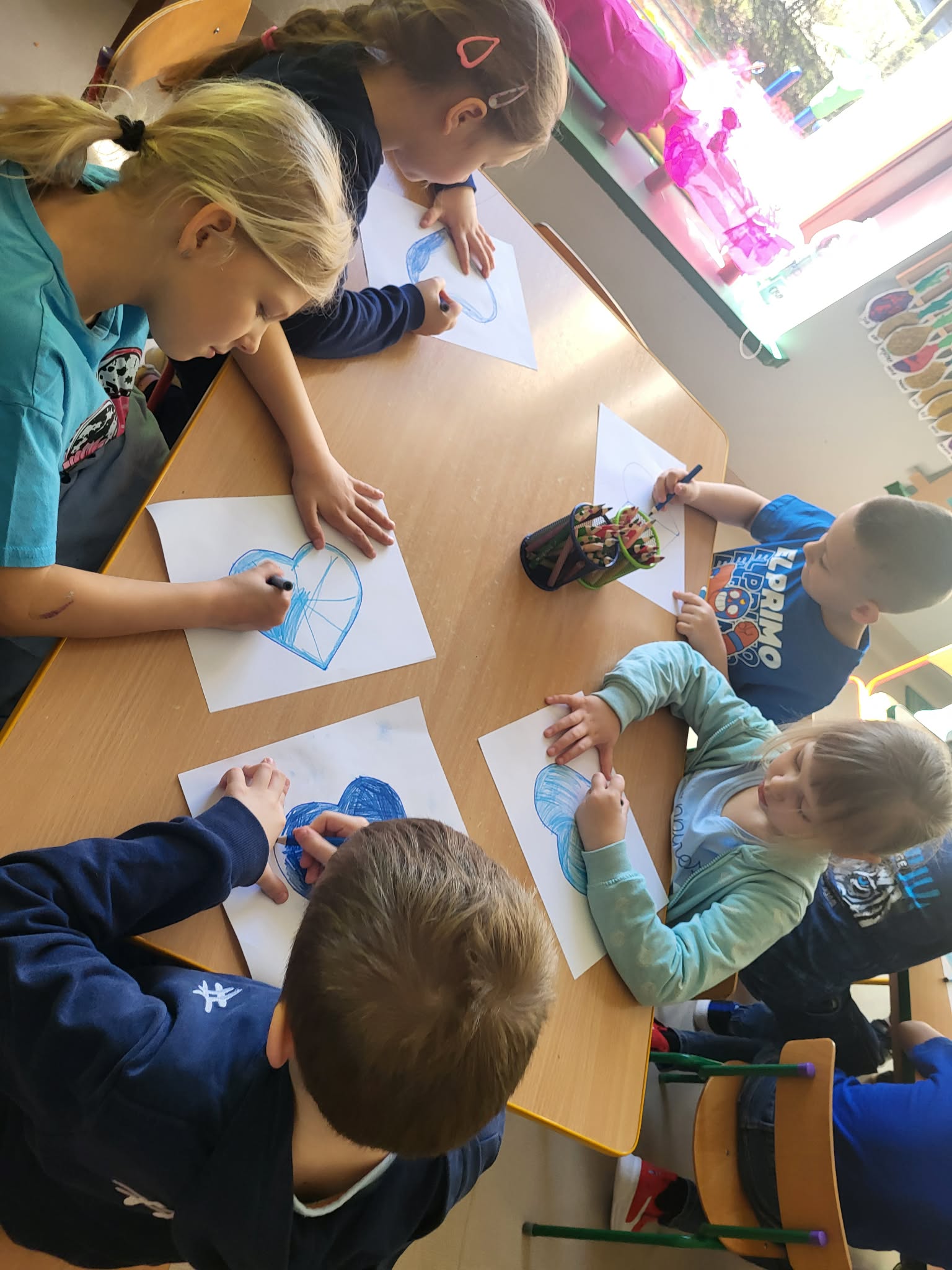 Najważniejszym celem tej, wyjątkowej inicjatywy było budowanie wrażliwości i zrozumienia już od najmłodszych lat. Tego dnia przedszkolaki za pomocą różnych, ciekawych aktywności(ruchowych, plastycznych czy słuchowych) dowiedziały się, czym jest autyzm. Poznały również ważne symbole, tj. niebieski kolor symbolizujący spokój i akceptację, złoty kolor podkreślający wartość i piękno neuroróżnorodności, a także znak nieskończoności i motyla. Zrozumiały, że niektóre osoby z autyzmem mogą mieć trudności z mówieniem i rozumieniem mowy, a co za tym idzie mogą używać innych sposobów komunikacji(gesty, obrazki), ale najważniejszym jest to, by w kontakcie z taką osobą być cierpliwym i otwartym na różne formy komunikacji. Dowiedziały się także, że osoby z autyzmem mogą mieć różne potrzeby sensoryczne - niektóre mogą być wrażliwe na głośne dźwięki/jasne światło/dotyk, a inne z kolei mogą potrzebować więcej czasu na zrozumienie i przetworzenie danej informacji. Przedszkolaki zrozumiały, że można, a nawet trzeba wspierać te osoby i być po prostu przyjacielem, bo wszyscy potrzebujemy przyjaciół, aby rozwijać swoje skrzydła. A to wszystko w ramach przeprowadzonych, angażujących zajęć, które specjalnie na tę okazję przygotowały nauczycielki, podczas których nie zabrakło niebieskich akcentów na ubrankach dzieci oraz balonów w tej kolorystyce. Warto również podkreślić fakt, że podczas zajęć kształtowaliśmy empatię i postawę akceptacji, oswajaliśmy podopiecznych z neuroróżnorodnością, rozwijaliśmy umiejętności społeczne, wprowadziliśmy elementarną wiedzę o autyzmie, a także budowaliśmy postawę włączającą. Dodatkowo na holu przyczepione zostały materiały edukacyjne w wersji papierowej dla zainteresowanych dzieci oraz Rodziców.