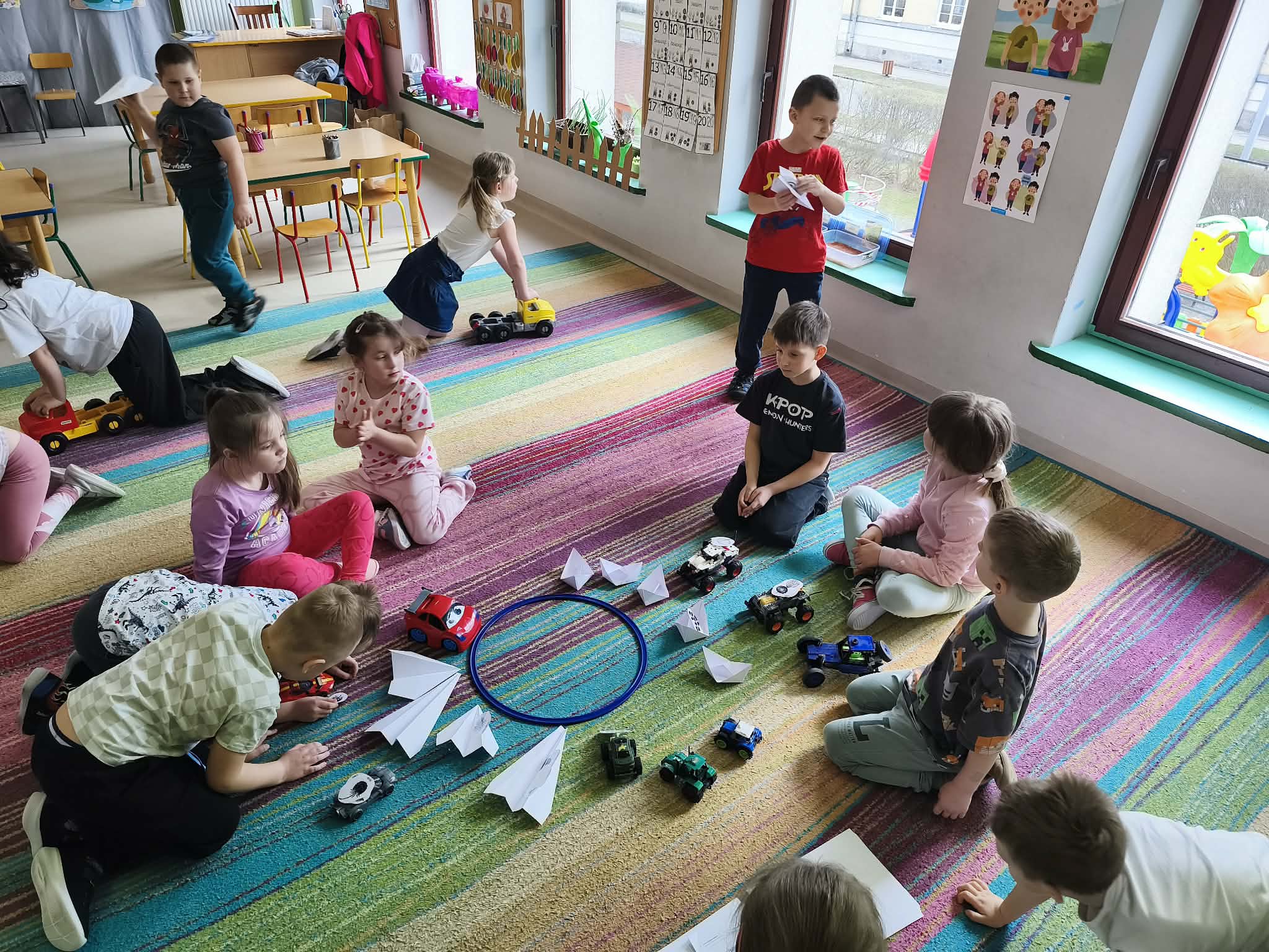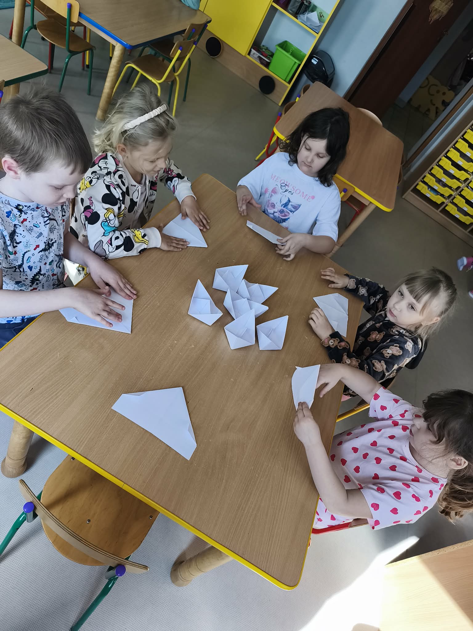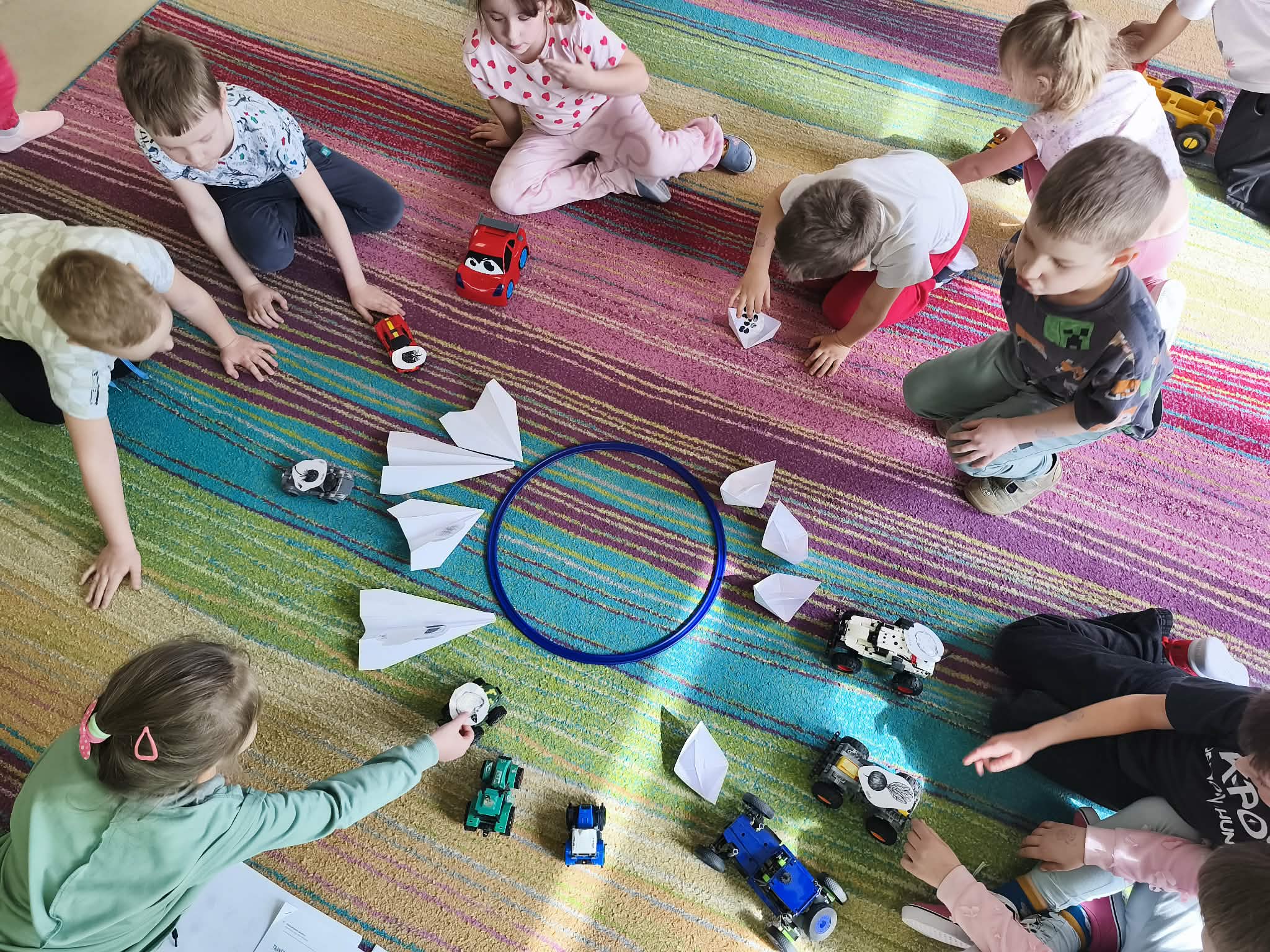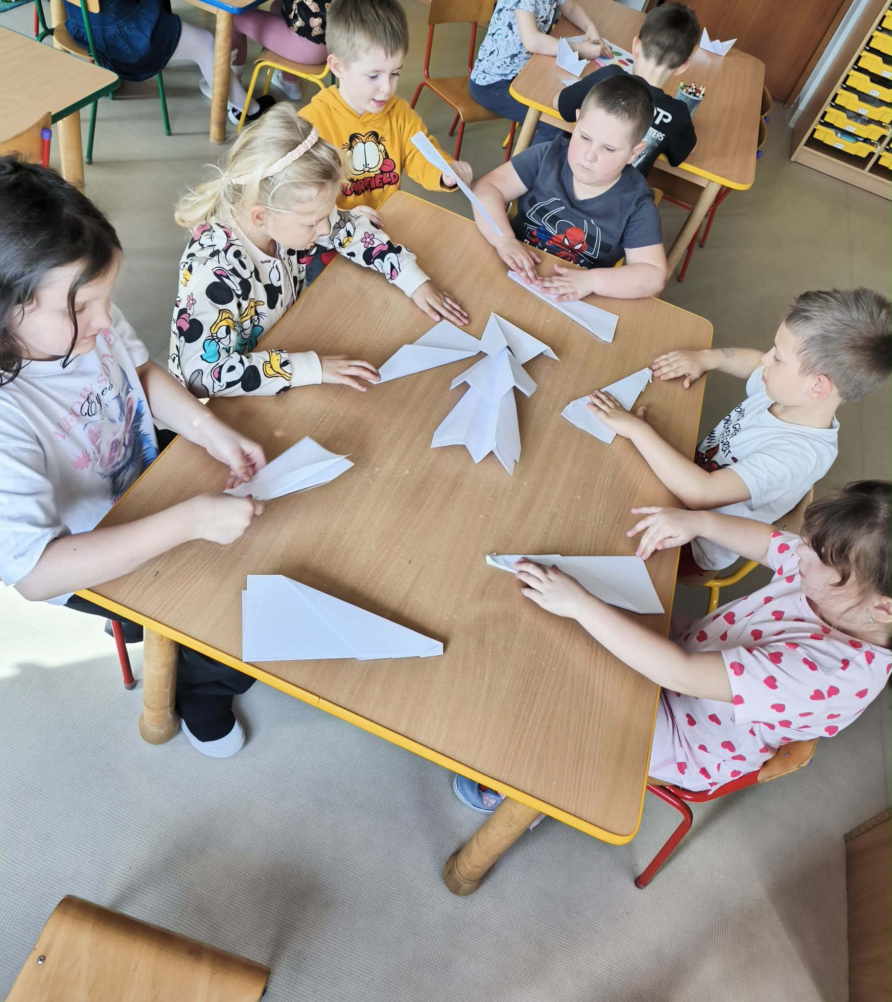 Przed spotkaniem, nauczycielka rozłożyła na dywanie różnorodne, zabawkowe pojazdy oraz papierowe statki i łódki, natomiast w całej sali ukryte zostały obrazki z różnymi produktami(lokalnymi i egzotycznymi). Na początku zajęć, dzieci odpowiadały na pytanie "W jaki sposób produkty z odległych miejsc trafiają na nasz talerz?". W tym momencie przypomnieliśmy sobie różne środki transportu, po czym przystąpiliśmy do zabawy ruchowej, podczas której "Pszczółki" korzystając z pojazdów przywiozły wszystkie produkty na środek kręgu. W następnym etapie wspólnymi siłami udało nam się posegregować te produkty na: krajowe i zagraniczne. Przy okazji rozmawialiśmy też o własnych uprawach i ich znaczeniu dla nas oraz dla naszej planety. Na zakończenie wykonaliśmy pracę techniczno-plastyczną, aby utrwalić zdobyte wiadomości. Podczas tych zajęć dowiedzieliśmy się, że uprawiając własne warzywa i owoce możemy cieszyć się świeżymi produktami, które znajdują się na wyciągnięcie ręki oraz skracamy drogę ich transportu, mając jednocześnie wpływ na sposób ich uprawy stosując rozwiązania przyjazne środowisku. Dodatkowo prace wykonywane w ogrodzie wpływają pozytywnie na nasze zdrowie i samopoczucie. Po zajęciach, chętne dzieci próbowały jeszcze swoich sił w tworzeniu własnych łódek i samolotów techniką origami. Zachęcamy, by kontynuować tą zabawę również w środowisku domowym, ponieważ jest to doskonały spoób na ćwiczenie motoryki małej, cierpliwość, skupienie uwagi oraz kształtowanie precyzji drobnych ruchów rąk.