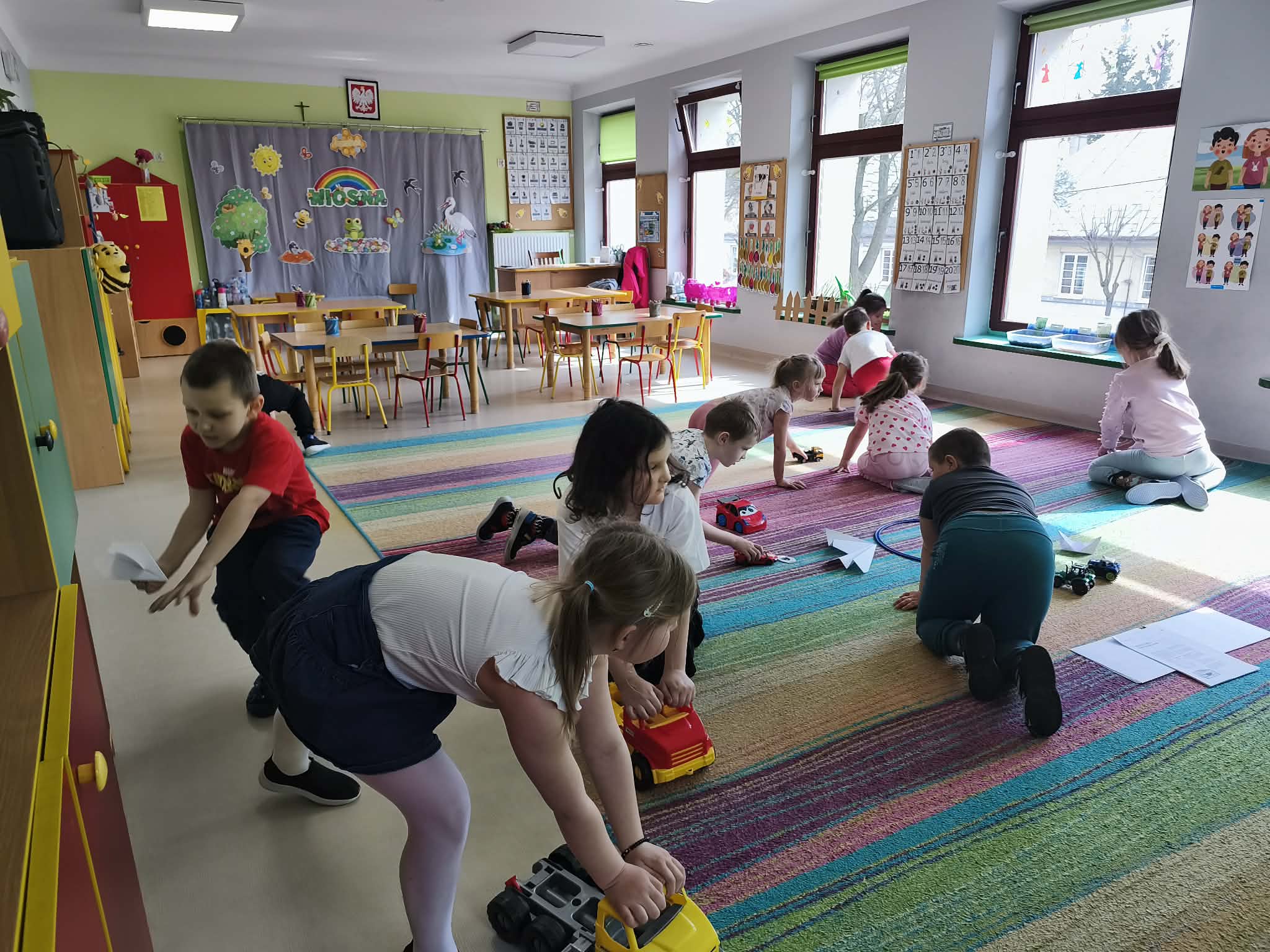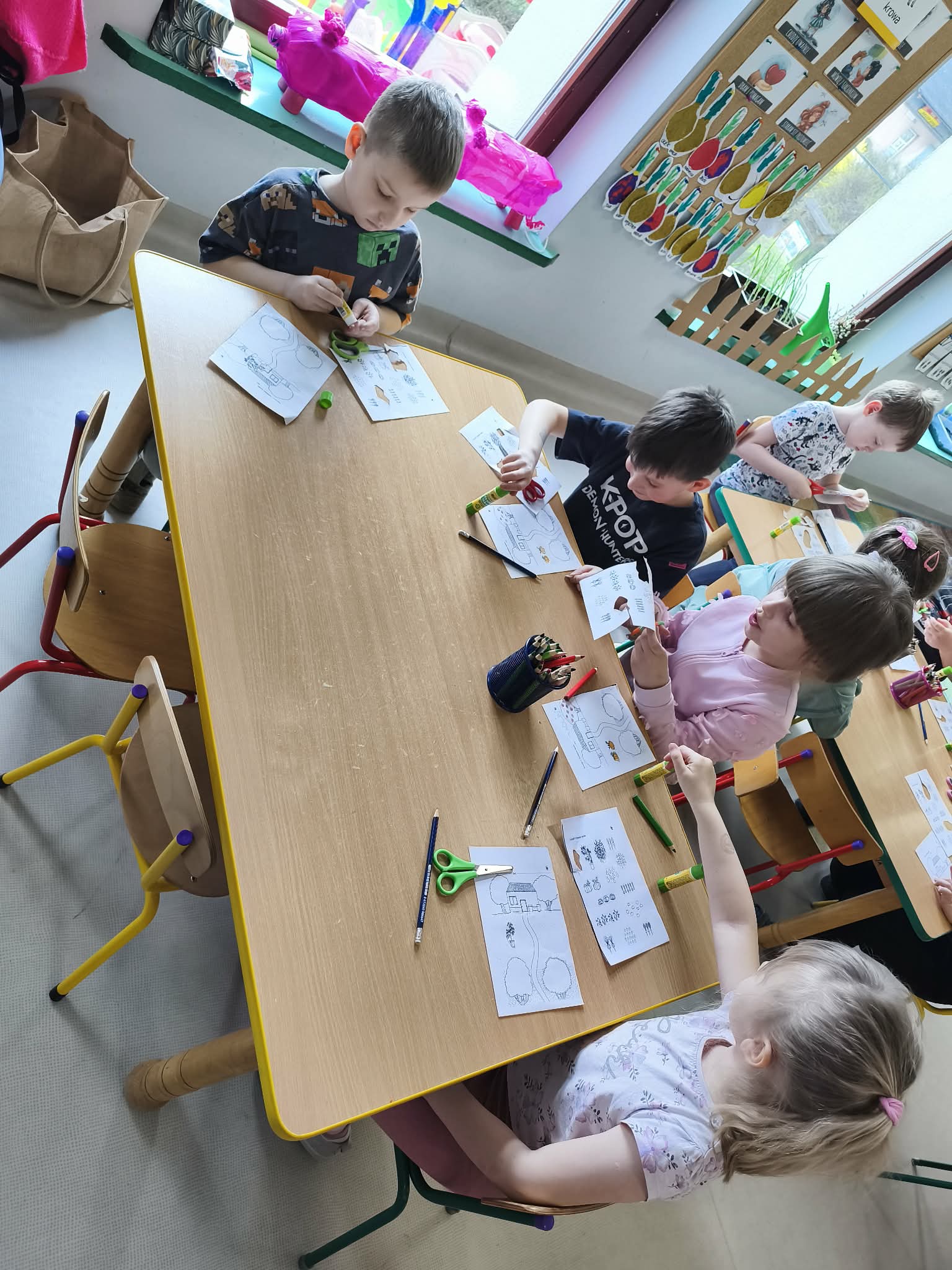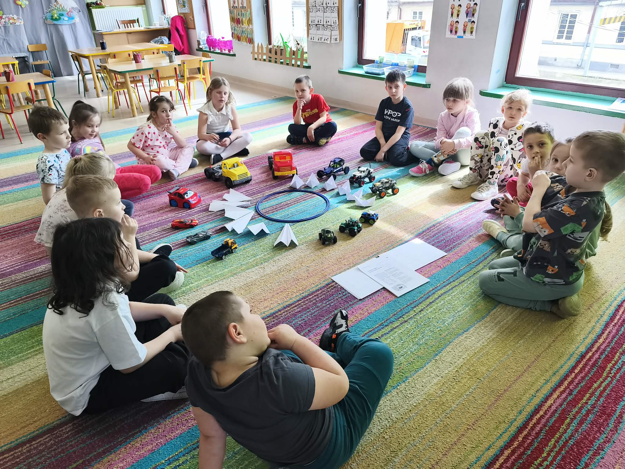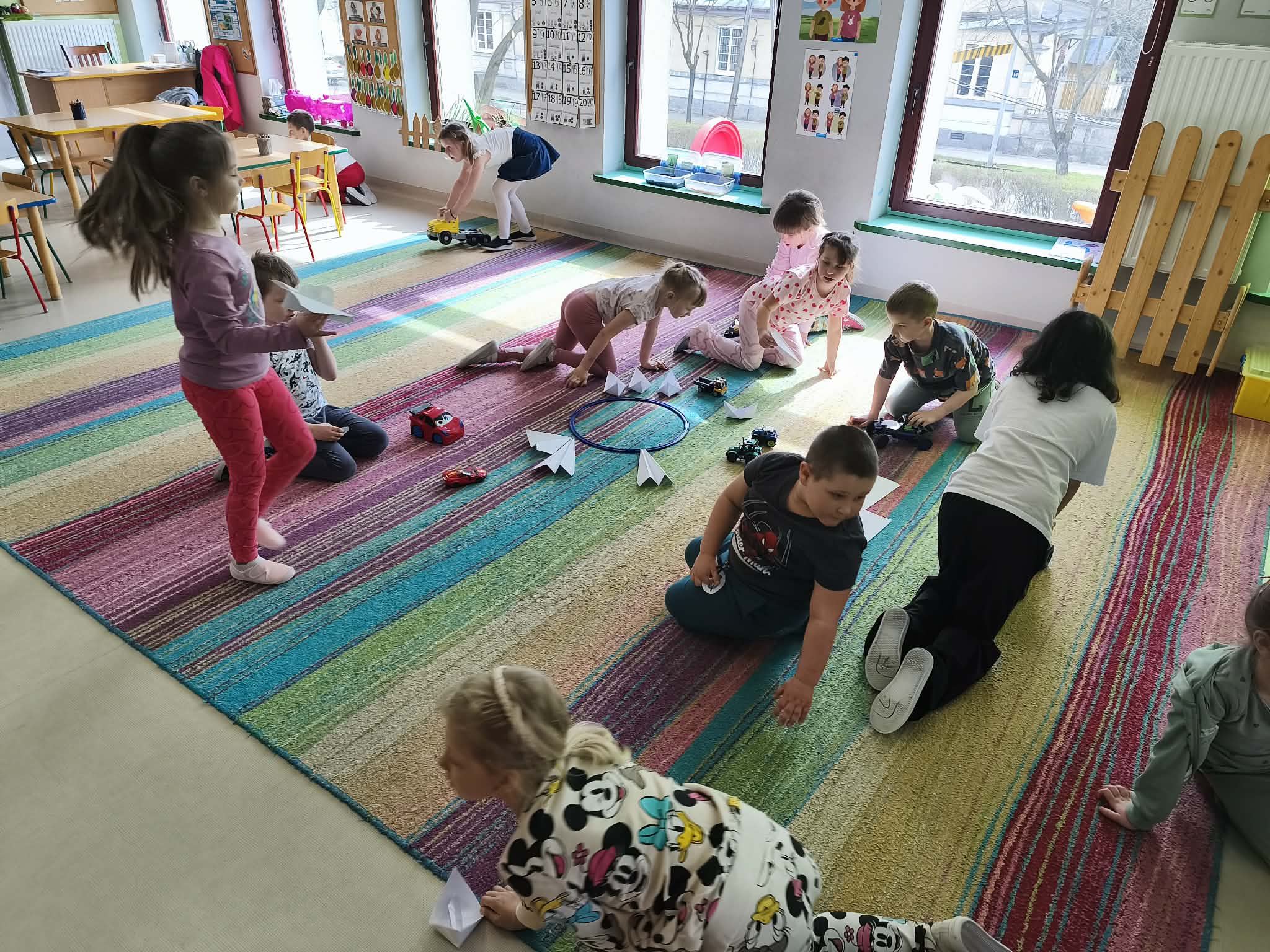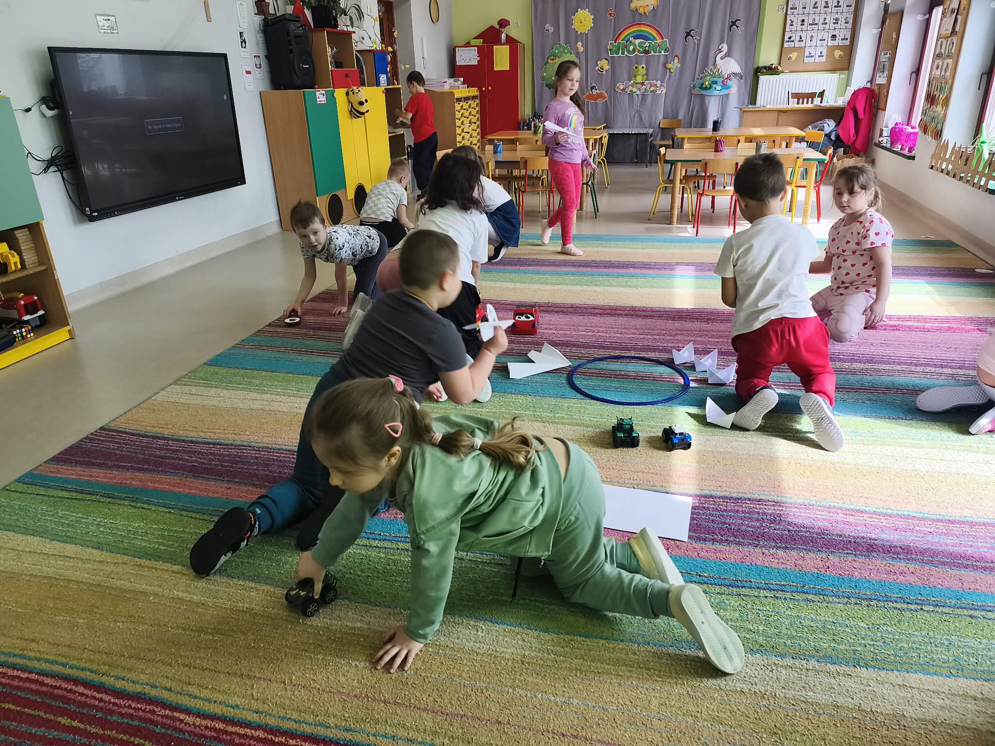 Przed spotkaniem, nauczycielka rozłożyła na dywanie różnorodne, zabawkowe pojazdy oraz papierowe statki i łódki, natomiast w całej sali ukryte zostały obrazki z różnymi produktami(lokalnymi i egzotycznymi). Na początku zajęć, dzieci odpowiadały na pytanie "W jaki sposób produkty z odległych miejsc trafiają na nasz talerz?". W tym momencie przypomnieliśmy sobie różne środki transportu, po czym przystąpiliśmy do zabawy ruchowej, podczas której "Pszczółki" korzystając z pojazdów przywiozły wszystkie produkty na środek kręgu. W następnym etapie wspólnymi siłami udało nam się posegregować te produkty na: krajowe i zagraniczne. Przy okazji rozmawialiśmy też o własnych uprawach i ich znaczeniu dla nas oraz dla naszej planety. Na zakończenie wykonaliśmy pracę techniczno-plastyczną, aby utrwalić zdobyte wiadomości. Podczas tych zajęć dowiedzieliśmy się, że uprawiając własne warzywa i owoce możemy cieszyć się świeżymi produktami, które znajdują się na wyciągnięcie ręki oraz skracamy drogę ich transportu, mając jednocześnie wpływ na sposób ich uprawy stosując rozwiązania przyjazne środowisku. Dodatkowo prace wykonywane w ogrodzie wpływają pozytywnie na nasze zdrowie i samopoczucie. Po zajęciach, chętne dzieci próbowały jeszcze swoich sił w tworzeniu własnych łódek i samolotów techniką origami. Zachęcamy, by kontynuować tą zabawę również w środowisku domowym, ponieważ jest to doskonały spoób na ćwiczenie motoryki małej, cierpliwość, skupienie uwagi oraz kształtowanie precyzji drobnych ruchów rąk.