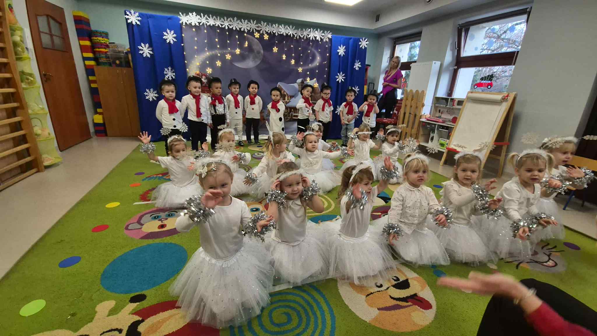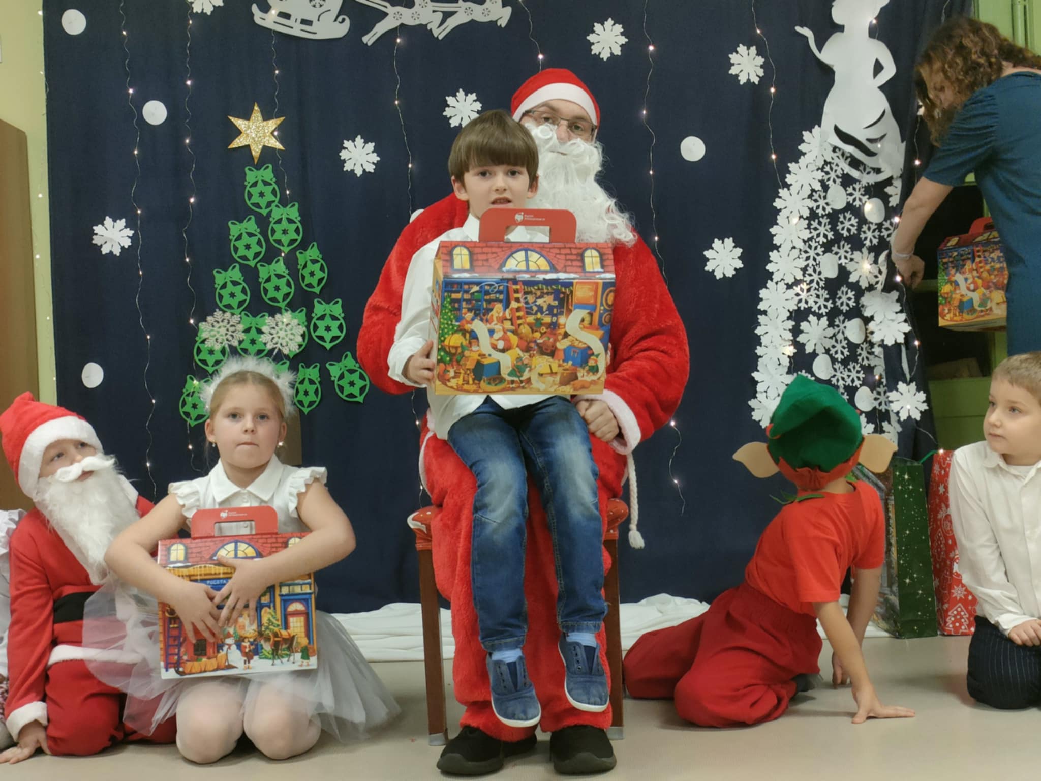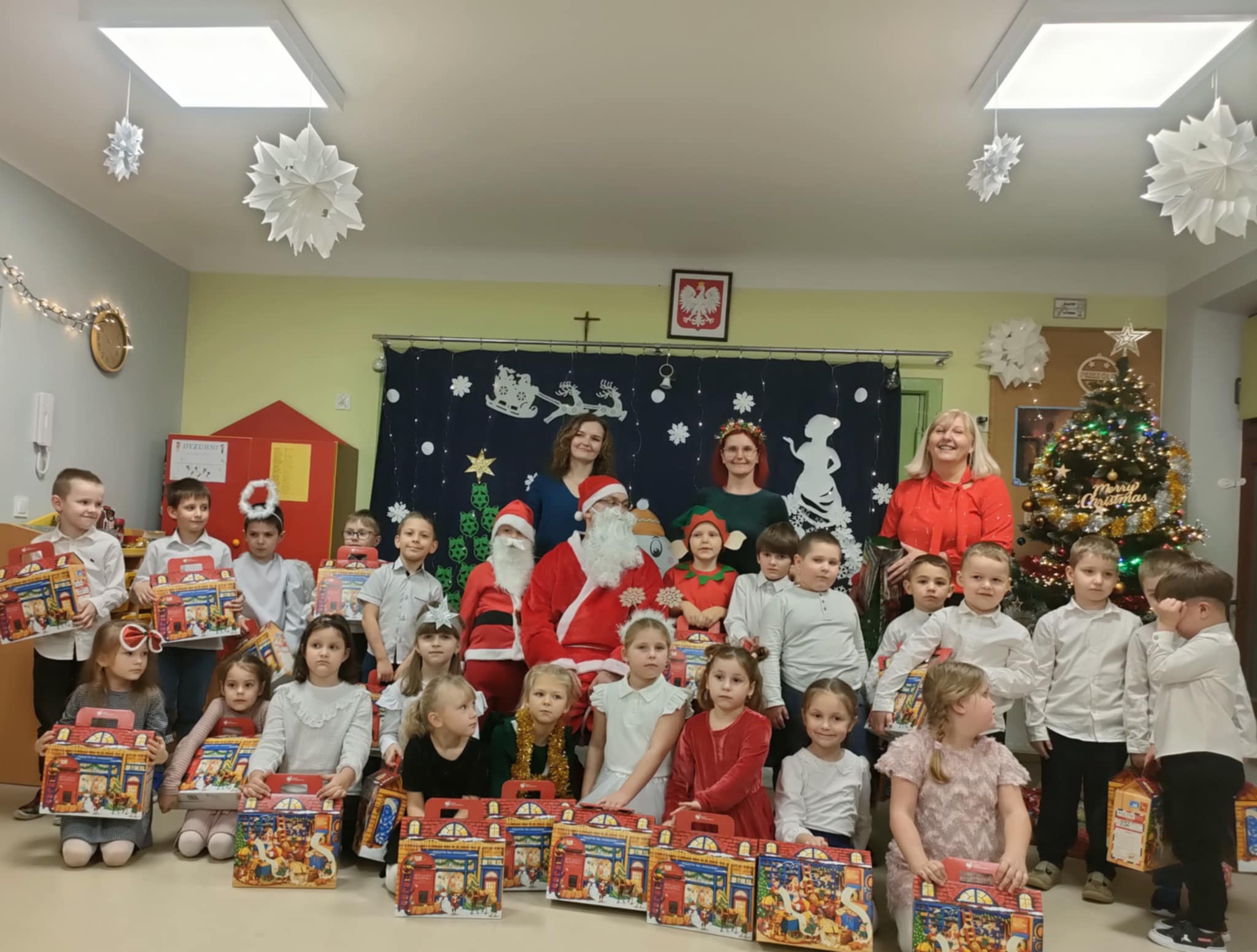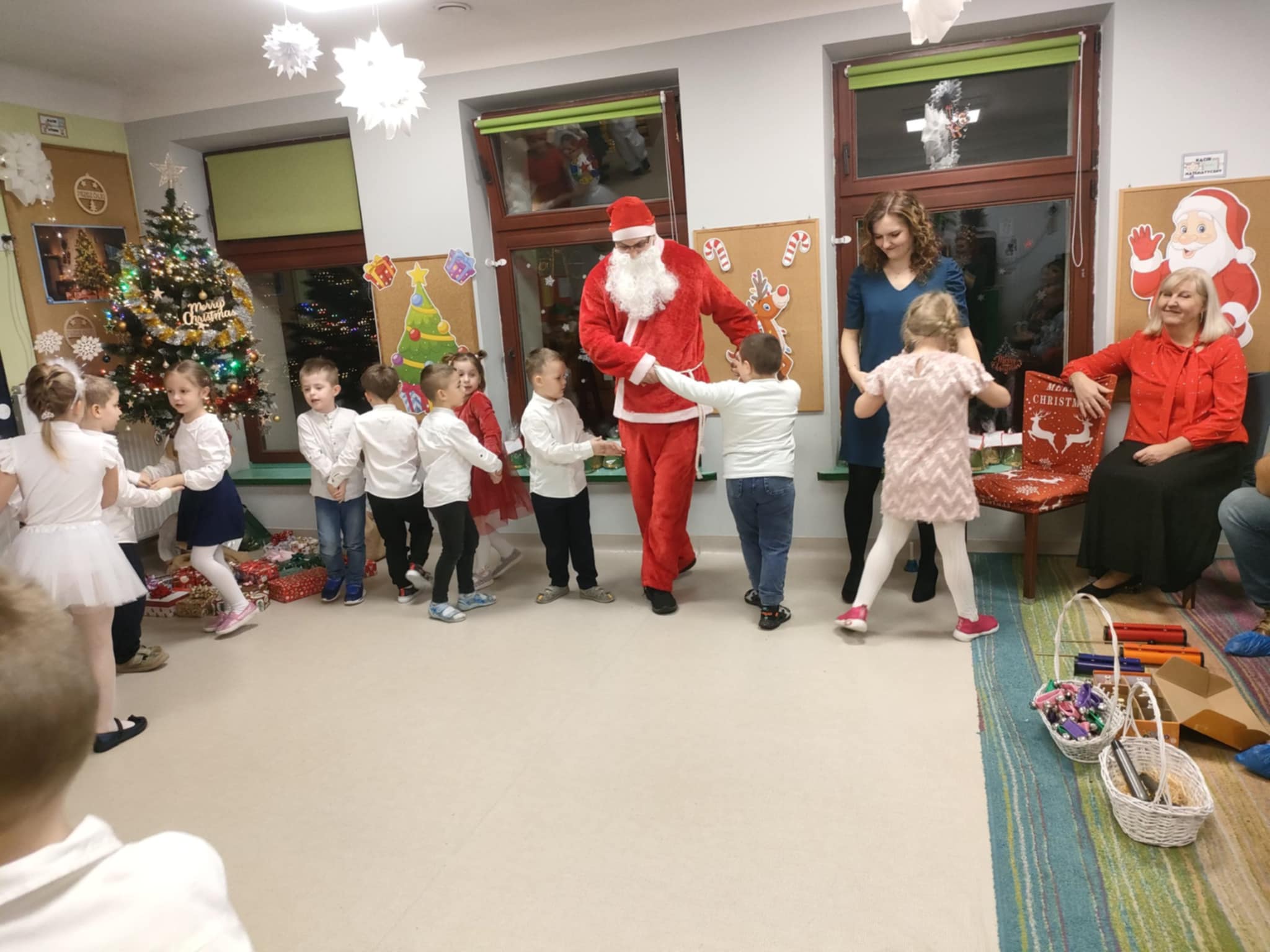 Najważniejszym celem takich wydarzeń jest integracja grupy i rodziny, nauka zwyczajów bożonarodzeniowych, kształtowanie zdolności artystycznych i twórczości dzieci, a także ukazanie atmosfery radości, wspólnoty i wzmocnienie więzi przez wspólne przeżywanie świąt. To wspaniała okazja do prezentacji umiejętności przedszkolaków, budowania ich pewności siebie i przekazywania wartości kulturowych i rodzinnych, podkreślając jednocześnie ogromną rolę tradycji, tj.: ozdabianie choinki, kolędowanie czy wręczanie prezentów. W tym tygodniu każda sala zamieniła się w cudowną, świąteczną krainę, a dzieci były wyjątkowo ubrane. Nie zabrakło recytacji wierszy, śpiewania piosenek, prezentacji układów tanecznych, czy gry na instrumentach muzycznych w świątecznej odsłonie. Tego wszystkiego dzieci uczyły się przez cały grudzień, a każda grupa zrobiła to na swój, wyjątkowy sposób. Dzięki temu, przedszkolaki poznają prawdziwą istotę świąt i rozumieją, co jest w świętach najważniejsze. Po występach odwiedził nas Mikołaj, który wręczył cudowne prezenty. Jednak to nie wszystko, bowiem w grudniu, w ramach warsztatów świątecznych, prowadzonych przez nauczycielkę p. Annę Kowalczyk, dzieci przygotowały rękodzielnicze dzwoneczki świąteczne, którymi obdarowały swoich Rodziców. Na zakończenie, życzenia złożyła wszystkim p. Dyrektor naszego przedszkola - p. Anna Kasprowicz. Bijemy brawa dla przedszkolaków za ich trud i zaangażowanie w przygotowania uroczystości, natomiast Rodzicom pięknie dziękujemy za ogromne wsparcie w ich organizacji. Dziękujemy również p. Marcie Bołdowskiej - naszej rytmiczce, która również brała udział w przygotowaniu dzieci do występów. Na uznanie zasługują również nauczycielki grup i ich pomysły, gdyż od pomysłu wszystko się zaczyna. W ten o to sposób przygotowaliśmy się do świąt i pragniemy wszystkim Rodzicom oraz Ich dzieciom złożyć serdeczne życzenia zdrowych, wesołych, ale przede wszystkim rodzinnych Świąt Bożego Narodzenia i Szczęśliwego Nowego Roku!