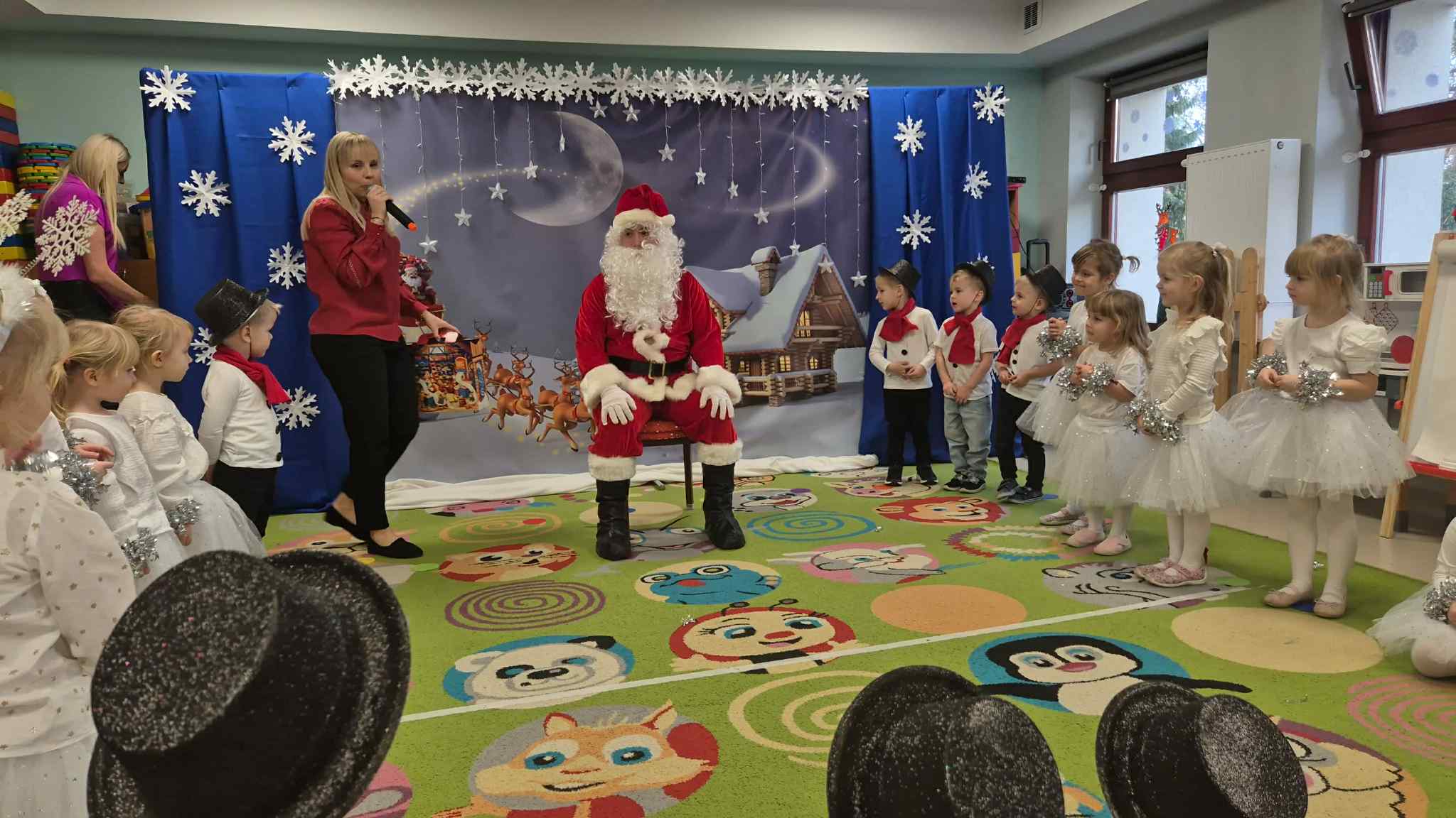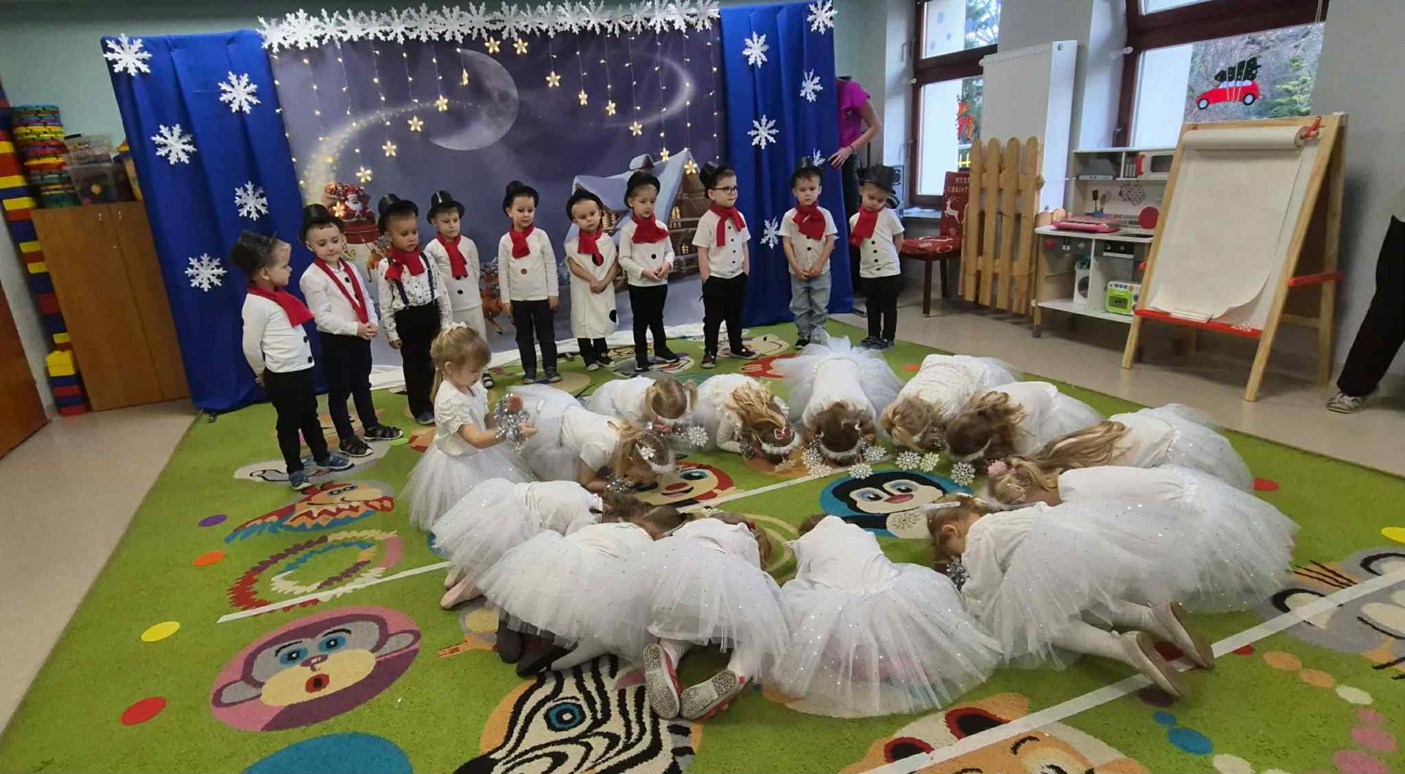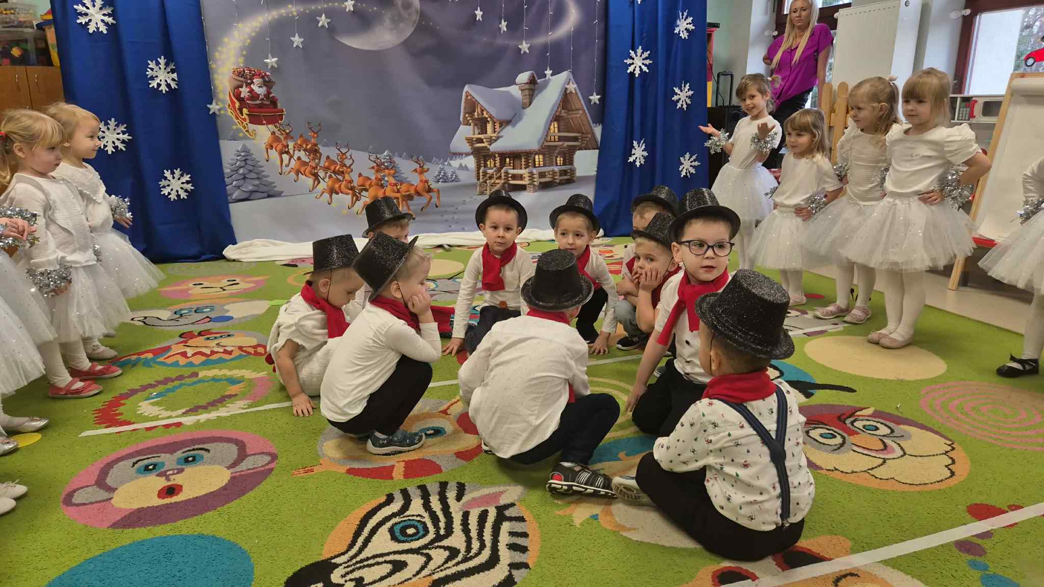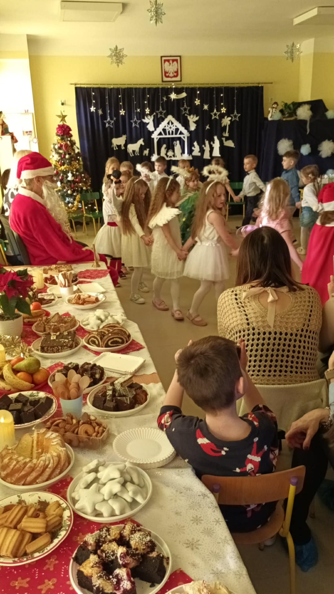 Najważniejszym celem takich wydarzeń jest integracja grupy i rodziny, nauka zwyczajów bożonarodzeniowych, kształtowanie zdolności artystycznych i twórczości dzieci, a także ukazanie atmosfery radości, wspólnoty i wzmocnienie więzi przez wspólne przeżywanie świąt. To wspaniała okazja do prezentacji umiejętności przedszkolaków, budowania ich pewności siebie i przekazywania wartości kulturowych i rodzinnych, podkreślając jednocześnie ogromną rolę tradycji, tj.: ozdabianie choinki, kolędowanie czy wręczanie prezentów. W tym tygodniu każda sala zamieniła się w cudowną, świąteczną krainę, a dzieci były wyjątkowo ubrane. Nie zabrakło recytacji wierszy, śpiewania piosenek, prezentacji układów tanecznych, czy gry na instrumentach muzycznych w świątecznej odsłonie. Tego wszystkiego dzieci uczyły się przez cały grudzień, a każda grupa zrobiła to na swój, wyjątkowy sposób. Dzięki temu, przedszkolaki poznają prawdziwą istotę świąt i rozumieją, co jest w świętach najważniejsze. Po występach odwiedził nas Mikołaj, który wręczył cudowne prezenty. Jednak to nie wszystko, bowiem w grudniu, w ramach warsztatów świątecznych, prowadzonych przez nauczycielkę p. Annę Kowalczyk, dzieci przygotowały rękodzielnicze dzwoneczki świąteczne, którymi obdarowały swoich Rodziców. Na zakończenie, życzenia złożyła wszystkim p. Dyrektor naszego przedszkola - p. Anna Kasprowicz. Bijemy brawa dla przedszkolaków za ich trud i zaangażowanie w przygotowania uroczystości, natomiast Rodzicom pięknie dziękujemy za ogromne wsparcie w ich organizacji. Dziękujemy również p. Marcie Bołdowskiej - naszej rytmiczce, która również brała udział w przygotowaniu dzieci do występów. Na uznanie zasługują również nauczycielki grup i ich pomysły, gdyż od pomysłu wszystko się zaczyna. W ten o to sposób przygotowaliśmy się do świąt i pragniemy wszystkim Rodzicom oraz Ich dzieciom złożyć serdeczne życzenia zdrowych, wesołych, ale przede wszystkim rodzinnych Świąt Bożego Narodzenia i Szczęśliwego Nowego Roku!