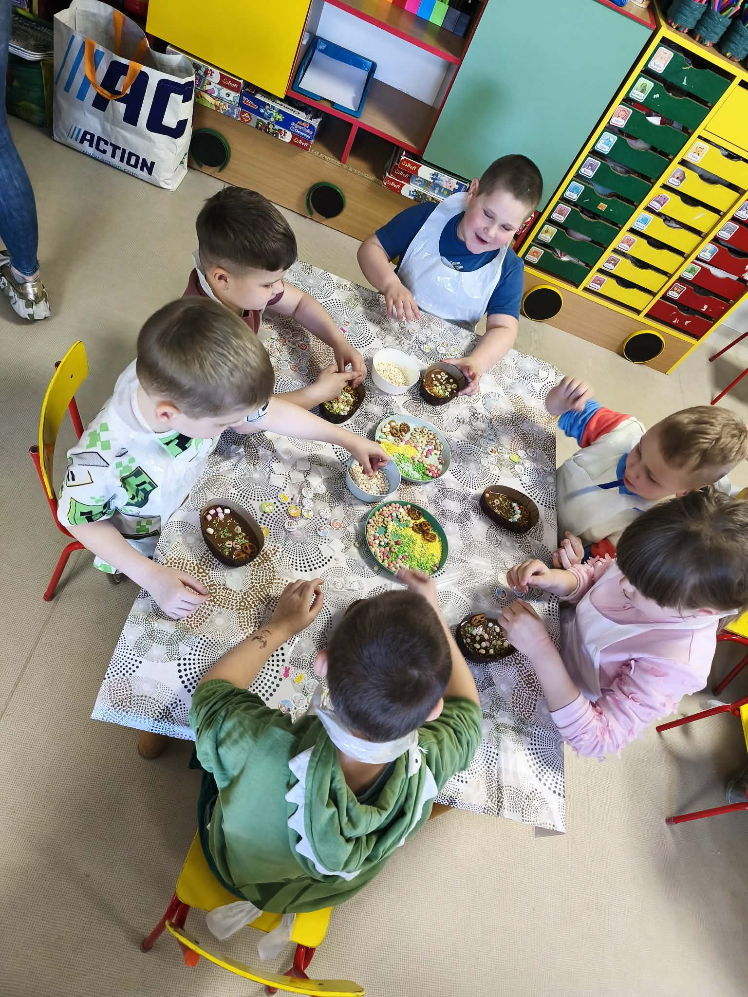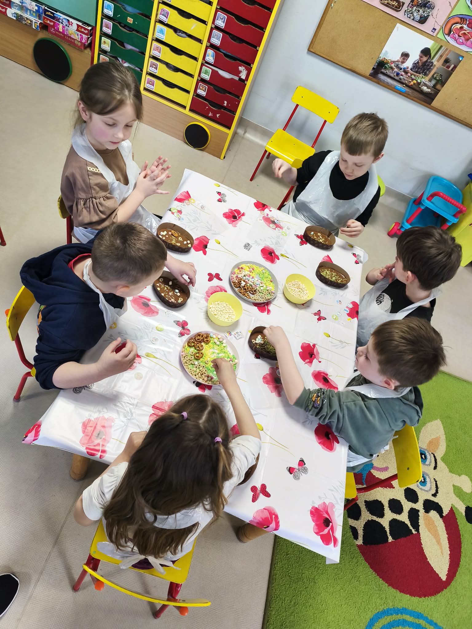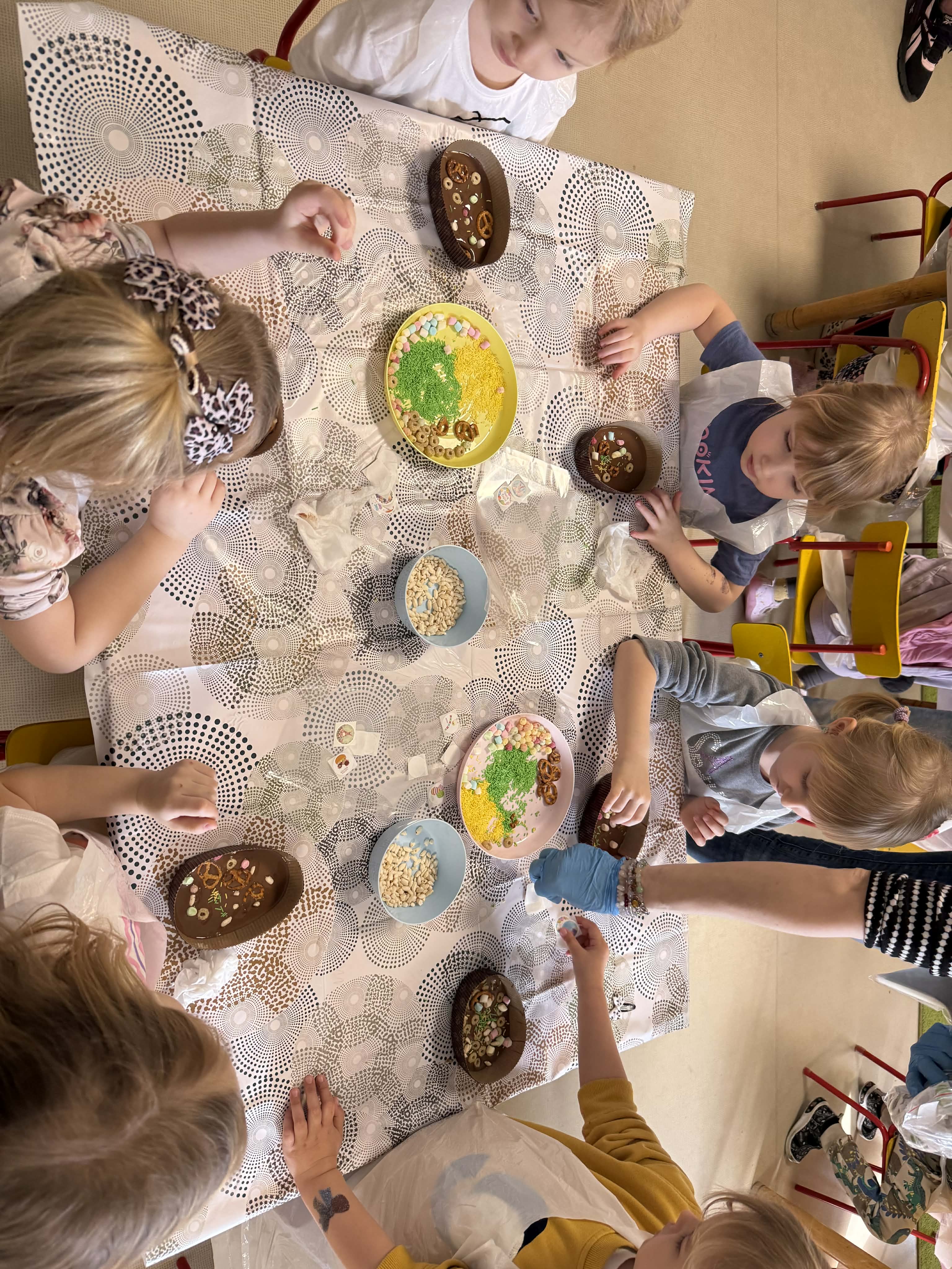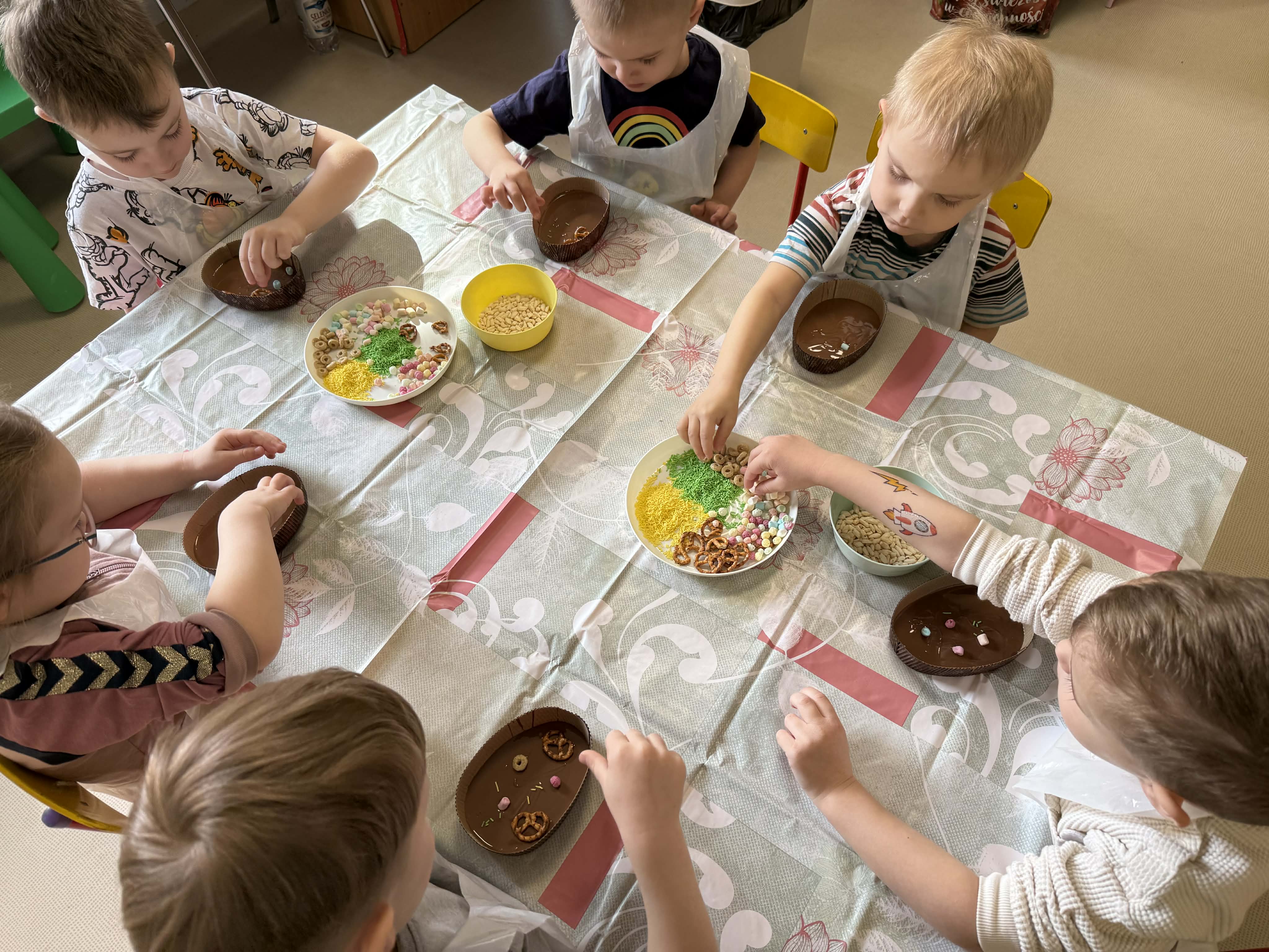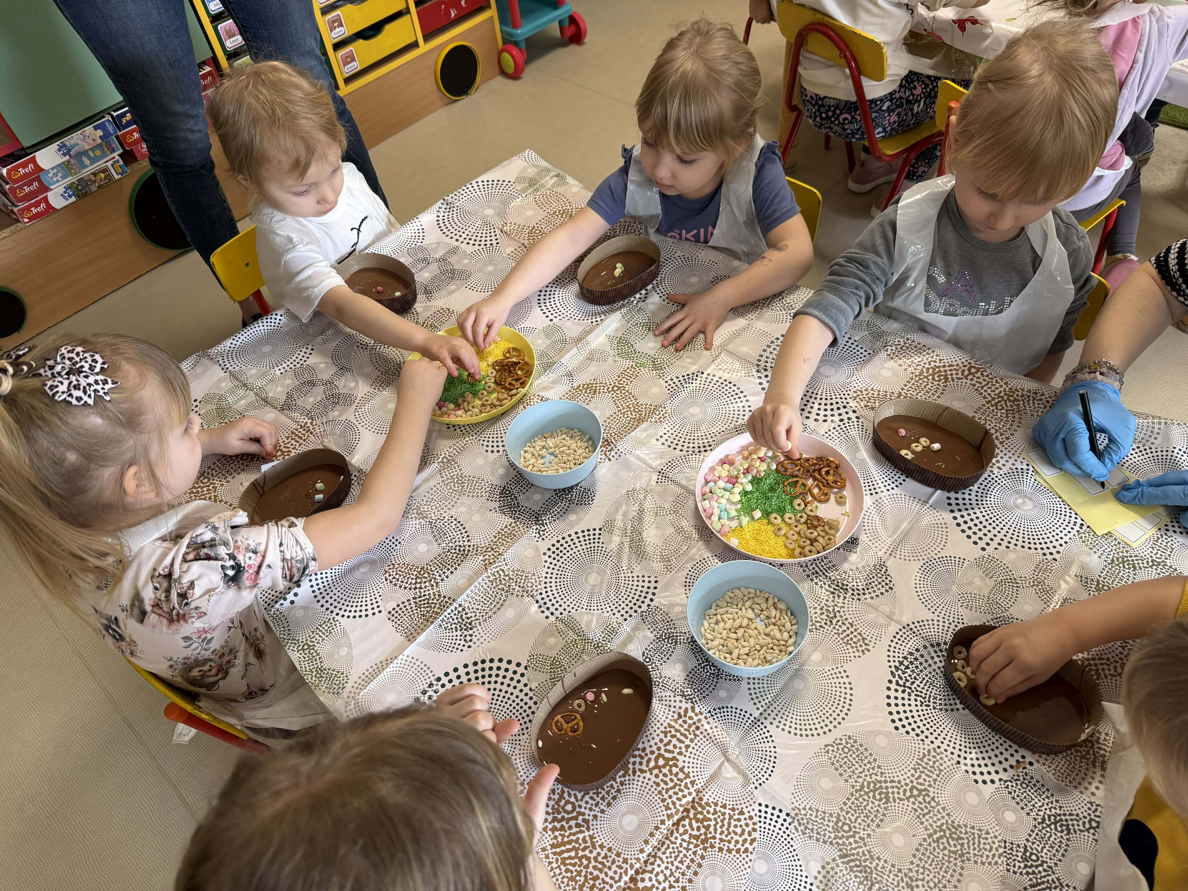 Warsztaty czekoladowe w przedszkolu okazały się niezwykłym wydarzeniem, które połączyło naukę z doskonałą zabawą. Dzieci miały okazję samodzielnie stworzyć wyjątkowe, słodkie dzieła – czekoladowe pisanki, dekorując je kolorowymi posypkami i jadalnymi ozdobami. Radość i zaangażowanie były widoczne na twarzach wszystkich uczestników, a każda pisanka była inna i wyjątkowa. Warsztaty nie tylko rozwijały zdolności manualne, ale także uczyły cierpliwości i współpracy. Każde dziecko mogło zabrać swoje czekoladowe dzieło do domu, by podzielić się nim z bliskimi. Na zakończenie przedszkolaki otrzymały także pamiątkowe, drewniane pisanki, które mogły ozdobić kolorowymi mazakami. To słodkie wydarzenie na długo pozostanie w naszej pamięci, wprowadzając nas w radosny, świąteczny nastrój.