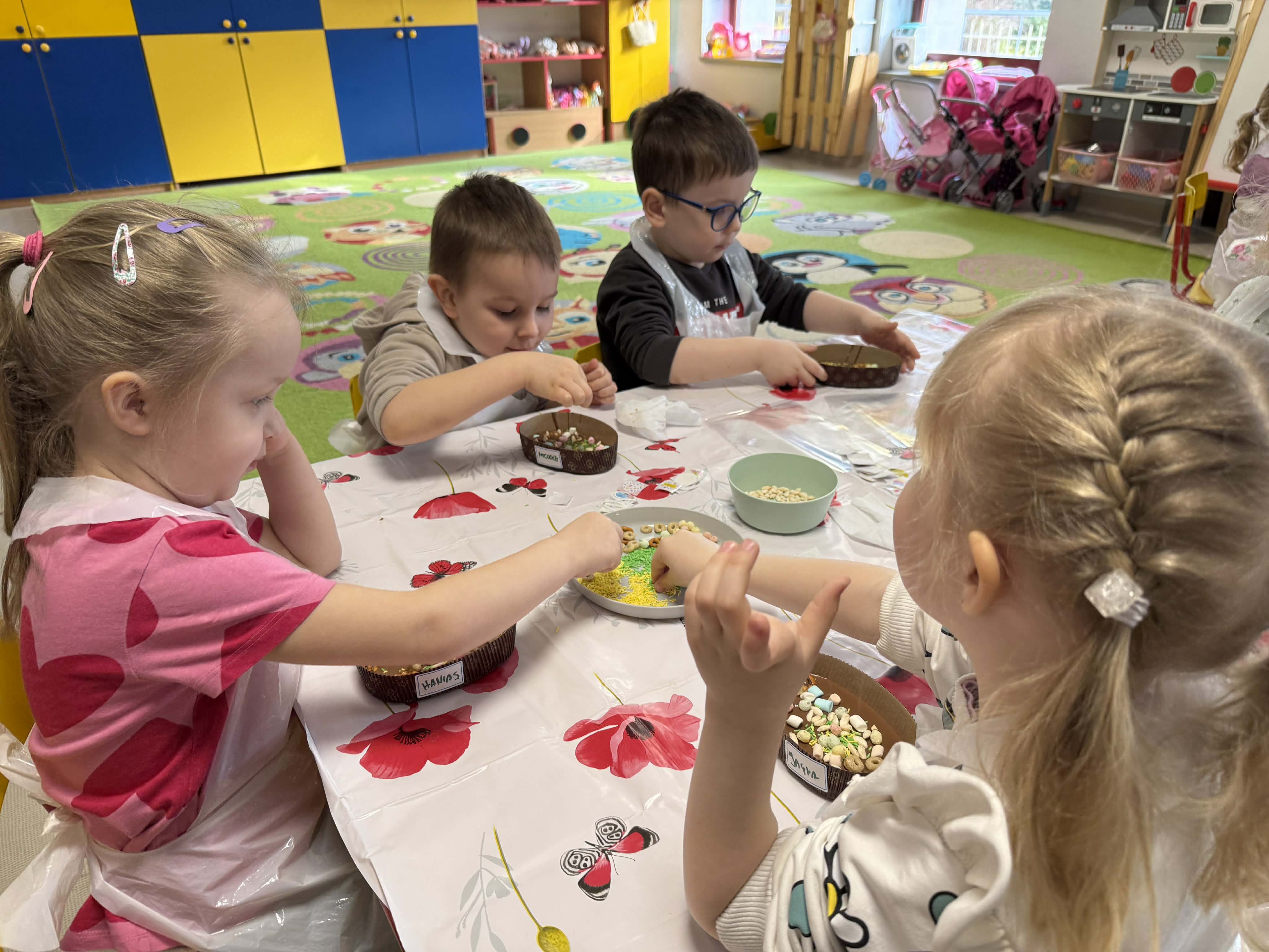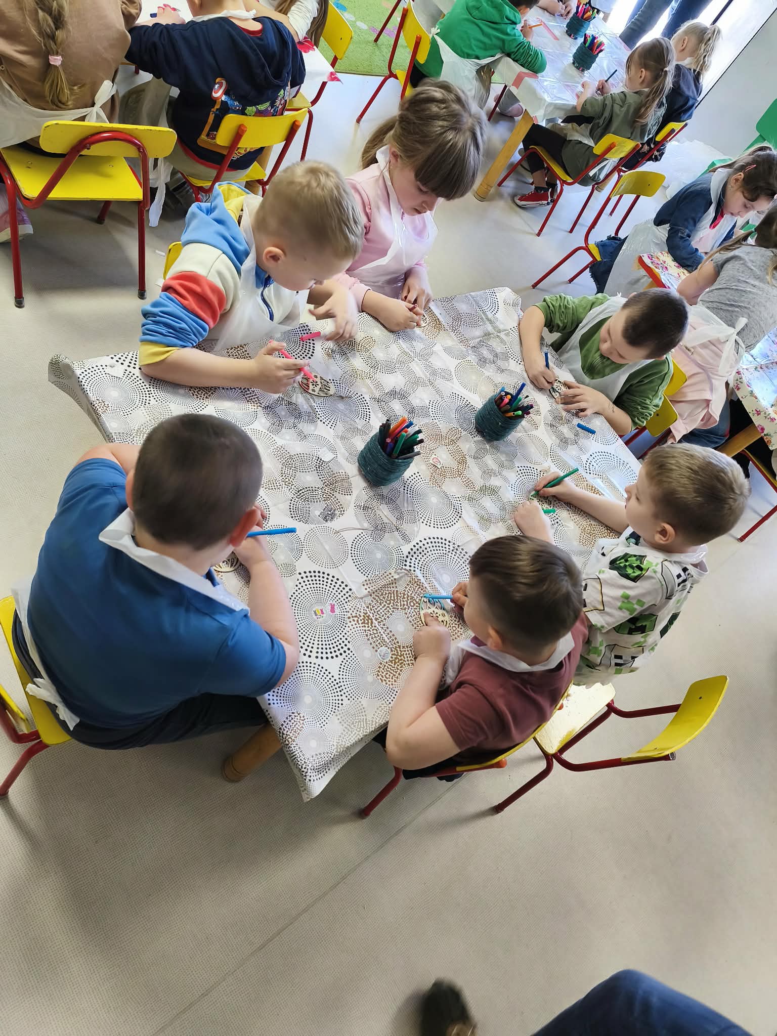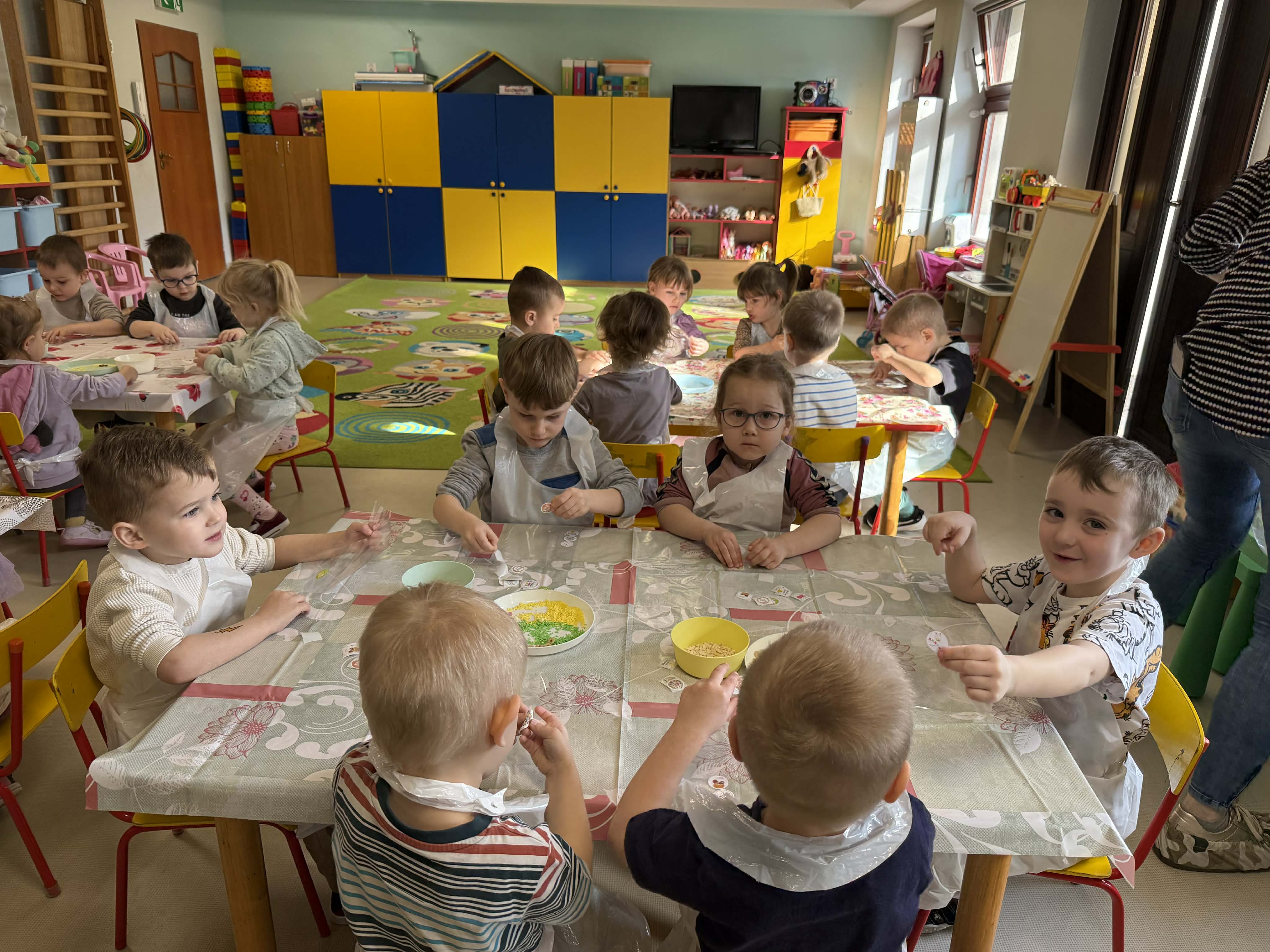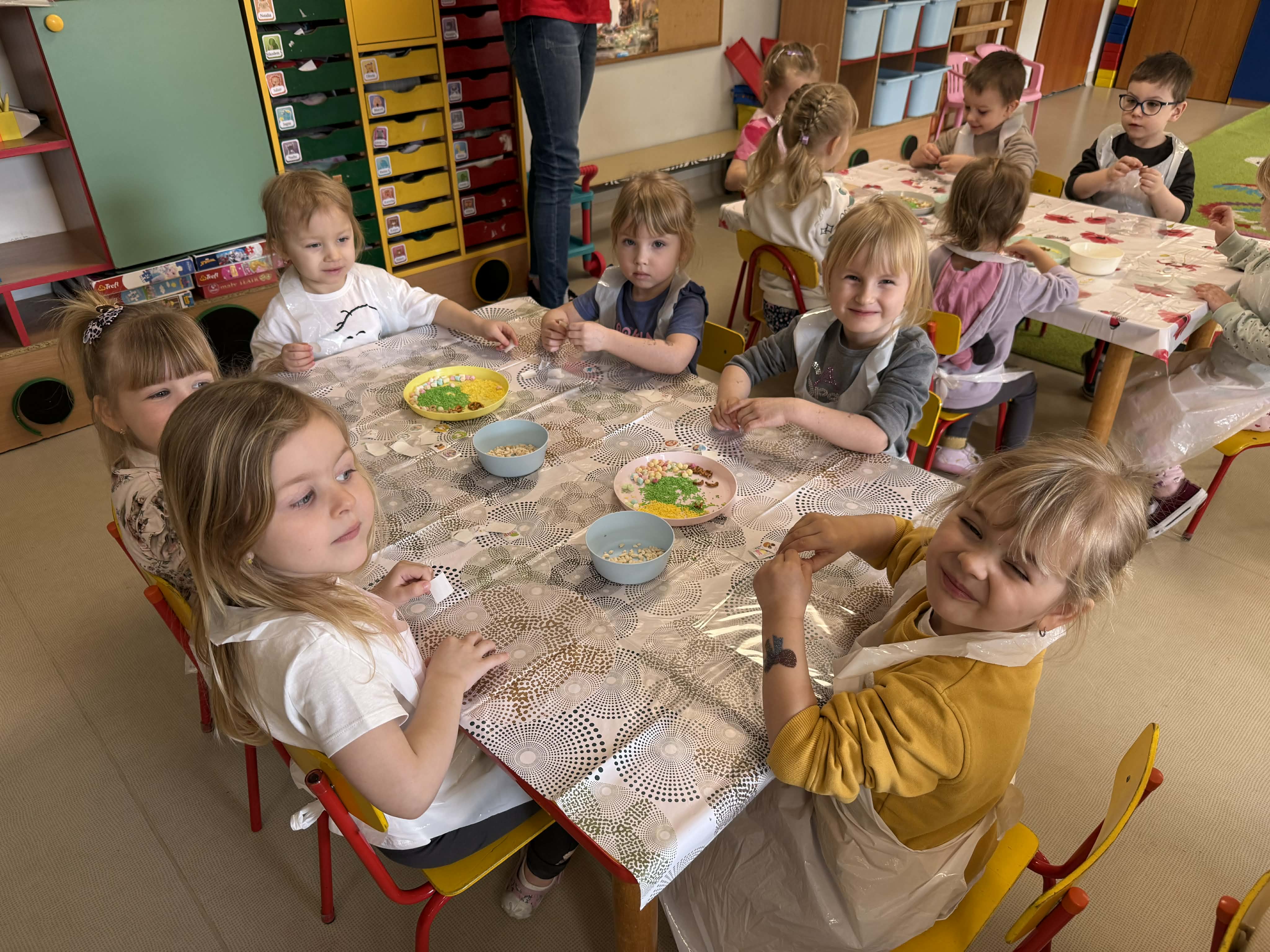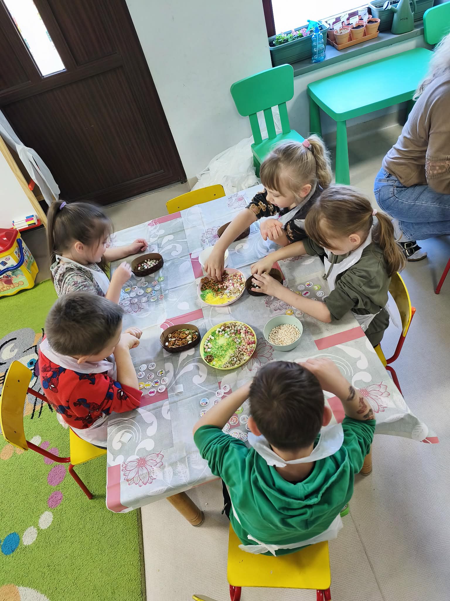 Warsztaty czekoladowe w przedszkolu okazały się niezwykłym wydarzeniem, które połączyło naukę z doskonałą zabawą. Dzieci miały okazję samodzielnie stworzyć wyjątkowe, słodkie dzieła – czekoladowe pisanki, dekorując je kolorowymi posypkami i jadalnymi ozdobami. Radość i zaangażowanie były widoczne na twarzach wszystkich uczestników, a każda pisanka była inna i wyjątkowa. Warsztaty nie tylko rozwijały zdolności manualne, ale także uczyły cierpliwości i współpracy. Każde dziecko mogło zabrać swoje czekoladowe dzieło do domu, by podzielić się nim z bliskimi. Na zakończenie przedszkolaki otrzymały także pamiątkowe, drewniane pisanki, które mogły ozdobić kolorowymi mazakami. To słodkie wydarzenie na długo pozostanie w naszej pamięci, wprowadzając nas w radosny, świąteczny nastrój.