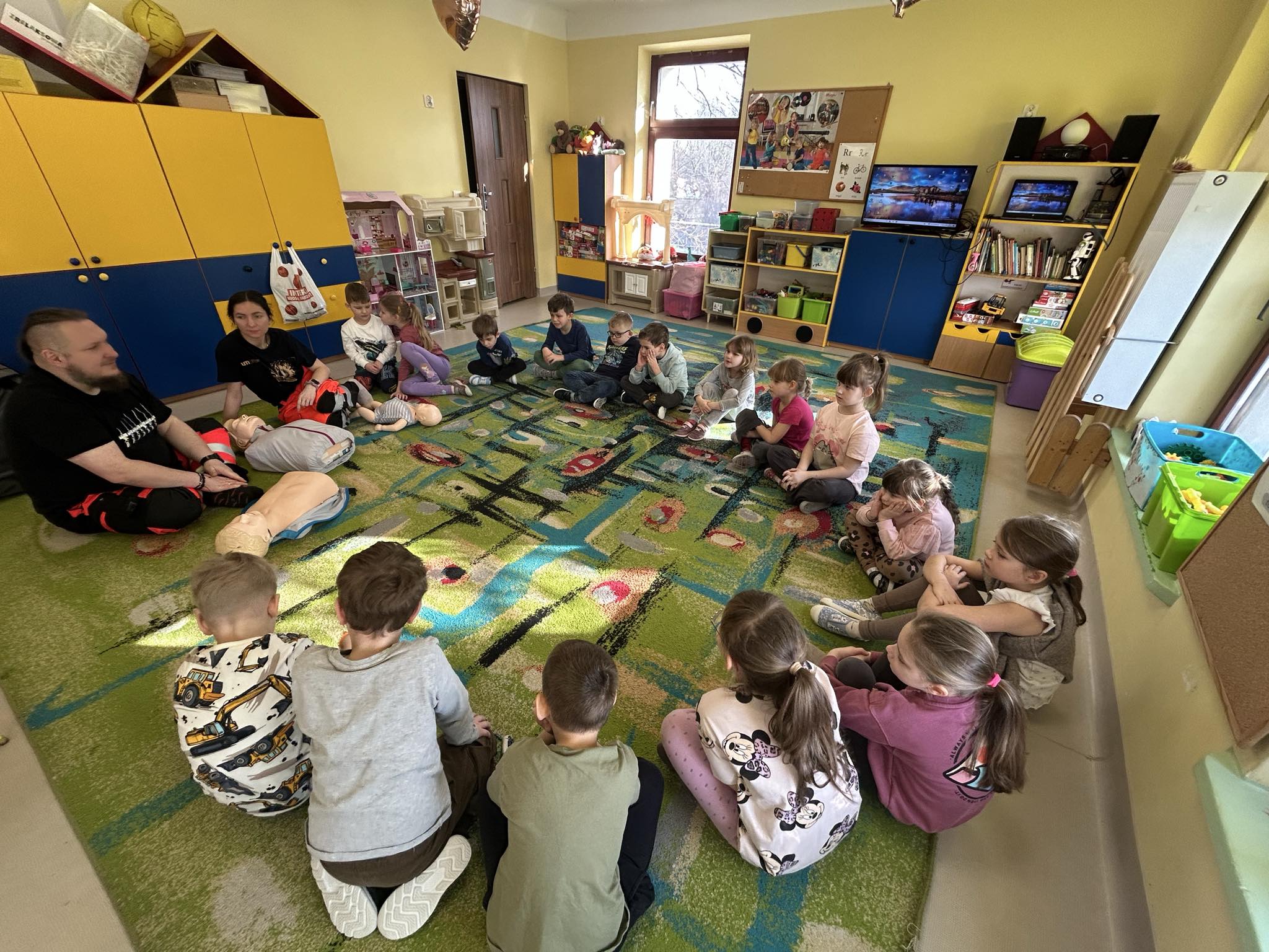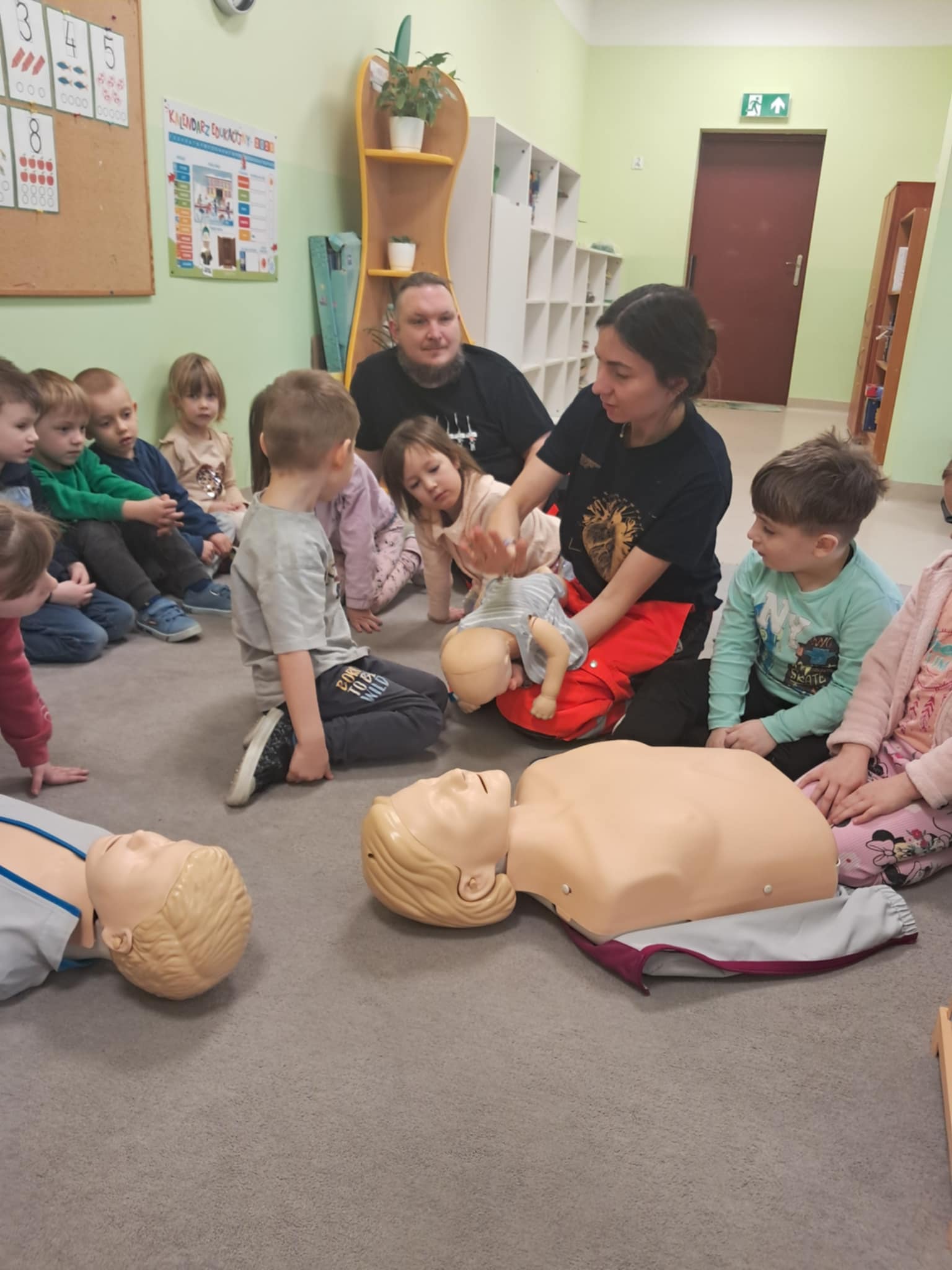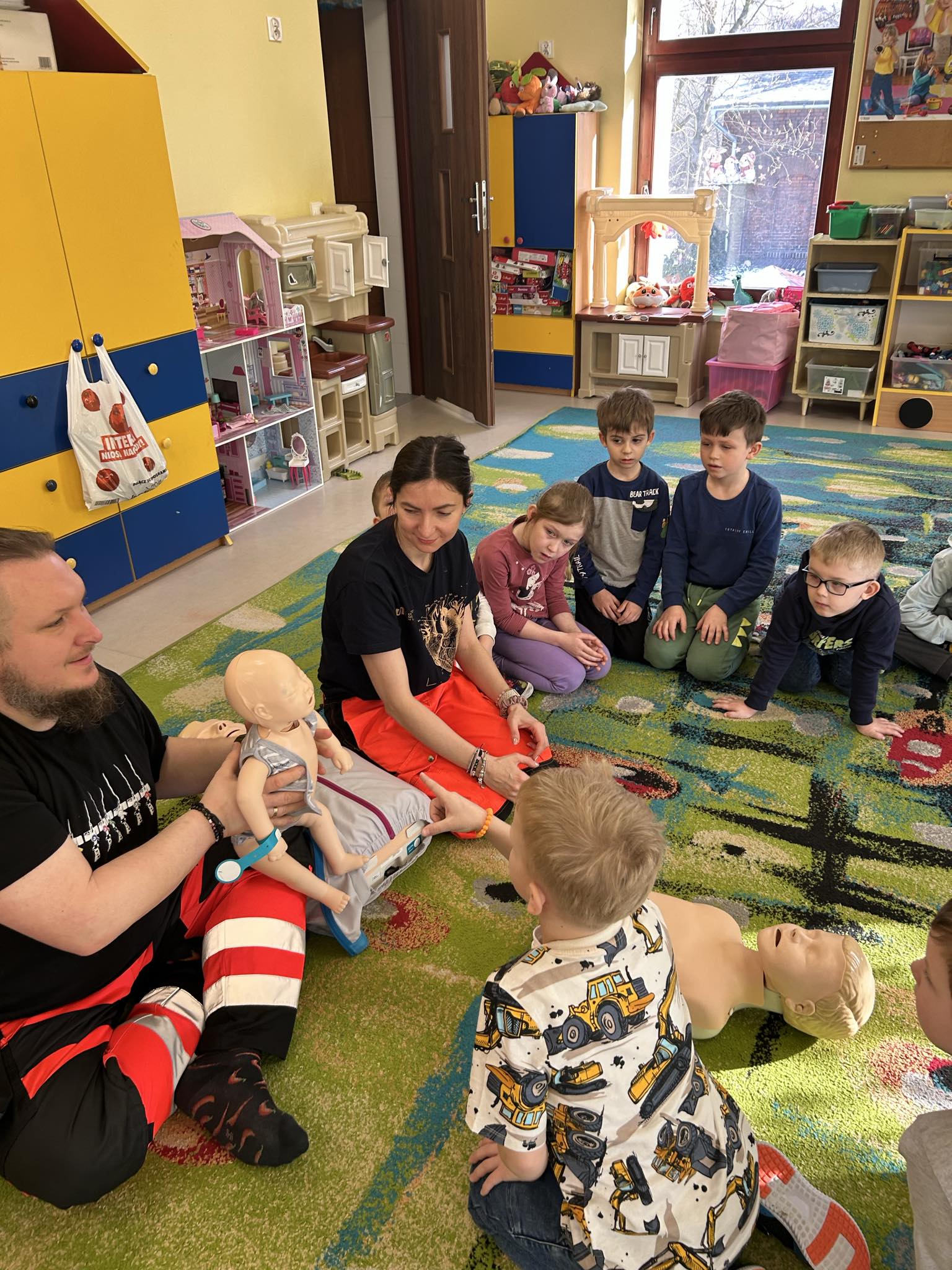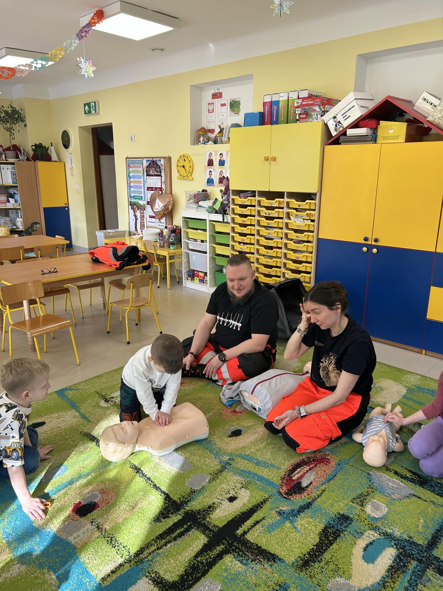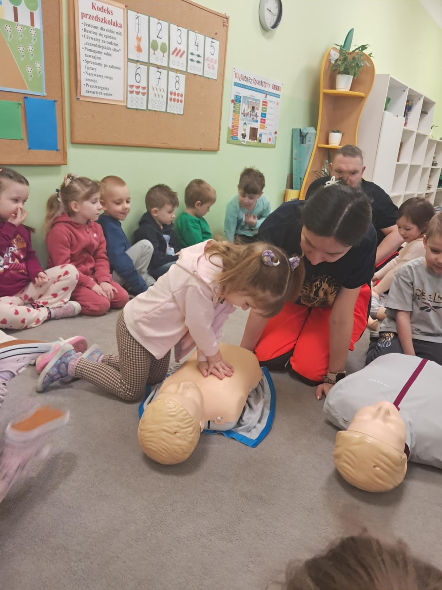 „Nie bój się, wiedzę masz, odrzuć strach, wiedzę chwyć, przecież człowiek dzięki tobie może żyć!” Kierując się powyższą sentencją, jak co roku odwiedzili nas Rodzice chłopców z naszego przedszkola - ratownicy medyczni, którzy najpierw opowiedzieli dzieciom o swoim zawodzie, omówili pozycję bezpieczną, resuscytację krążeniowo-oddechową a następnie przy wykorzystaniu profesjonalnych fantomów zachęcili przedszkolaki do ćwiczeń praktycznych. Zgodnie z tym, co powiedział kiedyś Konfucjusz: „Powiedz mi, a zapomnę, pokaż mi, a zapamiętam, pozwól mi zrobić, a zrozumiem.”, dzieci uczą się przede wszystkim przez działanie, a udzielanie pierwszej pomocy nie jest tylko wyborem - jest koniecznością i udzielić jej może każdy, kto zauważy, że ktoś potrzebuje pomocy - niezależnie od wieku czy umiejętności, oczywiście z zachowaniem własnego bezpieczeństwa. Przedszkolaki chętnie przystępowały do działań praktycznych i odpowiadały na liczne pytania, utrwalając przy okazji numery alarmowe oraz rozmowę przez telefon w sytuacji wezwania pogotowia ratunkowego. To niezwykle ważne, aby uczyć zasad udzielania pierwszej pomocy już od najmłodszych lat właśnie po to, by czuć się pewniej i nie bać się pomagać innym. Na zakończenie dzieci otrzymały kolorowanki tematyczne i pięknie podziękowały prowadzącym, a nasi goście przybili piątki z uczestnikami i dokonali pamiątkowego wpisu do kroniki przedszkolnej. W imieniu naszego przedszkola - bardzo dziękujemy p. Kamili i p. Tomaszowi Skoniecznym za poświęcony czas, ogromne zaangażowanie i prezentację swojego zawodu oraz życiowej pasji.