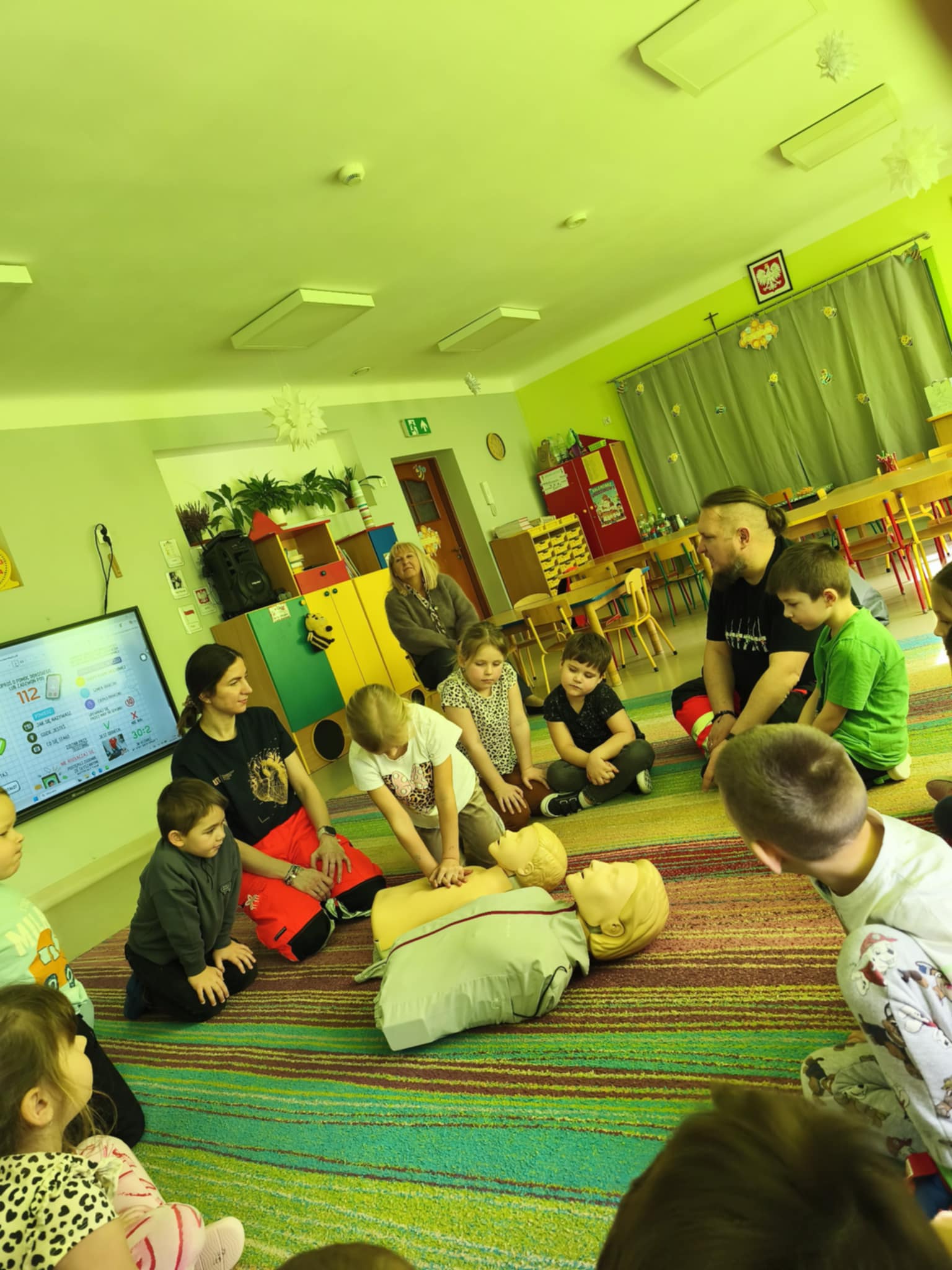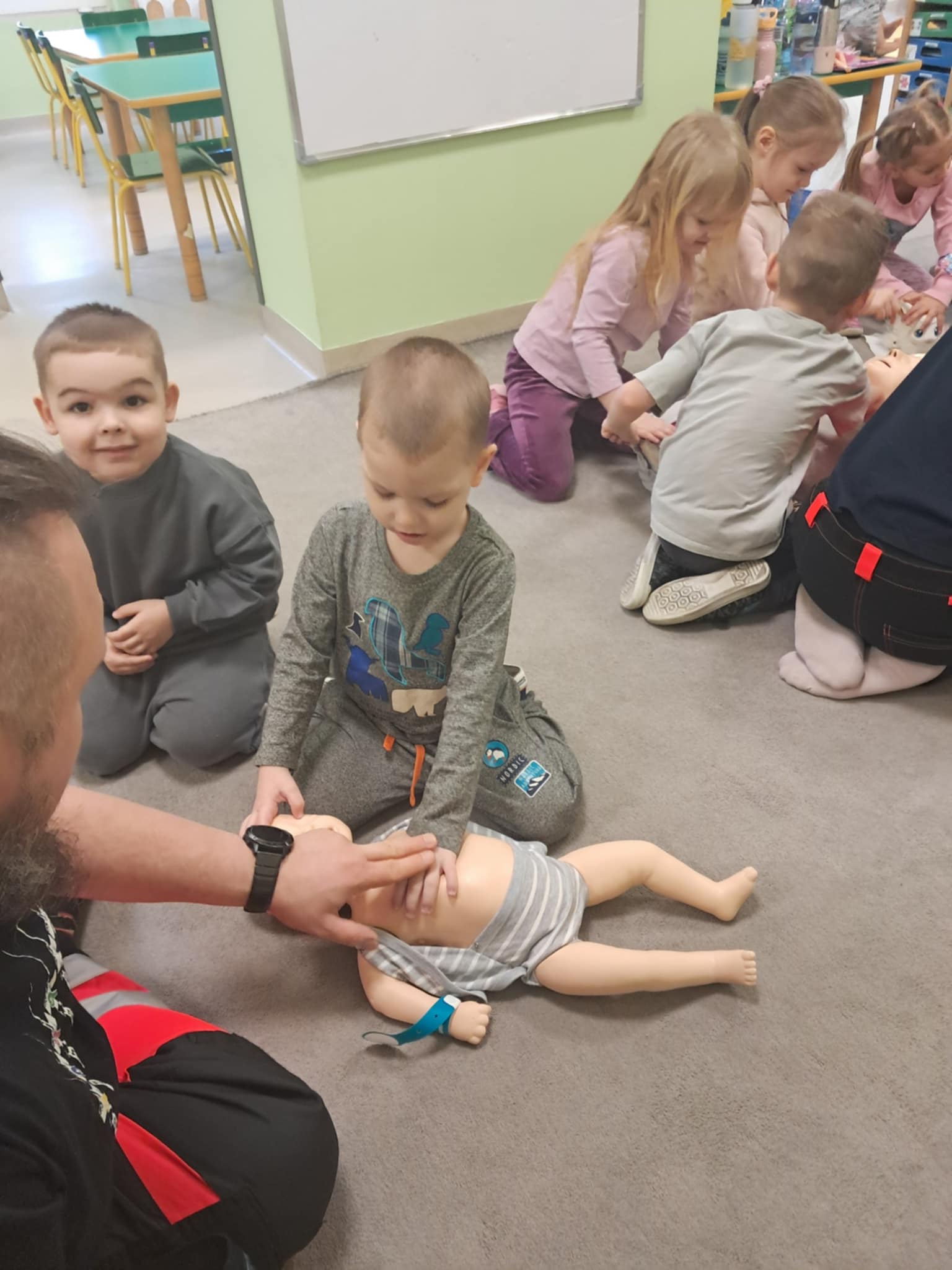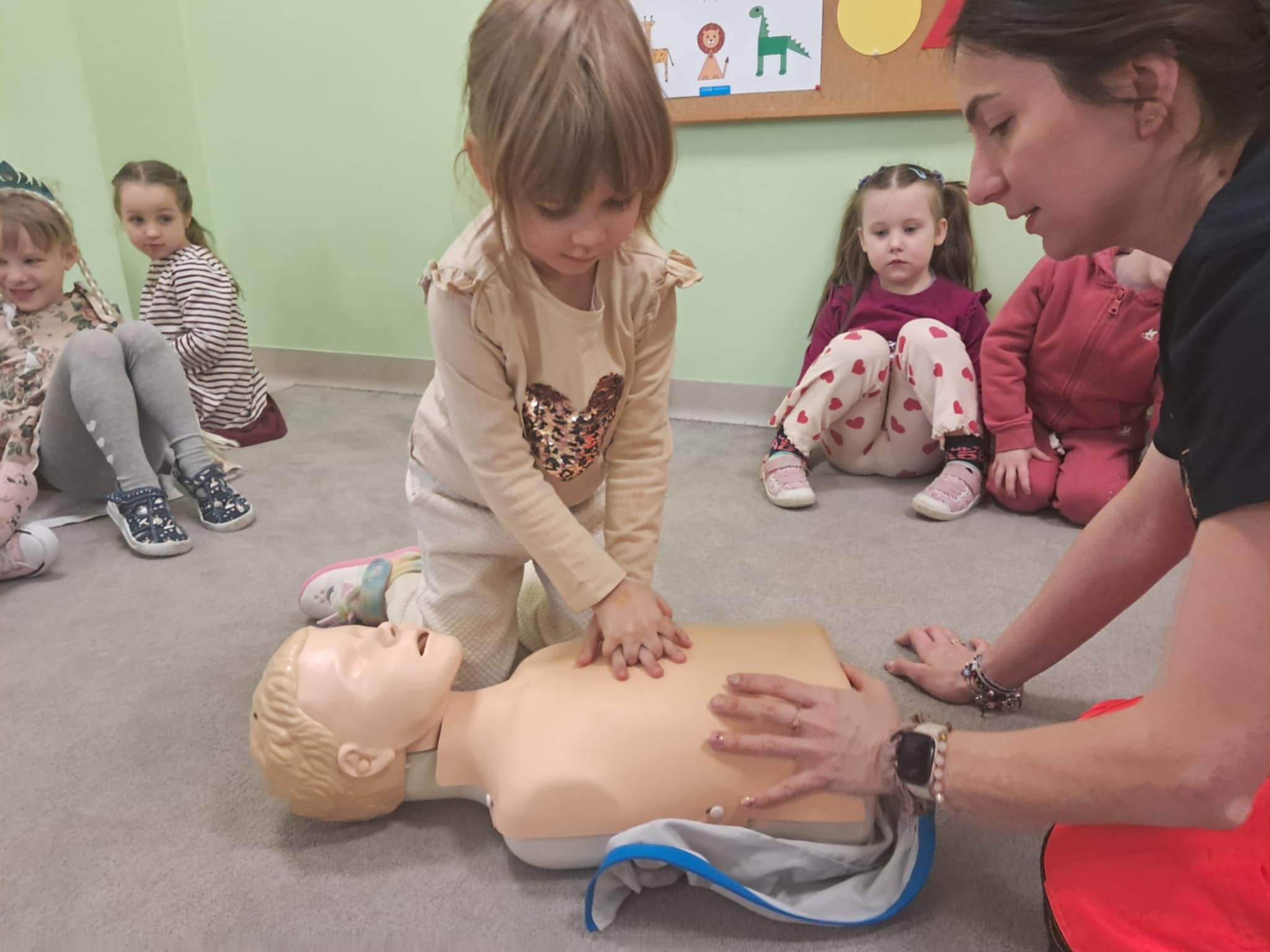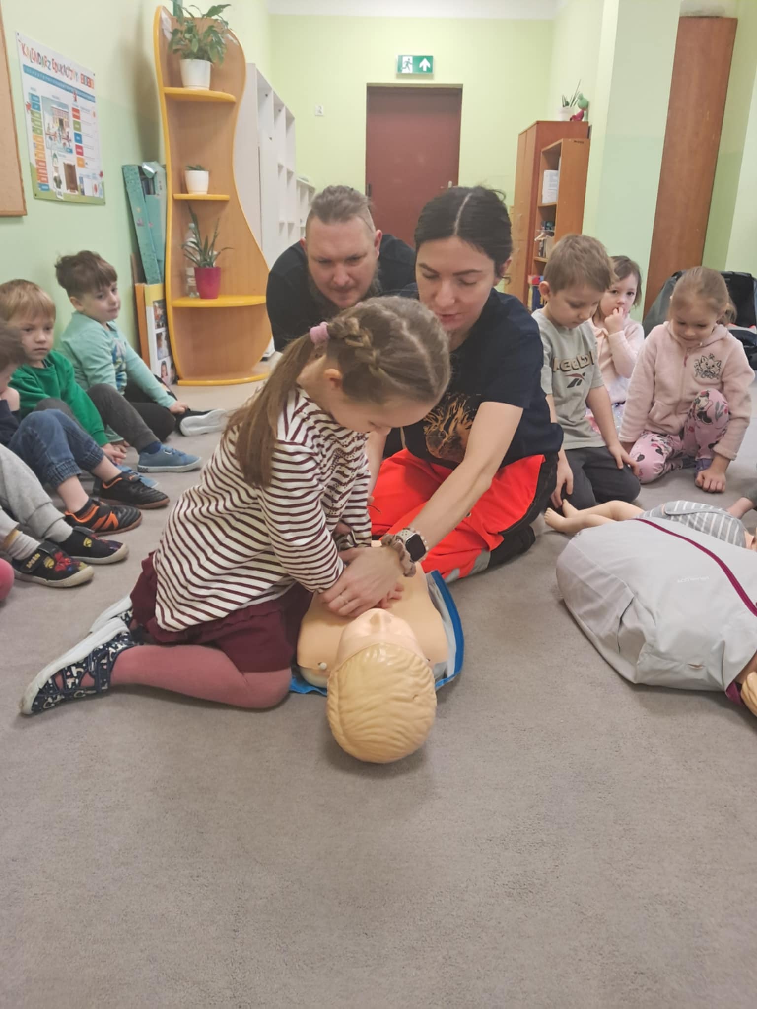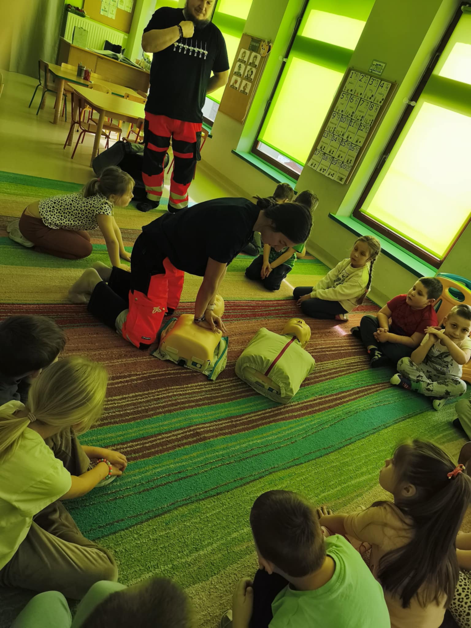 „Nie bój się, wiedzę masz, odrzuć strach, wiedzę chwyć, przecież człowiek dzięki tobie może żyć!” Kierując się powyższą sentencją, jak co roku odwiedzili nas Rodzice chłopców z naszego przedszkola - ratownicy medyczni, którzy najpierw opowiedzieli dzieciom o swoim zawodzie, omówili pozycję bezpieczną, resuscytację krążeniowo-oddechową a następnie przy wykorzystaniu profesjonalnych fantomów zachęcili przedszkolaki do ćwiczeń praktycznych. Zgodnie z tym, co powiedział kiedyś Konfucjusz: „Powiedz mi, a zapomnę, pokaż mi, a zapamiętam, pozwól mi zrobić, a zrozumiem.”, dzieci uczą się przede wszystkim przez działanie, a udzielanie pierwszej pomocy nie jest tylko wyborem - jest koniecznością i udzielić jej może każdy, kto zauważy, że ktoś potrzebuje pomocy - niezależnie od wieku czy umiejętności, oczywiście z zachowaniem własnego bezpieczeństwa. Przedszkolaki chętnie przystępowały do działań praktycznych i odpowiadały na liczne pytania, utrwalając przy okazji numery alarmowe oraz rozmowę przez telefon w sytuacji wezwania pogotowia ratunkowego. To niezwykle ważne, aby uczyć zasad udzielania pierwszej pomocy już od najmłodszych lat właśnie po to, by czuć się pewniej i nie bać się pomagać innym. Na zakończenie dzieci otrzymały kolorowanki tematyczne i pięknie podziękowały prowadzącym, a nasi goście przybili piątki z uczestnikami i dokonali pamiątkowego wpisu do kroniki przedszkolnej. W imieniu naszego przedszkola - bardzo dziękujemy p. Kamili i p. Tomaszowi Skoniecznym za poświęcony czas, ogromne zaangażowanie i prezentację swojego zawodu oraz życiowej pasji.