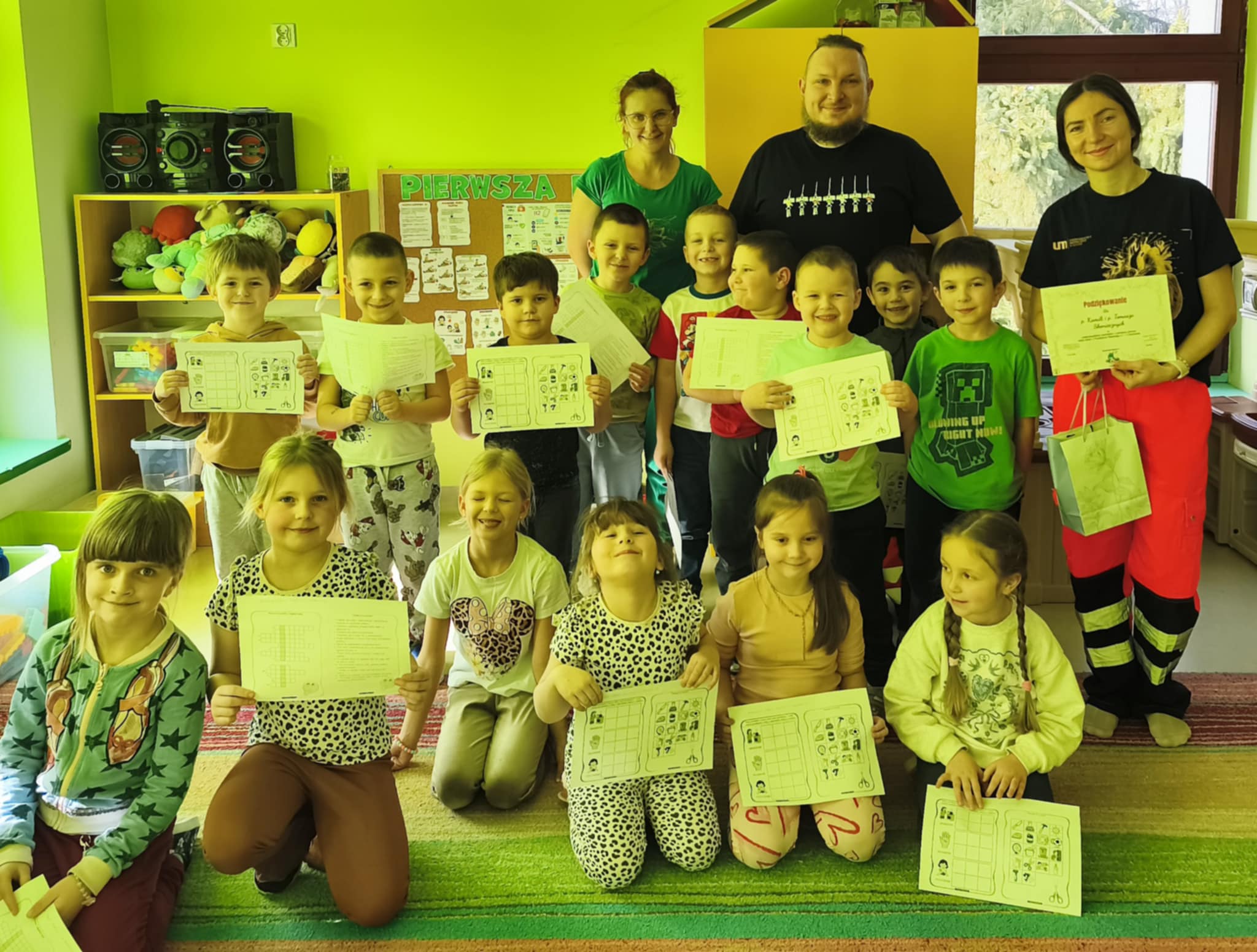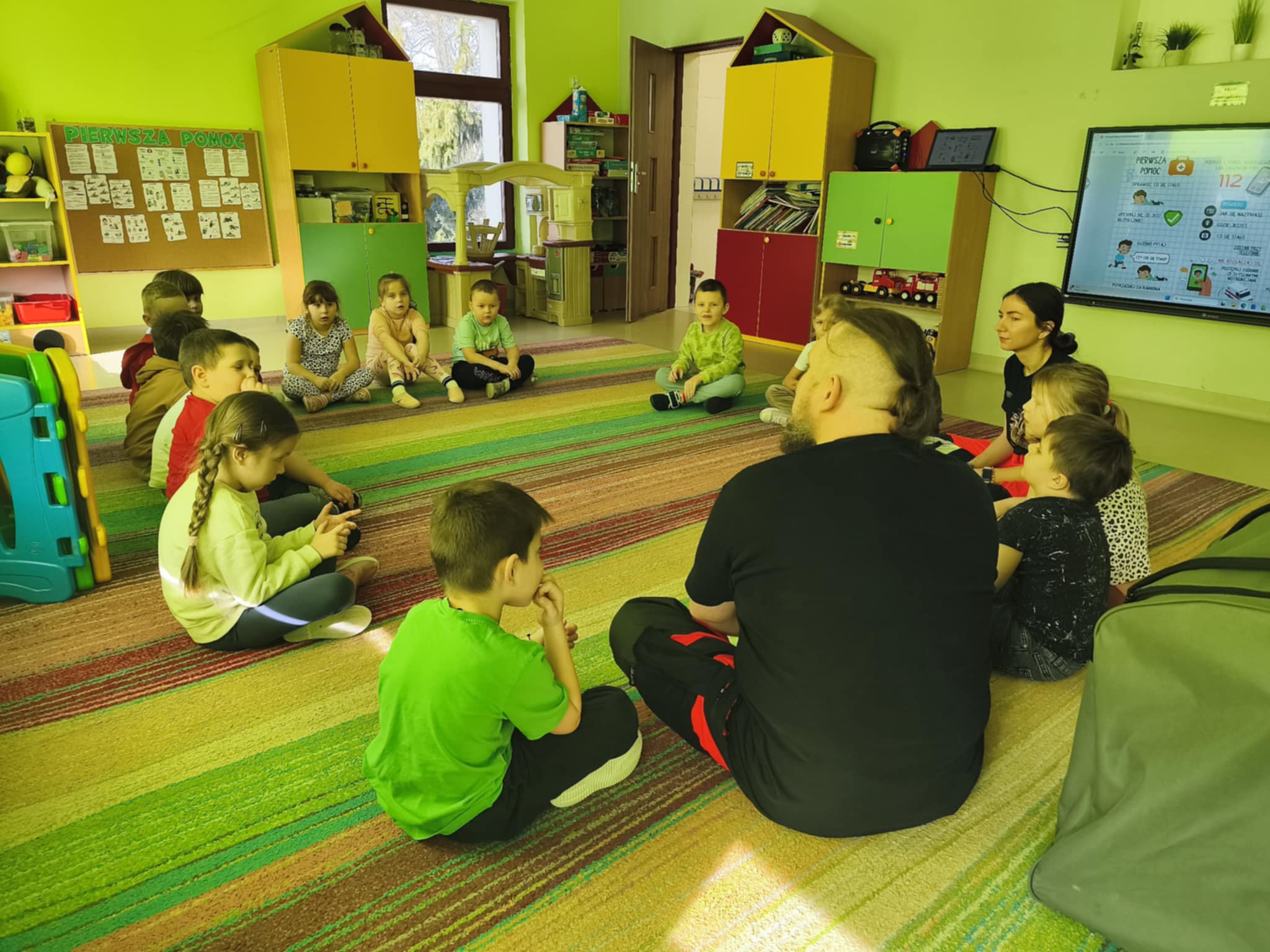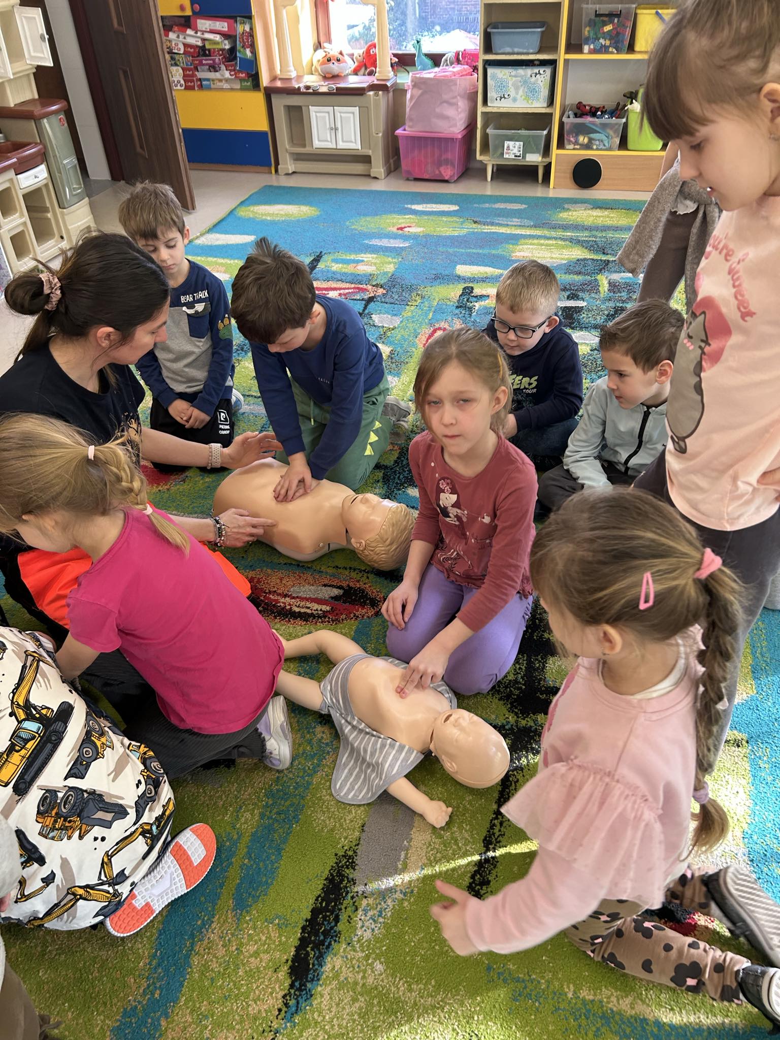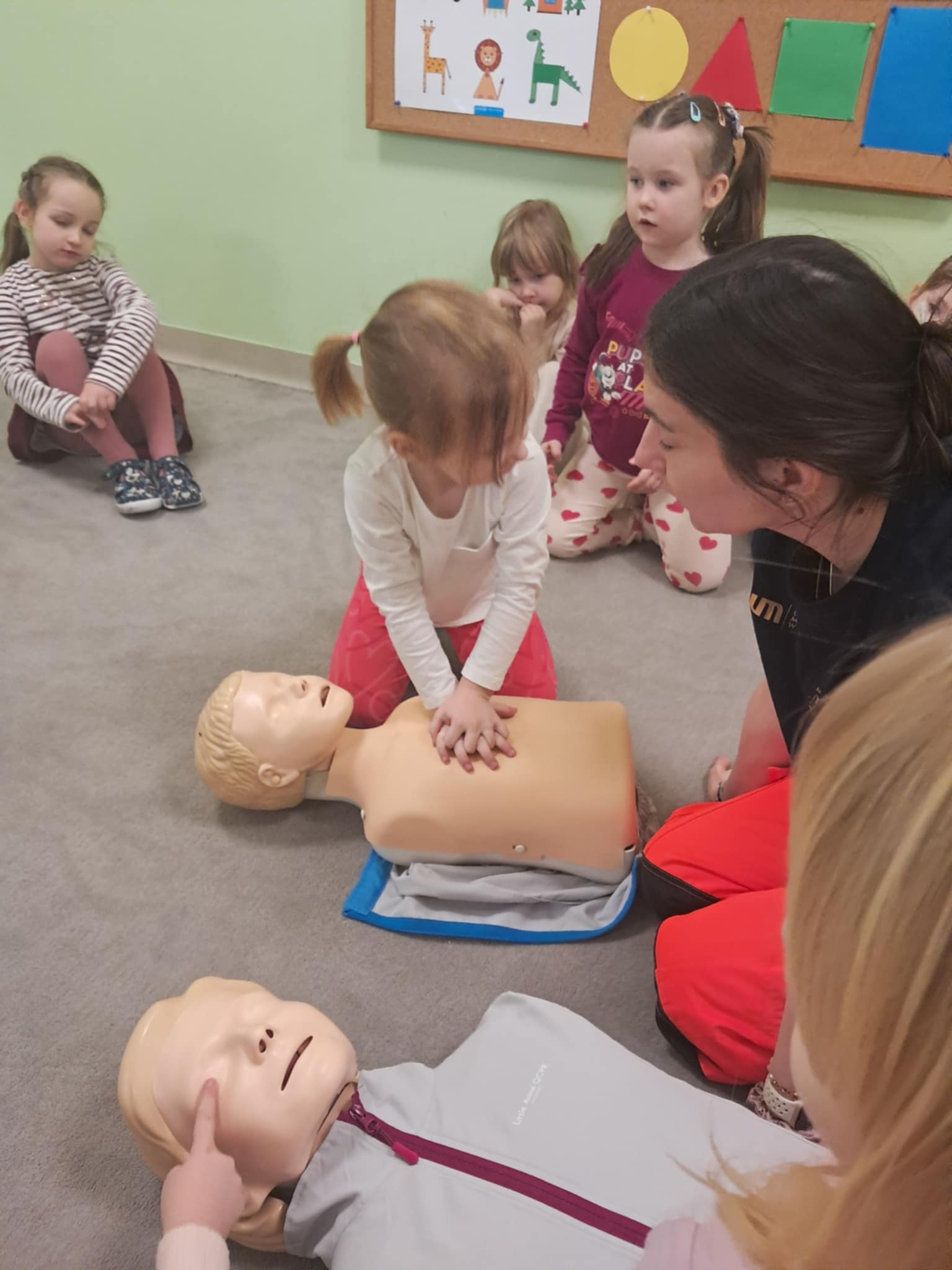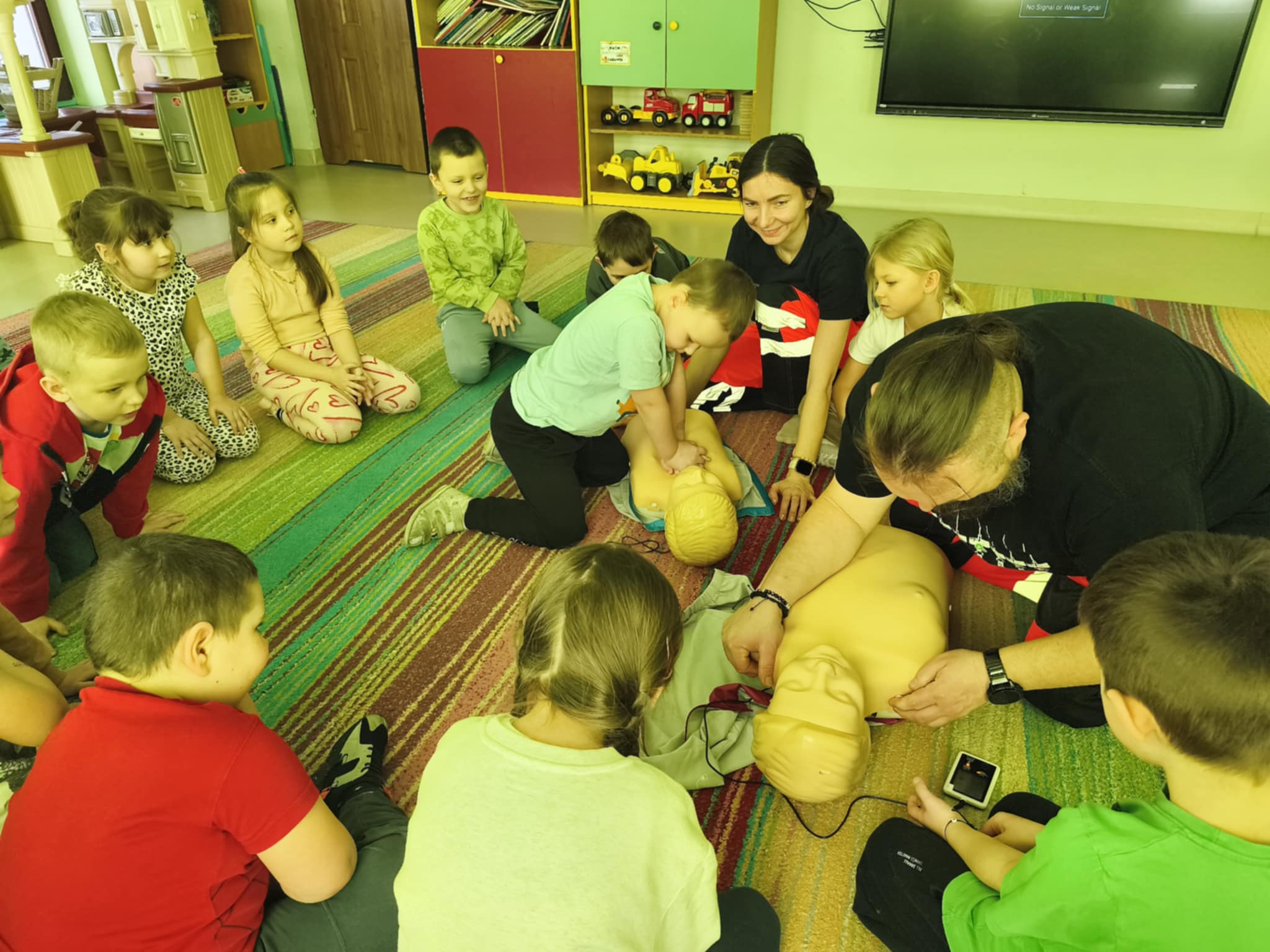 „Nie bój się, wiedzę masz, odrzuć strach, wiedzę chwyć, przecież człowiek dzięki tobie może żyć!” Kierując się powyższą sentencją, jak co roku odwiedzili nas Rodzice chłopców z naszego przedszkola - ratownicy medyczni, którzy najpierw opowiedzieli dzieciom o swoim zawodzie, omówili pozycję bezpieczną, resuscytację krążeniowo-oddechową a następnie przy wykorzystaniu profesjonalnych fantomów zachęcili przedszkolaki do ćwiczeń praktycznych. Zgodnie z tym, co powiedział kiedyś Konfucjusz: „Powiedz mi, a zapomnę, pokaż mi, a zapamiętam, pozwól mi zrobić, a zrozumiem.”, dzieci uczą się przede wszystkim przez działanie, a udzielanie pierwszej pomocy nie jest tylko wyborem - jest koniecznością i udzielić jej może każdy, kto zauważy, że ktoś potrzebuje pomocy - niezależnie od wieku czy umiejętności, oczywiście z zachowaniem własnego bezpieczeństwa. Przedszkolaki chętnie przystępowały do działań praktycznych i odpowiadały na liczne pytania, utrwalając przy okazji numery alarmowe oraz rozmowę przez telefon w sytuacji wezwania pogotowia ratunkowego. To niezwykle ważne, aby uczyć zasad udzielania pierwszej pomocy już od najmłodszych lat właśnie po to, by czuć się pewniej i nie bać się pomagać innym. Na zakończenie dzieci otrzymały kolorowanki tematyczne i pięknie podziękowały prowadzącym, a nasi goście przybili piątki z uczestnikami i dokonali pamiątkowego wpisu do kroniki przedszkolnej. W imieniu naszego przedszkola - bardzo dziękujemy p. Kamili i p. Tomaszowi Skoniecznym za poświęcony czas, ogromne zaangażowanie i prezentację swojego zawodu oraz życiowej pasji.