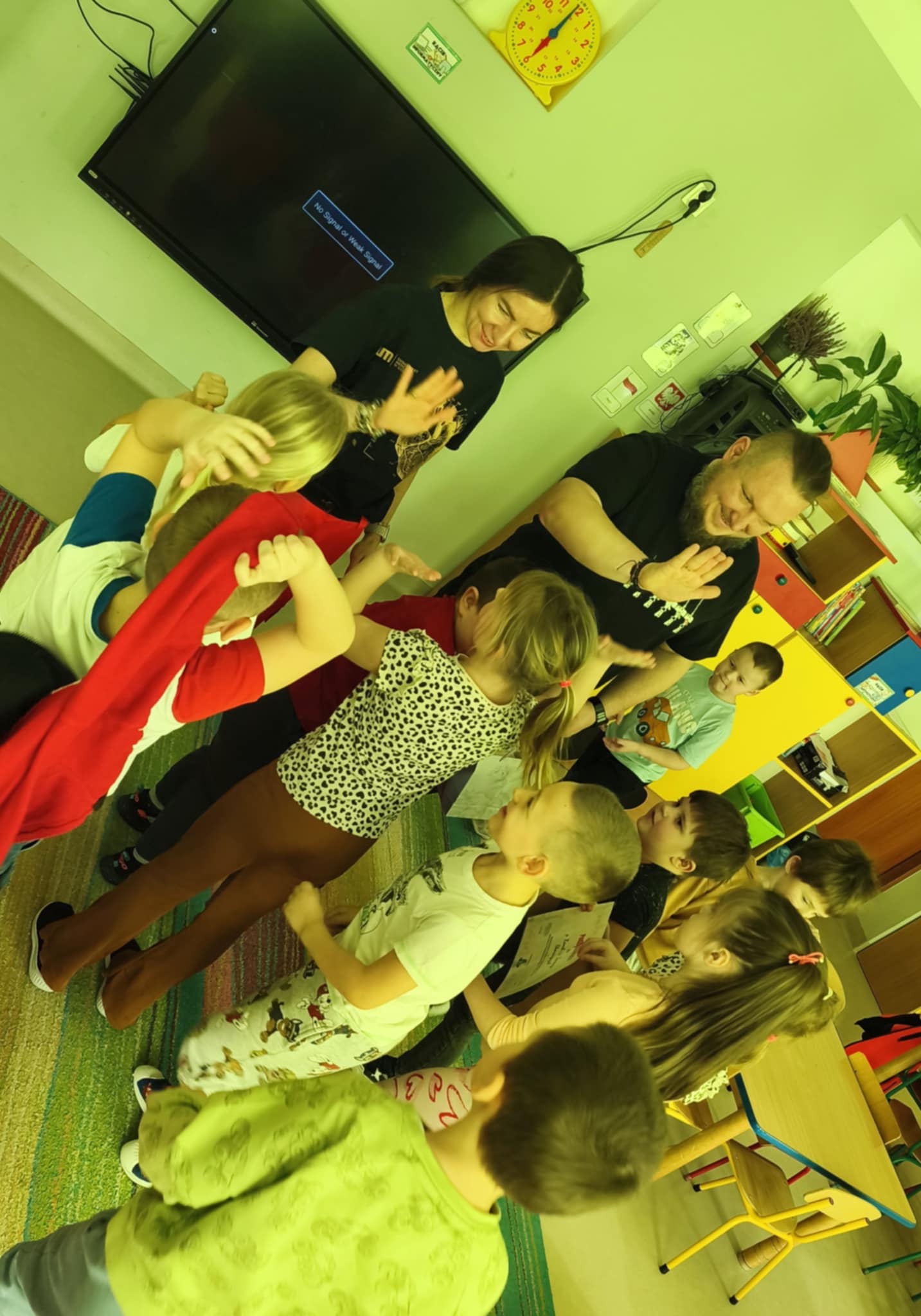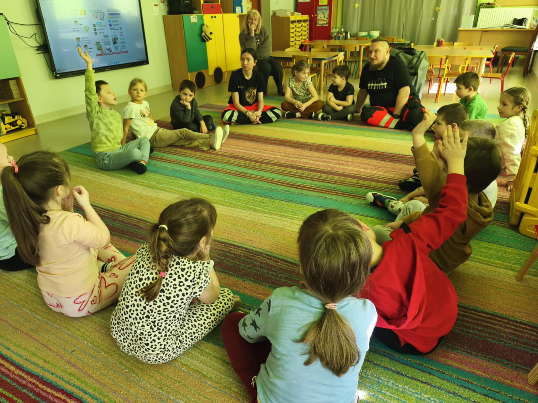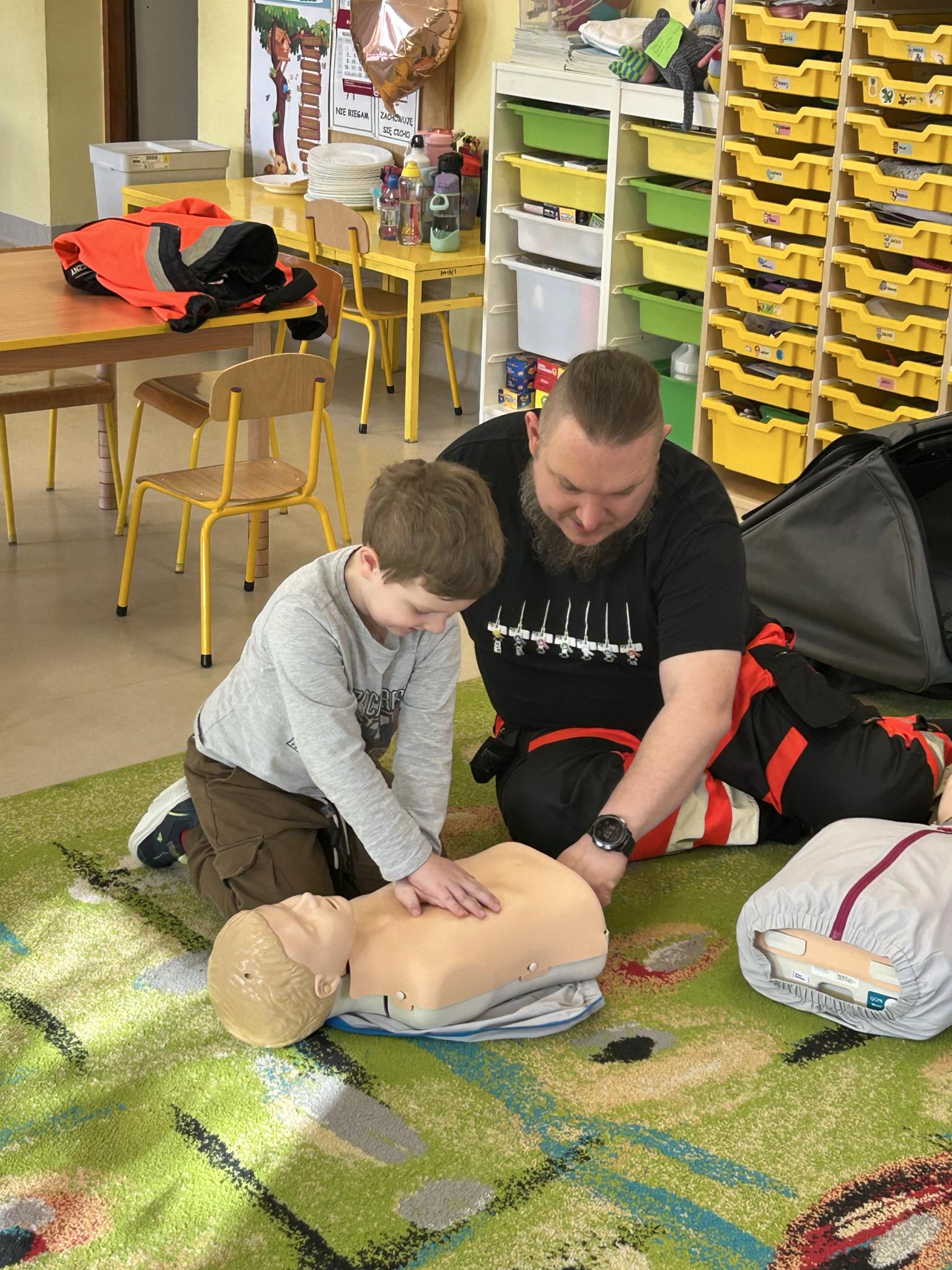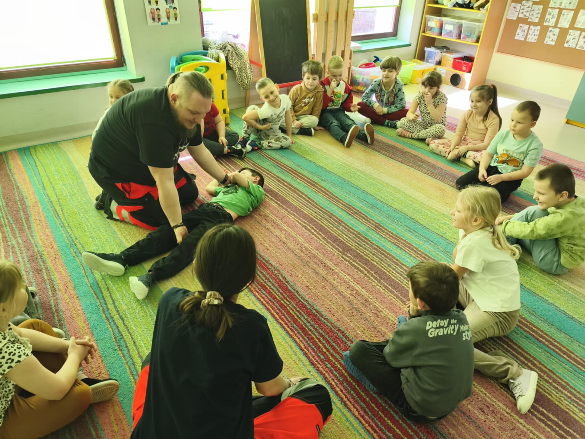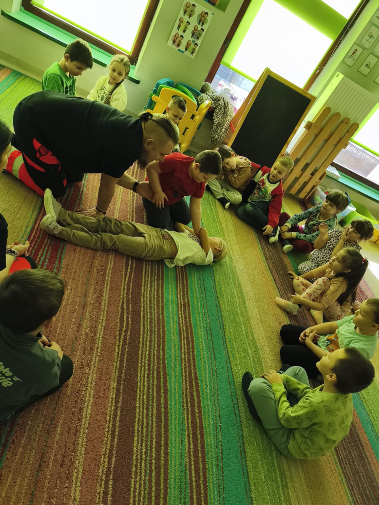 „Nie bój się, wiedzę masz, odrzuć strach, wiedzę chwyć, przecież człowiek dzięki tobie może żyć!” Kierując się powyższą sentencją, jak co roku odwiedzili nas Rodzice chłopców z naszego przedszkola - ratownicy medyczni, którzy najpierw opowiedzieli dzieciom o swoim zawodzie, omówili pozycję bezpieczną, resuscytację krążeniowo-oddechową a następnie przy wykorzystaniu profesjonalnych fantomów zachęcili przedszkolaki do ćwiczeń praktycznych. Zgodnie z tym, co powiedział kiedyś Konfucjusz: „Powiedz mi, a zapomnę, pokaż mi, a zapamiętam, pozwól mi zrobić, a zrozumiem.”, dzieci uczą się przede wszystkim przez działanie, a udzielanie pierwszej pomocy nie jest tylko wyborem - jest koniecznością i udzielić jej może każdy, kto zauważy, że ktoś potrzebuje pomocy - niezależnie od wieku czy umiejętności, oczywiście z zachowaniem własnego bezpieczeństwa. Przedszkolaki chętnie przystępowały do działań praktycznych i odpowiadały na liczne pytania, utrwalając przy okazji numery alarmowe oraz rozmowę przez telefon w sytuacji wezwania pogotowia ratunkowego. To niezwykle ważne, aby uczyć zasad udzielania pierwszej pomocy już od najmłodszych lat właśnie po to, by czuć się pewniej i nie bać się pomagać innym. Na zakończenie dzieci otrzymały kolorowanki tematyczne i pięknie podziękowały prowadzącym, a nasi goście przybili piątki z uczestnikami i dokonali pamiątkowego wpisu do kroniki przedszkolnej. W imieniu naszego przedszkola - bardzo dziękujemy p. Kamili i p. Tomaszowi Skoniecznym za poświęcony czas, ogromne zaangażowanie i prezentację swojego zawodu oraz życiowej pasji.