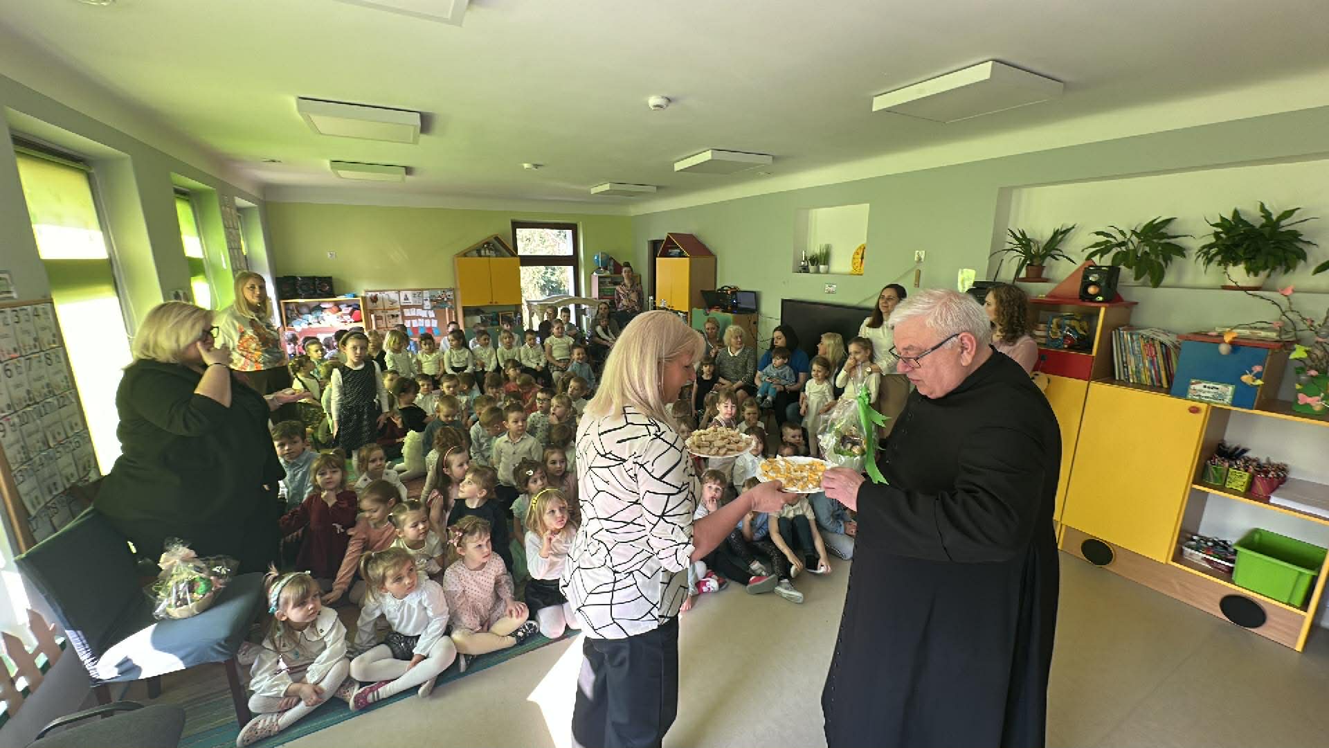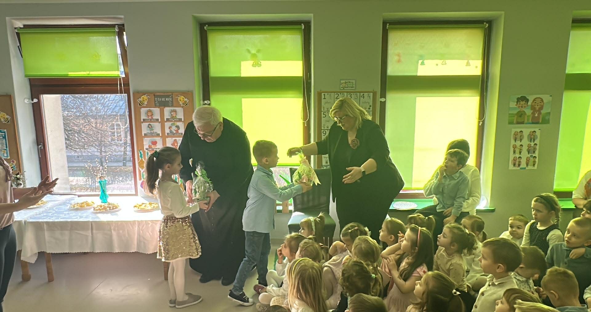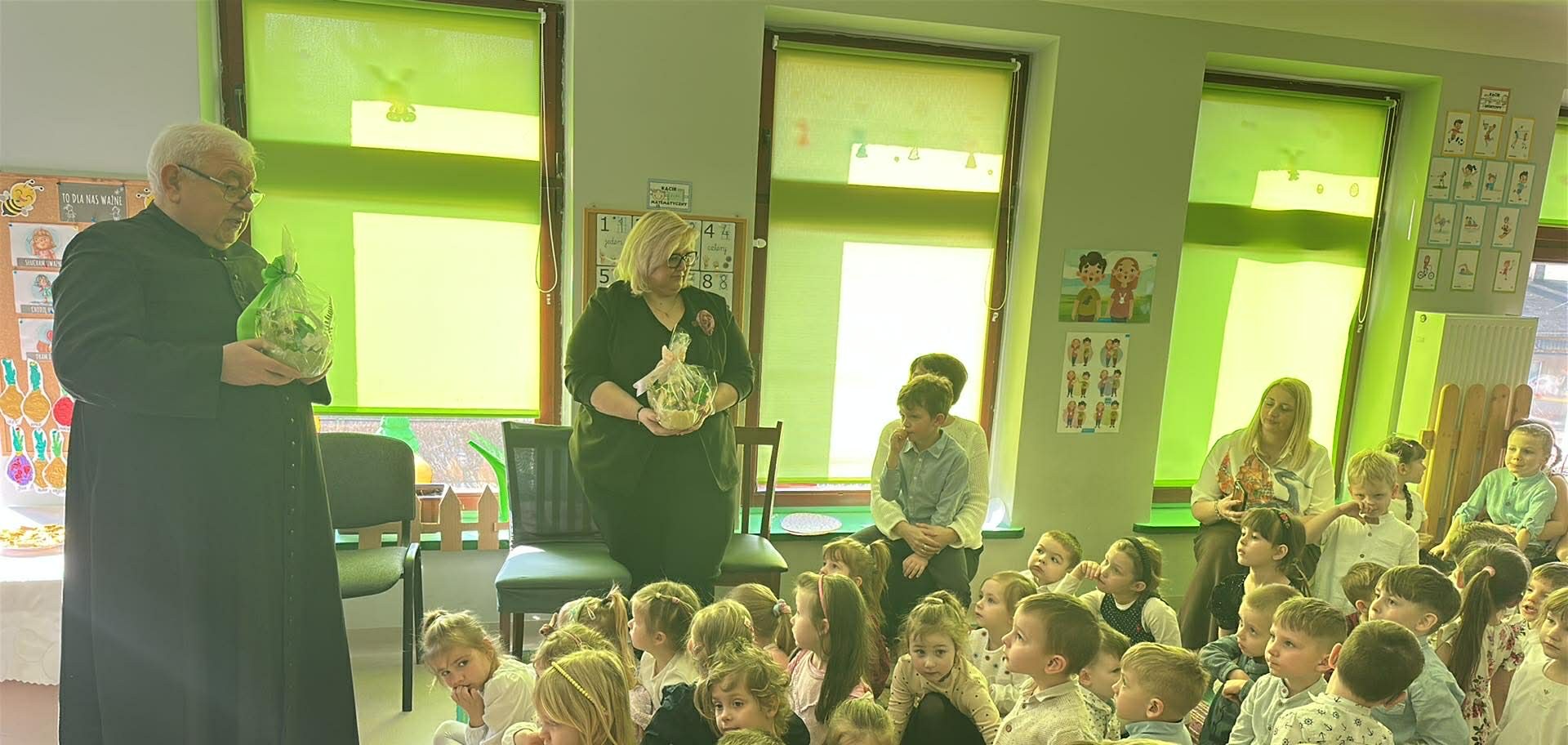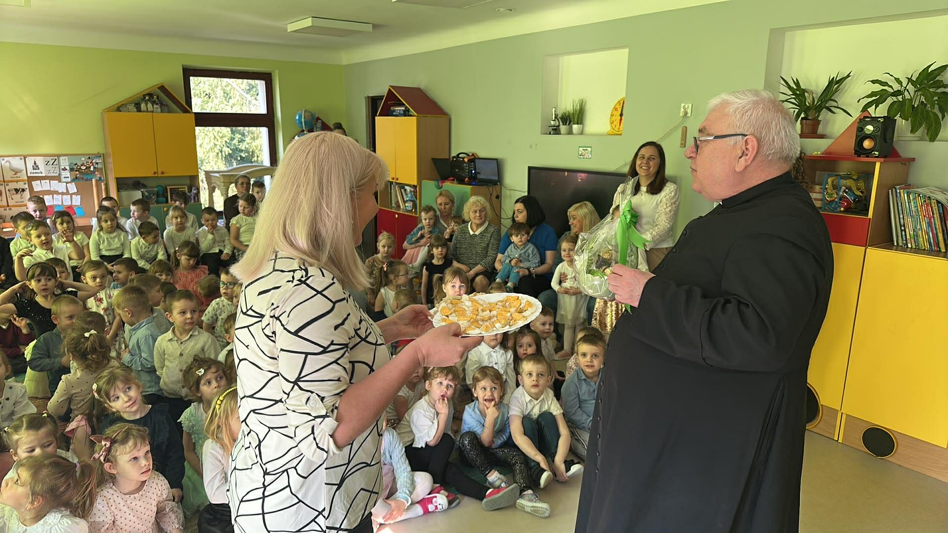 Tego dnia wszystkie przedszkolaki były odświętnie ubrane a sala "Pszczółek" została przygotowana na ważne odwiedziny specjalnego gościa - Księdza Zbigniewa Kaczmiarkiewicza. Nasze spotkanie rozpoczęliśmy od wysłuchania ważnych wiadomości na temat symboliki Świąt Wielkanocnych. Ksiądz bowiem przypomniał nam, że w tym szczególnym czasie ważne są takie elementy, jak: Droga Krzyżowa, Niedziela Palmowa, czy Triduum Paschalne - Wielki Piątek, Sobota oraz Niedziela. Przypomnieliśmy sobie również, jakie pokarmy najczęściej wkładamy do koszyczka, który następnie zanosimy do Kościoła. Dzieci zrozumiały, na czym polega dzielenie się jajkiem, chlebkiem i, jak ogromną rolę pełnią te święta w życiu człowieka. Dodatkowo p. Dyrektor - Anna Kasprowicz zwróciła uwagę, że świąteczny czas to moment wewnętrznego spokoju, radości i chwila wytchnienia i bardzo ważne jest to, że Święta powinniśmy spędzać razem. W międzyczasie, w podzięce za poświęcony czas Księdza Zbigniewa Kaczmarkiewicza oraz p. Katechetki - p. Doroty Jończyk, dzieci ze wszystkich grup wiekowych zaprezentowały się w specjalnie na tę okazję, przygotowanych, wiosenno-wielkanocnych utworach. Na zakończenie nie zabrakło wzruszających życzeń, płynących prosto z serca a wybrane dzieci starsze wręczyły naszym, miłym Gościom skromny upominek, natomiast wszystkie przedszkolaki zostały zaproszone do swoich sal na świąteczny poczęstunek. Bardzo dziekujemy za przybycie, poświęcony czas i ogromną chęć do przekazywania wartościowych wiadomości na temat symboliki Świąt Wielkiej Nocy.