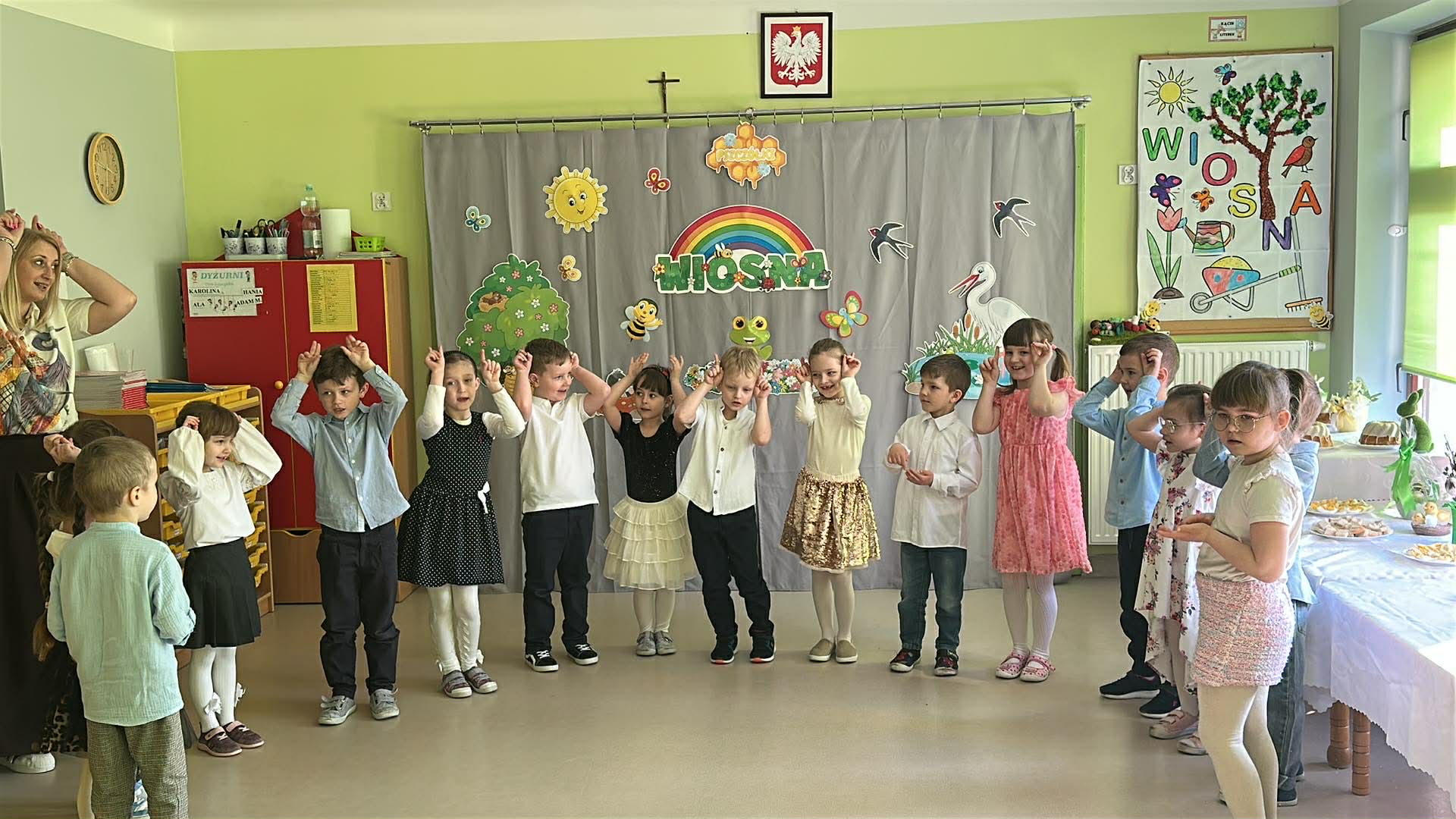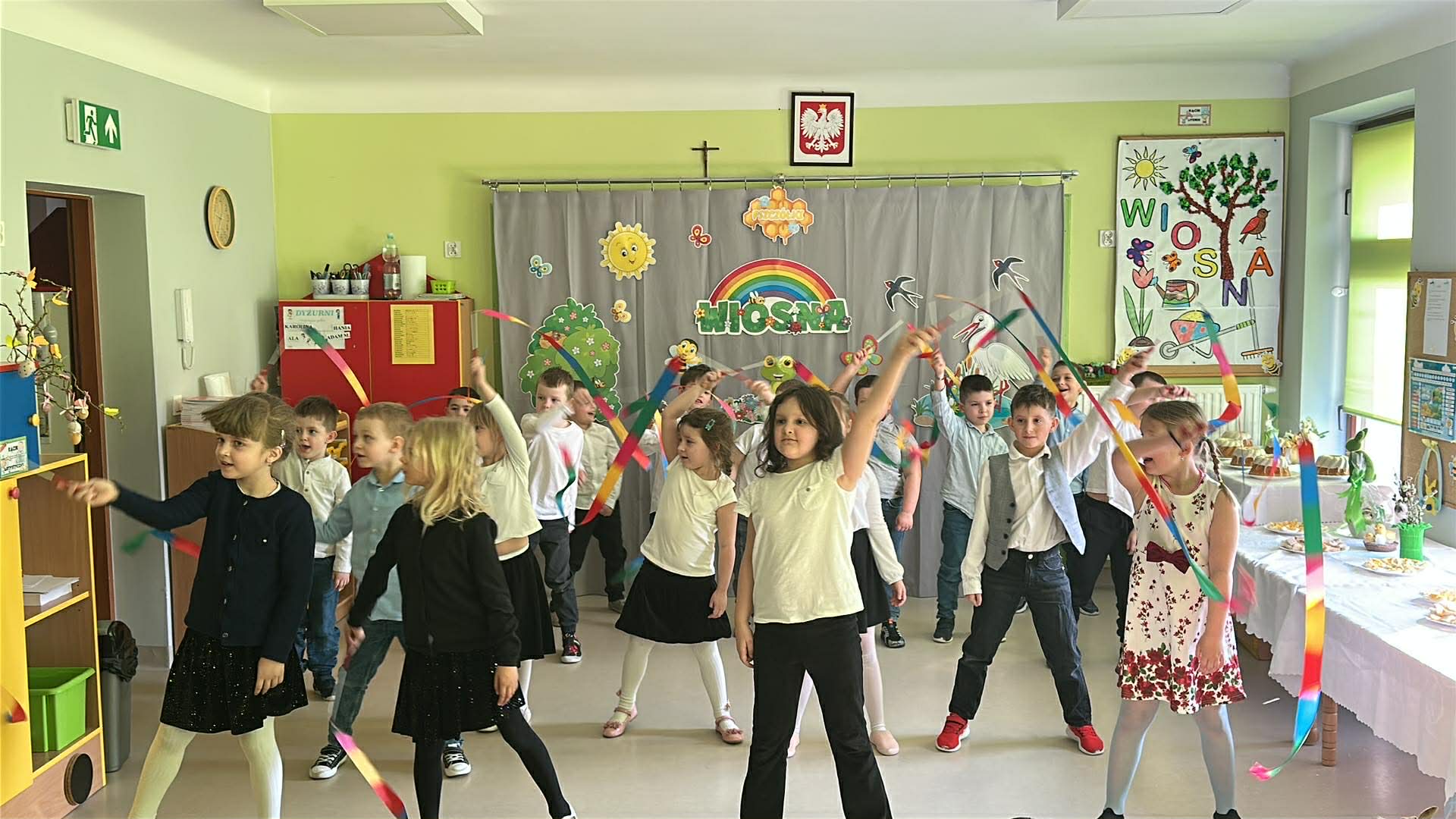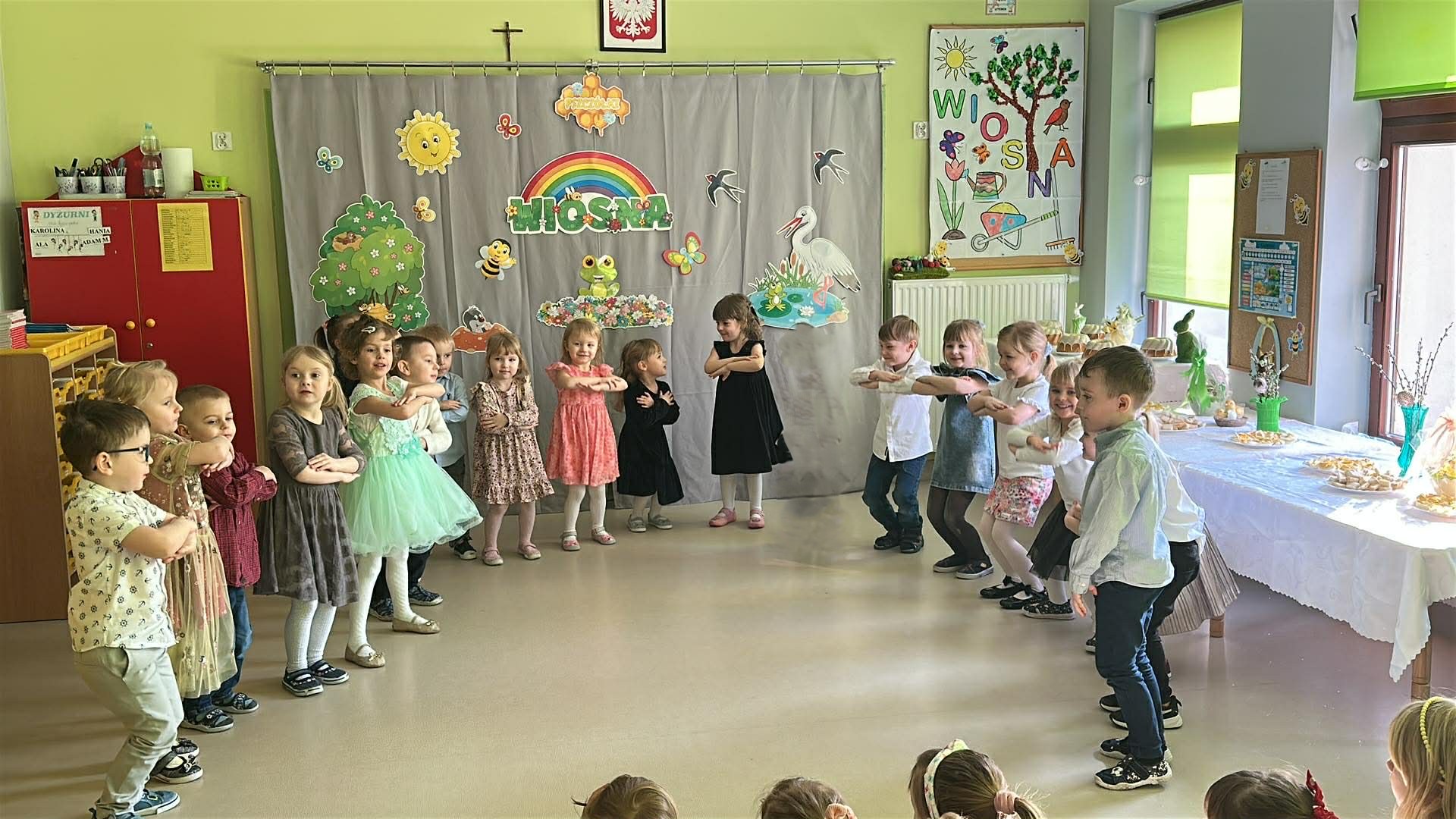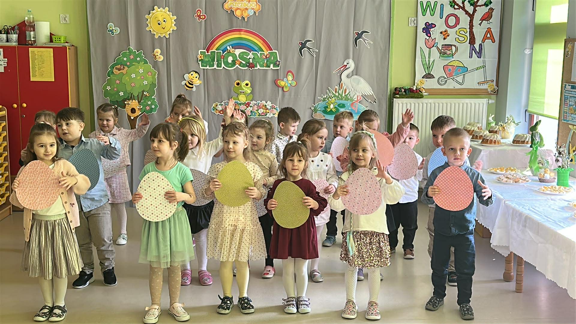 Tego dnia wszystkie przedszkolaki były odświętnie ubrane a sala "Pszczółek" została przygotowana na ważne odwiedziny specjalnego gościa - Księdza Zbigniewa Kaczmiarkiewicza. Nasze spotkanie rozpoczęliśmy od wysłuchania ważnych wiadomości na temat symboliki Świąt Wielkanocnych. Ksiądz bowiem przypomniał nam, że w tym szczególnym czasie ważne są takie elementy, jak: Droga Krzyżowa, Niedziela Palmowa, czy Triduum Paschalne - Wielki Piątek, Sobota oraz Niedziela. Przypomnieliśmy sobie również, jakie pokarmy najczęściej wkładamy do koszyczka, który następnie zanosimy do Kościoła. Dzieci zrozumiały, na czym polega dzielenie się jajkiem, chlebkiem i, jak ogromną rolę pełnią te święta w życiu człowieka. Dodatkowo p. Dyrektor - Anna Kasprowicz zwróciła uwagę, że świąteczny czas to moment wewnętrznego spokoju, radości i chwila wytchnienia i bardzo ważne jest to, że Święta powinniśmy spędzać razem. W międzyczasie, w podzięce za poświęcony czas Księdza Zbigniewa Kaczmarkiewicza oraz p. Katechetki - p. Doroty Jończyk, dzieci ze wszystkich grup wiekowych zaprezentowały się w specjalnie na tę okazję, przygotowanych, wiosenno-wielkanocnych utworach. Na zakończenie nie zabrakło wzruszających życzeń, płynących prosto z serca a wybrane dzieci starsze wręczyły naszym, miłym Gościom skromny upominek, natomiast wszystkie przedszkolaki zostały zaproszone do swoich sal na świąteczny poczęstunek. Bardzo dziekujemy za przybycie, poświęcony czas i ogromną chęć do przekazywania wartościowych wiadomości na temat symboliki Świąt Wielkiej Nocy.