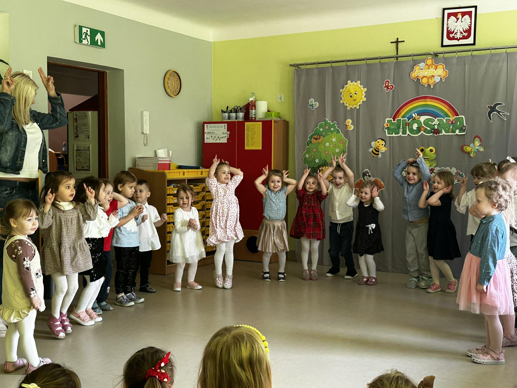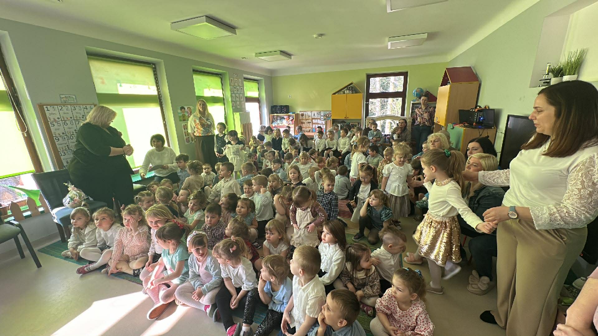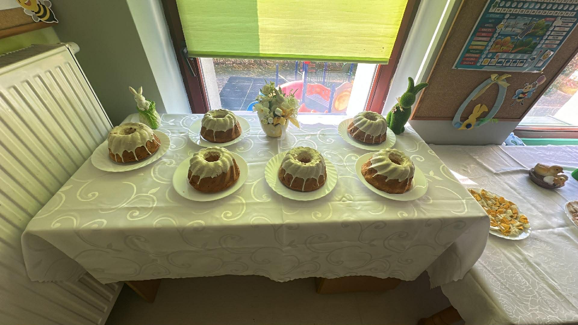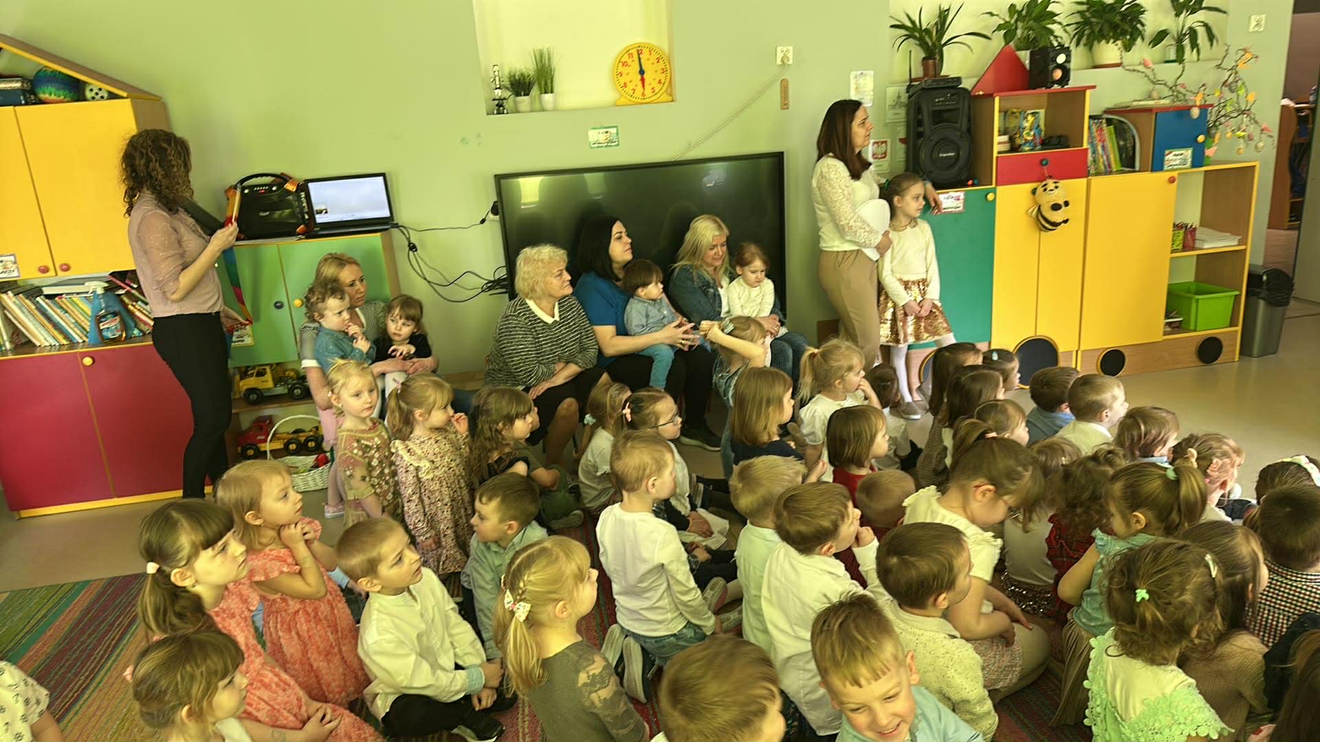 Tego dnia wszystkie przedszkolaki były odświętnie ubrane a sala "Pszczółek" została przygotowana na ważne odwiedziny specjalnego gościa - Księdza Zbigniewa Kaczmiarkiewicza. Nasze spotkanie rozpoczęliśmy od wysłuchania ważnych wiadomości na temat symboliki Świąt Wielkanocnych. Ksiądz bowiem przypomniał nam, że w tym szczególnym czasie ważne są takie elementy, jak: Droga Krzyżowa, Niedziela Palmowa, czy Triduum Paschalne - Wielki Piątek, Sobota oraz Niedziela. Przypomnieliśmy sobie również, jakie pokarmy najczęściej wkładamy do koszyczka, który następnie zanosimy do Kościoła. Dzieci zrozumiały, na czym polega dzielenie się jajkiem, chlebkiem i, jak ogromną rolę pełnią te święta w życiu człowieka. Dodatkowo p. Dyrektor - Anna Kasprowicz zwróciła uwagę, że świąteczny czas to moment wewnętrznego spokoju, radości i chwila wytchnienia i bardzo ważne jest to, że Święta powinniśmy spędzać razem. W międzyczasie, w podzięce za poświęcony czas Księdza Zbigniewa Kaczmarkiewicza oraz p. Katechetki - p. Doroty Jończyk, dzieci ze wszystkich grup wiekowych zaprezentowały się w specjalnie na tę okazję, przygotowanych, wiosenno-wielkanocnych utworach. Na zakończenie nie zabrakło wzruszających życzeń, płynących prosto z serca a wybrane dzieci starsze wręczyły naszym, miłym Gościom skromny upominek, natomiast wszystkie przedszkolaki zostały zaproszone do swoich sal na świąteczny poczęstunek. Bardzo dziekujemy za przybycie, poświęcony czas i ogromną chęć do przekazywania wartościowych wiadomości na temat symboliki Świąt Wielkiej Nocy.
