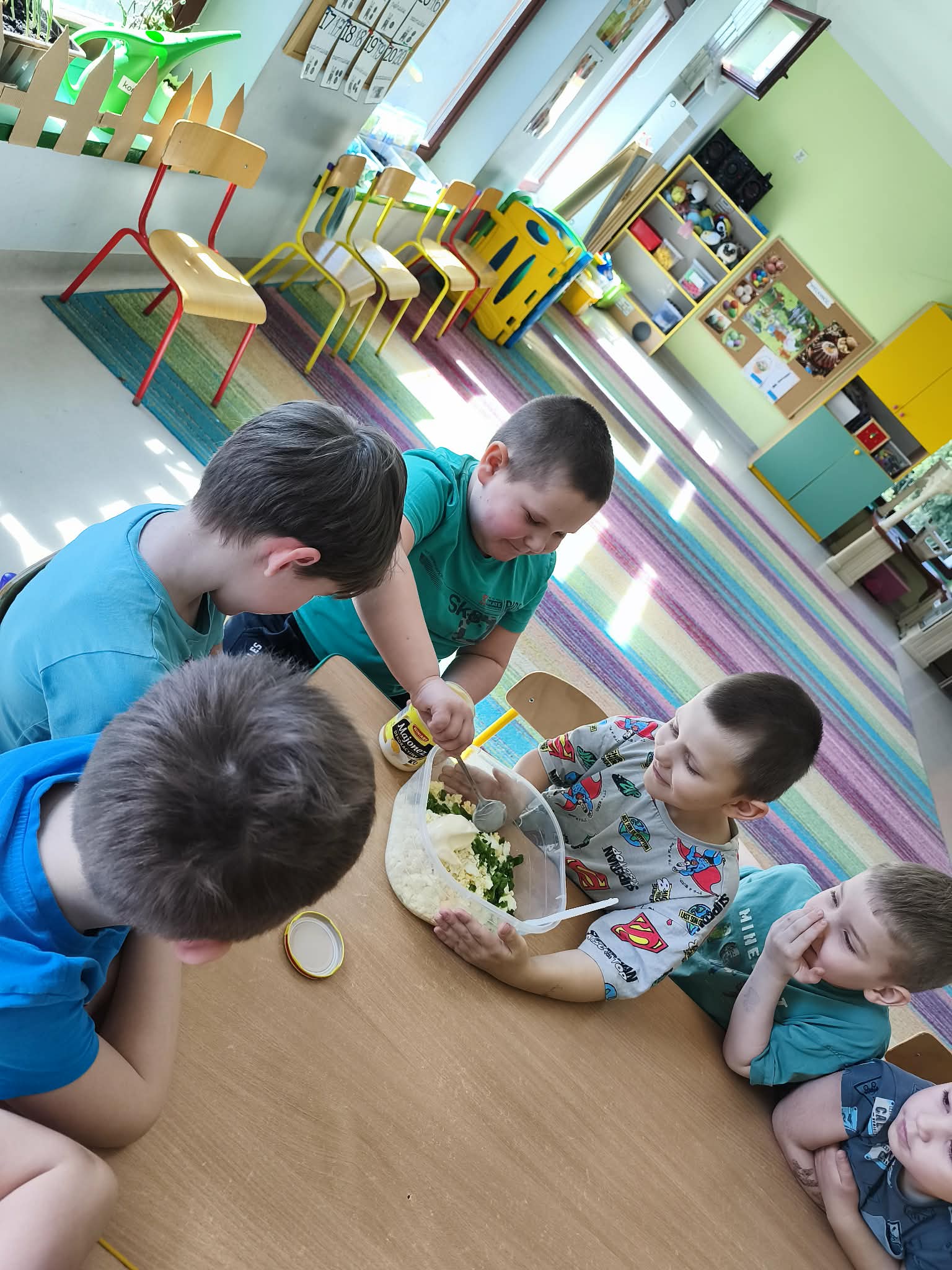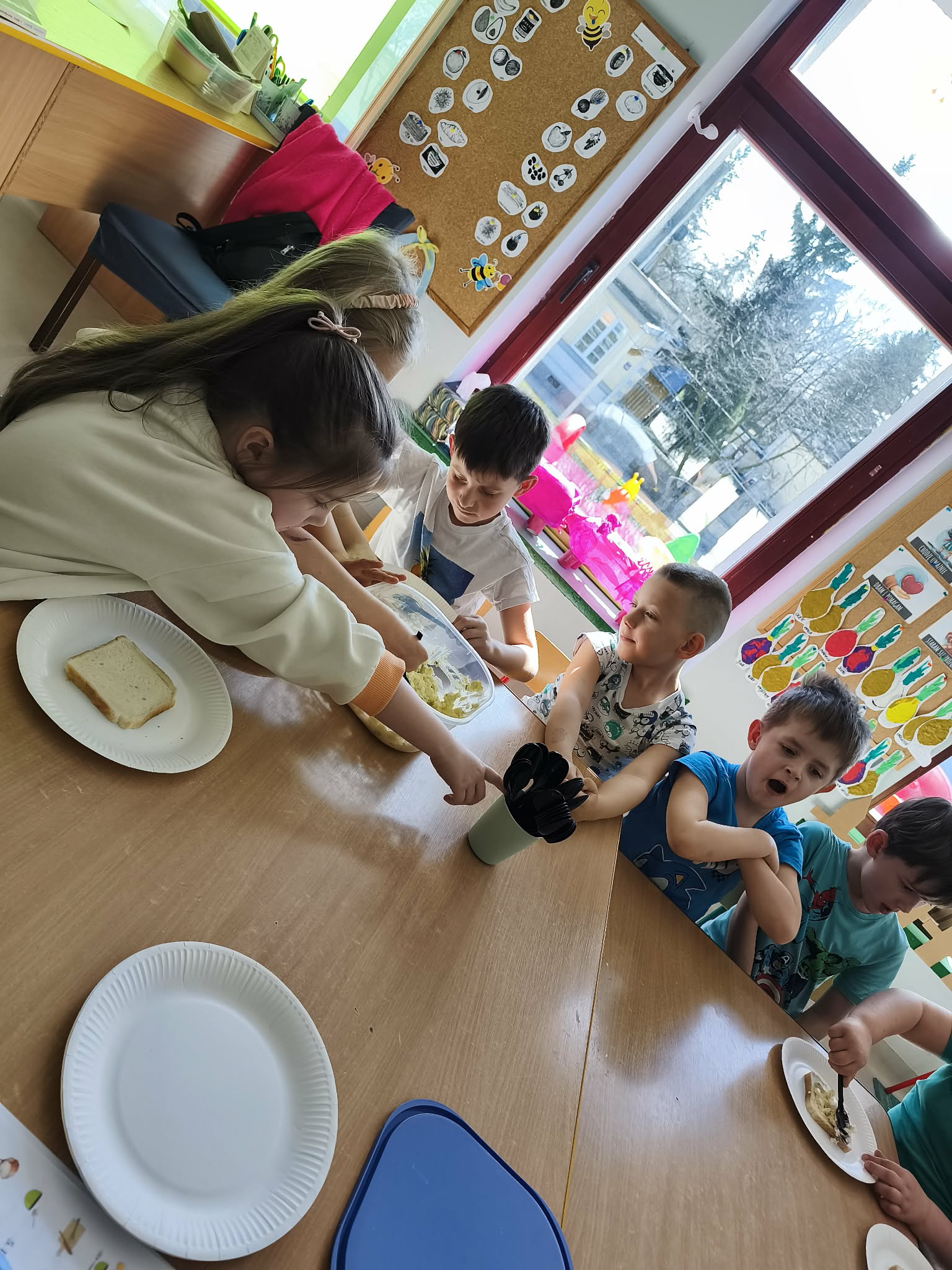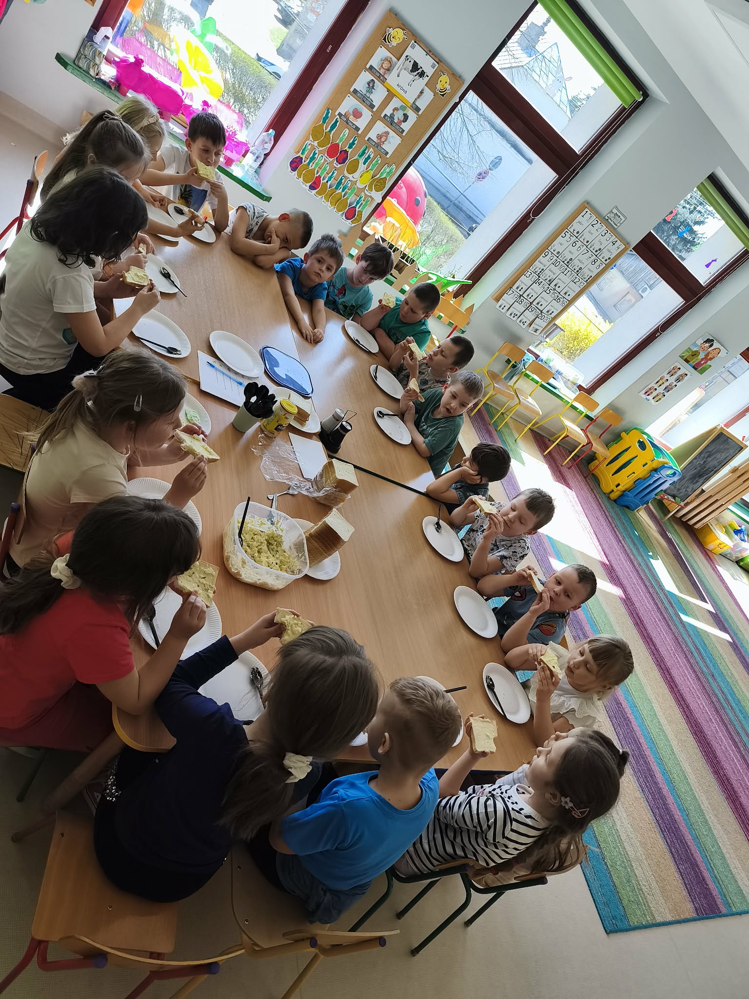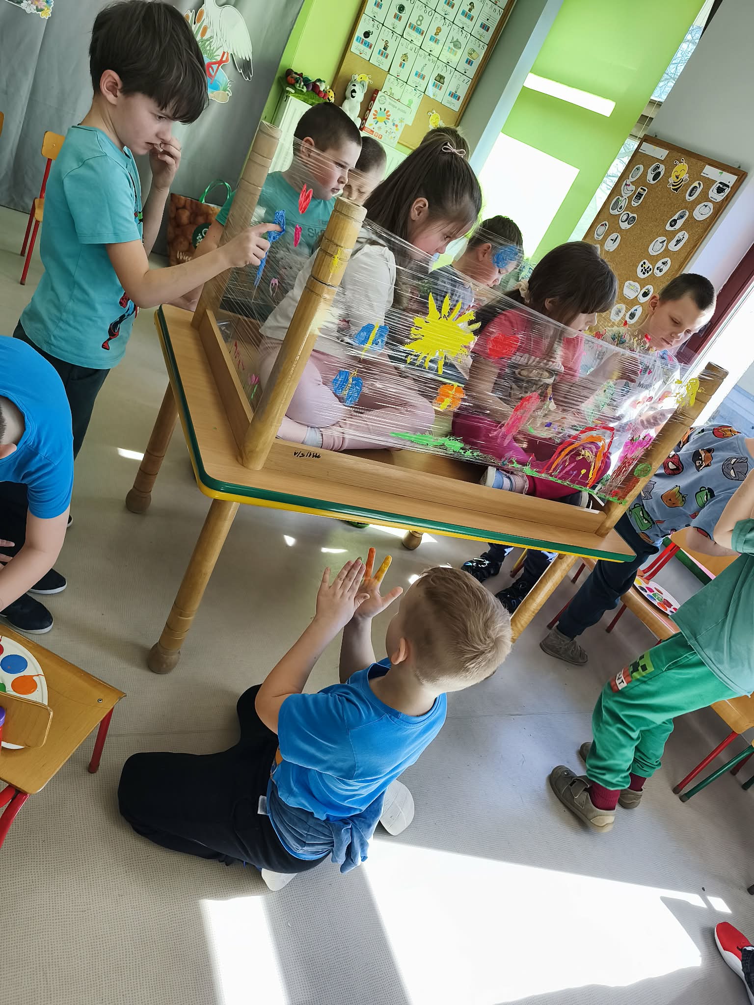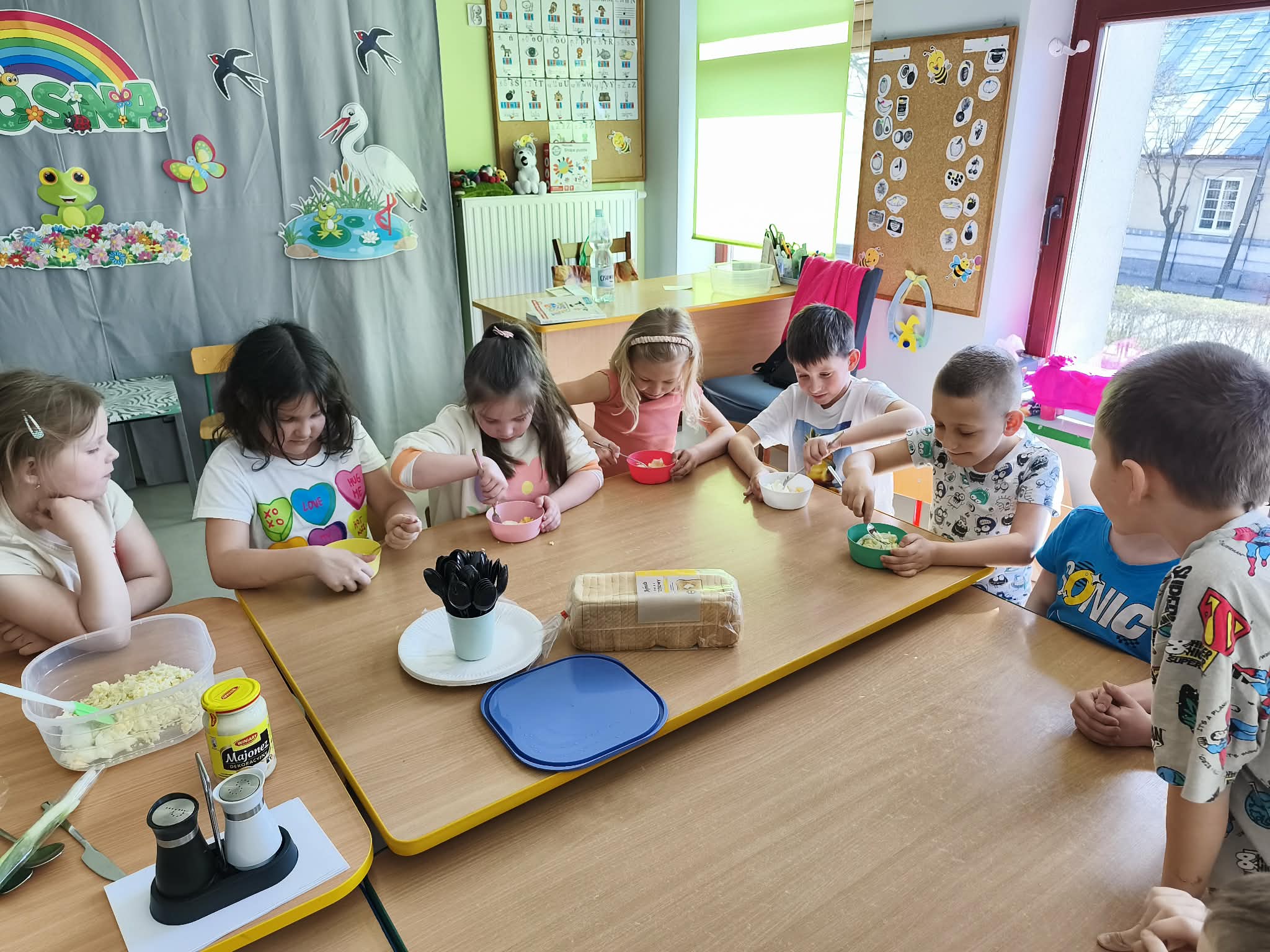 Tego dnia to "Pszczółki" poprowadziły zajęcia, a nauczycielka tylko czuwała nad ich przebiegiem. Na dzieci czekało kilka, fantastycznych aktywności, a wśród nich: wykonanie wielkanocnej pasty jajecznej zgodnie z odczytanym przepisem i jej degustacja przez chętne osoby oraz wiosenne malowanie na folii stretch z podziałem na grupy. Nie mogło zabraknąć wiosennych aktywności ruchowych, tj. jazda na rowerku w parach przy muzyce a także taniec zumby z wykorzystaniem ekranu multimedialnego. Warto podkreślić, iż najważniejszym celem dzisiejszych zajęć było zachęcenie do zdrowego stylu życia, a także pobudzanie wyobraźni. Ale nie można pominąć również tego, że dzieci ćwiczyły motorykę małą i dużą oraz uczyły się współpracować w zespole. Zajęcia bardzo podobały się "Pszczółkom", ponieważ miały one swój czynny udział i były niezwykle zaangażowane, a efektem zaproponowanych aktywności było budowanie wśród przedszkolaków poczucia sprawczości. Sprawczość to inaczej zdolność osoby do inicjowania działań, dokonywania wyborów i wywierania realnego wpływu na to, co jest. To też bardzo cenne przekonanie, że dziecko może, potrafi i ma wpływ. Warto podkreślić, iż dzieci samodzielnie przygotowały salę zarówno do zajęć kulinarnych, jak i plastycznych, a także po nich posprzątały, po czym wybrały się na przedszkolny ogród, by pobawić się swobodnie na świeżym powietrzu. Korzystając z okazji zachęcamy Rodziców do włączania swoich pociech w takie zajęcia również w środowisku domowym, ponieważ wspomniane zabawy są fantastycznym sposobem na spędzanie czasu wolnego, a przy okazji mają wiele walorów edukacyjnych.