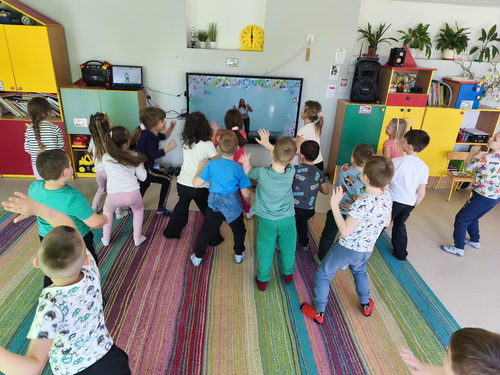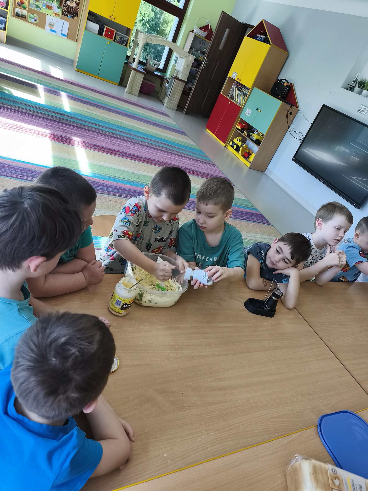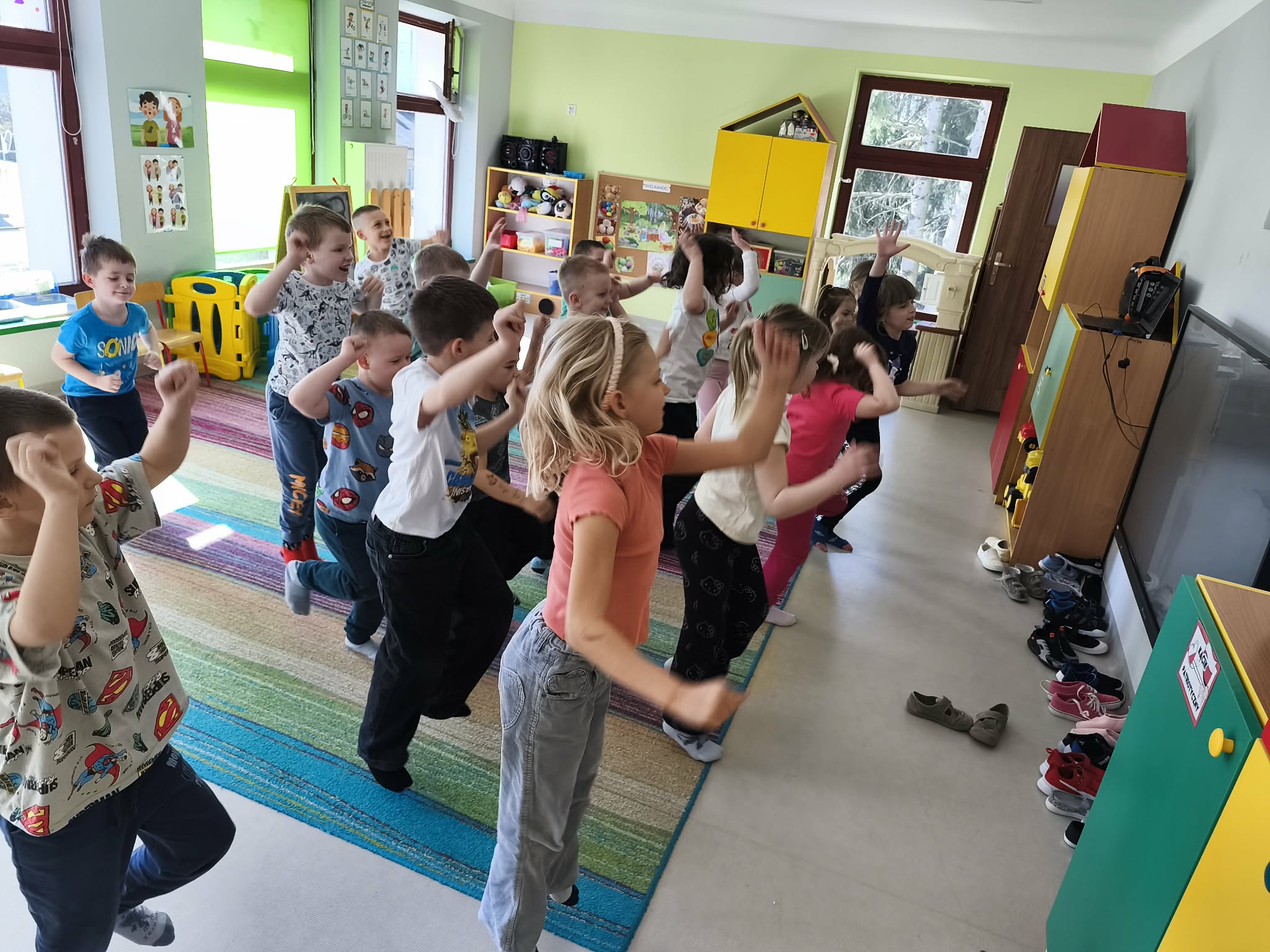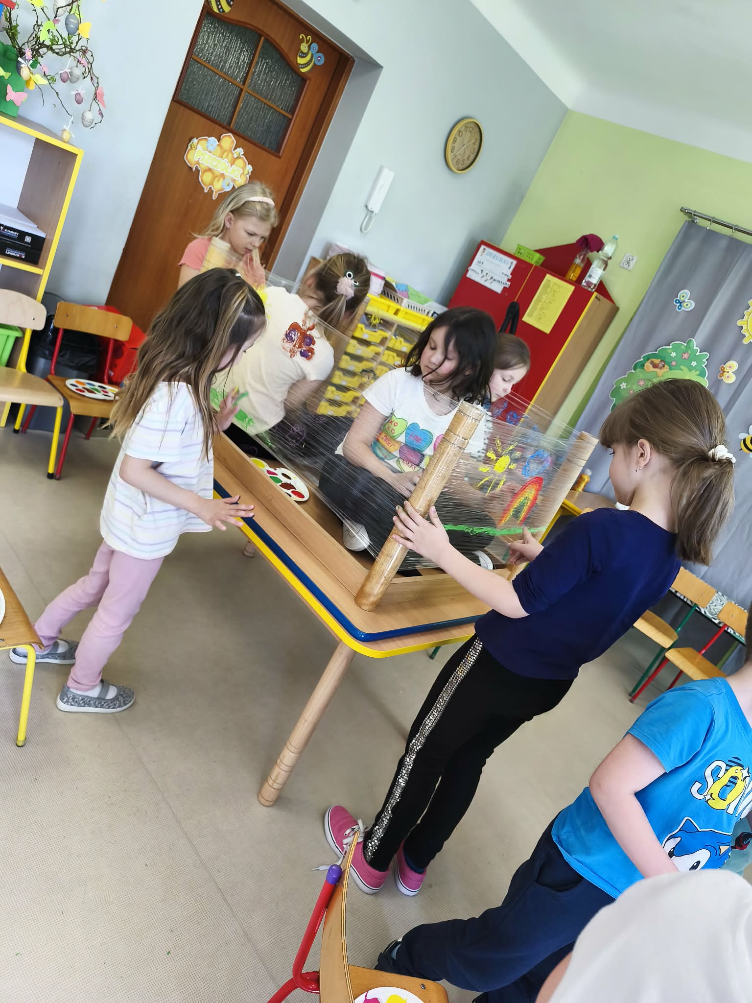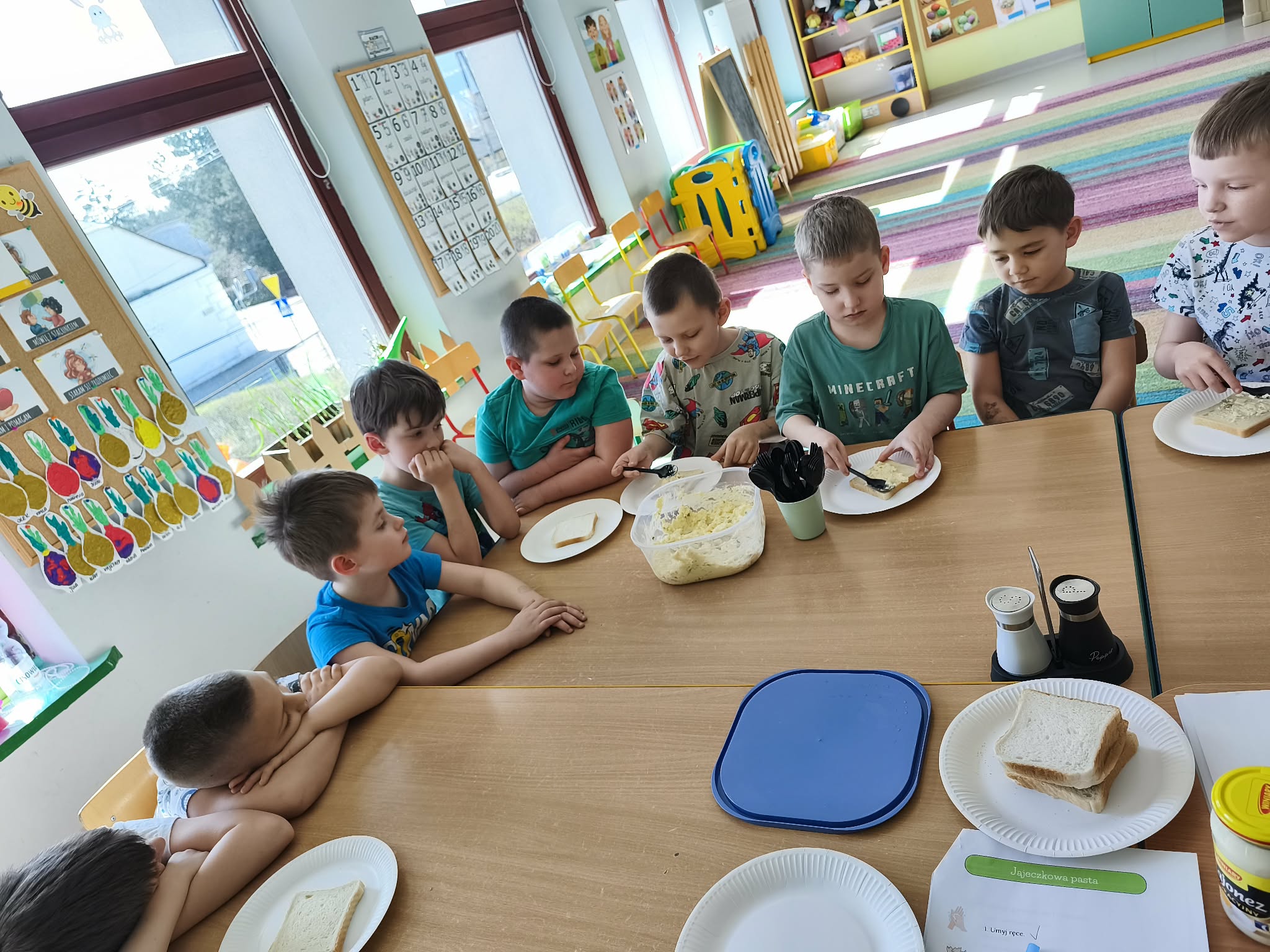 Tego dnia to "Pszczółki" poprowadziły zajęcia, a nauczycielka tylko czuwała nad ich przebiegiem. Na dzieci czekało kilka, fantastycznych aktywności, a wśród nich: wykonanie wielkanocnej pasty jajecznej zgodnie z odczytanym przepisem i jej degustacja przez chętne osoby oraz wiosenne malowanie na folii stretch z podziałem na grupy. Nie mogło zabraknąć wiosennych aktywności ruchowych, tj. jazda na rowerku w parach przy muzyce a także taniec zumby z wykorzystaniem ekranu multimedialnego. Warto podkreślić, iż najważniejszym celem dzisiejszych zajęć było zachęcenie do zdrowego stylu życia, a także pobudzanie wyobraźni. Ale nie można pominąć również tego, że dzieci ćwiczyły motorykę małą i dużą oraz uczyły się współpracować w zespole. Zajęcia bardzo podobały się "Pszczółkom", ponieważ miały one swój czynny udział i były niezwykle zaangażowane, a efektem zaproponowanych aktywności było budowanie wśród przedszkolaków poczucia sprawczości. Sprawczość to inaczej zdolność osoby do inicjowania działań, dokonywania wyborów i wywierania realnego wpływu na to, co jest. To też bardzo cenne przekonanie, że dziecko może, potrafi i ma wpływ. Warto podkreślić, iż dzieci samodzielnie przygotowały salę zarówno do zajęć kulinarnych, jak i plastycznych, a także po nich posprzątały, po czym wybrały się na przedszkolny ogród, by pobawić się swobodnie na świeżym powietrzu. Korzystając z okazji zachęcamy Rodziców do włączania swoich pociech w takie zajęcia również w środowisku domowym, ponieważ wspomniane zabawy są fantastycznym sposobem na spędzanie czasu wolnego, a przy okazji mają wiele walorów edukacyjnych.