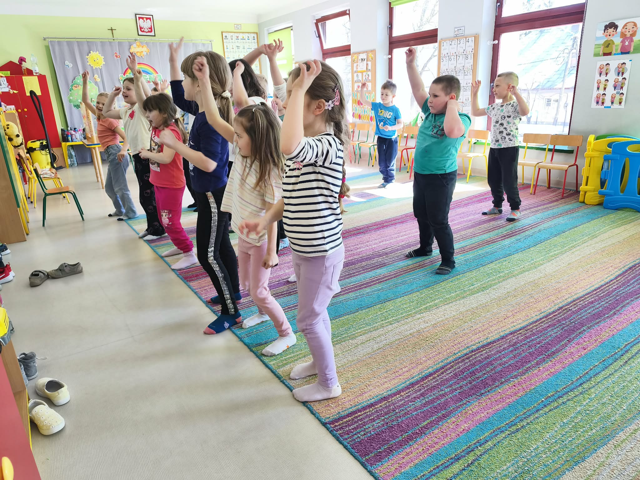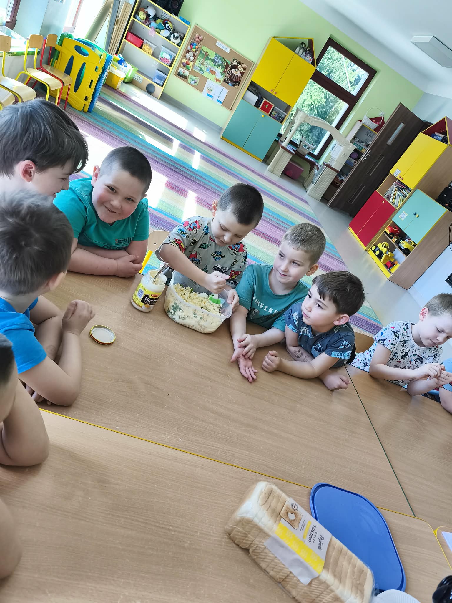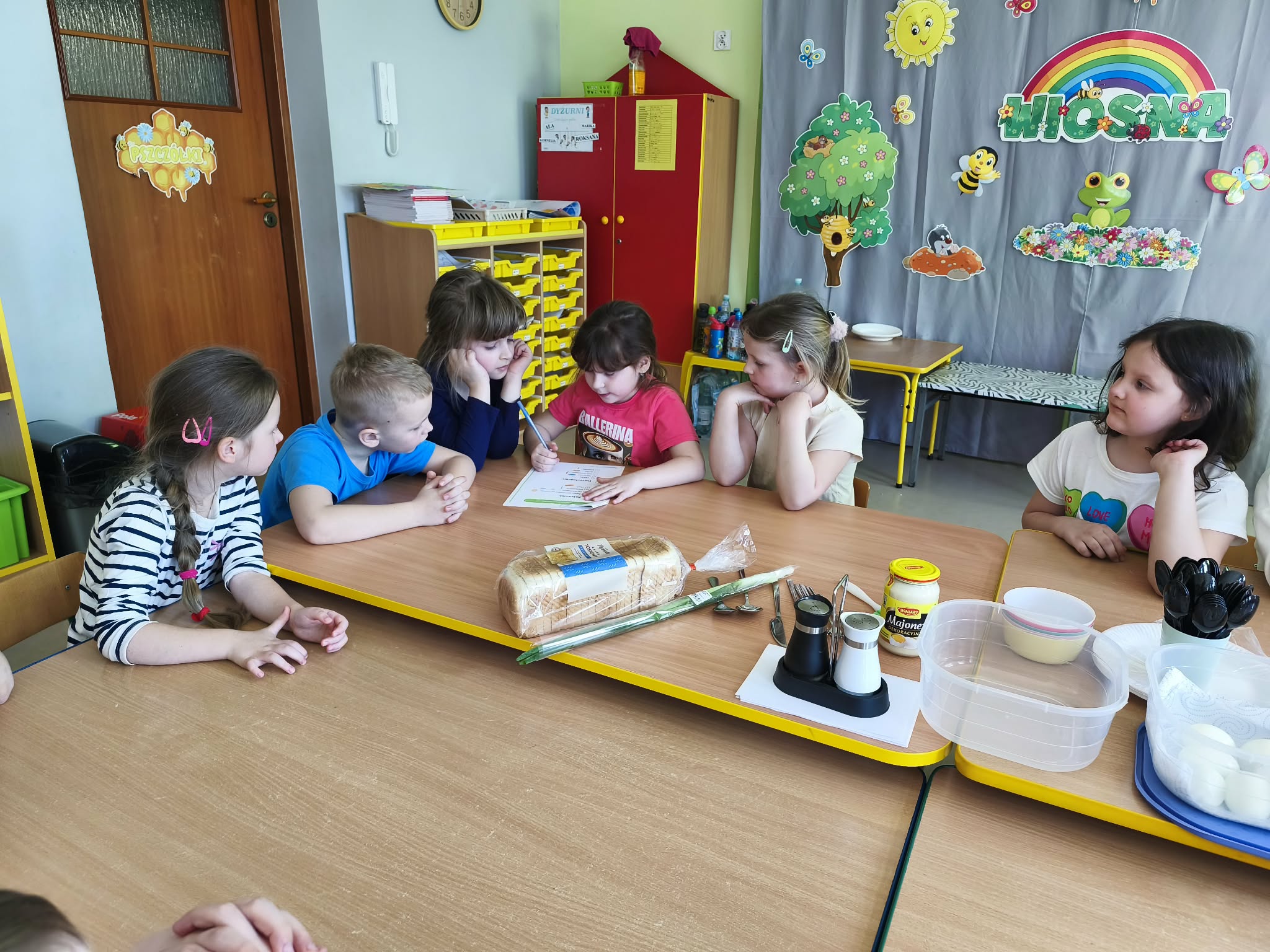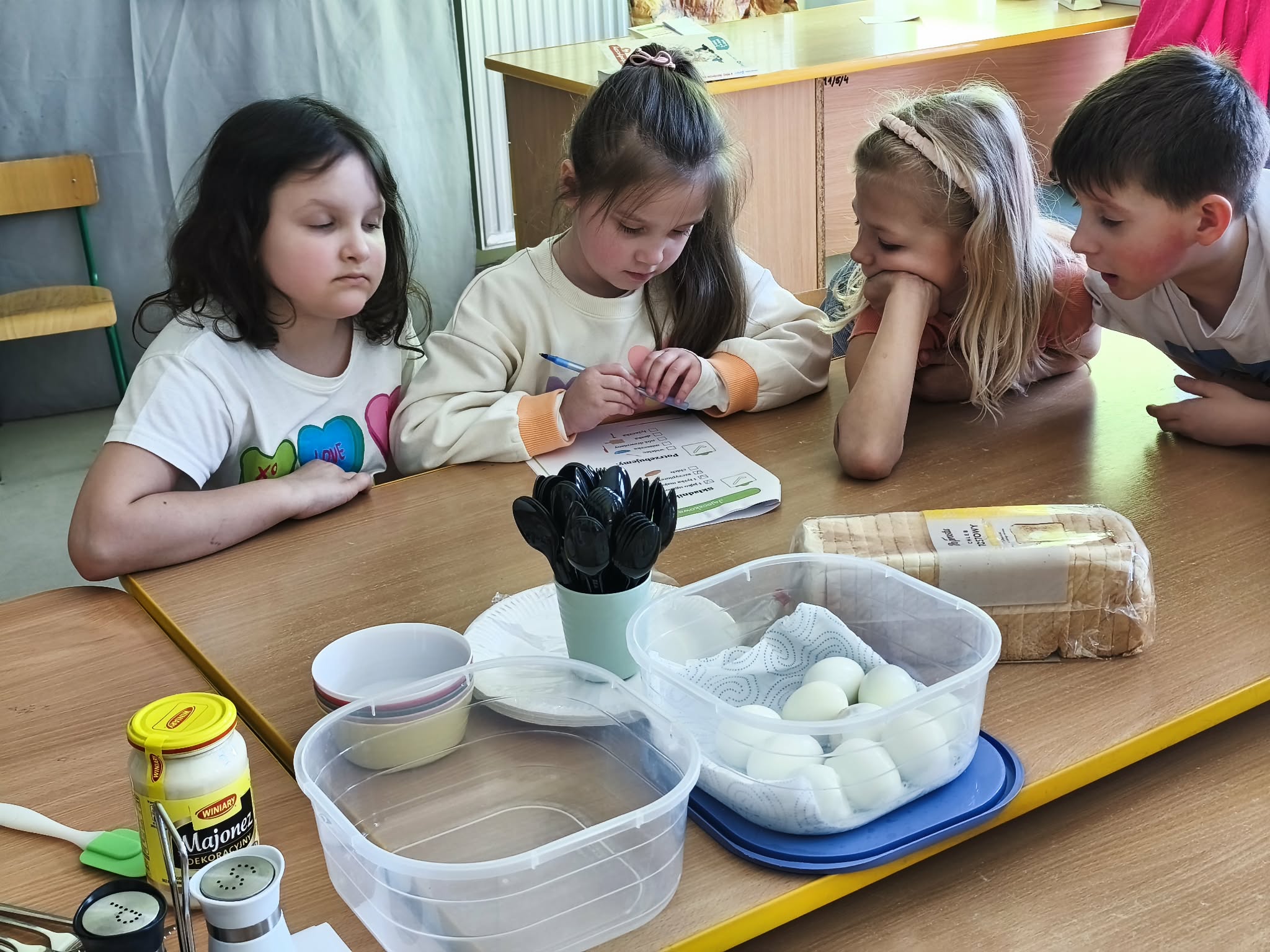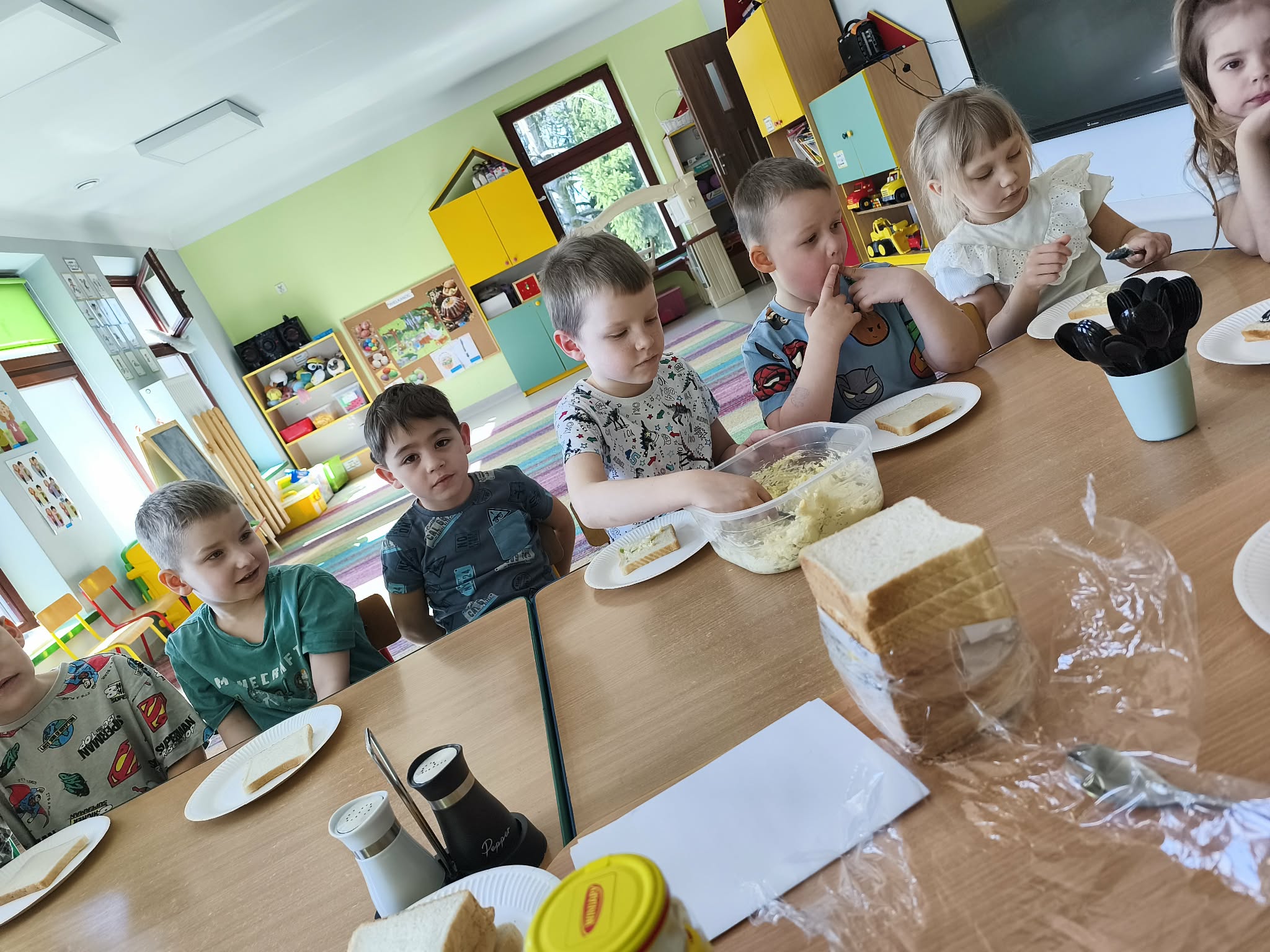 Tego dnia to "Pszczółki" poprowadziły zajęcia, a nauczycielka tylko czuwała nad ich przebiegiem. Na dzieci czekało kilka, fantastycznych aktywności, a wśród nich: wykonanie wielkanocnej pasty jajecznej zgodnie z odczytanym przepisem i jej degustacja przez chętne osoby oraz wiosenne malowanie na folii stretch z podziałem na grupy. Nie mogło zabraknąć wiosennych aktywności ruchowych, tj. jazda na rowerku w parach przy muzyce a także taniec zumby z wykorzystaniem ekranu multimedialnego. Warto podkreślić, iż najważniejszym celem dzisiejszych zajęć było zachęcenie do zdrowego stylu życia, a także pobudzanie wyobraźni. Ale nie można pominąć również tego, że dzieci ćwiczyły motorykę małą i dużą oraz uczyły się współpracować w zespole. Zajęcia bardzo podobały się "Pszczółkom", ponieważ miały one swój czynny udział i były niezwykle zaangażowane, a efektem zaproponowanych aktywności było budowanie wśród przedszkolaków poczucia sprawczości. Sprawczość to inaczej zdolność osoby do inicjowania działań, dokonywania wyborów i wywierania realnego wpływu na to, co jest. To też bardzo cenne przekonanie, że dziecko może, potrafi i ma wpływ. Warto podkreślić, iż dzieci samodzielnie przygotowały salę zarówno do zajęć kulinarnych, jak i plastycznych, a także po nich posprzątały, po czym wybrały się na przedszkolny ogród, by pobawić się swobodnie na świeżym powietrzu. Korzystając z okazji zachęcamy Rodziców do włączania swoich pociech w takie zajęcia również w środowisku domowym, ponieważ wspomniane zabawy są fantastycznym sposobem na spędzanie czasu wolnego, a przy okazji mają wiele walorów edukacyjnych.