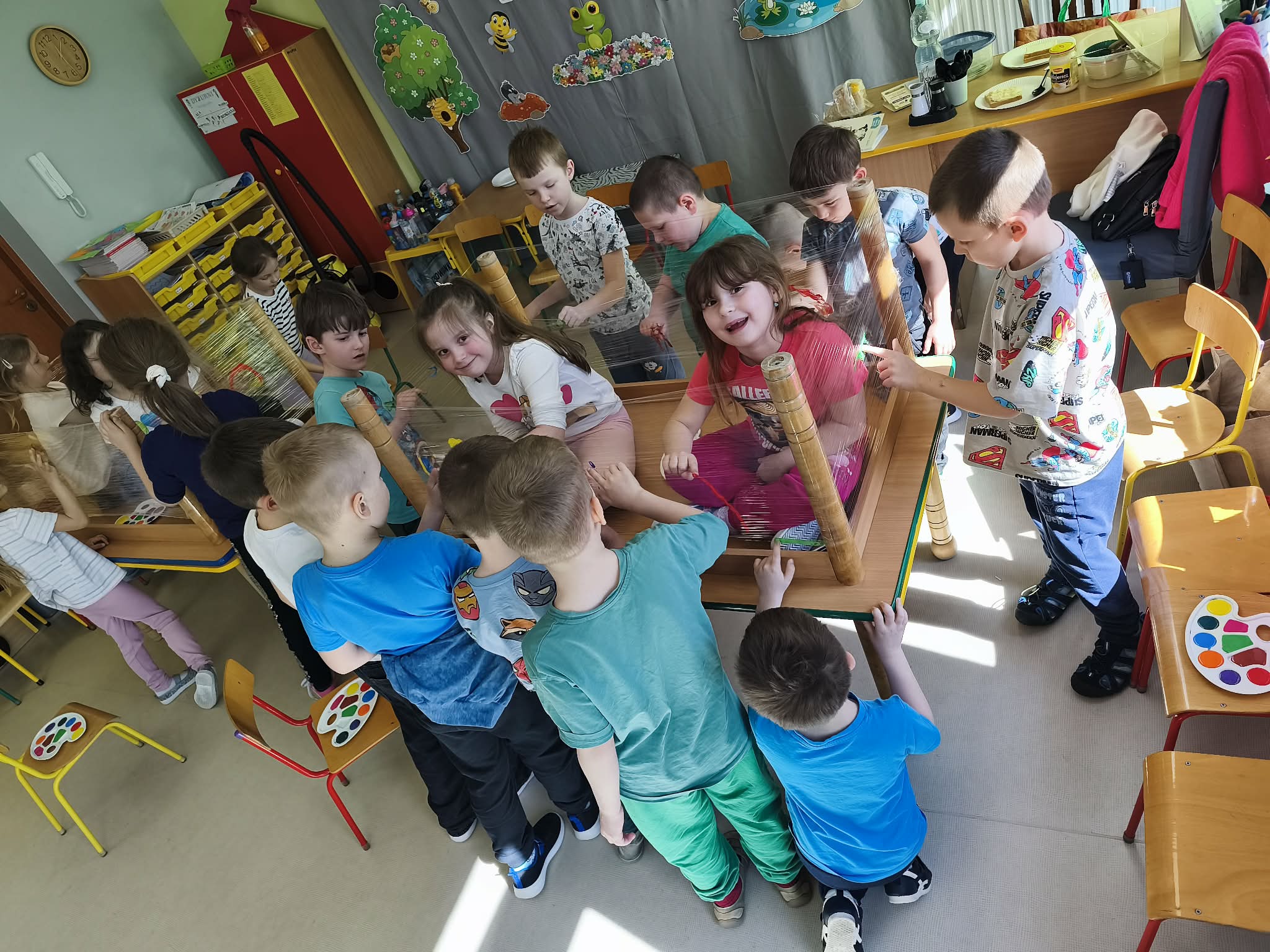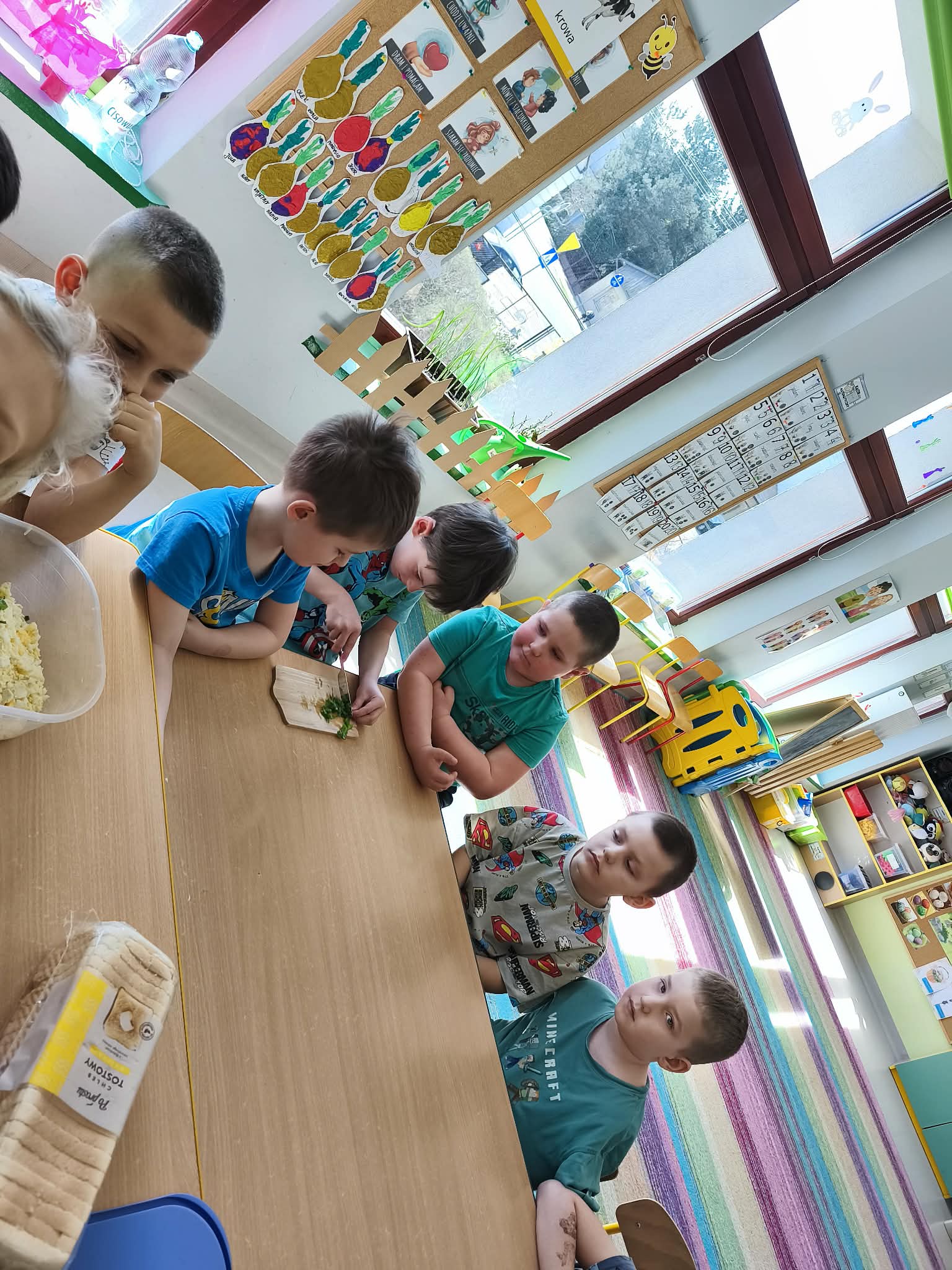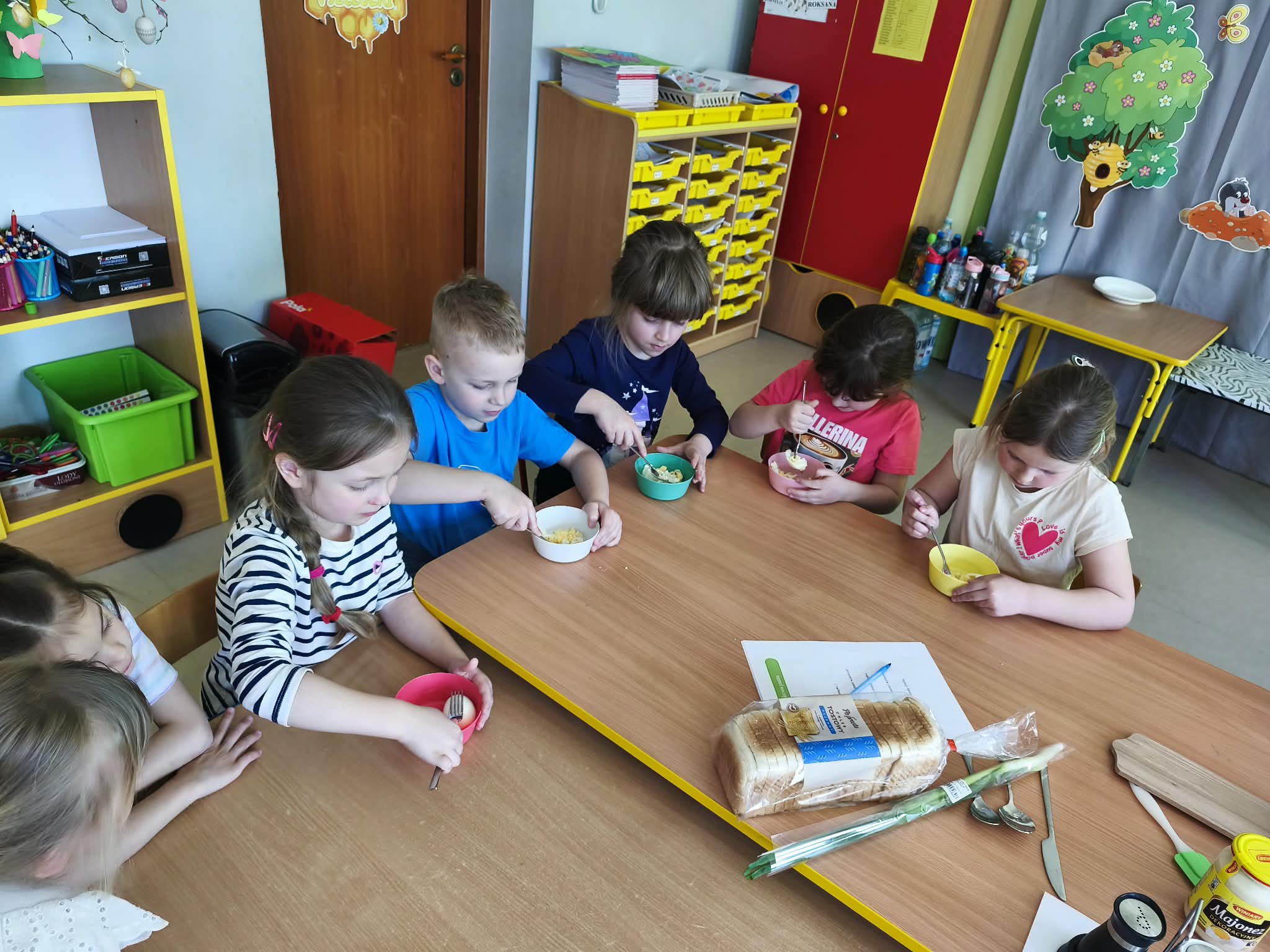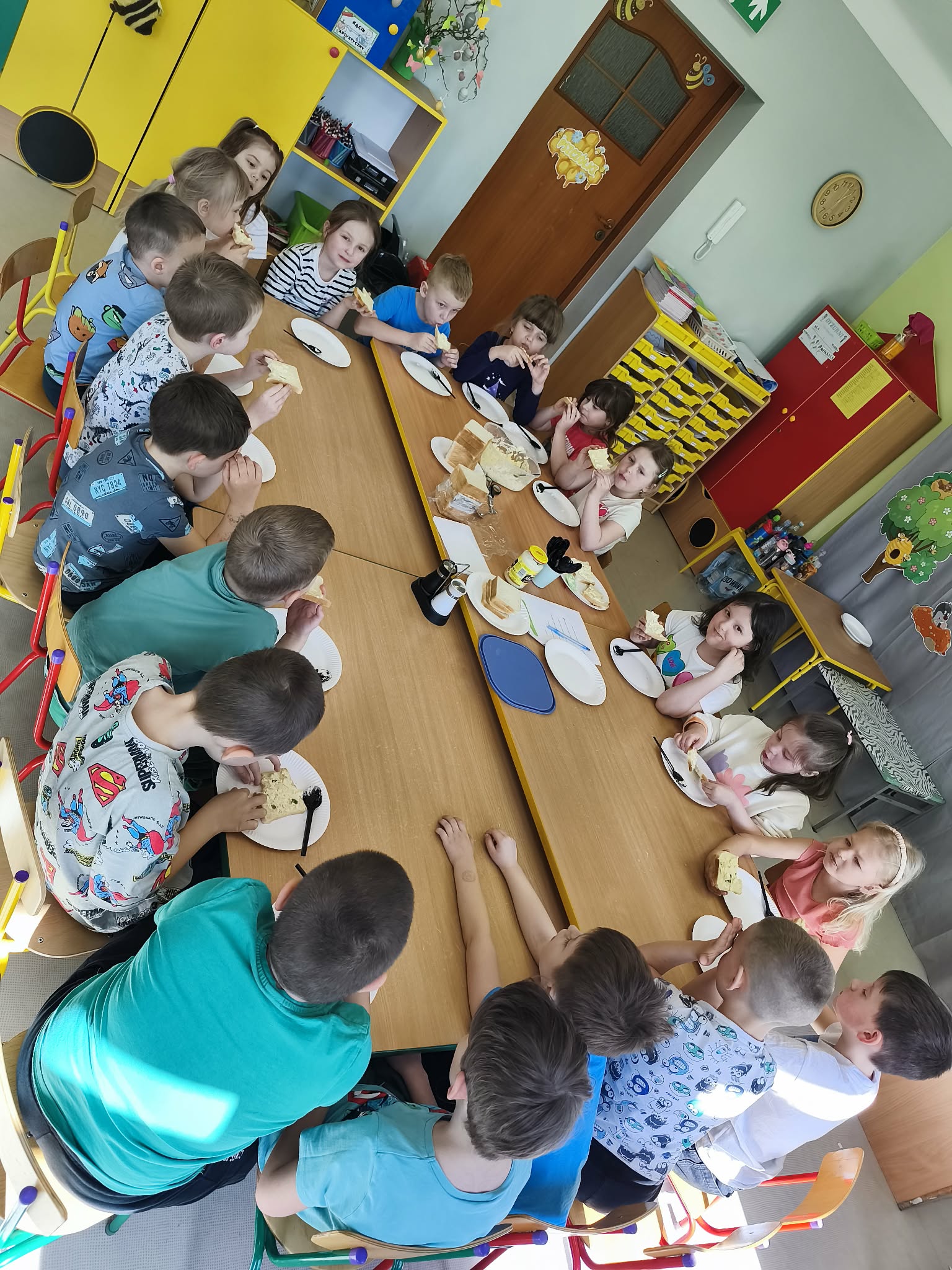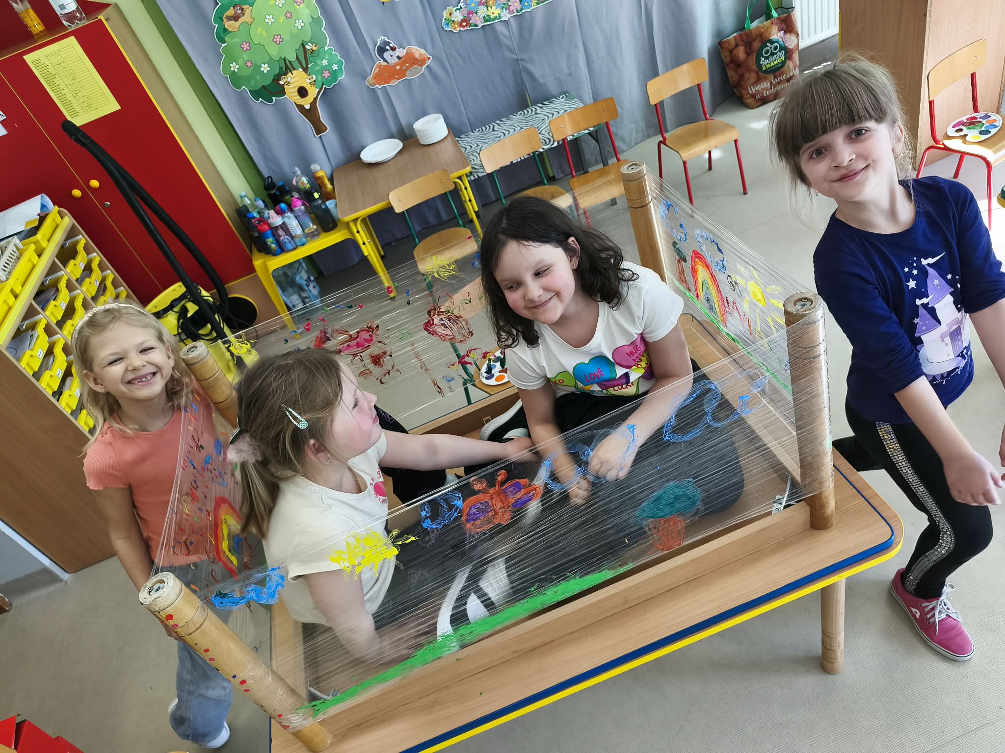 Tego dnia to "Pszczółki" poprowadziły zajęcia, a nauczycielka tylko czuwała nad ich przebiegiem. Na dzieci czekało kilka, fantastycznych aktywności, a wśród nich: wykonanie wielkanocnej pasty jajecznej zgodnie z odczytanym przepisem i jej degustacja przez chętne osoby oraz wiosenne malowanie na folii stretch z podziałem na grupy. Nie mogło zabraknąć wiosennych aktywności ruchowych, tj. jazda na rowerku w parach przy muzyce a także taniec zumby z wykorzystaniem ekranu multimedialnego. Warto podkreślić, iż najważniejszym celem dzisiejszych zajęć było zachęcenie do zdrowego stylu życia, a także pobudzanie wyobraźni. Ale nie można pominąć również tego, że dzieci ćwiczyły motorykę małą i dużą oraz uczyły się współpracować w zespole. Zajęcia bardzo podobały się "Pszczółkom", ponieważ miały one swój czynny udział i były niezwykle zaangażowane, a efektem zaproponowanych aktywności było budowanie wśród przedszkolaków poczucia sprawczości. Sprawczość to inaczej zdolność osoby do inicjowania działań, dokonywania wyborów i wywierania realnego wpływu na to, co jest. To też bardzo cenne przekonanie, że dziecko może, potrafi i ma wpływ. Warto podkreślić, iż dzieci samodzielnie przygotowały salę zarówno do zajęć kulinarnych, jak i plastycznych, a także po nich posprzątały, po czym wybrały się na przedszkolny ogród, by pobawić się swobodnie na świeżym powietrzu. Korzystając z okazji zachęcamy Rodziców do włączania swoich pociech w takie zajęcia również w środowisku domowym, ponieważ wspomniane zabawy są fantastycznym sposobem na spędzanie czasu wolnego, a przy okazji mają wiele walorów edukacyjnych.